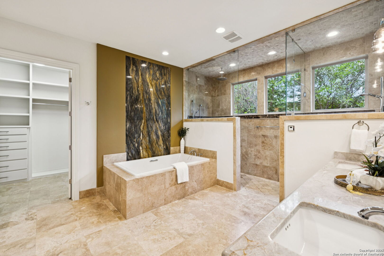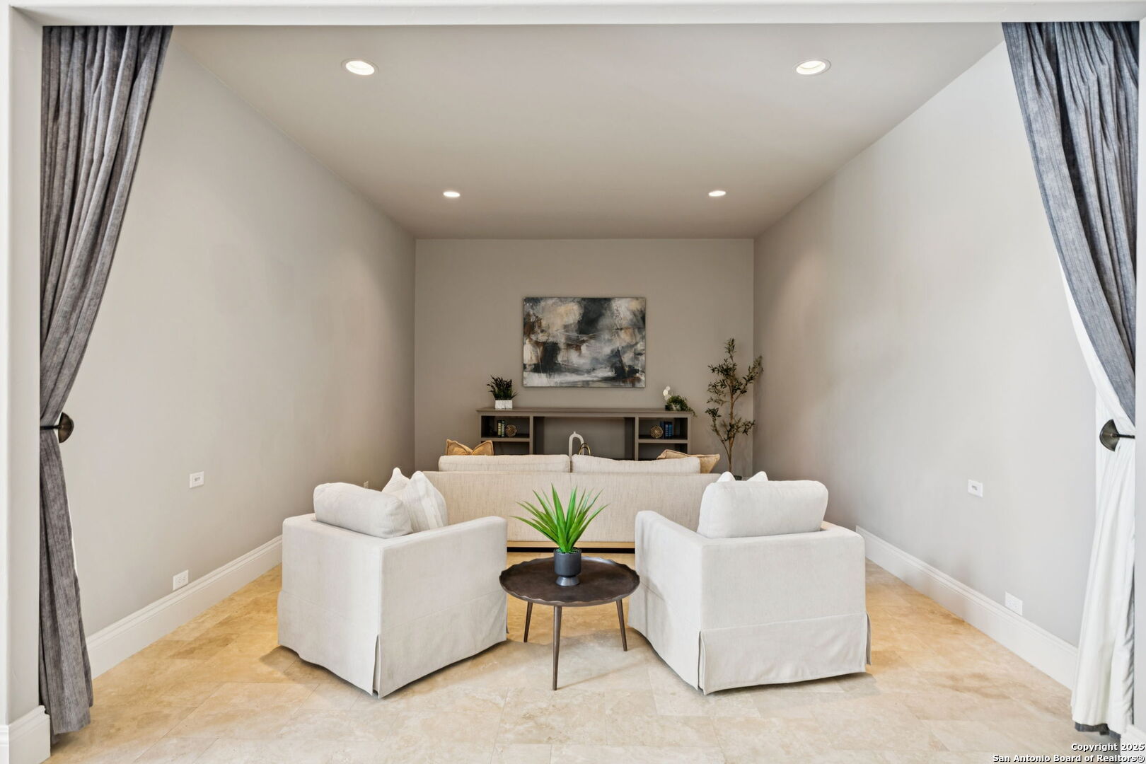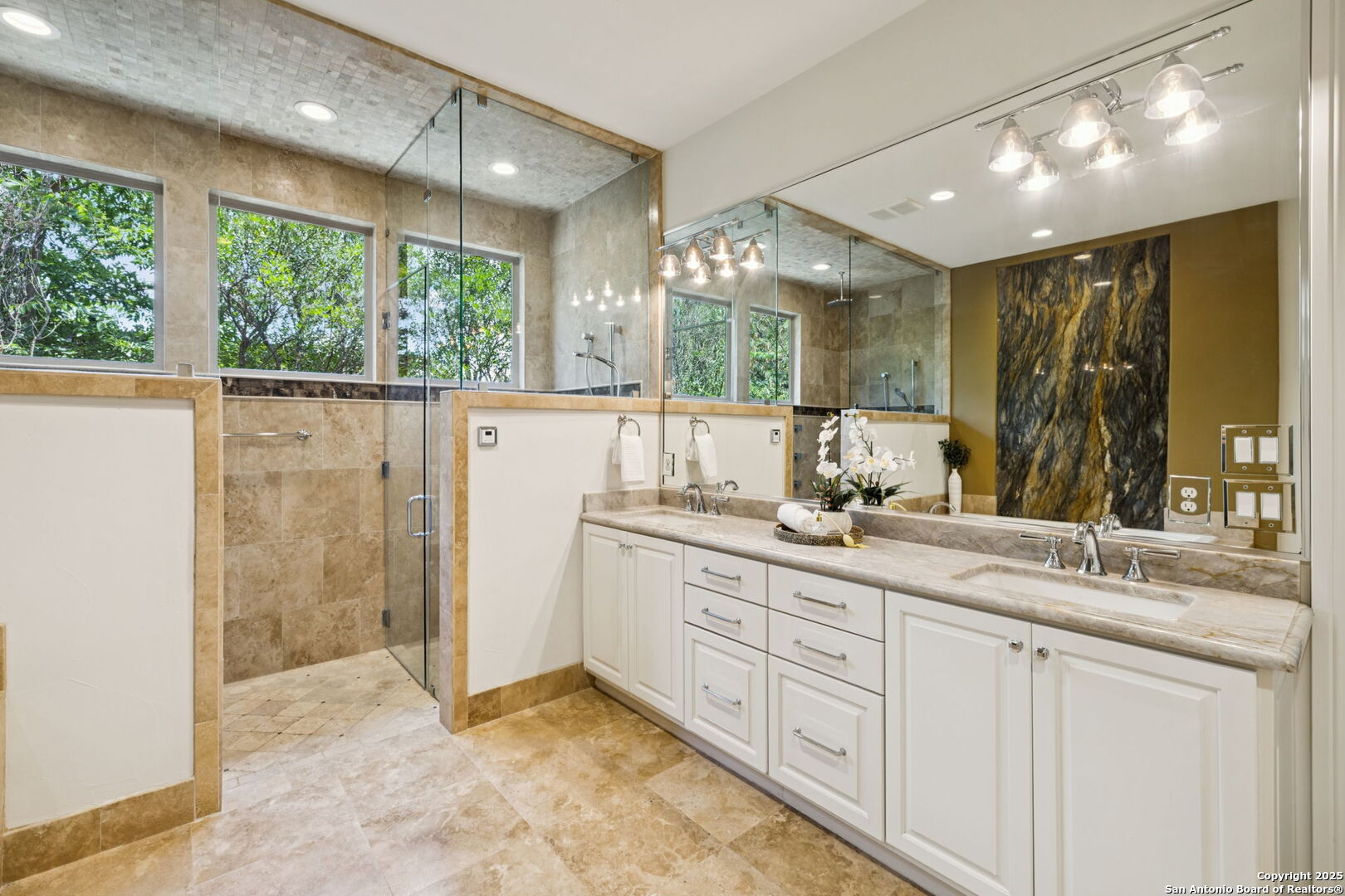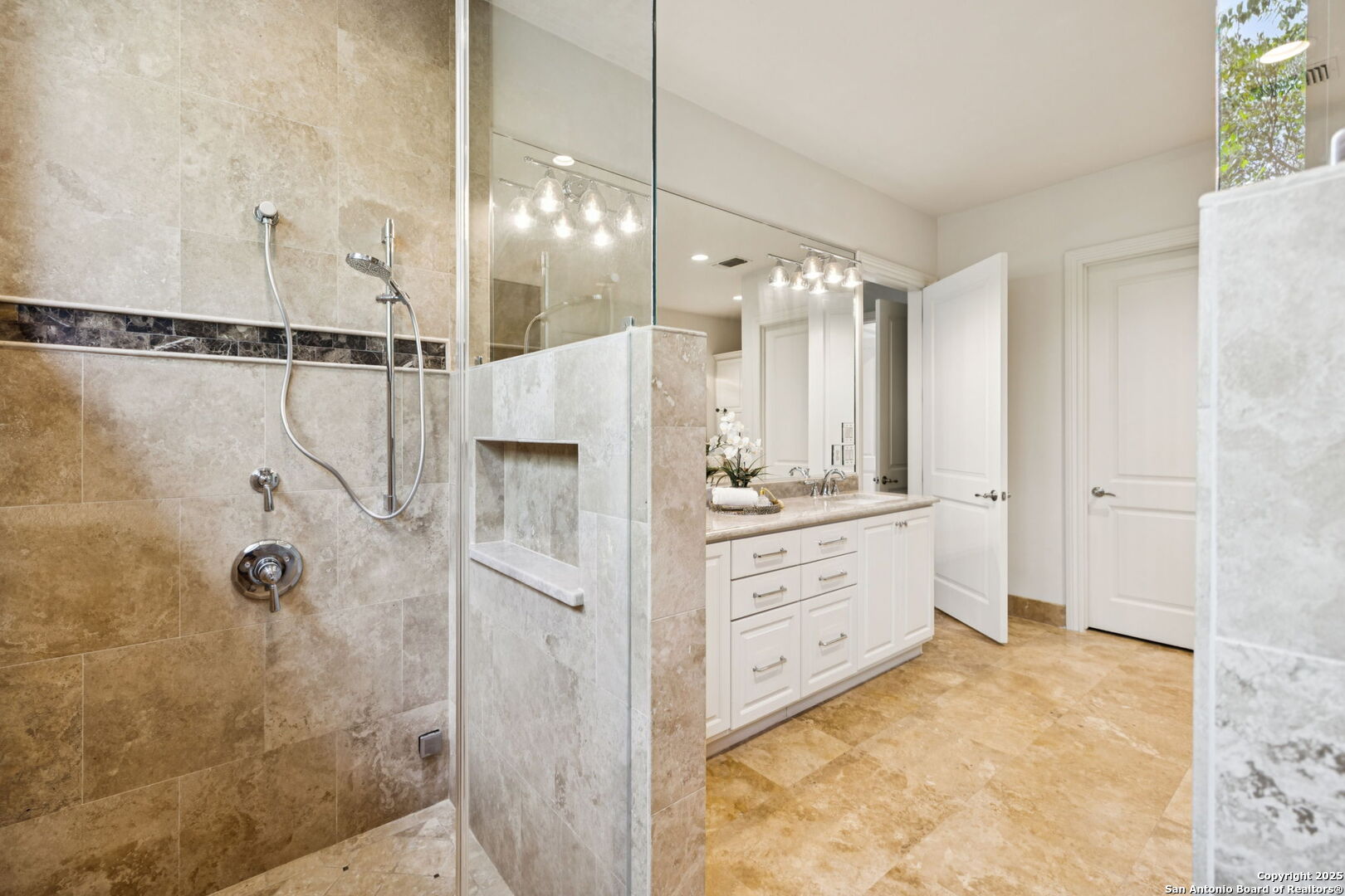 In one of San Antonio's most coveted ultra-luxury communities, this Burdick custom home pairs beautifully finished interiors with a year-round resort atmosphere. Hardwood and travertine floors lead through open, light-filled spaces with 25-foot ceilings, where quartzite and honed granite surfaces and striking light fixtures set an elevated tone. Two bedrooms, including the primary suite, are on the main level along with a private office and media room. The kitchen is anchored by a handsome stainless Wolf gas range and custom cabinetry. The primary suite features an incredible walk-in closet and a bath with a steam shower and a dramatic marble wall above the tub. Upstairs, a generous flex space adapts for storage, fitness, or a second office. Glass accordion doors open to a Keith Zars pool and spa with natural rock waterfall and slide, an outdoor kitchen with built-in grill and Green Egg, and an outdoor shower surrounded by lush landscaping and shaded terraces. 4 bed 4 bath 4258 sq ft .32 acre 25 ft ceilings Private study Media room Flex room Pool + spa w outdoor shower 3 car garage