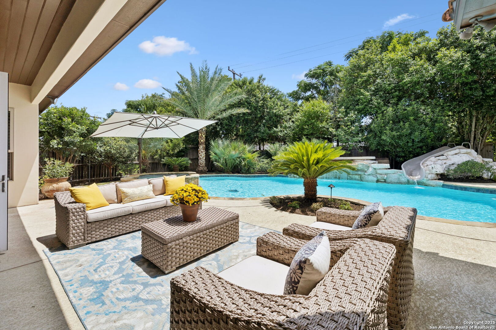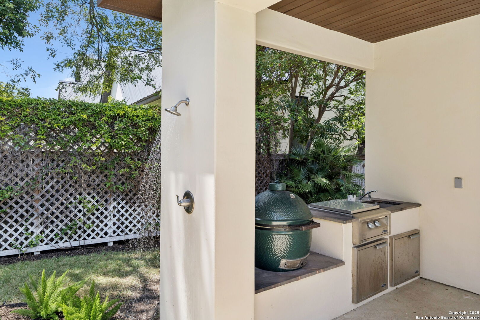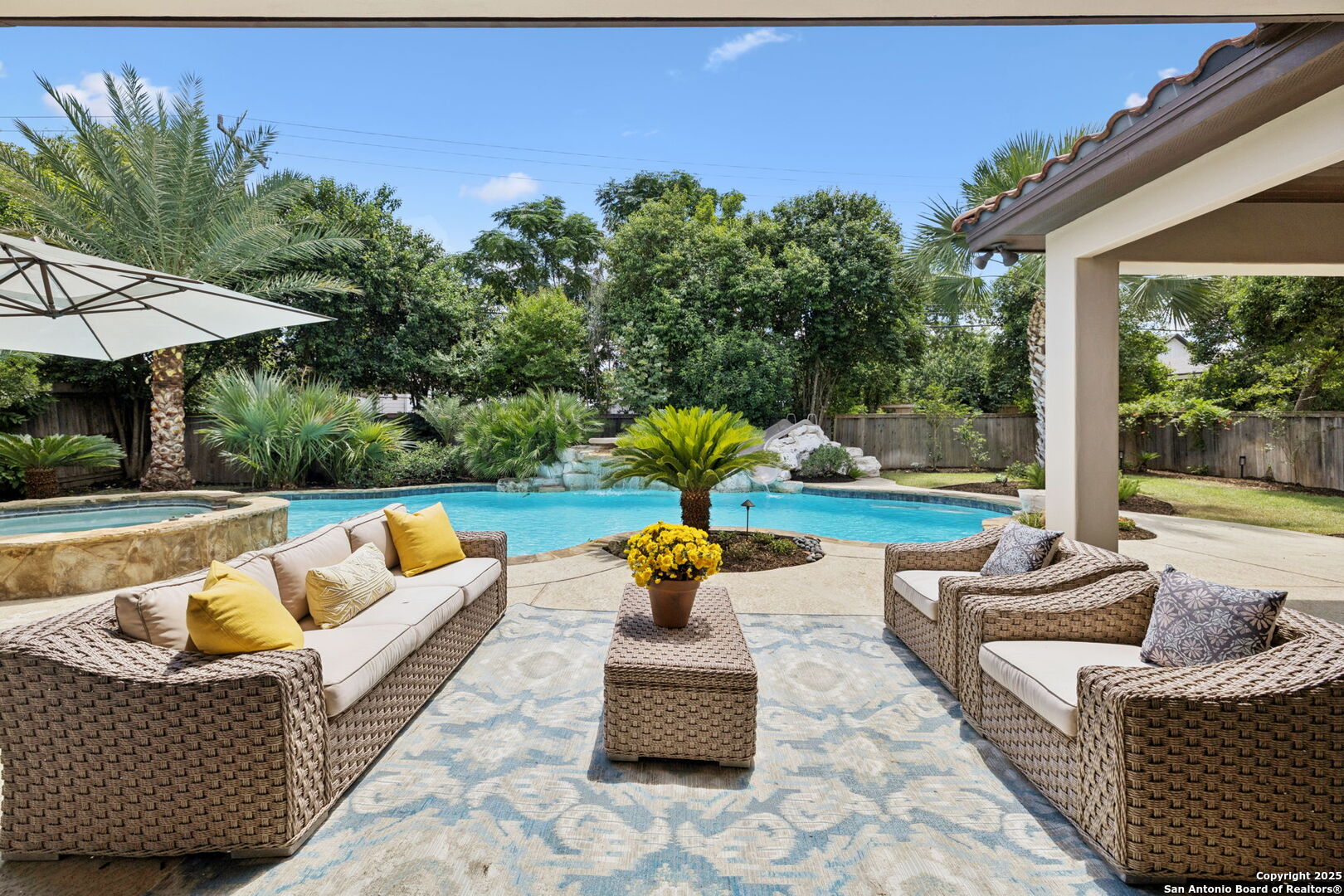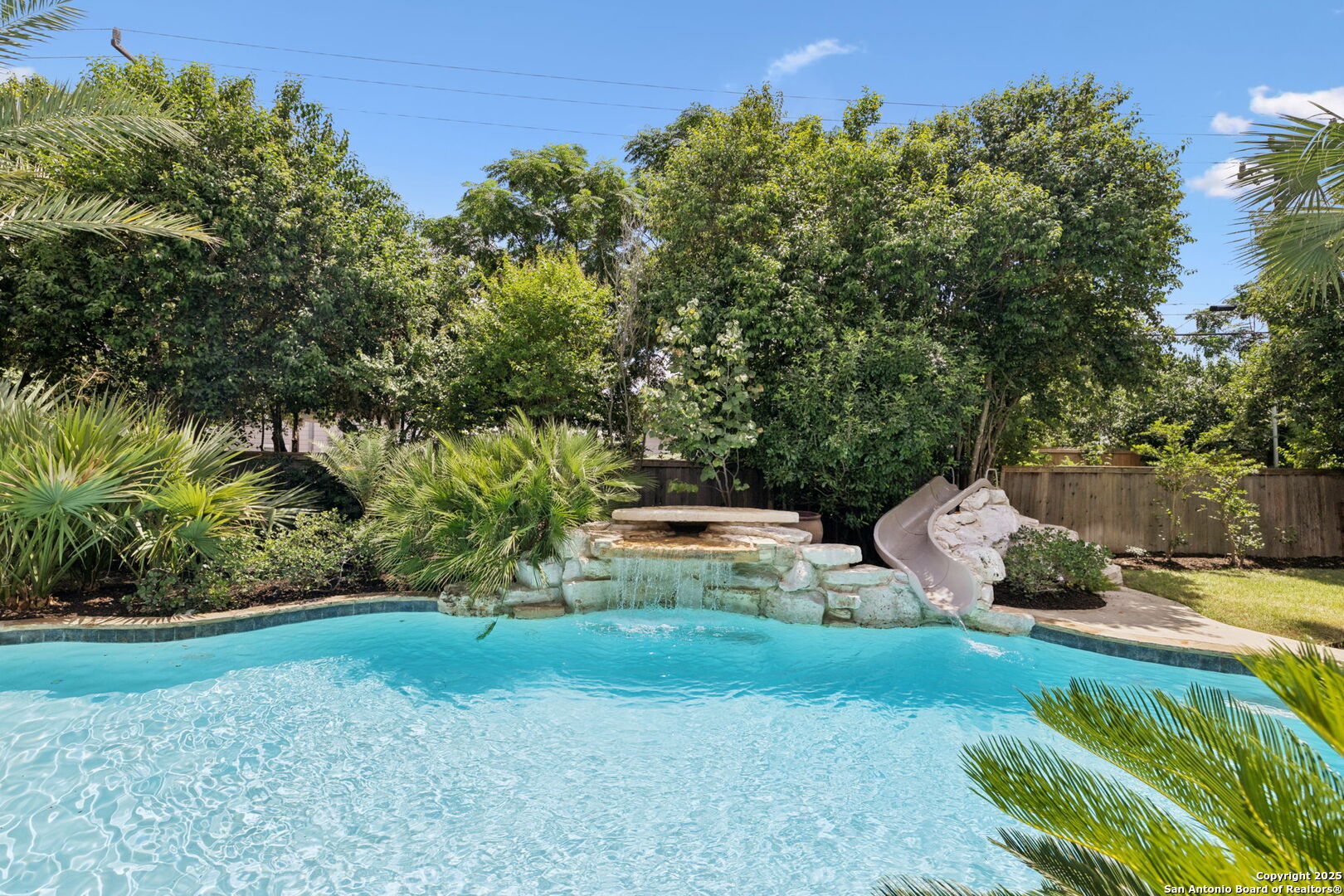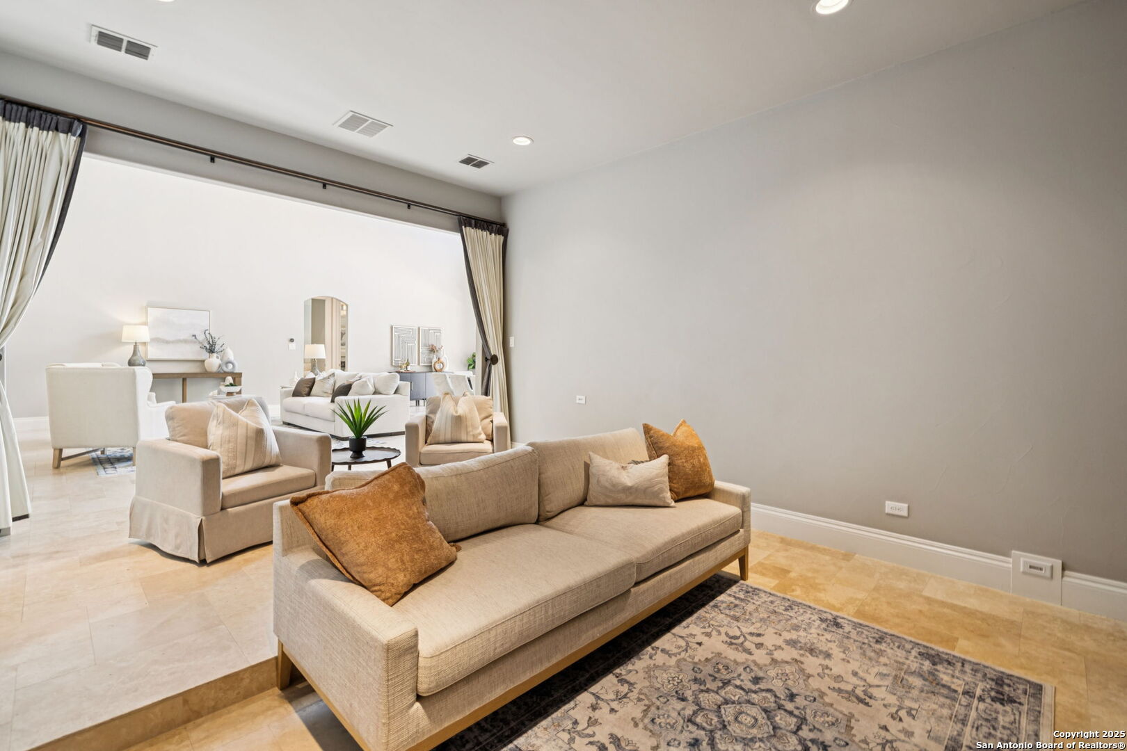 In one of San Antonio's most coveted ultra-luxury communities, this Burdick custom home pairs beautifully finished interiors with a year-round resort atmosphere. Hardwood and travertine floors lead through open, light-filled spaces with 25-foot ceilings, where quartzite and honed granite surfaces and striking light fixtures set an elevated tone. Two bedrooms, including the primary suite, are on the main level along with a private office and media room. The kitchen is anchored by a handsome stainless Wolf gas range and custom cabinetry. The primary suite features an incredible walk-in closet and a bath with a steam shower and a dramatic marble wall above the tub. Upstairs, a generous flex space adapts for storage, fitness, or a second office. Glass accordion doors open to a Keith Zars pool and spa with natural rock waterfall and slide, an outdoor kitchen with built-in grill and Green Egg, and an outdoor shower surrounded by lush landscaping and shaded terraces. 4 bed 4 bath 4258 sq ft .32 acre 25 ft ceilings Private study Media room Flex room Pool + spa w outdoor shower 3 car garage