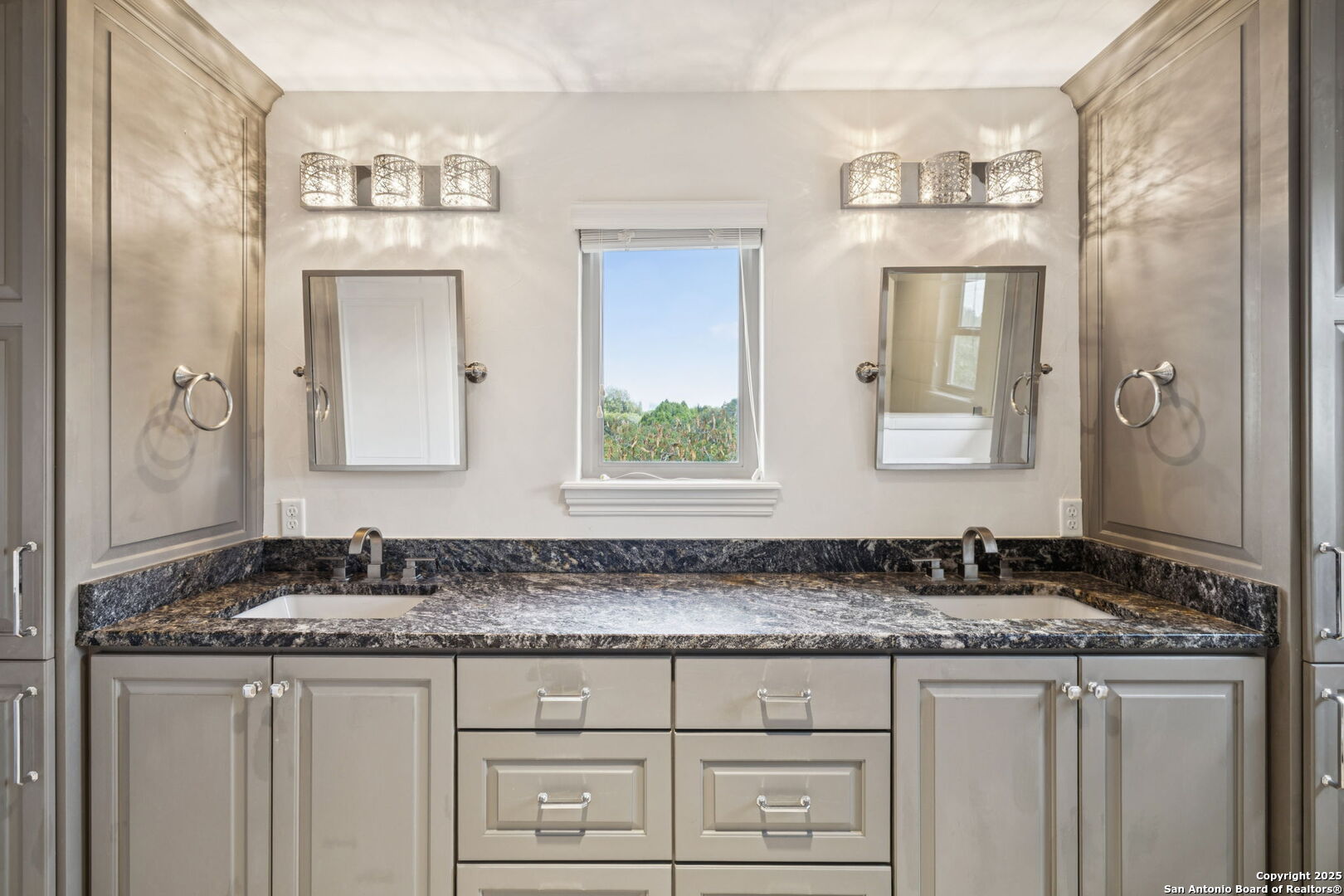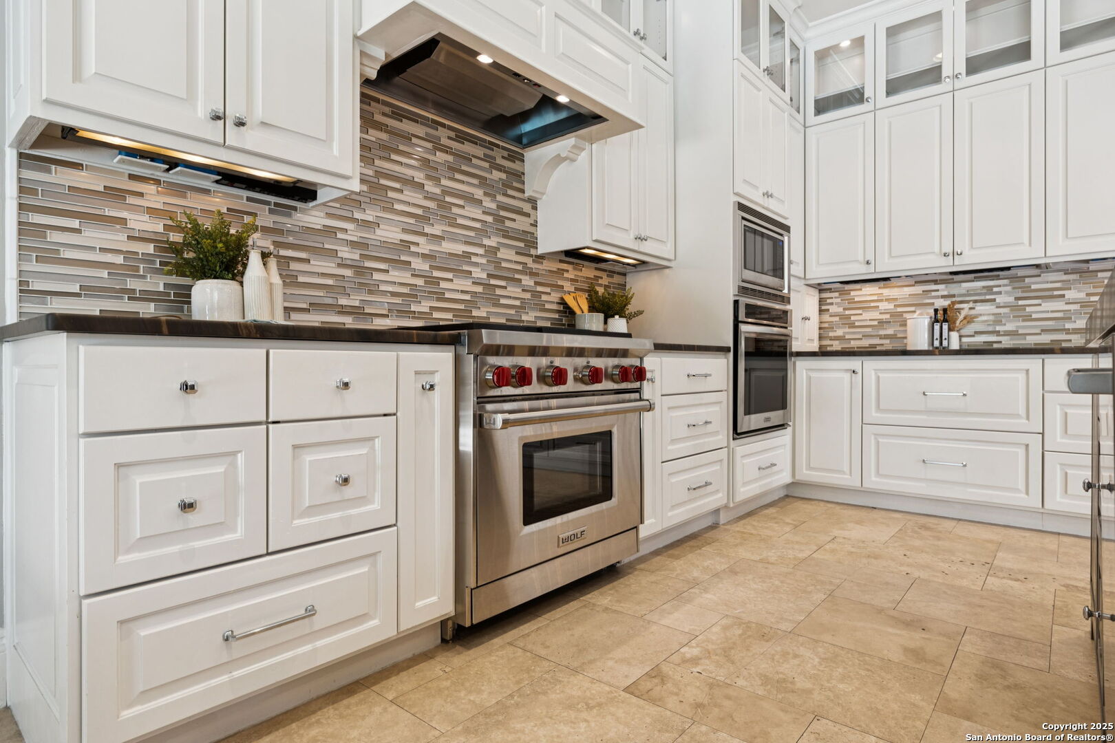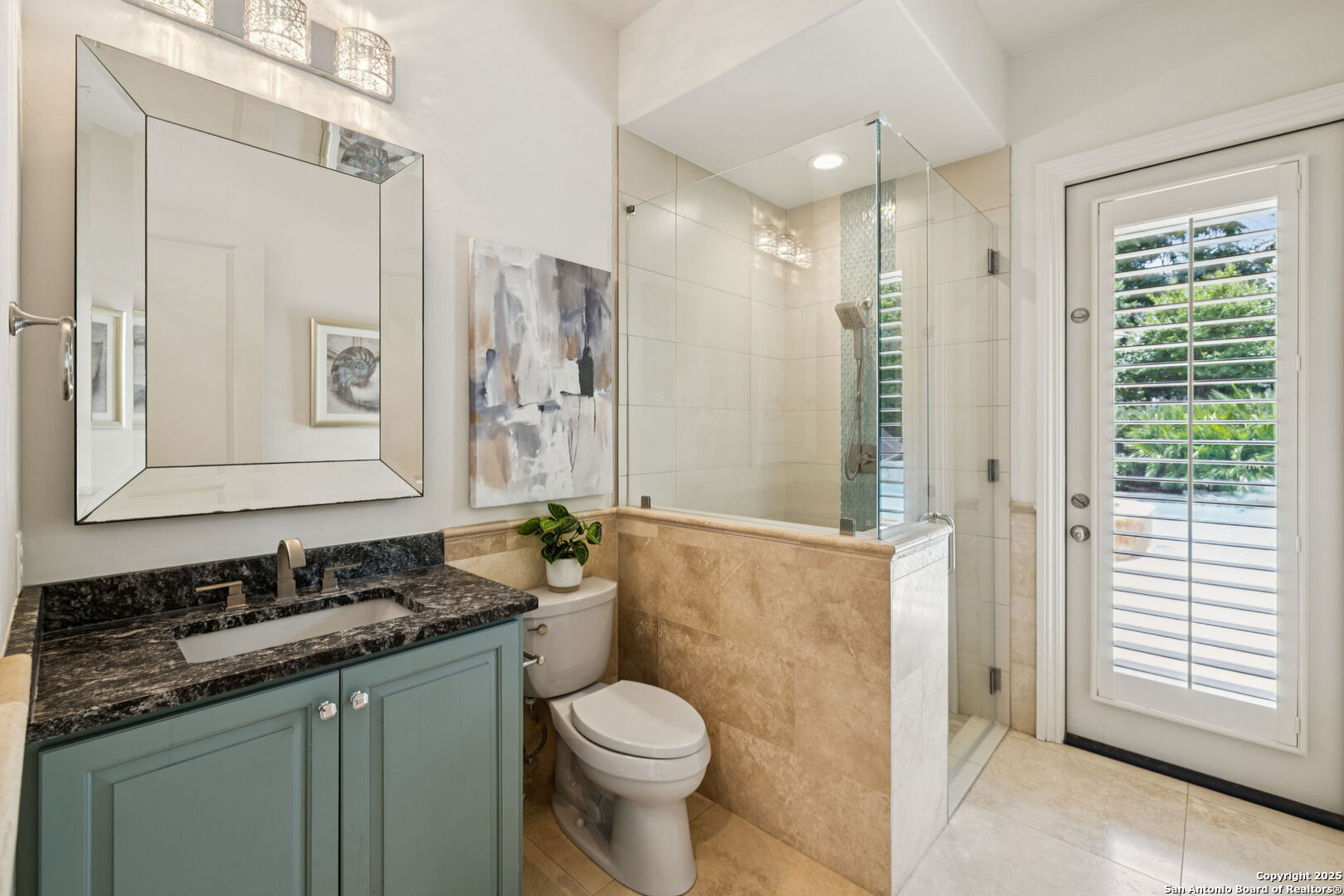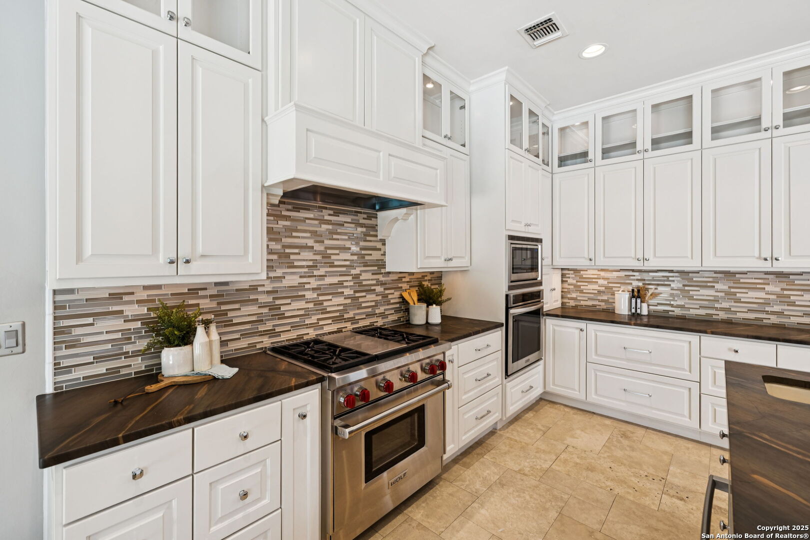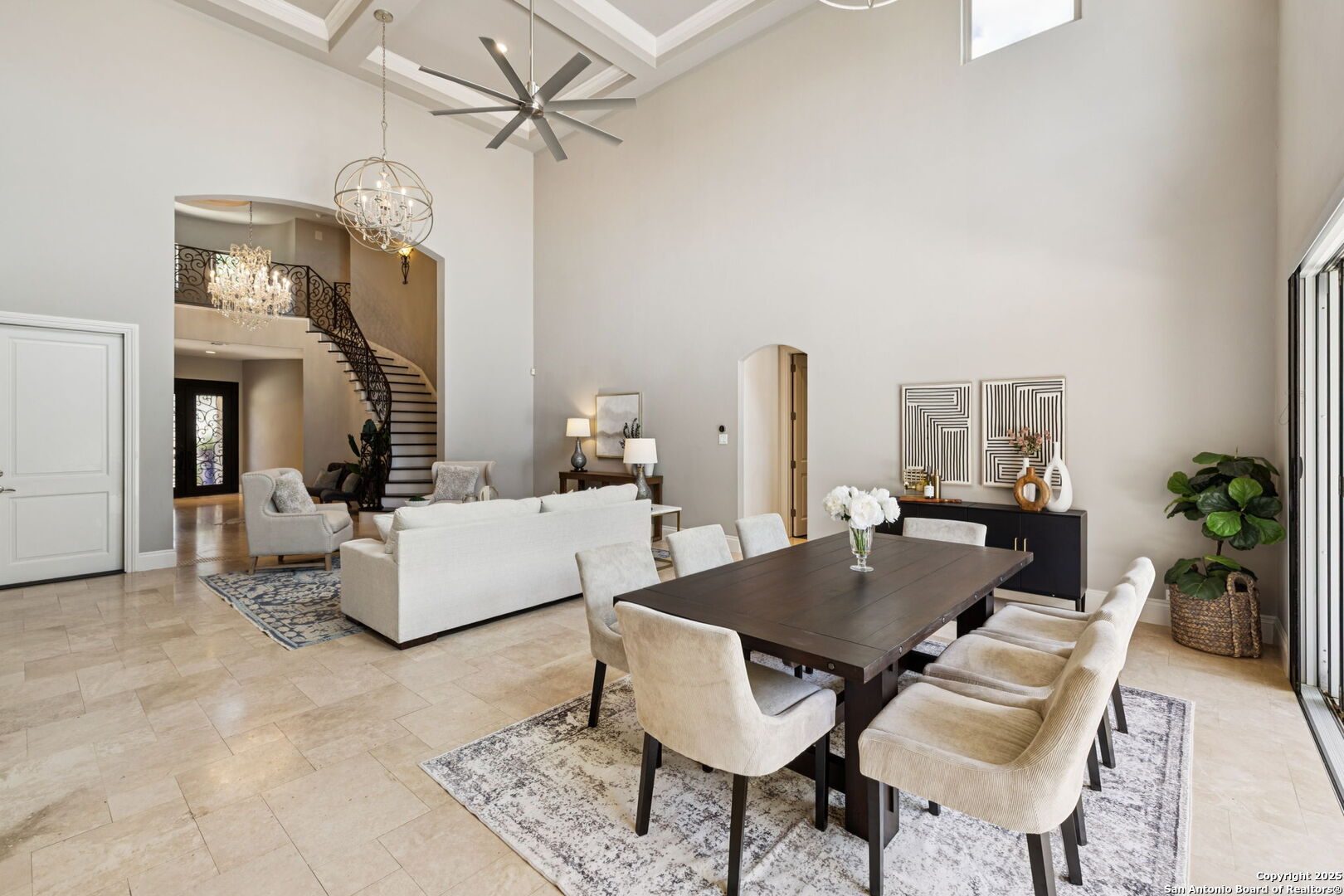 In one of San Antonio's most coveted ultra-luxury communities, this Burdick custom home pairs beautifully finished interiors with a year-round resort atmosphere. Hardwood and travertine floors lead through open, light-filled spaces with 25-foot ceilings, where quartzite and honed granite surfaces and striking light fixtures set an elevated tone. Two bedrooms, including the primary suite, are on the main level along with a private office and media room. The kitchen is anchored by a handsome stainless Wolf gas range and custom cabinetry. The primary suite features an incredible walk-in closet and a bath with a steam shower and a dramatic marble wall above the tub. Upstairs, a generous flex space adapts for storage, fitness, or a second office. Glass accordion doors open to a Keith Zars pool and spa with natural rock waterfall and slide, an outdoor kitchen with built-in grill and Green Egg, and an outdoor shower surrounded by lush landscaping and shaded terraces. 4 bed 4 bath 4258 sq ft .32 acre 25 ft ceilings Private study Media room Flex room Pool + spa w outdoor shower 3 car garage