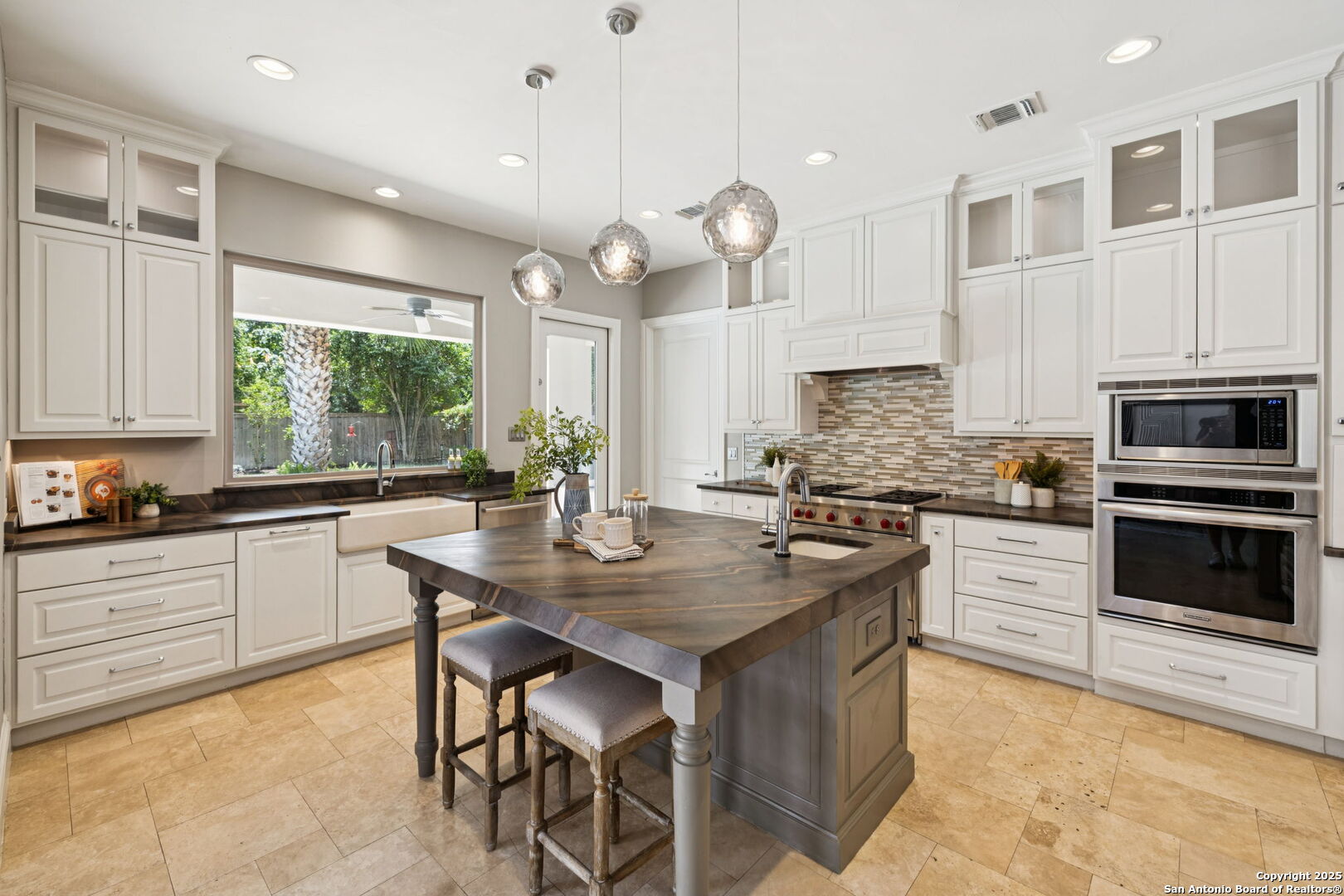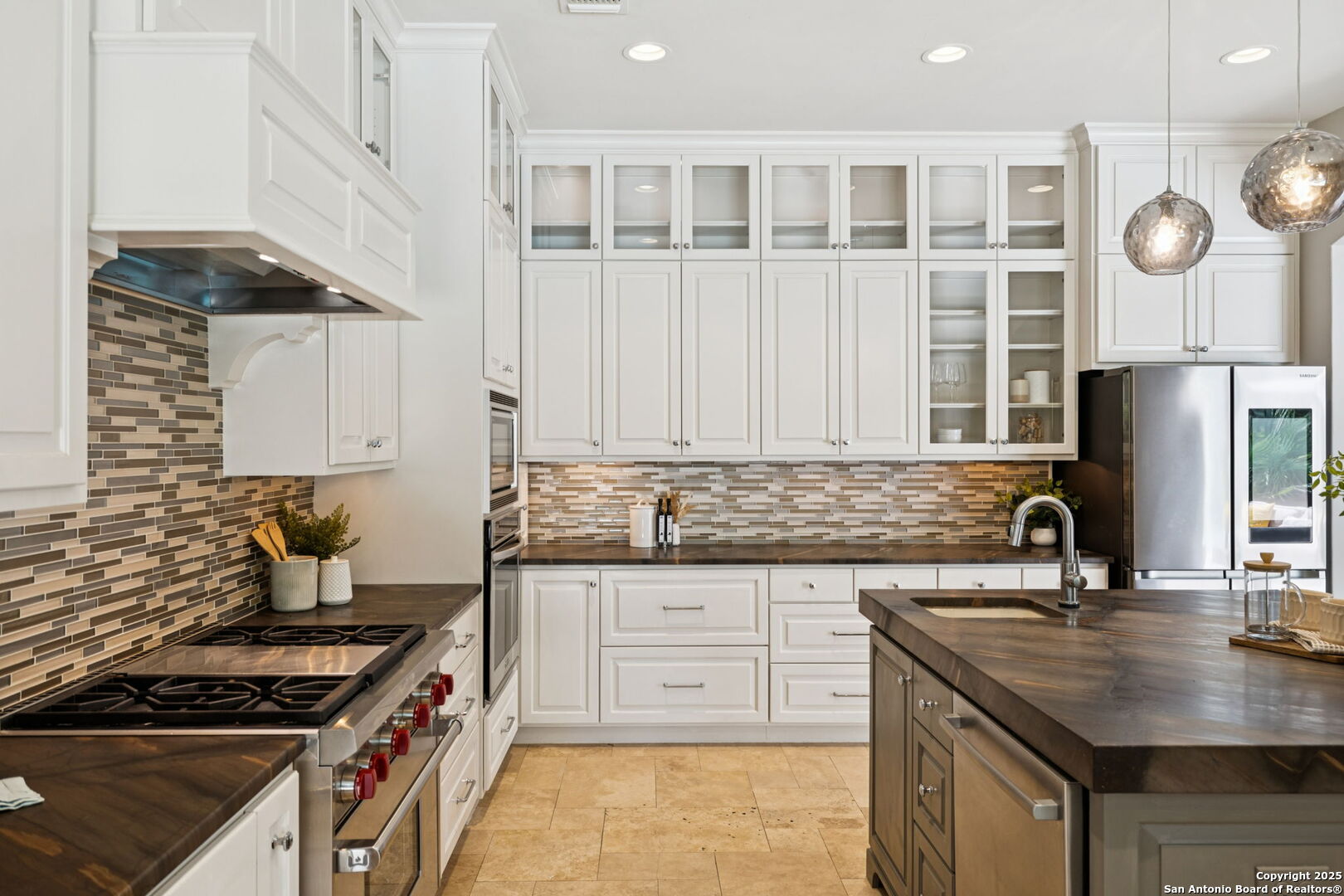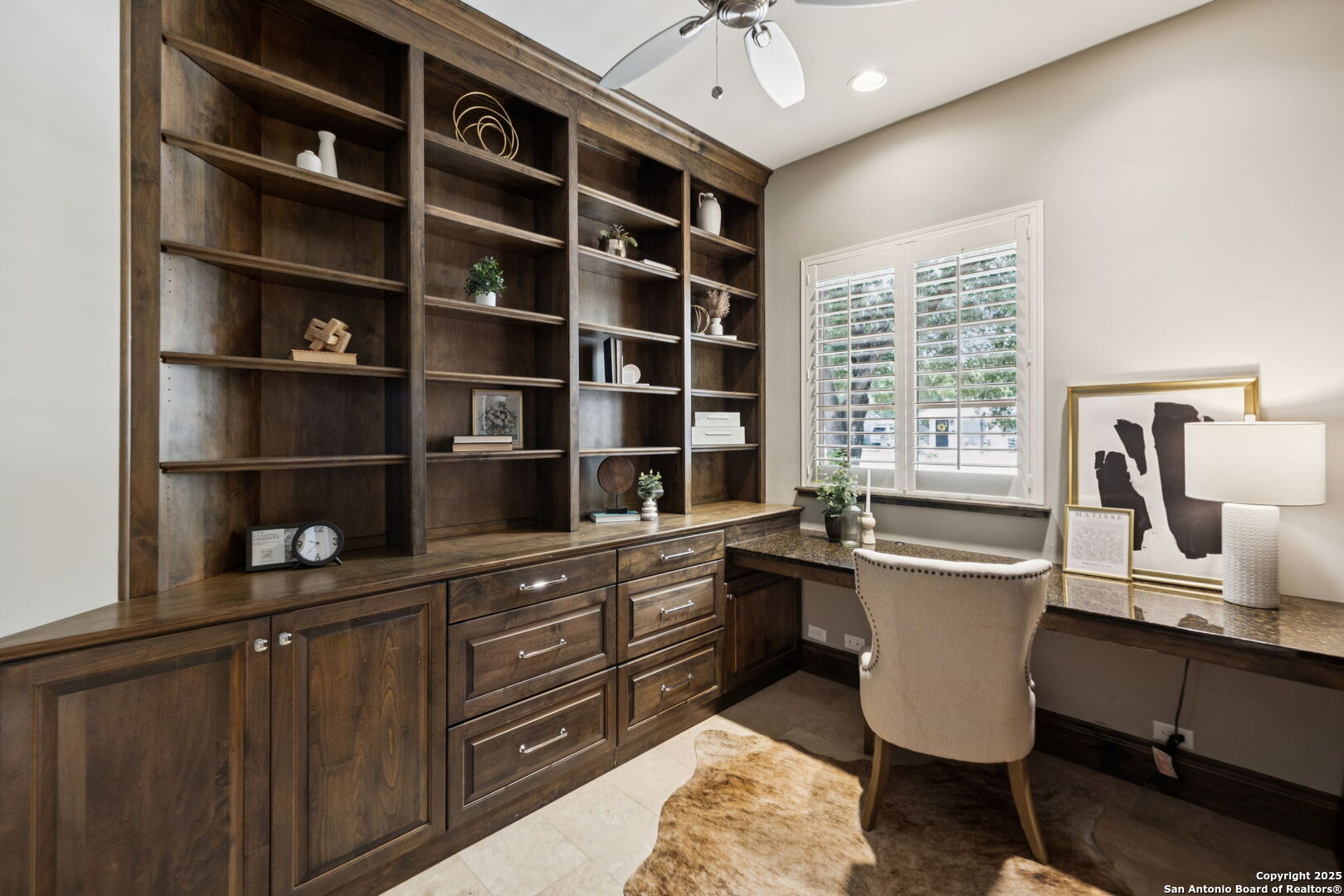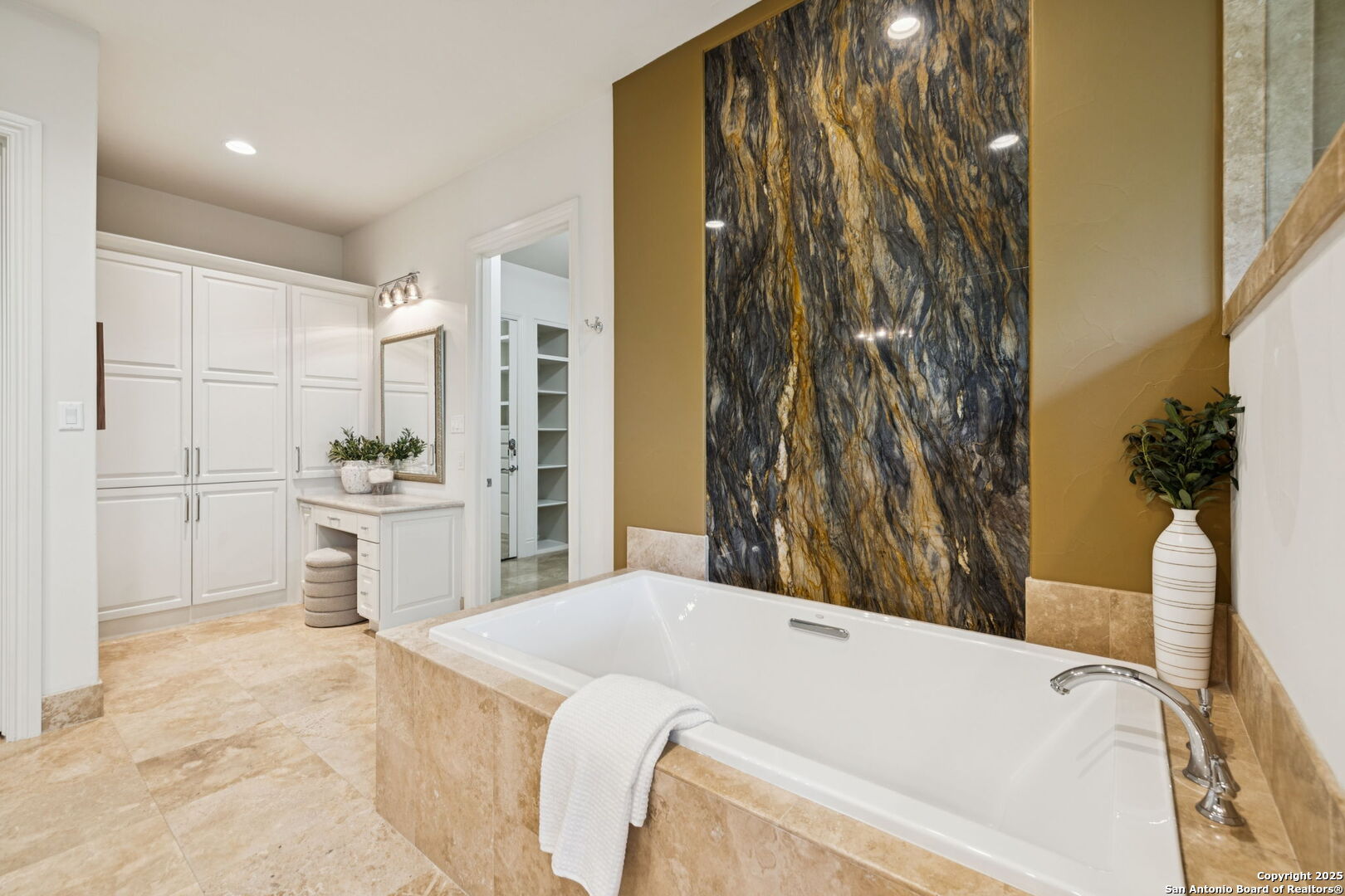 In one of San Antonio's most coveted ultra-luxury communities, this Burdick custom home pairs beautifully finished interiors with a year-round resort atmosphere. Hardwood and travertine floors lead through open, light-filled spaces with 25-foot ceilings, where quartzite and honed granite surfaces and striking light fixtures set an elevated tone. Two bedrooms, including the primary suite, are on the main level along with a private office and media room. The kitchen is anchored by a handsome stainless Wolf gas range and custom cabinetry. The primary suite features an incredible walk-in closet and a bath with a steam shower and a dramatic marble wall above the tub. Upstairs, a generous flex space adapts for storage, fitness, or a second office. Glass accordion doors open to a Keith Zars pool and spa with natural rock waterfall and slide, an outdoor kitchen with built-in grill and Green Egg, and an outdoor shower surrounded by lush landscaping and shaded terraces. 4 bed 4 bath 4258 sq ft .32 acre 25 ft ceilings Private study Media room Flex room Pool + spa w outdoor shower 3 car garage