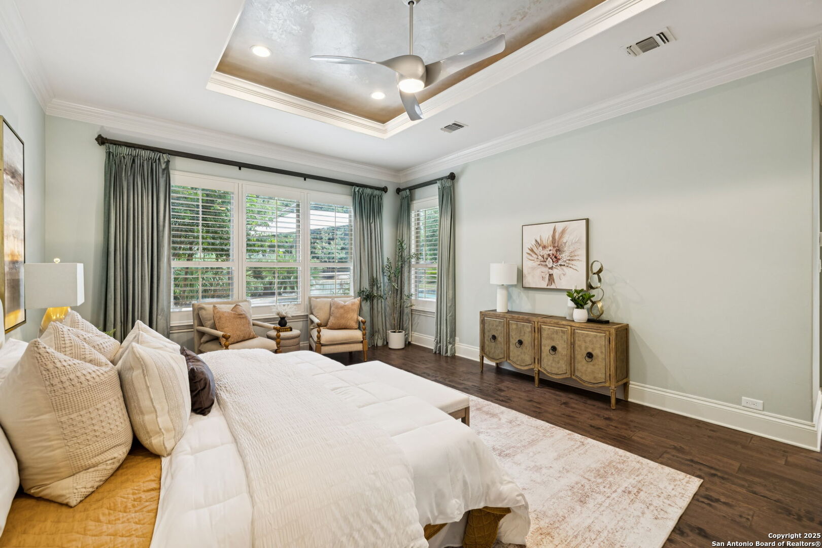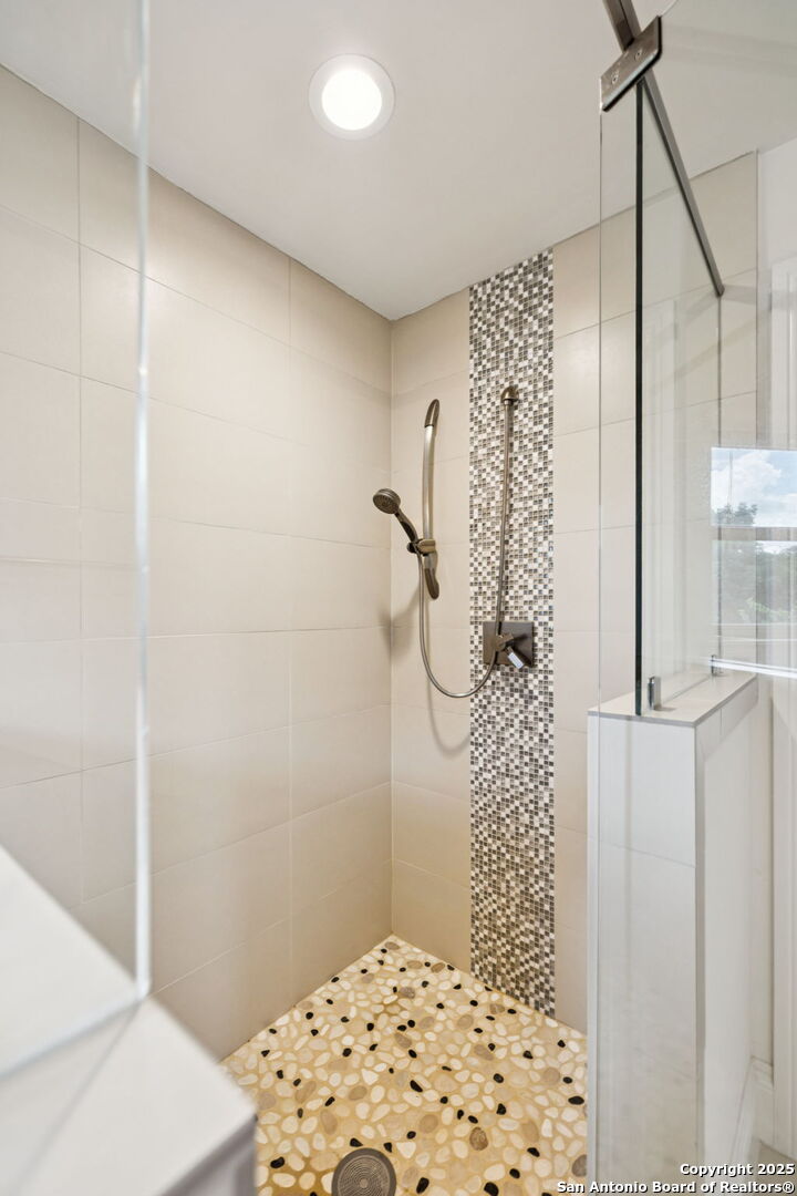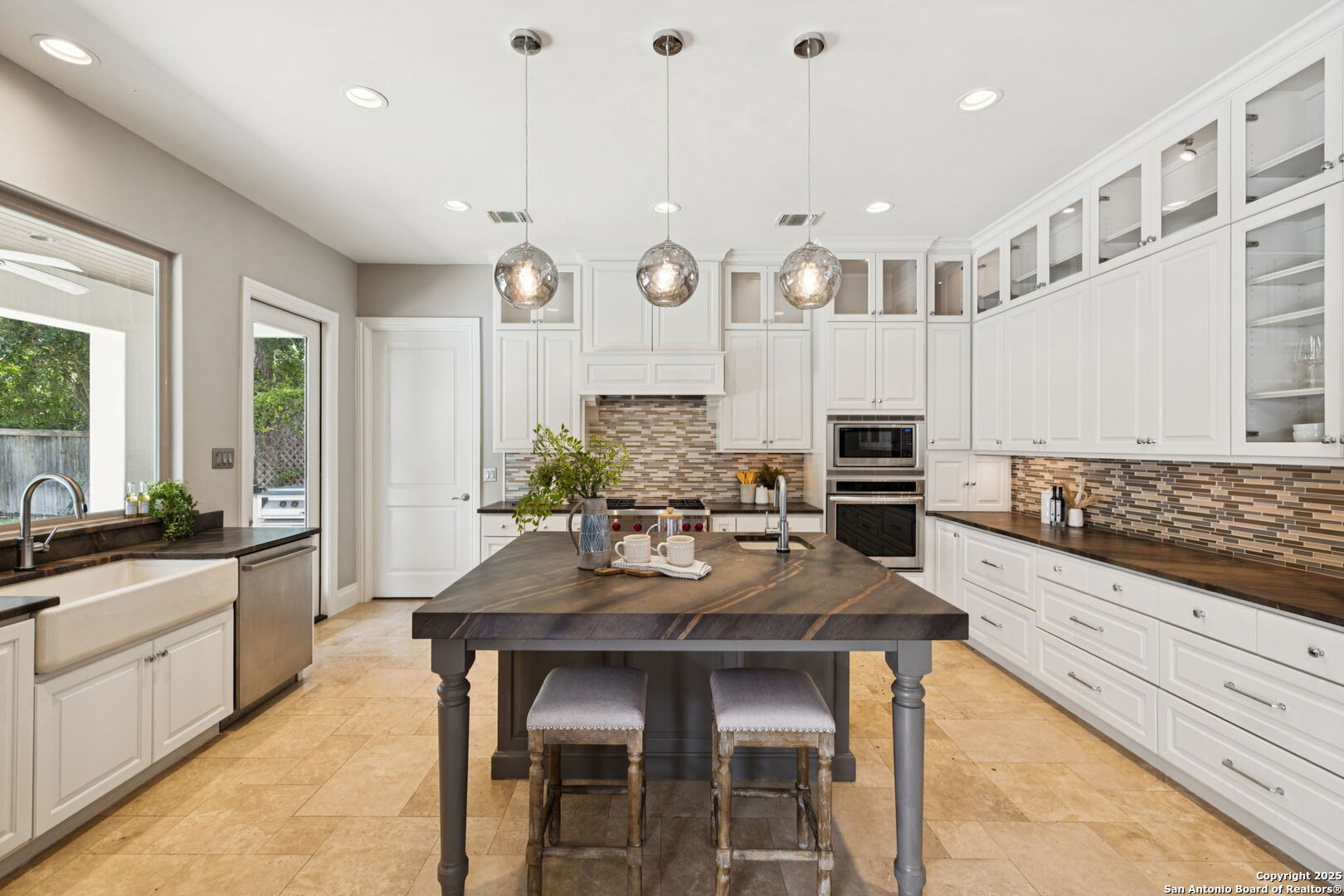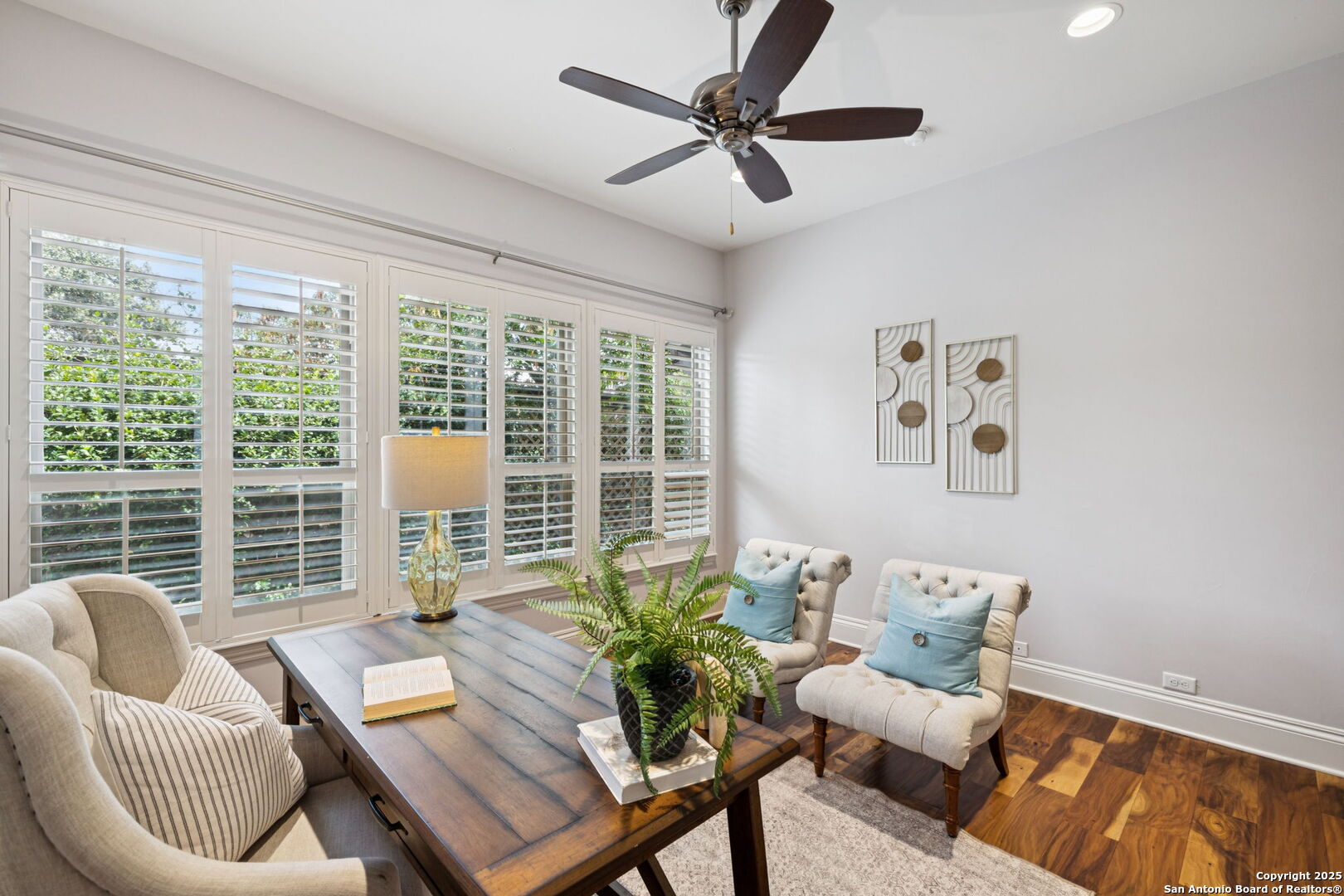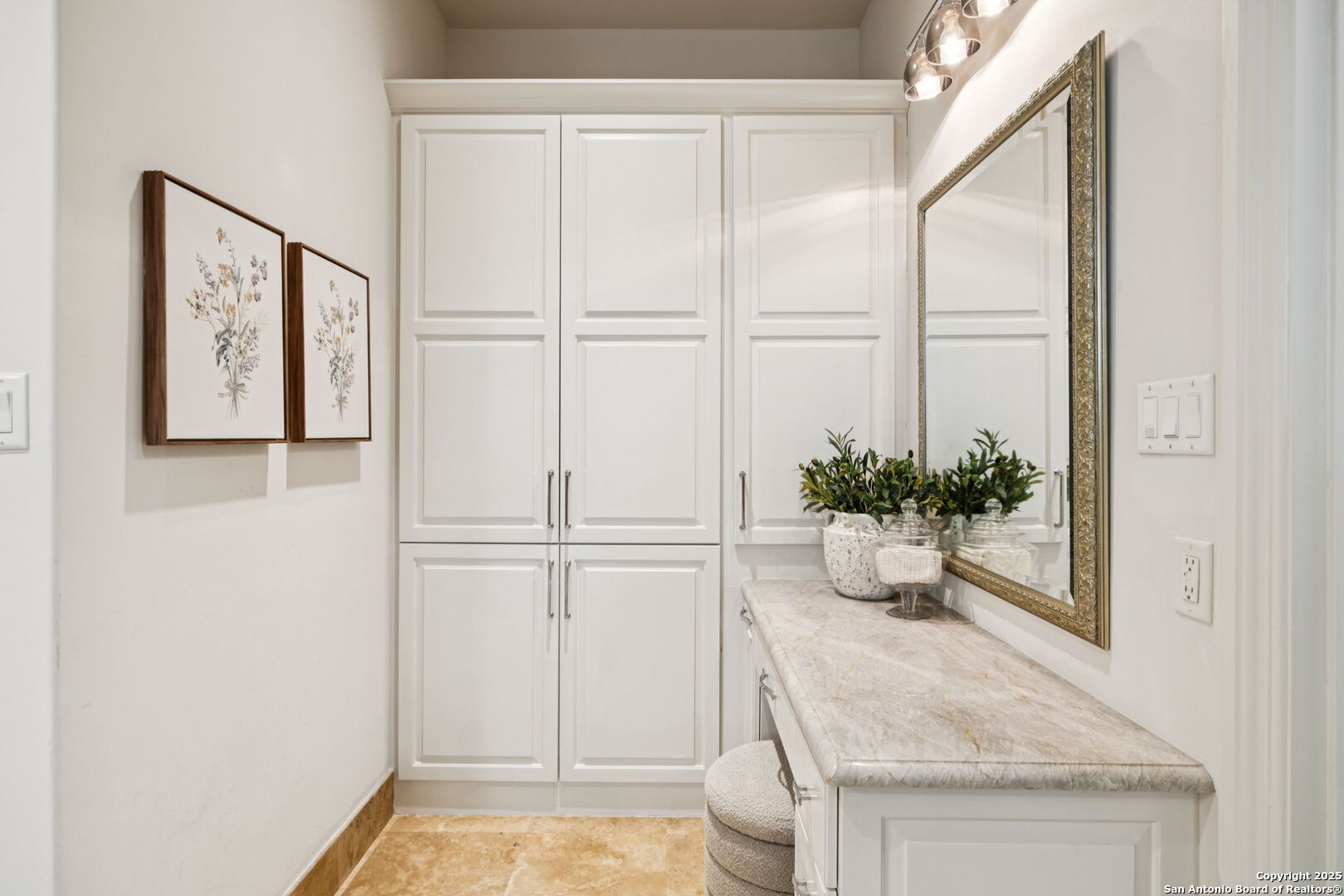 In one of San Antonio's most coveted ultra-luxury communities, this Burdick custom home pairs beautifully finished interiors with a year-round resort atmosphere. Hardwood and travertine floors lead through open, light-filled spaces with 25-foot ceilings, where quartzite and honed granite surfaces and striking light fixtures set an elevated tone. Two bedrooms, including the primary suite, are on the main level along with a private office and media room. The kitchen is anchored by a handsome stainless Wolf gas range and custom cabinetry. The primary suite features an incredible walk-in closet and a bath with a steam shower and a dramatic marble wall above the tub. Upstairs, a generous flex space adapts for storage, fitness, or a second office. Glass accordion doors open to a Keith Zars pool and spa with natural rock waterfall and slide, an outdoor kitchen with built-in grill and Green Egg, and an outdoor shower surrounded by lush landscaping and shaded terraces. 4 bed 4 bath 4258 sq ft .32 acre 25 ft ceilings Private study Media room Flex room Pool + spa w outdoor shower 3 car garage