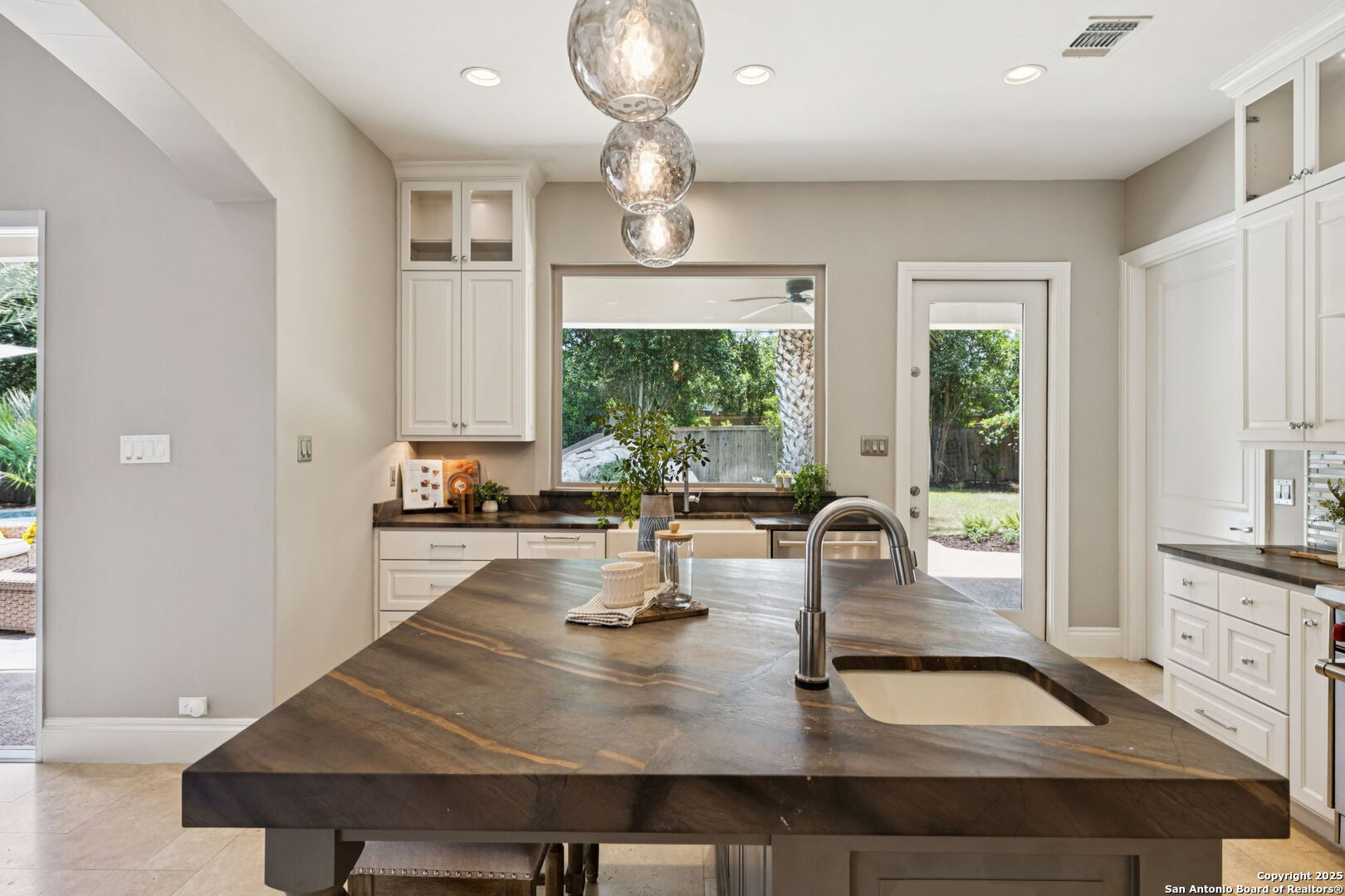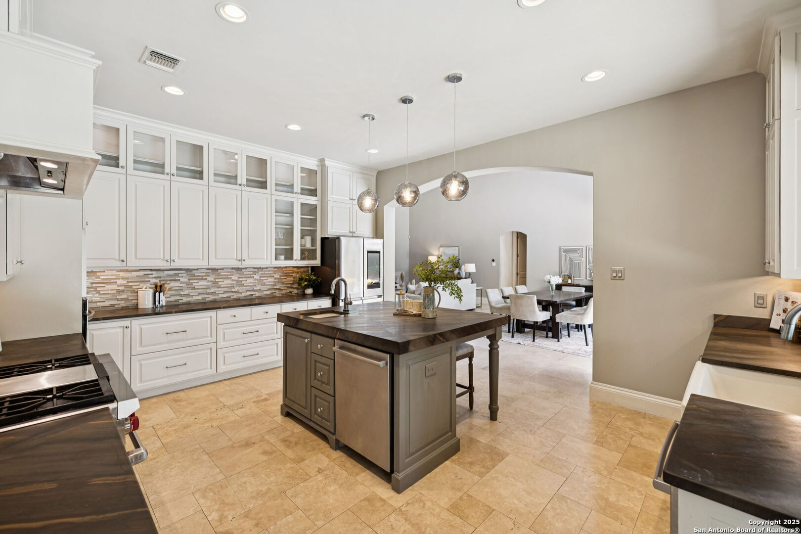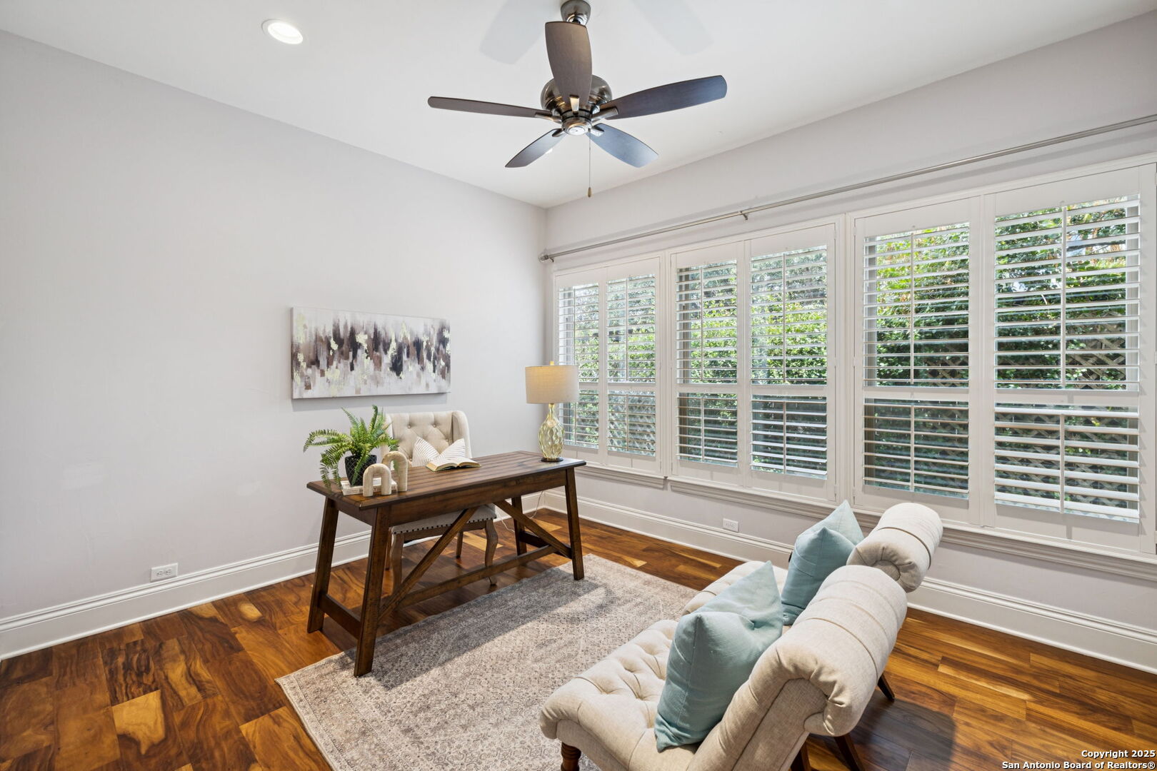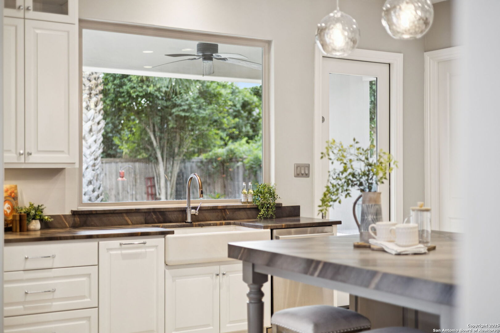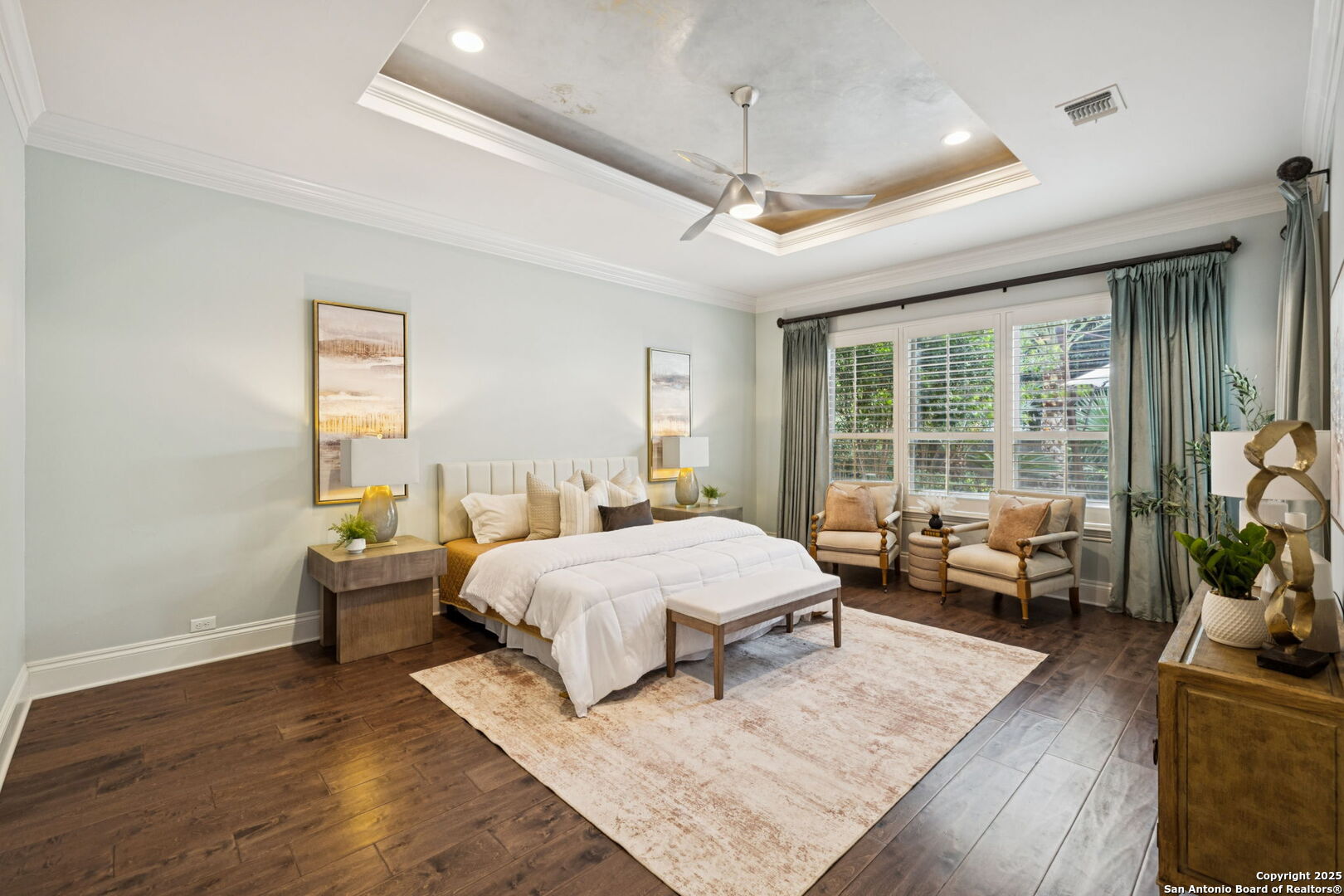 In one of San Antonio's most coveted ultra-luxury communities, this Burdick custom home pairs beautifully finished interiors with a year-round resort atmosphere. Hardwood and travertine floors lead through open, light-filled spaces with 25-foot ceilings, where quartzite and honed granite surfaces and striking light fixtures set an elevated tone. Two bedrooms, including the primary suite, are on the main level along with a private office and media room. The kitchen is anchored by a handsome stainless Wolf gas range and custom cabinetry. The primary suite features an incredible walk-in closet and a bath with a steam shower and a dramatic marble wall above the tub. Upstairs, a generous flex space adapts for storage, fitness, or a second office. Glass accordion doors open to a Keith Zars pool and spa with natural rock waterfall and slide, an outdoor kitchen with built-in grill and Green Egg, and an outdoor shower surrounded by lush landscaping and shaded terraces. 4 bed 4 bath 4258 sq ft .32 acre 25 ft ceilings Private study Media room Flex room Pool + spa w outdoor shower 3 car garage