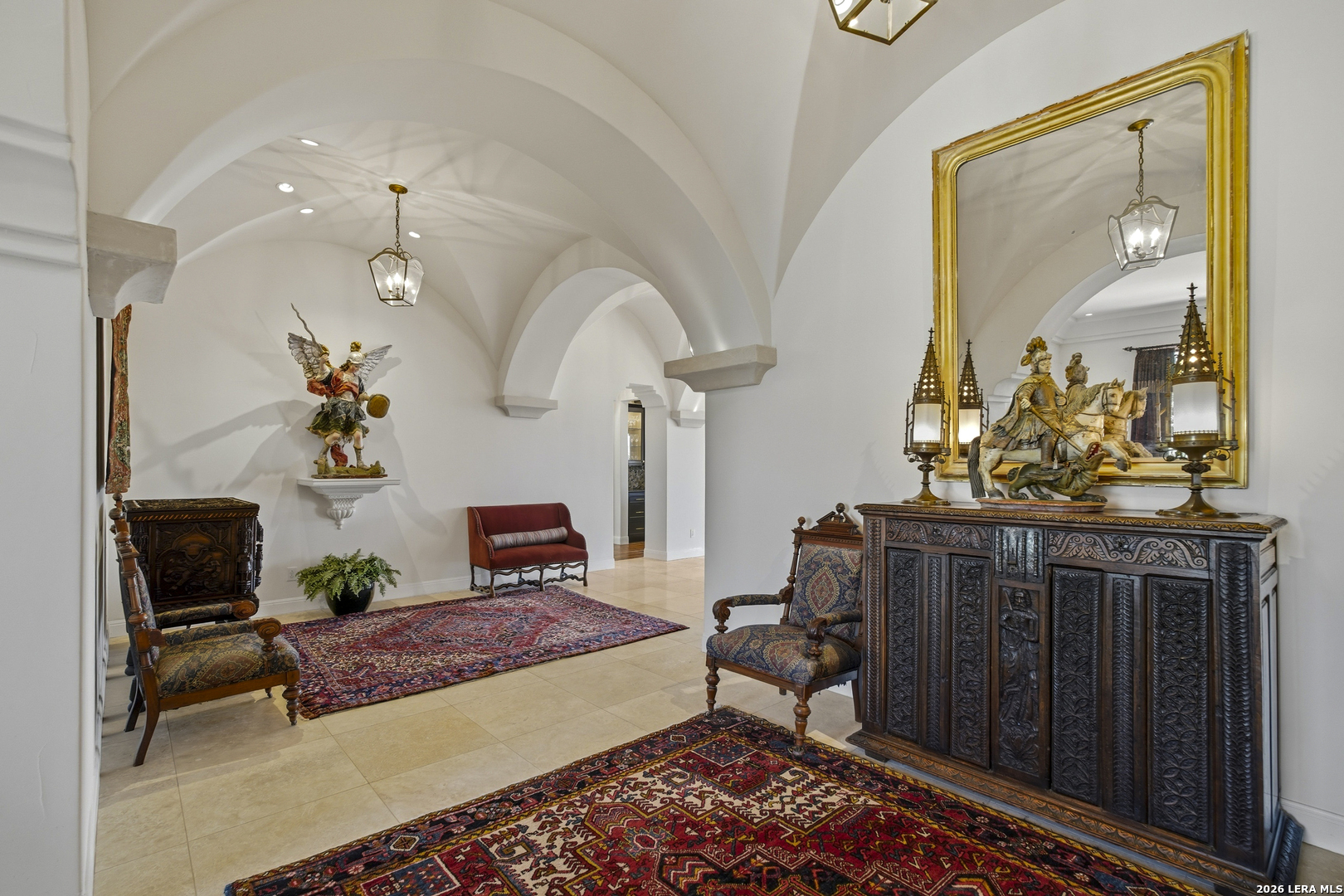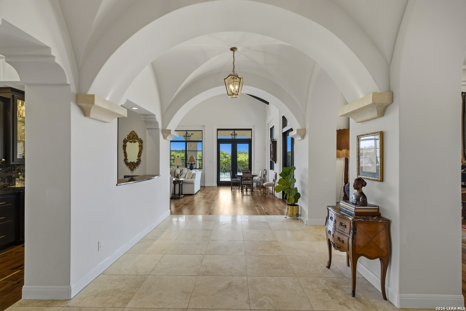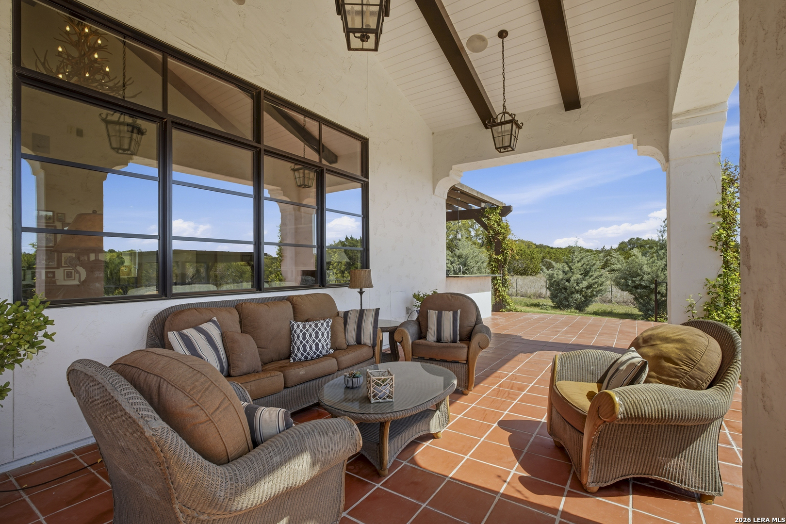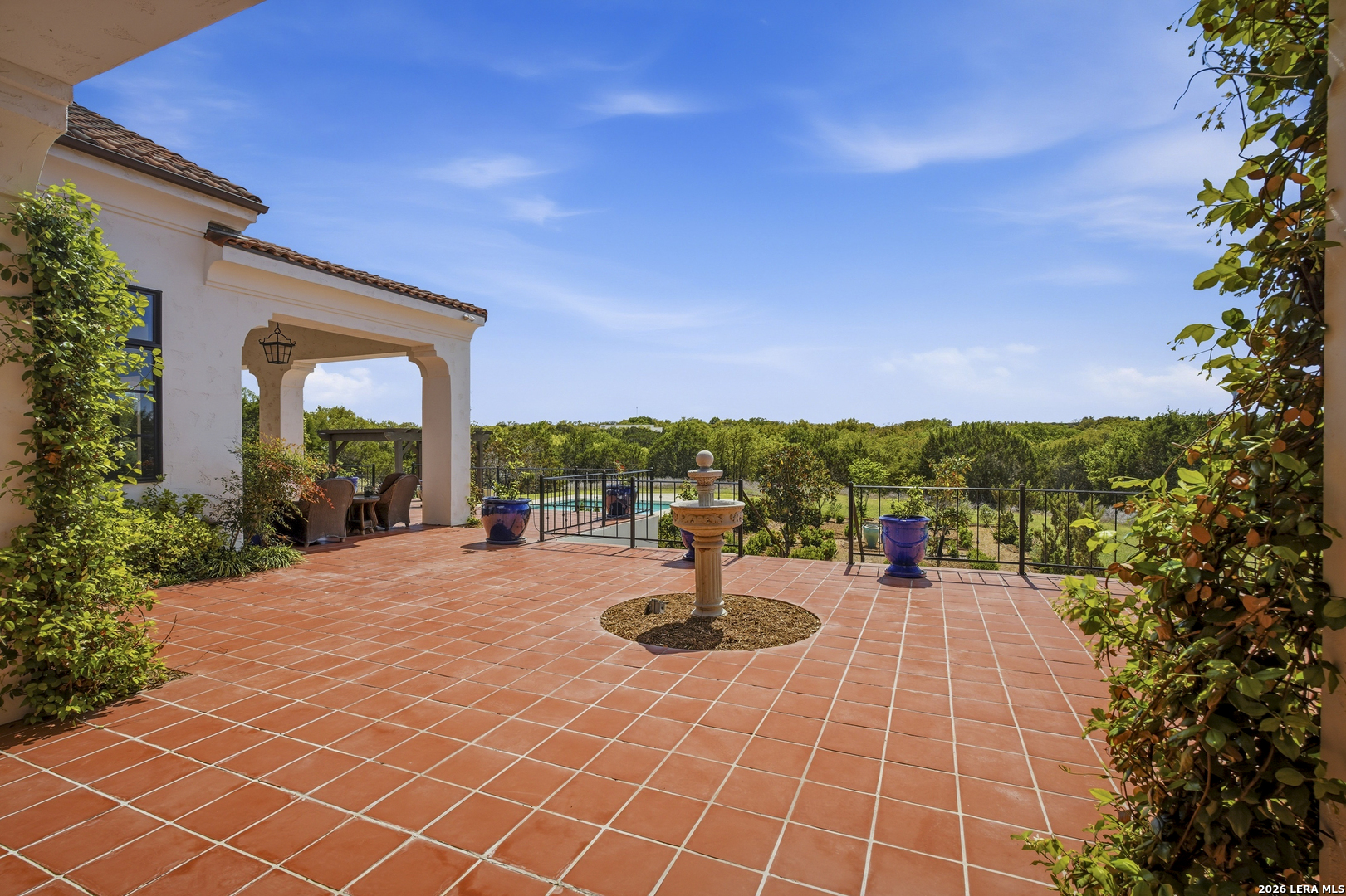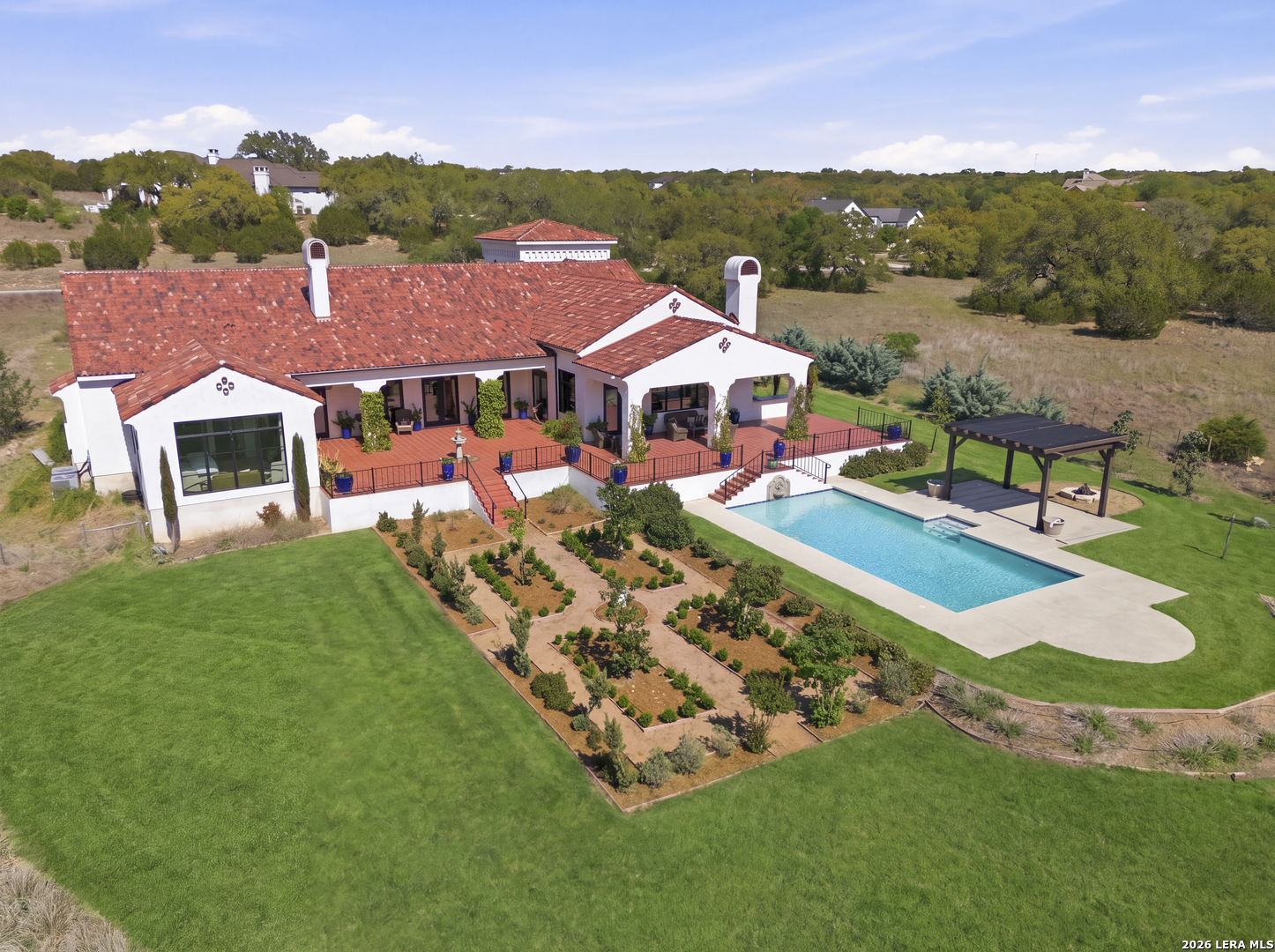 Nestled within the highly desirable Cordillera Ranch community, this stunning Spanish-style luxury estate sits on just over 2.5 acres, offering exceptional privacy surrounded by mature trees and natural beauty. As you enter the home, you're immediately welcomed by the first living area, where expansive views of your outdoor oasis set the tone. This inviting space features a fireplace and ample room for gathering, seamlessly blending indoor comfort with outdoor charm. To the left, a graceful gallery leads you past a separate formal dining room, perfect for hosting elegant dinners. Beyond, the home opens into a spectacular great room with an open-concept layout connecting the breakfast area, kitchen, and wet bar, complete with a sink and beverage refrigerator, creating an ideal setting for entertaining. The kitchen is a true centerpiece, featuring a large island, abundant cabinetry, double ovens, gas cooking, marble countertops, and a farmhouse sink perfectly positioned beneath a window overlooking the outdoors. A butler's pantry enhances functionality with a wine fridge, sink, and space for a second refrigerator, in addition to a separate walk-in pantry. On the opposite wing of the home, a cozy sitting room leads into the luxurious primary suite. This private retreat includes two walk-in closets and a spa-like bathroom with a garden tub, walk-in shower, and dual vanities. The main level also offers three additional bedrooms, each with walk-in closets, two connected by a Jack and Jill bathroom and one featuring its own en suite. Upstairs, you'll find a versatile hobby or craft room along with a spacious bonus room, ideal for a game room or additional living space. Step outside to your own private oasis, designed for both relaxation and entertaining. Expansive covered patios, an outdoor kitchen with a gas grill and sink, and a charming courtyard all overlook breathtaking views. The space continues with a step-down to a large pool, complete with a pergola and adjacent fire pit, as well as a whole garden for added tranquility. A separate patio pergola off the breakfast room offers yet another peaceful retreat. Additional features include a spacious laundry room, a 4-car attached garage, and abundant natural light throughout the home, enhancing its warm and inviting atmosphere. This remarkable property combines timeless Spanish architecture, thoughtful design, and serene surroundings to create a truly exceptional living experience.