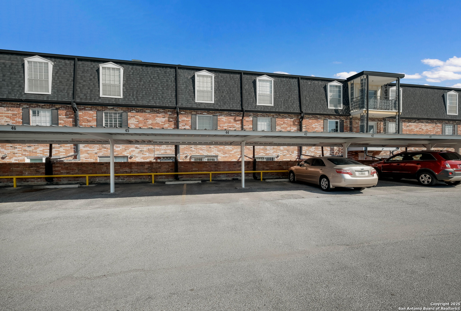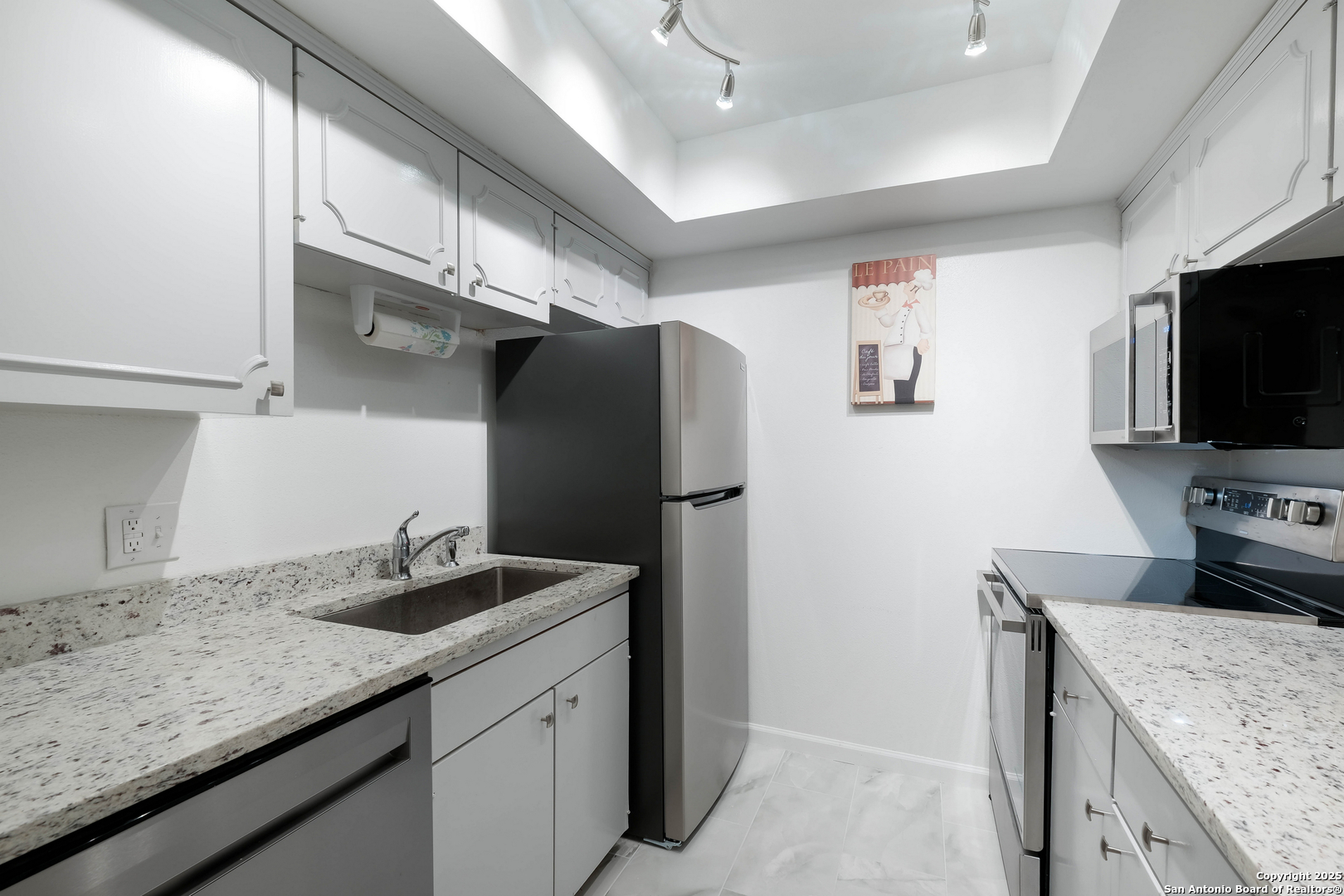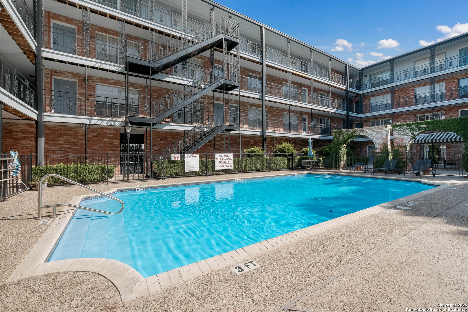 GROUND FLOOR UNIT! This beautifully updated 1-bedroom, 1-bathroom ground-floor condo in the Georgian Condos is move-in ready and located in the desirable Alamo Heights area. Featuring new plush wall-to-wall carpet with a premium pad, new appliances (including a refrigerator with an ice maker), and a kitchen with new tile flooring and granite countertops, this condo has been fully refreshed. The bathroom boasts a new walk-in shower with sliding glass doors, new tile flooring, a vanity, and updated fans. Wood blinds, new drapes, and ceiling fans in each room complete the modern touches. Onsite laundry room, library and pool are just steps from the front door. Conveniently located near stores and restaurants, this unit offers easy access from the complex entry.