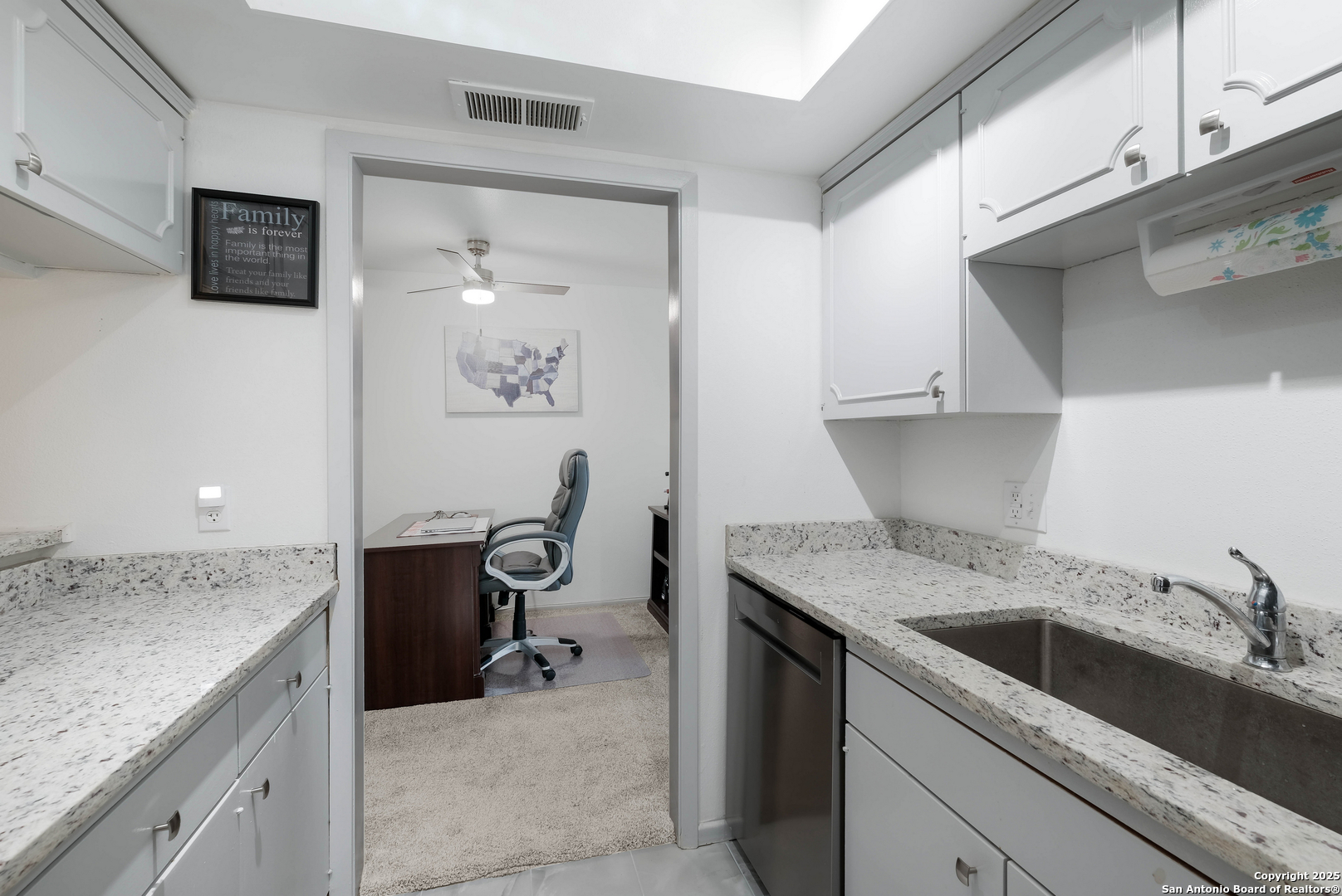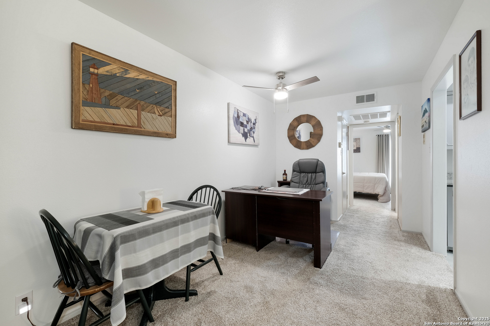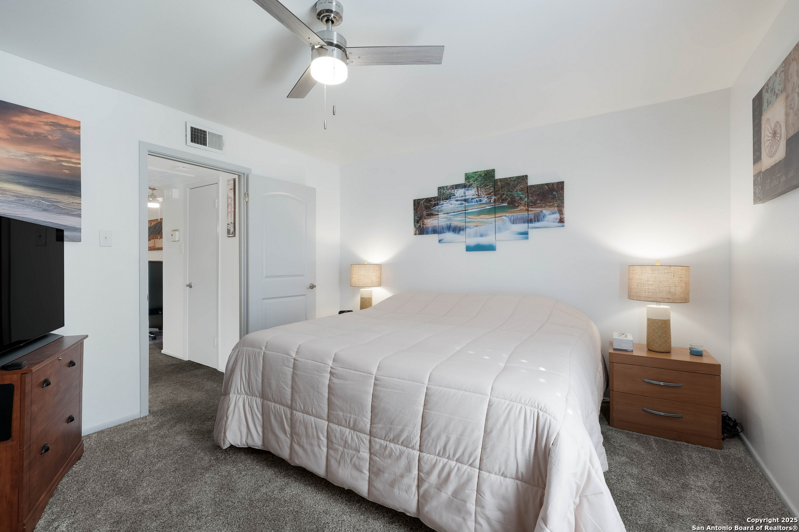 GROUND FLOOR UNIT! This beautifully updated 1-bedroom, 1-bathroom ground-floor condo in the Georgian Condos is move-in ready and located in the desirable Alamo Heights area. Featuring new plush wall-to-wall carpet with a premium pad, new appliances (including a refrigerator with an ice maker), and a kitchen with new tile flooring and granite countertops, this condo has been fully refreshed. The bathroom boasts a new walk-in shower with sliding glass doors, new tile flooring, a vanity, and updated fans. Wood blinds, new drapes, and ceiling fans in each room complete the modern touches. Onsite laundry room, library and pool are just steps from the front door. Conveniently located near stores and restaurants, this unit offers easy access from the complex entry.