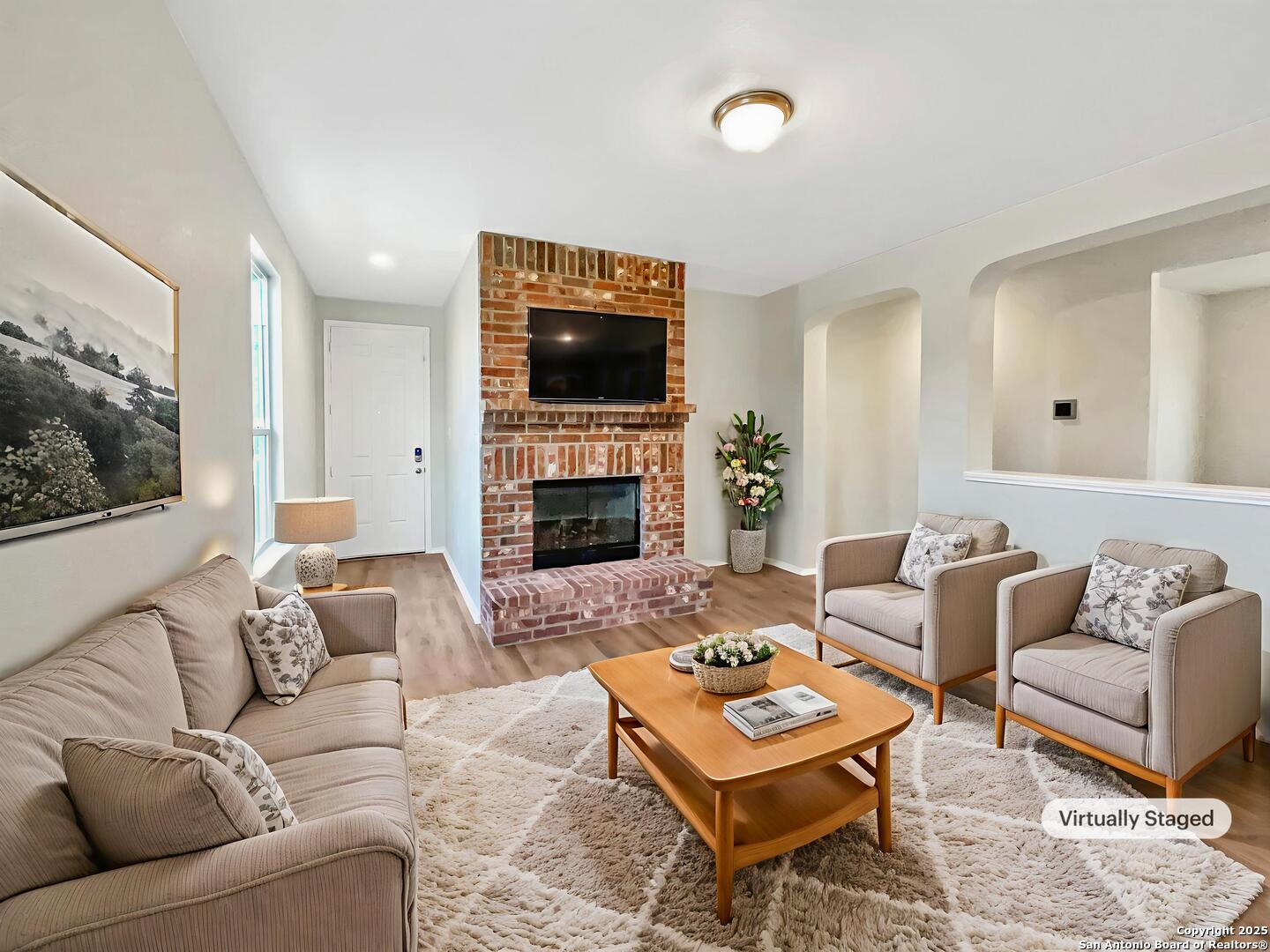 Welcome to this beautifully updated home. The neutral color paint scheme provides a calming atmosphere, complemented by the warmth of the fireplace. The kitchen is enhanced with an accent backsplash, adding a touch of elegance. The primary bathroom features double sinks for convenience. Enjoy the outdoors with a covered patio and fenced-in backyard, perfect for entertaining. The home boasts fresh interior and exterior paint, along with new flooring throughout, giving it a modern and clean feel. This property is a must-see for those seeking a fresh, stylish home. This home has been virtually staged to illustrate its potential.. Home comes with a 100-Day Home Warranty and a 7-Day Home Test Drive to move in 7 days early for free.