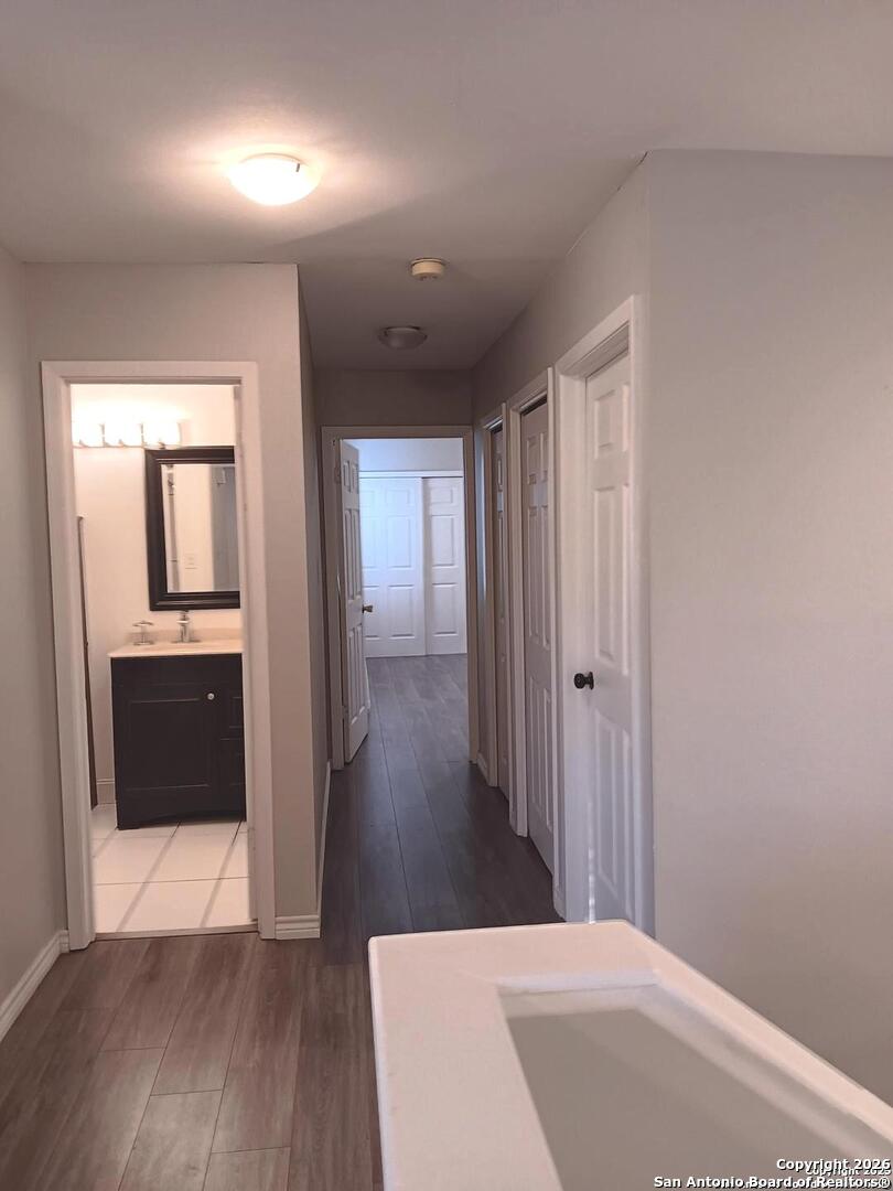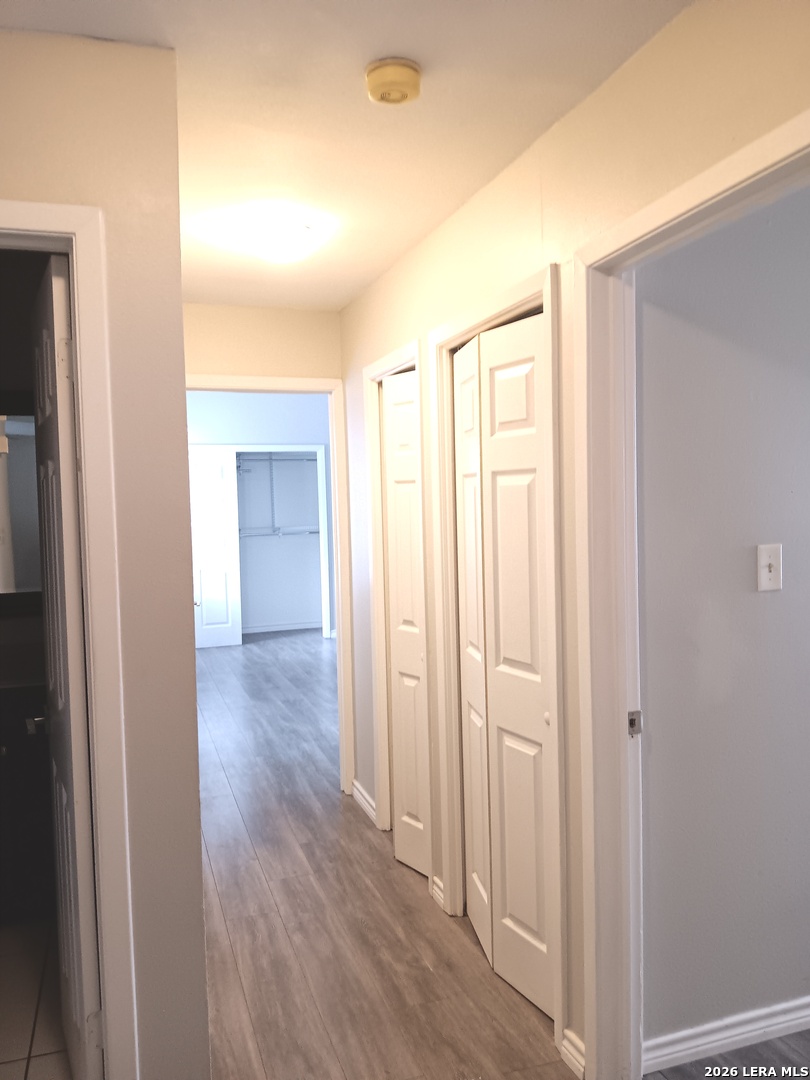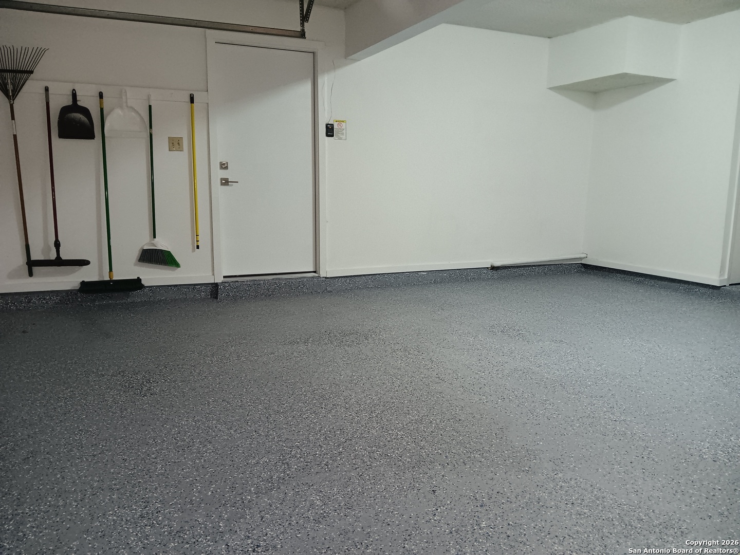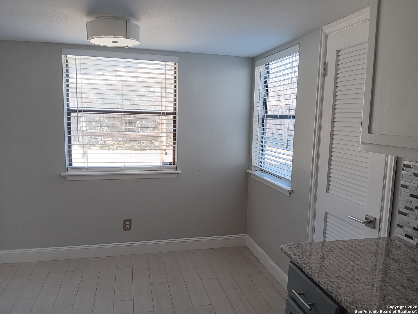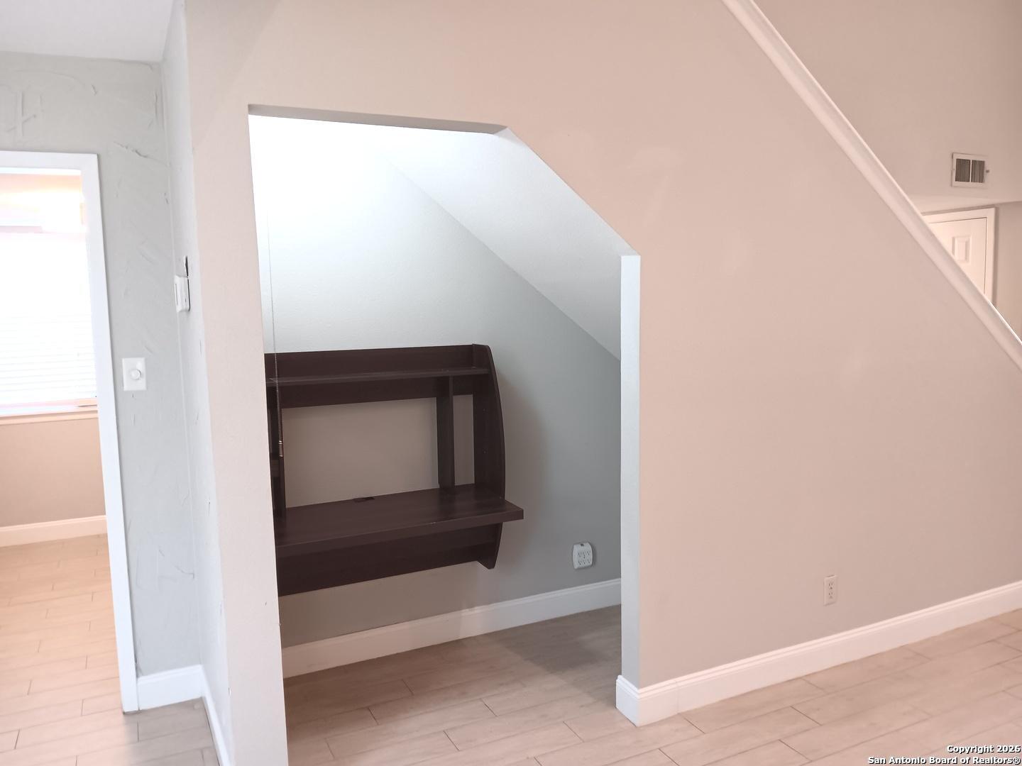 Come and see this contemporary 2 bedroom, 2.5 bath townhouse in a small gated community close to the medical center, USAA, and UTSA. On entering you'll enjoy the large space with soaring ceilings, upgraded recessed lighting, and a large stone wood burning fireplace. The modern eat in kitchen has granite counter tops and matching appliances, including the refrigerator. This home has long lasting wood-look porcelain tile downstairs, and wood laminate upstairs. No Carpet. Great location within the neighborhood and includes a large fenced backyard. A unique loft room adds versatile additional living space. The two-car attached garage for convenience and extra storage. Community amenities include a gated entrance, swimming pool, tennis and basketball courts.