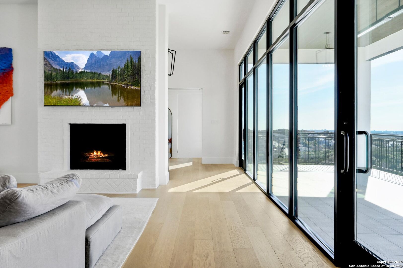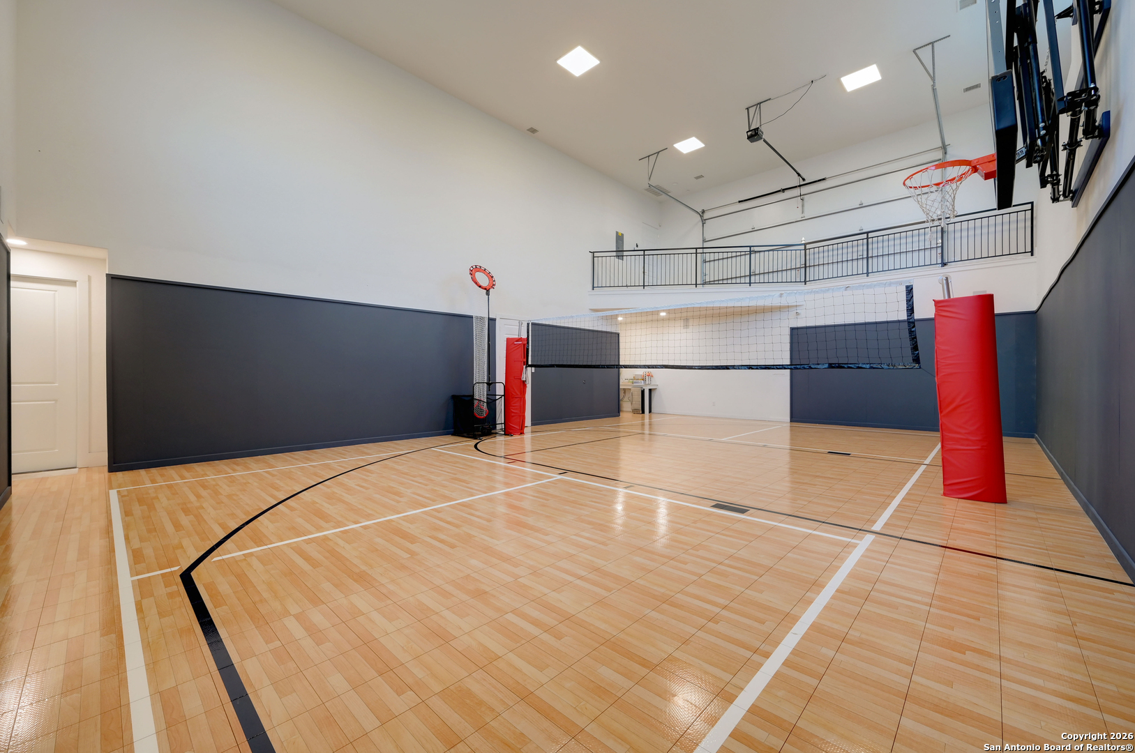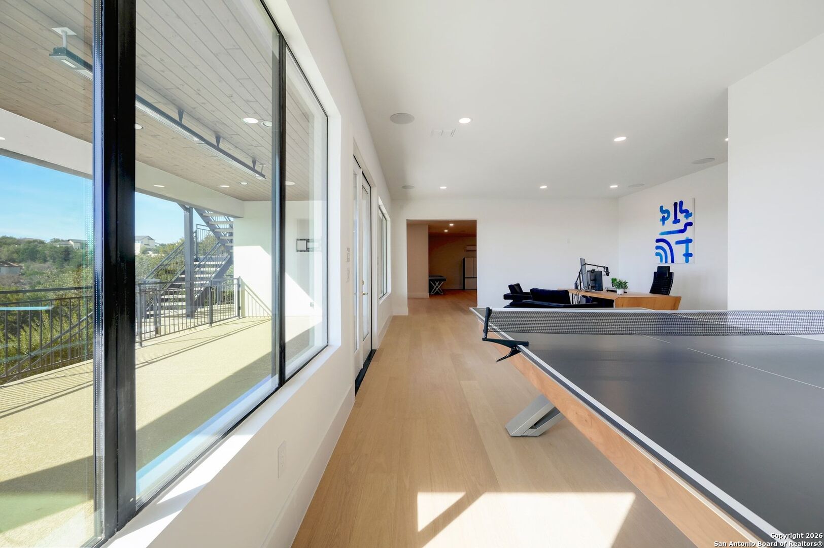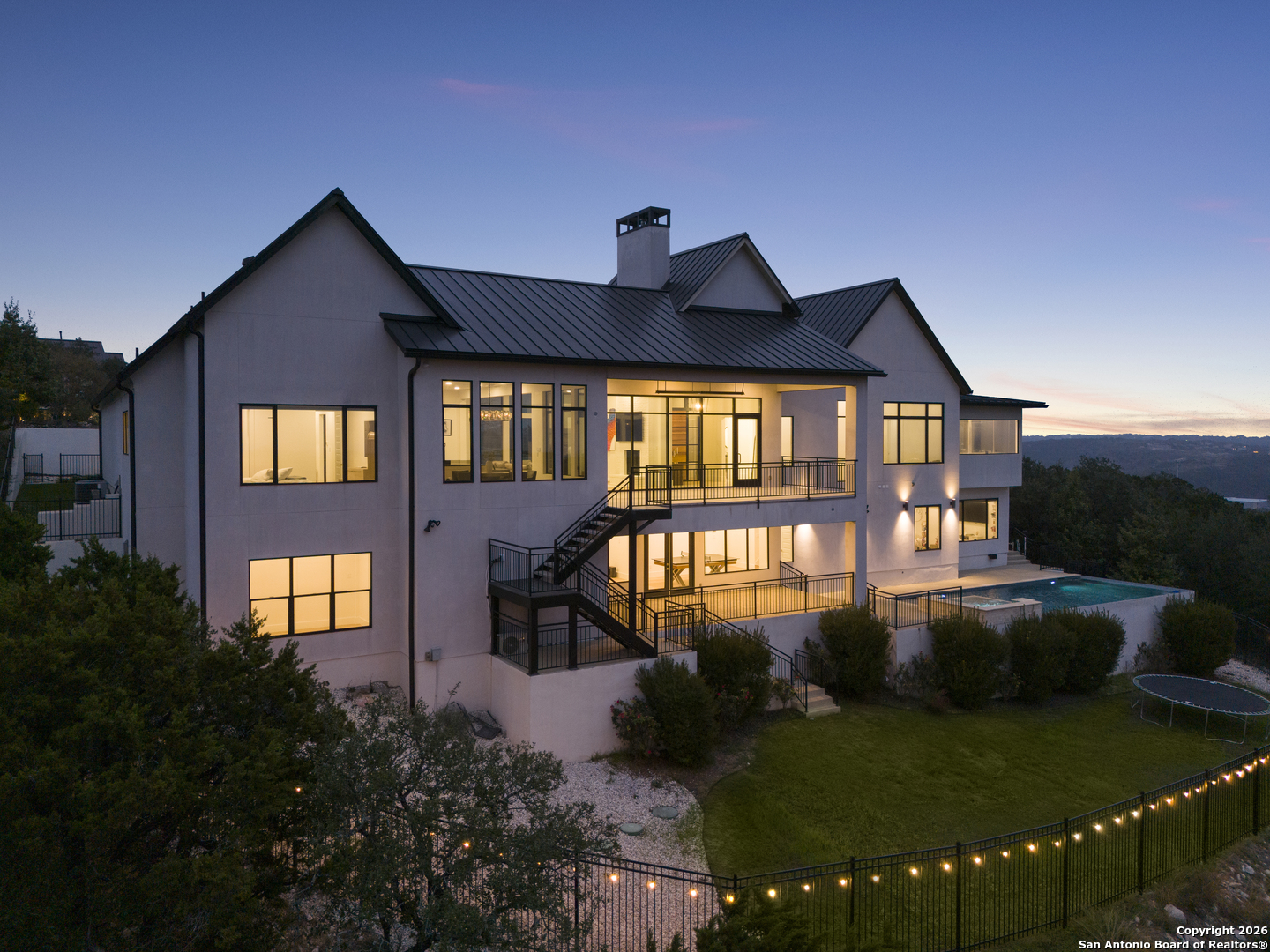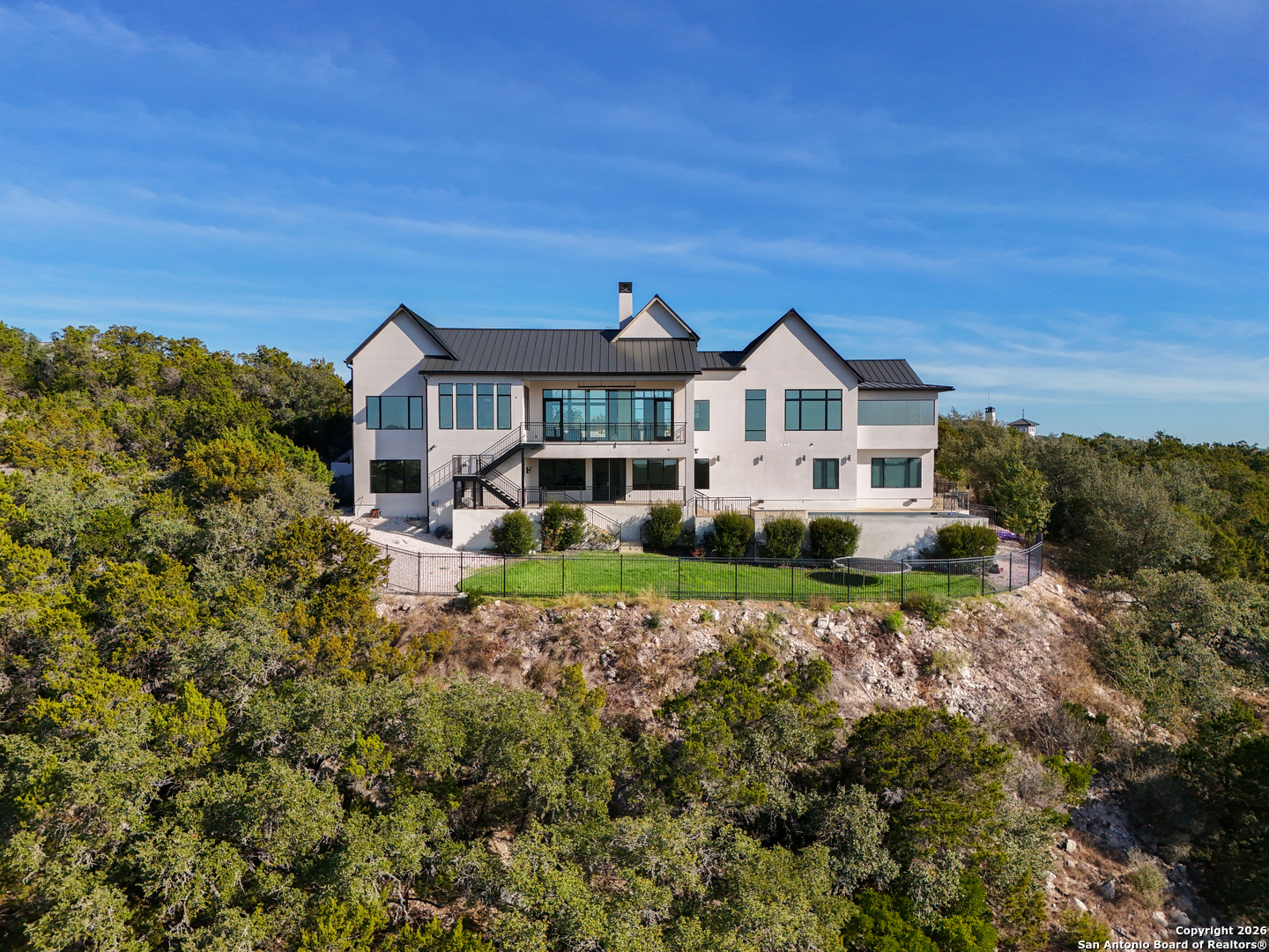 Located within the prestigious, gated community of Terra Mont, this remarkable contemporary estate spans approximately 7,059 square feet and has undergone a complete, top-to-bottom remodel. Designed for elevated living and exceptional versatility, the home offers four bedrooms, four full and two half baths, a private study, game room, three-car garage, and an expansive 1,350-square-foot climate-controlled flex space. From the moment you arrive, refined craftsmanship and thoughtful design are evident throughout. The entire home features upgraded Boracho wall texture, replacing the original Monterey finish, and has been freshly painted in Snowbound with a modern flat finish. All previous wood and tile flooring were removed and replaced with brand-new Kentwood wood flooring throughout the residence. Architectural enhancements include 8-inch baseboards and custom motion-sensor lighting on the staircase. The open-concept living spaces are filled with natural light and framed by a dramatic wall of windows showcasing breathtaking Hill Country views. A floor-to-ceiling brick fireplace anchors the main living area, creating an inviting atmosphere ideal for both entertaining and everyday living. The chef's kitchen is both elegant and highly functional, featuring a professional six-burner gas range, oversized island with seating, custom cabinetry, a stainless farmhouse sink, and a built-in double-width Sub-Zero refrigerator. The pantry has been extended and upgraded with a custom pantry closet, offering exceptional storage and organization. A truly standout feature of the home is the soaring 24-foot indoor half-court gym-an extraordinary space rarely found in residential properties. Designed for basketball, volleyball, or pickleball, the gym includes an overhead door that opens to fresh air for year-round enjoyment, as well as an upper-level veranda providing a unique spectator or lounge viewing area above the court. This impressive space adds a dynamic and versatile element to the home, ideal for recreation, training, or entertaining on a grand scale. A thoughtfully positioned study near the main living area includes built-in storage and a secondary refrigerator, offering added convenience for work-from-home living. The main level also features a private guest suite, while the primary retreat is secluded on the opposite side of the home. The primary suite is a true sanctuary, highlighted by expansive windows capturing sweeping 180-degree views of the downtown skyline and the Tower of the Americas. The primary closet has been dramatically expanded to approximately 40 feet and completed with a custom closet system featuring integrated LED lighting. The lower level has been fully finished and transformed into a multifunctional living and entertainment space. Updates include brand-new wood flooring throughout the basement, a dedicated gym area, private office, integrated speaker system, and a dedicated IT closet designed to house network and technology equipment. A spacious family room with fireplace and wood-accent wall, along with a billiard area, provides an ideal setting for relaxation and gatherings. Two additional guest suites offer privacy and comfort, including an expanded secondary upstairs bedroom bathroom with the addition of a private toilet room. Storage has been significantly enhanced with five newly added closets in the garage and a custom closet installed in the second bedroom. Outdoor living is seamlessly integrated through walls of glass that lead to multiple terraces surrounding the stunning infinity-edge pool and heated spa-perfect for enjoying Hill Country sunsets and effortless indoor-outdoor entertaining. The home has also undergone a major lighting and electrical upgrade, Lutron RadioRA 3 lighting control system and the entire home updated to modern LED lighting. This fully reimagined Terra Mont estate offers architectural distinction with exceptional amenities!
