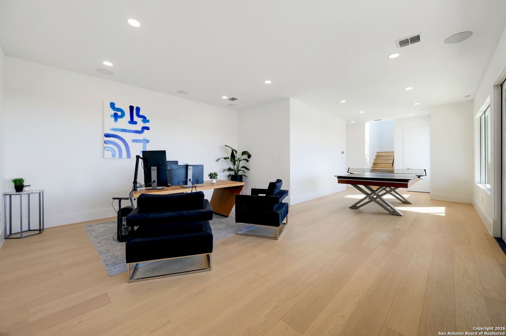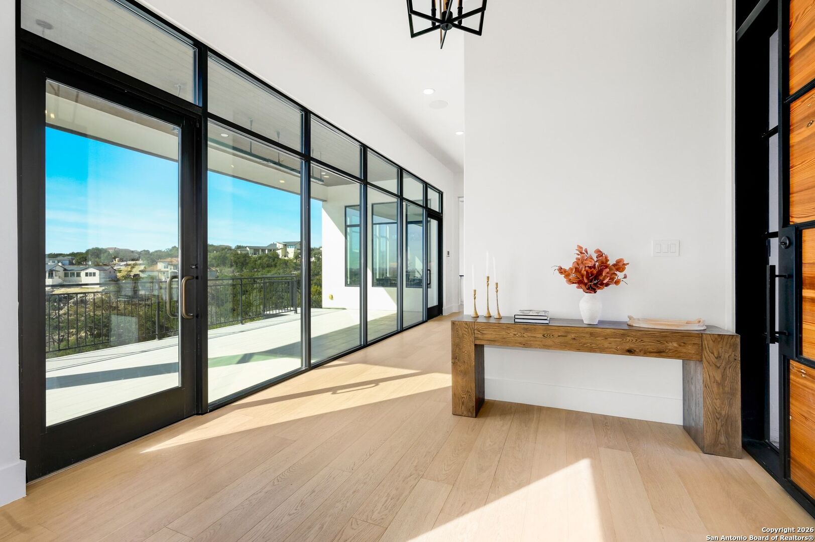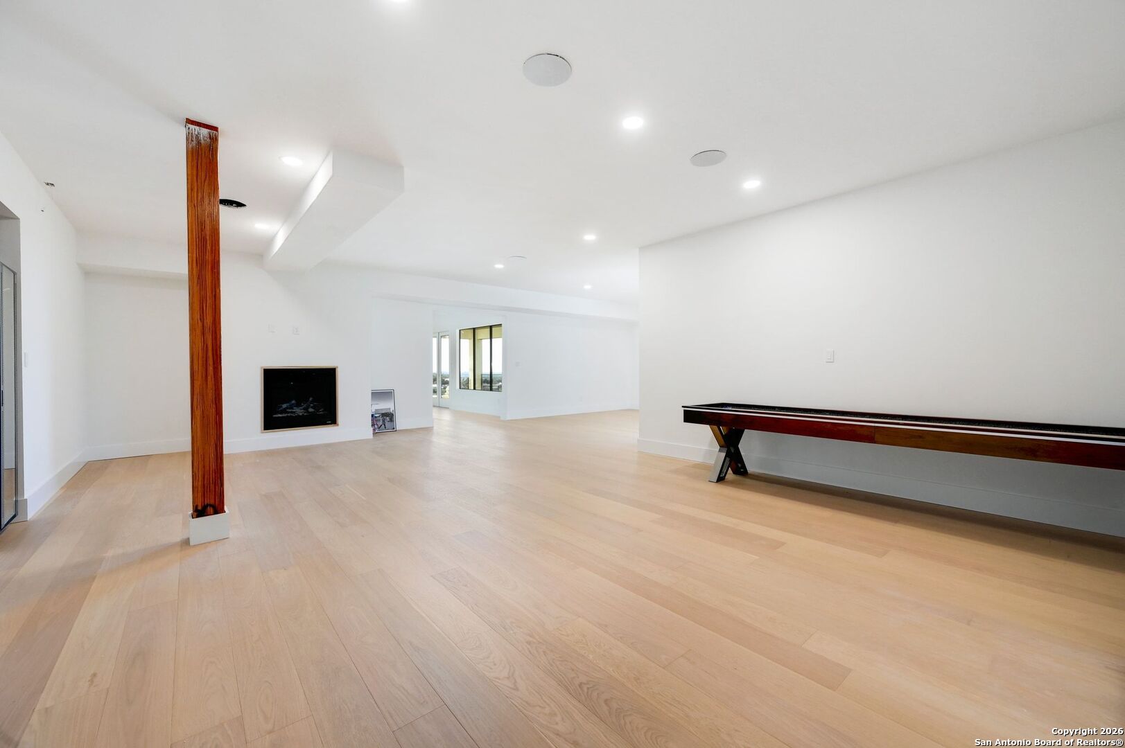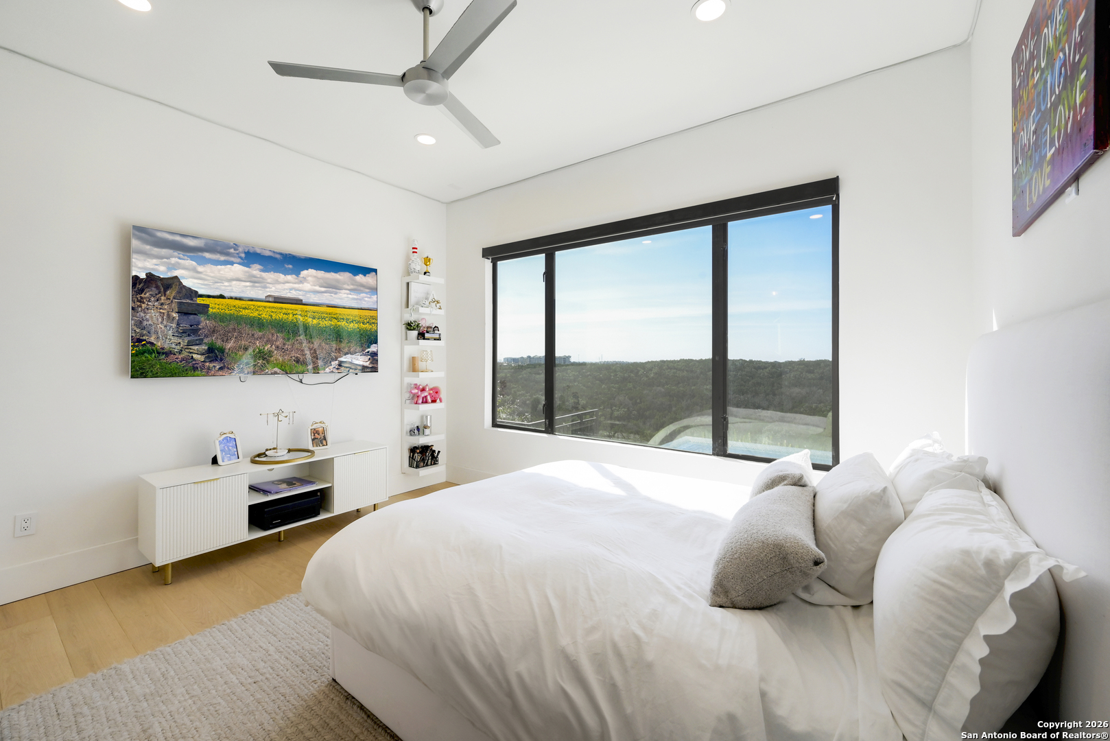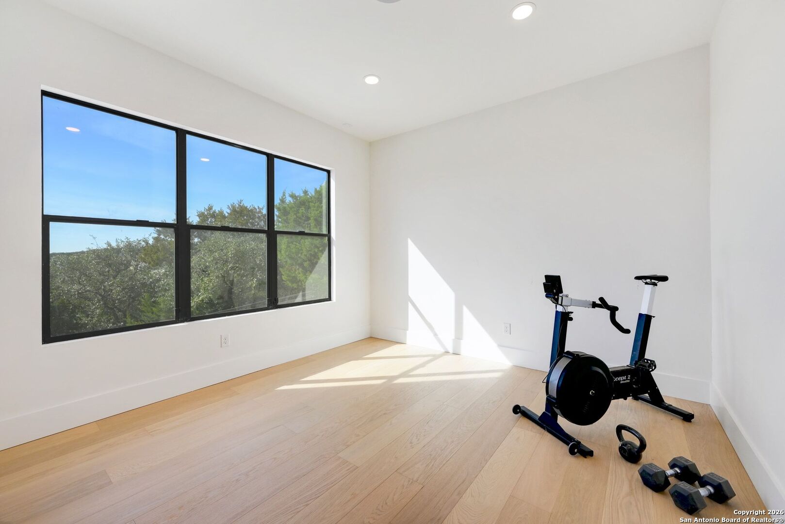 Located within the prestigious, gated community of Terra Mont, this remarkable contemporary estate spans approximately 7,059 square feet and has undergone a complete, top-to-bottom remodel. Designed for elevated living and exceptional versatility, the home offers four bedrooms, four full and two half baths, a private study, game room, three-car garage, and an expansive 1,350-square-foot climate-controlled flex space. From the moment you arrive, refined craftsmanship and thoughtful design are evident throughout. The entire home features upgraded Boracho wall texture, replacing the original Monterey finish, and has been freshly painted in Snowbound with a modern flat finish. All previous wood and tile flooring were removed and replaced with brand-new Kentwood wood flooring throughout the residence. Architectural enhancements include 8-inch baseboards and custom motion-sensor lighting on the staircase. The open-concept living spaces are filled with natural light and framed by a dramatic wall of windows showcasing breathtaking Hill Country views. A floor-to-ceiling brick fireplace anchors the main living area, creating an inviting atmosphere ideal for both entertaining and everyday living. The chef's kitchen is both elegant and highly functional, featuring a professional six-burner gas range, oversized island with seating, custom cabinetry, a stainless farmhouse sink, and a built-in double-width Sub-Zero refrigerator. The pantry has been extended and upgraded with a custom pantry closet, offering exceptional storage and organization. A truly standout feature of the home is the soaring 24-foot indoor half-court gym-an extraordinary space rarely found in residential properties. Designed for basketball, volleyball, or pickleball, the gym includes an overhead door that opens to fresh air for year-round enjoyment, as well as an upper-level veranda providing a unique spectator or lounge viewing area above the court. This impressive space adds a dynamic and versatile element to the home, ideal for recreation, training, or entertaining on a grand scale. A thoughtfully positioned study near the main living area includes built-in storage and a secondary refrigerator, offering added convenience for work-from-home living. The main level also features a private guest suite, while the primary retreat is secluded on the opposite side of the home. The primary suite is a true sanctuary, highlighted by expansive windows capturing sweeping 180-degree views of the downtown skyline and the Tower of the Americas. The primary closet has been dramatically expanded to approximately 40 feet and completed with a custom closet system featuring integrated LED lighting. The lower level has been fully finished and transformed into a multifunctional living and entertainment space. Updates include brand-new wood flooring throughout the basement, a dedicated gym area, private office, integrated speaker system, and a dedicated IT closet designed to house network and technology equipment. A spacious family room with fireplace and wood-accent wall, along with a billiard area, provides an ideal setting for relaxation and gatherings. Two additional guest suites offer privacy and comfort, including an expanded secondary upstairs bedroom bathroom with the addition of a private toilet room. Storage has been significantly enhanced with five newly added closets in the garage and a custom closet installed in the second bedroom. Outdoor living is seamlessly integrated through walls of glass that lead to multiple terraces surrounding the stunning infinity-edge pool and heated spa-perfect for enjoying Hill Country sunsets and effortless indoor-outdoor entertaining. The home has also undergone a major lighting and electrical upgrade, Lutron RadioRA 3 lighting control system and the entire home updated to modern LED lighting. This fully reimagined Terra Mont estate offers architectural distinction with exceptional amenities!