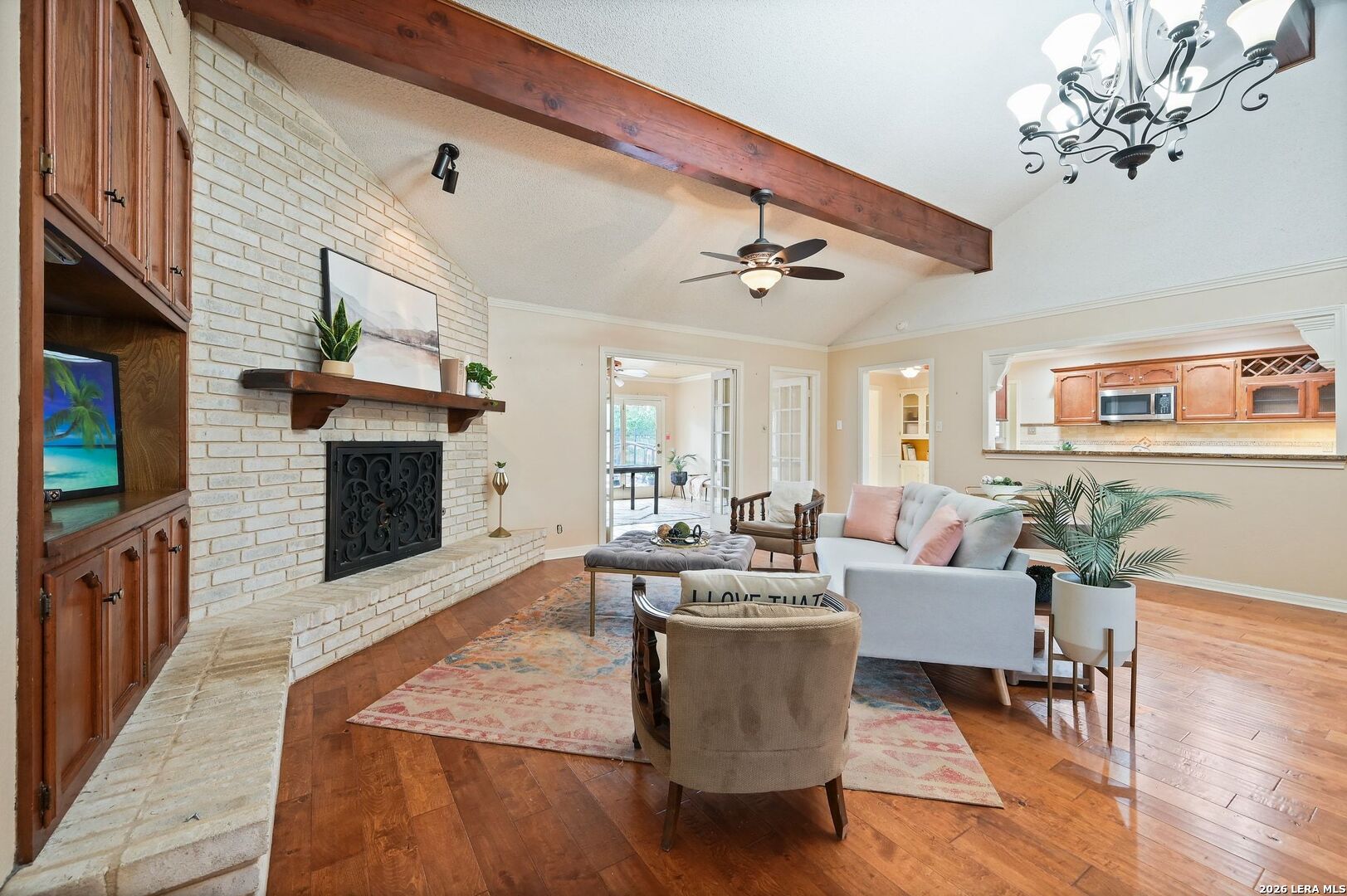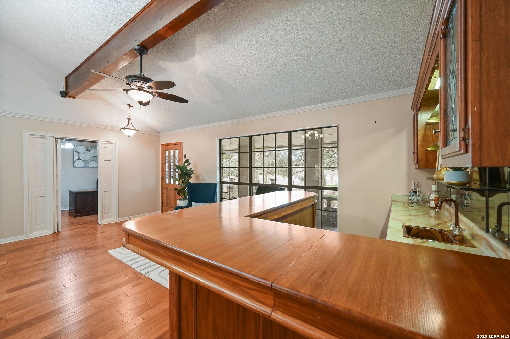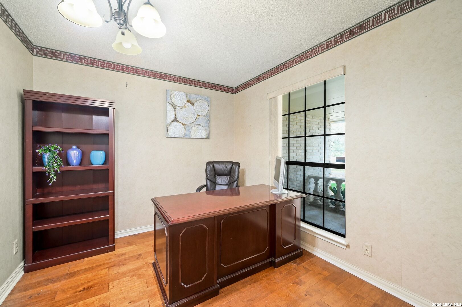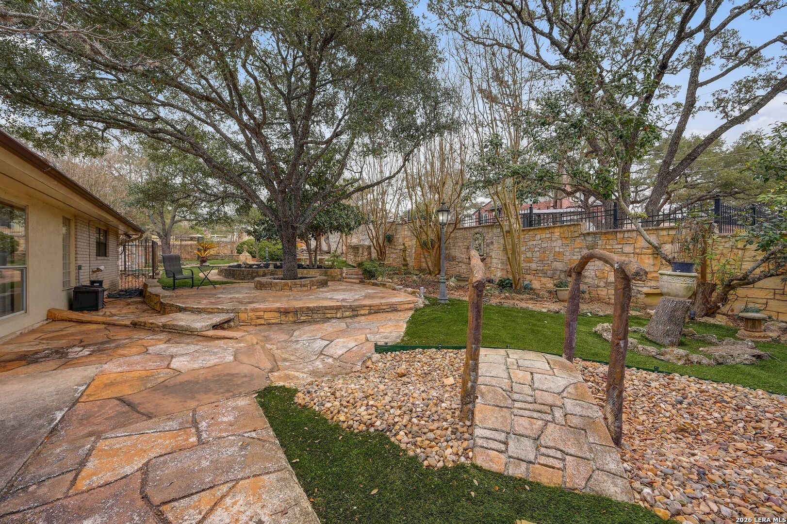 One-of-a-kind Fair Oaks Ranch single-story on 1.67 serene acres - quality-built and lovingly owned for 35+ years. This rare 4-bedroom, 3-bath home plus dedicated office blends timeless character and modern updates: metal roof, NEW water heater, cedar closet, updated traditional kitchen with eat-in area and antique built-ins, and a custom wet bar made for entertaining. Warm wood floors flow through the main living area to a dramatic floor-to-ceiling gas fireplace. Thoughtful, functional layout with ample storage throughout and a bedroom that includes its own dedicated full bathroom - ideal for guests or multi-generational living. The entire property is fenced with its own gated entrance, surrounded by mature trees for privacy, and includes a shed for extra storage. Step outside to a back patio that feels like a private sanctuary with tranquil water fountains and an expansive outdoor space. Enjoy true Texas Hill Country living while being conveniently close to I10, restaurants and shopping. Practical conveniences include a 2-car garage, circular drive and additional parking. Don't miss this rare chance to own a meticulously maintained, move-in-ready home in the highly coveted Fair Oaks Ranch - a once-in-a-generation opportunity!