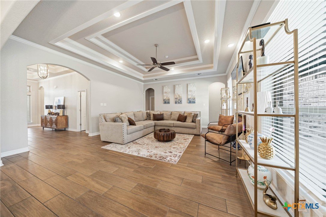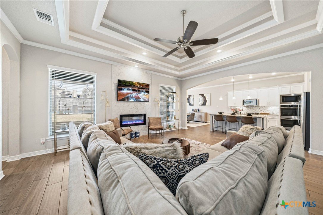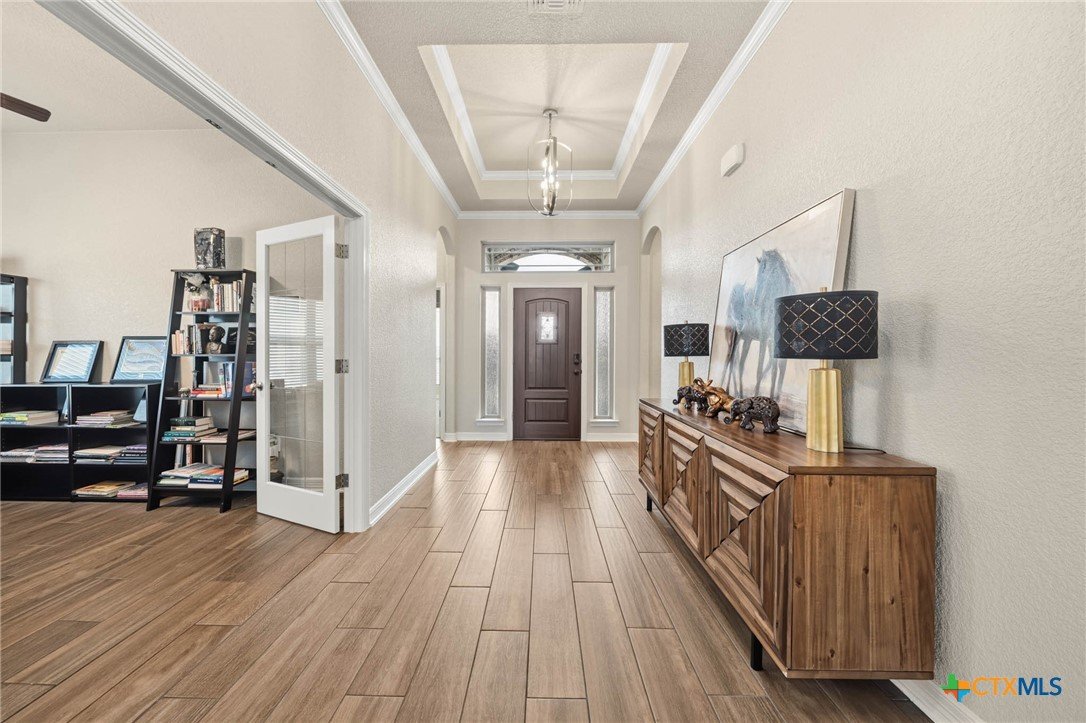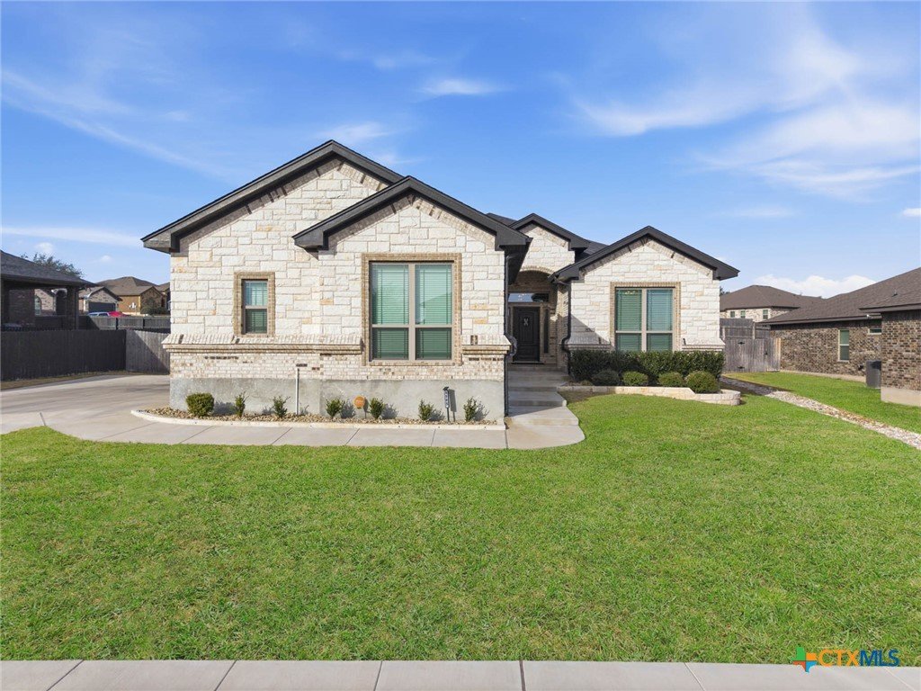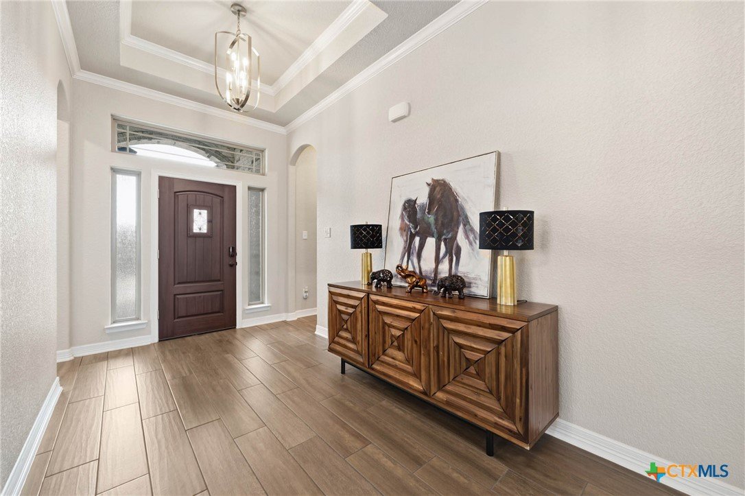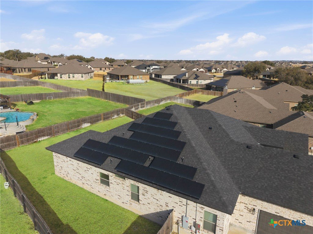 Stunning custom Carothers home featuring 4 bedrooms, 3.5 baths, and a private office, designed with both luxury and functionality in mind. A side-entry three-car garage offers abundant storage and enhanced curb appeal. Step inside to a breathtaking grand foyer that immediately introduces the home’s refined character. A dramatic gallery hallway illuminated by cascading drop-down chandeliers guides you into the heart of the home, creating a stunning architectural statement before opening into the expansive living room. The space is anchored by soaring tray ceilings, modern track lighting, and convenient floor electrical outlets, thoughtfully placed for flexible furniture design and seamless living. The chef-inspired kitchen is both beautiful and innovative. It features a sleek glass backsplash, three ovens, a built-in microwave, and a pot filler above the cooktop for culinary convenience. Adding a modern lifestyle touch, a built-in GE Smart Hub above the stove allows you to follow recipes, stream content, or film your favorite dishes for social media while cooking. The owner’s suite serves as a serene retreat, filled with natural light and sophisticated finishes. The spa-inspired bathroom offers separate vanities, exceptional lighting, and an extended walk-in spa shower with dual shower heads, delivering a luxurious daily experience. Designed with both comfort and practicality in mind, the home includes a Jack-and-Jill bathroom with pocket doors, creating privacy and efficiency between secondary bedrooms. Energy efficiency meets forward-thinking design with installed solar panels, helping reduce energy costs while supporting sustainable living. Step outside and discover an inviting backyard retreat complete with a mini outdoor kitchen, perfect for entertaining, weekend cookouts, and enjoying Texas evenings. This home blends modern smart-home features, custom craftsmanship, and elevated design for a truly exceptional living experience.