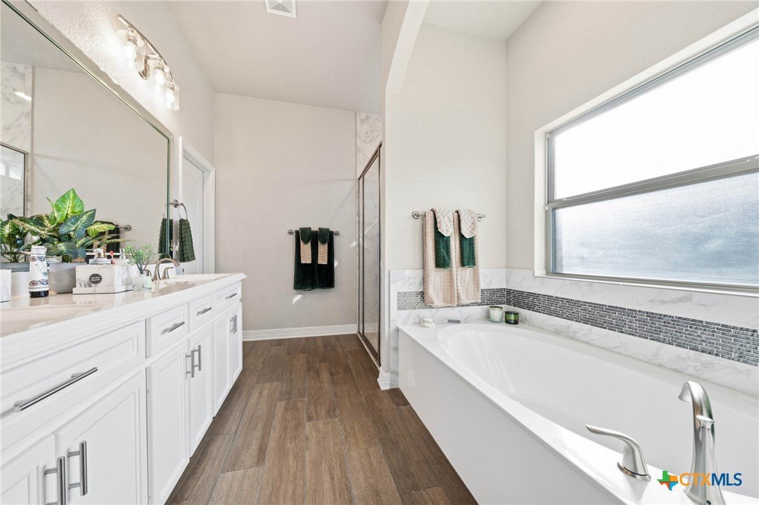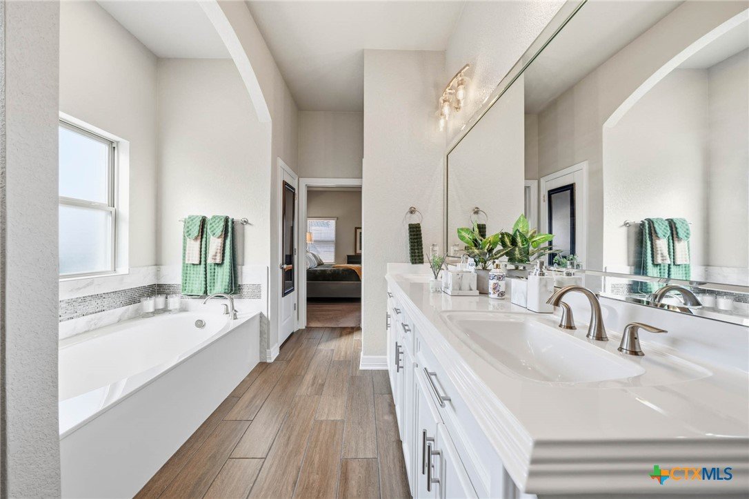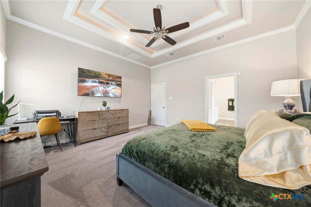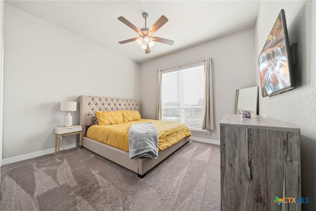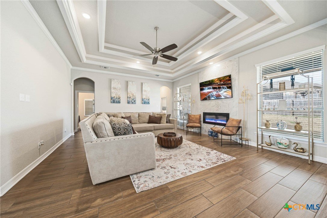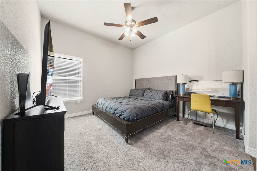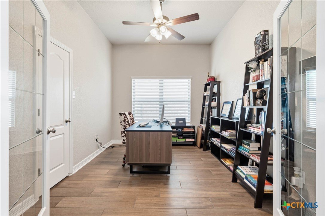 Stunning custom Carothers home featuring 4 bedrooms, 3.5 baths, and a private office, designed with both luxury and functionality in mind. A side-entry three-car garage offers abundant storage and enhanced curb appeal. Step inside to a breathtaking grand foyer that immediately introduces the home’s refined character. A dramatic gallery hallway illuminated by cascading drop-down chandeliers guides you into the heart of the home, creating a stunning architectural statement before opening into the expansive living room. The space is anchored by soaring tray ceilings, modern track lighting, and convenient floor electrical outlets, thoughtfully placed for flexible furniture design and seamless living. The chef-inspired kitchen is both beautiful and innovative. It features a sleek glass backsplash, three ovens, a built-in microwave, and a pot filler above the cooktop for culinary convenience. Adding a modern lifestyle touch, a built-in GE Smart Hub above the stove allows you to follow recipes, stream content, or film your favorite dishes for social media while cooking. The owner’s suite serves as a serene retreat, filled with natural light and sophisticated finishes. The spa-inspired bathroom offers separate vanities, exceptional lighting, and an extended walk-in spa shower with dual shower heads, delivering a luxurious daily experience. Designed with both comfort and practicality in mind, the home includes a Jack-and-Jill bathroom with pocket doors, creating privacy and efficiency between secondary bedrooms. Energy efficiency meets forward-thinking design with installed solar panels, helping reduce energy costs while supporting sustainable living. Step outside and discover an inviting backyard retreat complete with a mini outdoor kitchen, perfect for entertaining, weekend cookouts, and enjoying Texas evenings. This home blends modern smart-home features, custom craftsmanship, and elevated design for a truly exceptional living experience.