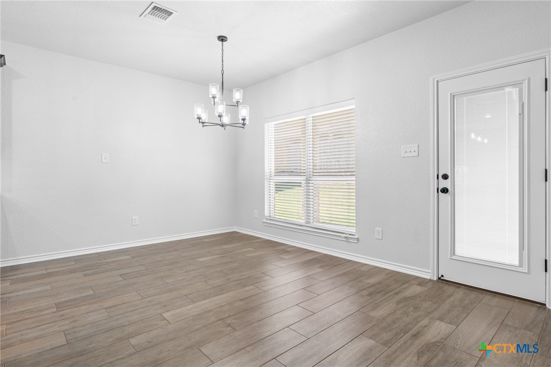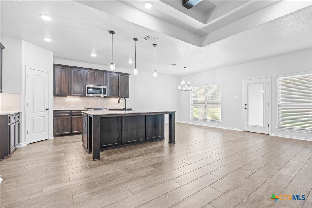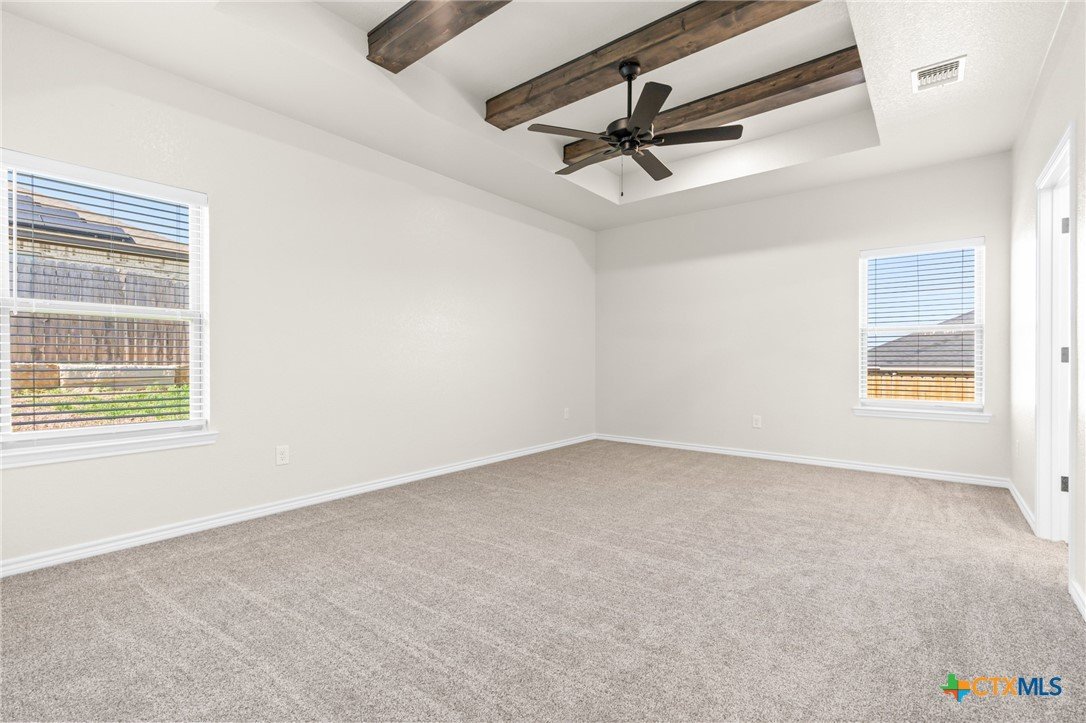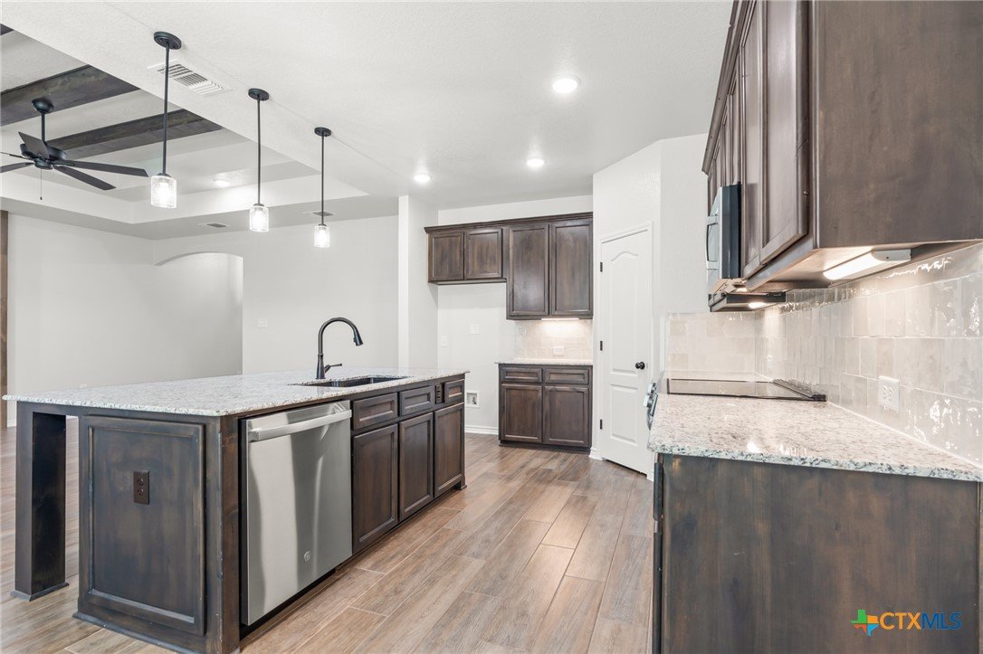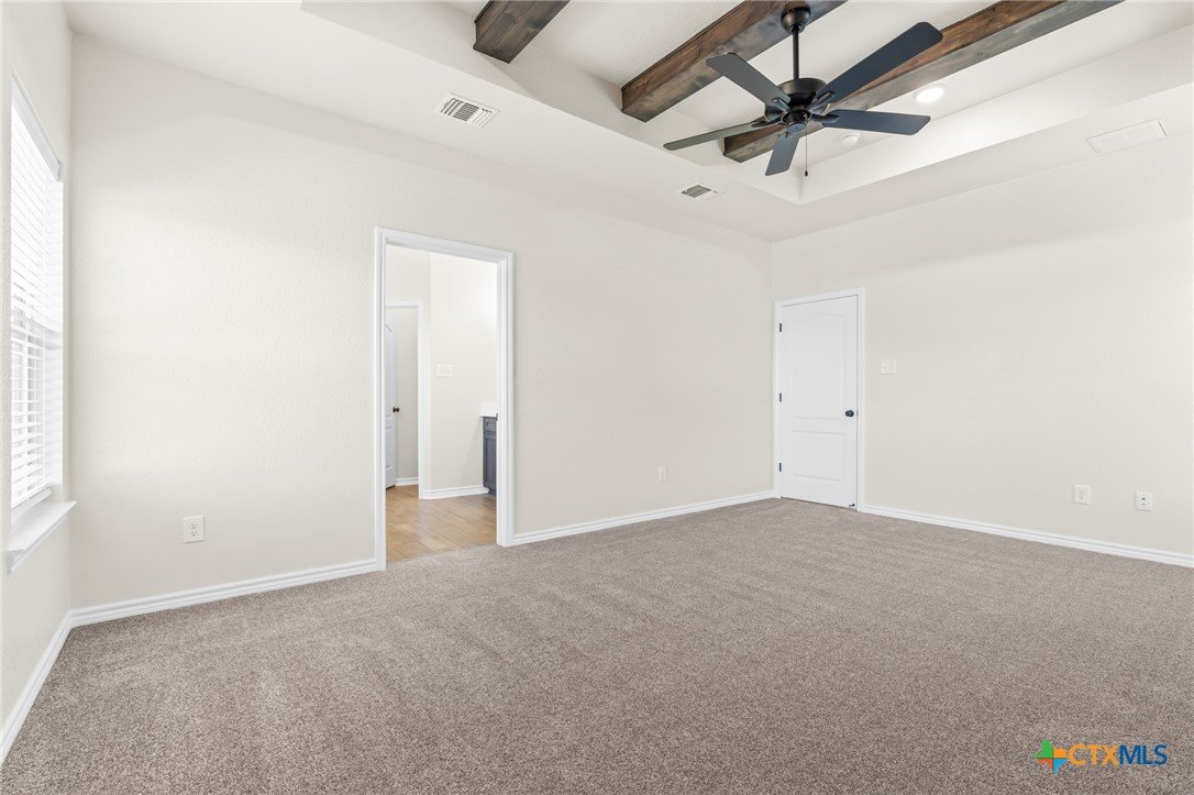The Bellagio floorplan by Carothers Homes welcomes you home with a beautiful foyer, setting the tone for the charm that flows throughout. This spacious open layout is highlighted by a large living room with a fireplace and beautiful wooden beams. The kitchen features a large island that seamlessly connects the living area and breakfast nook, offering granite countertops, a tiled backsplash, and a walk-in pantry. The master bedroom is complemented by a generously sized private bathroom, featuring a walk-in closet, garden tub, walk-in shower, and dual vanities. The mother-in-law suite includes a private bath with a walk-in shower and a closet. Two additional bedrooms are generously sized and provide ample closet space. Additional features of this home, including a covered patio, privacy fence, front and back sod, and a sprinkler system, are standard with every Carothers Home.