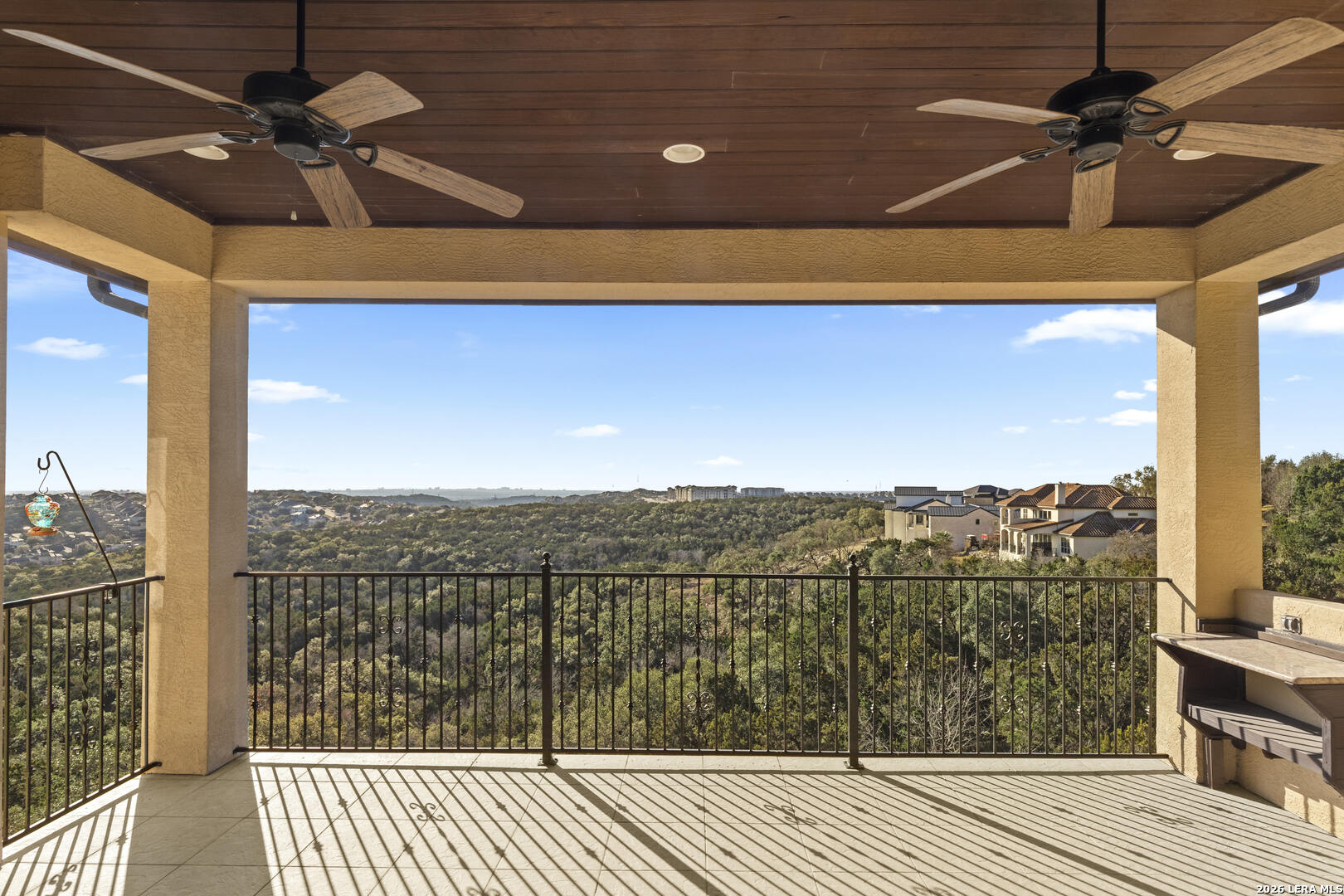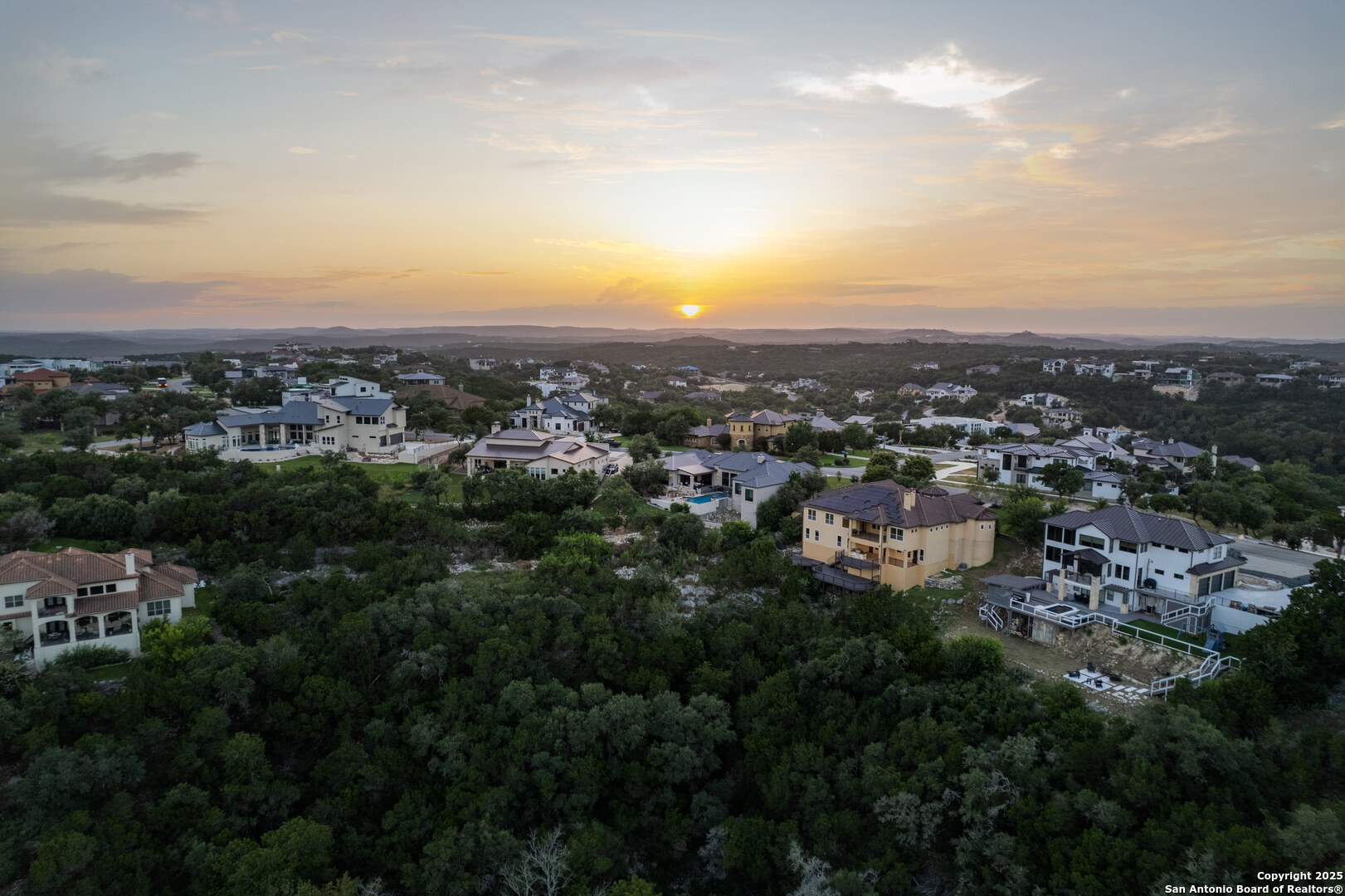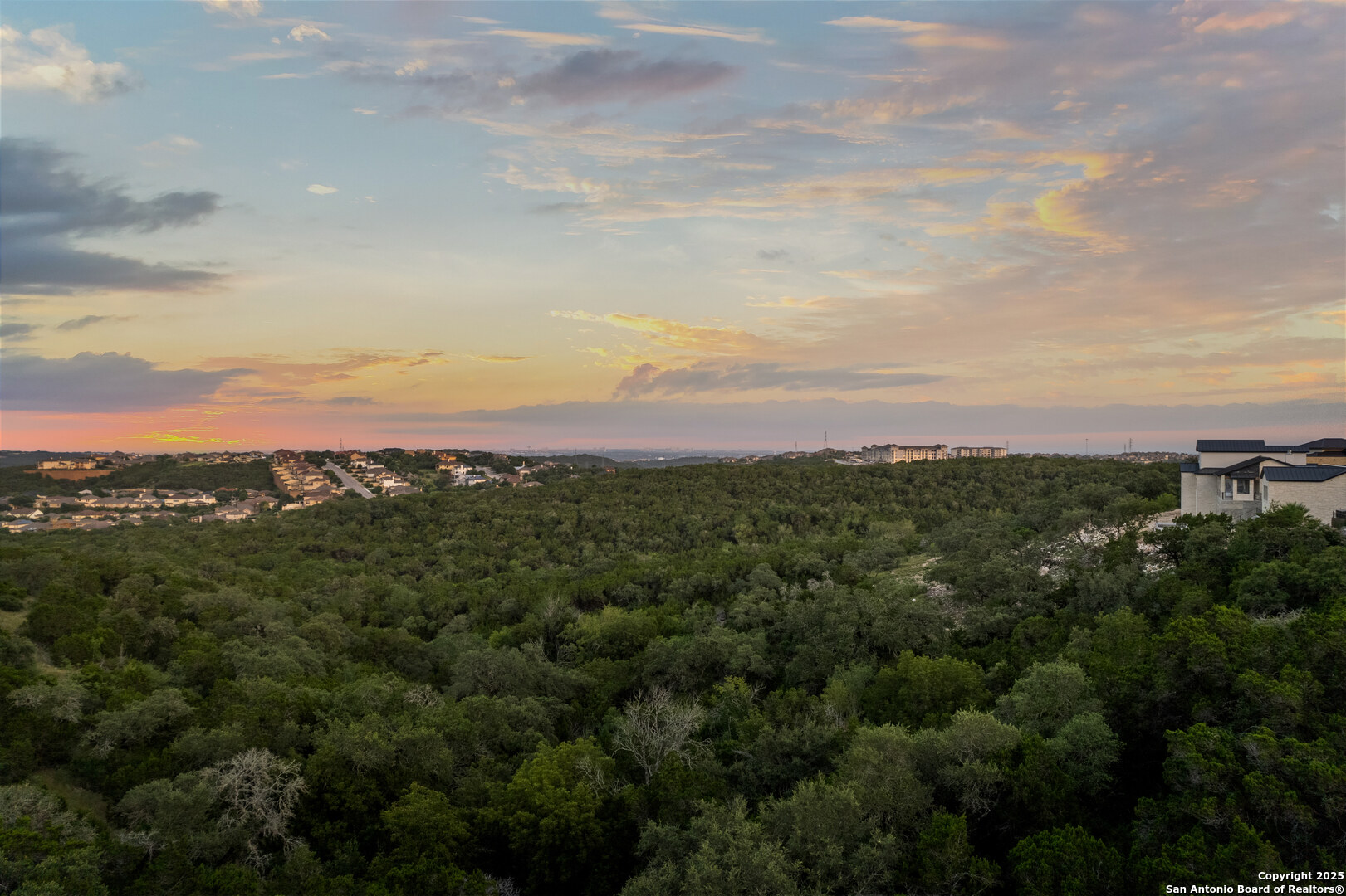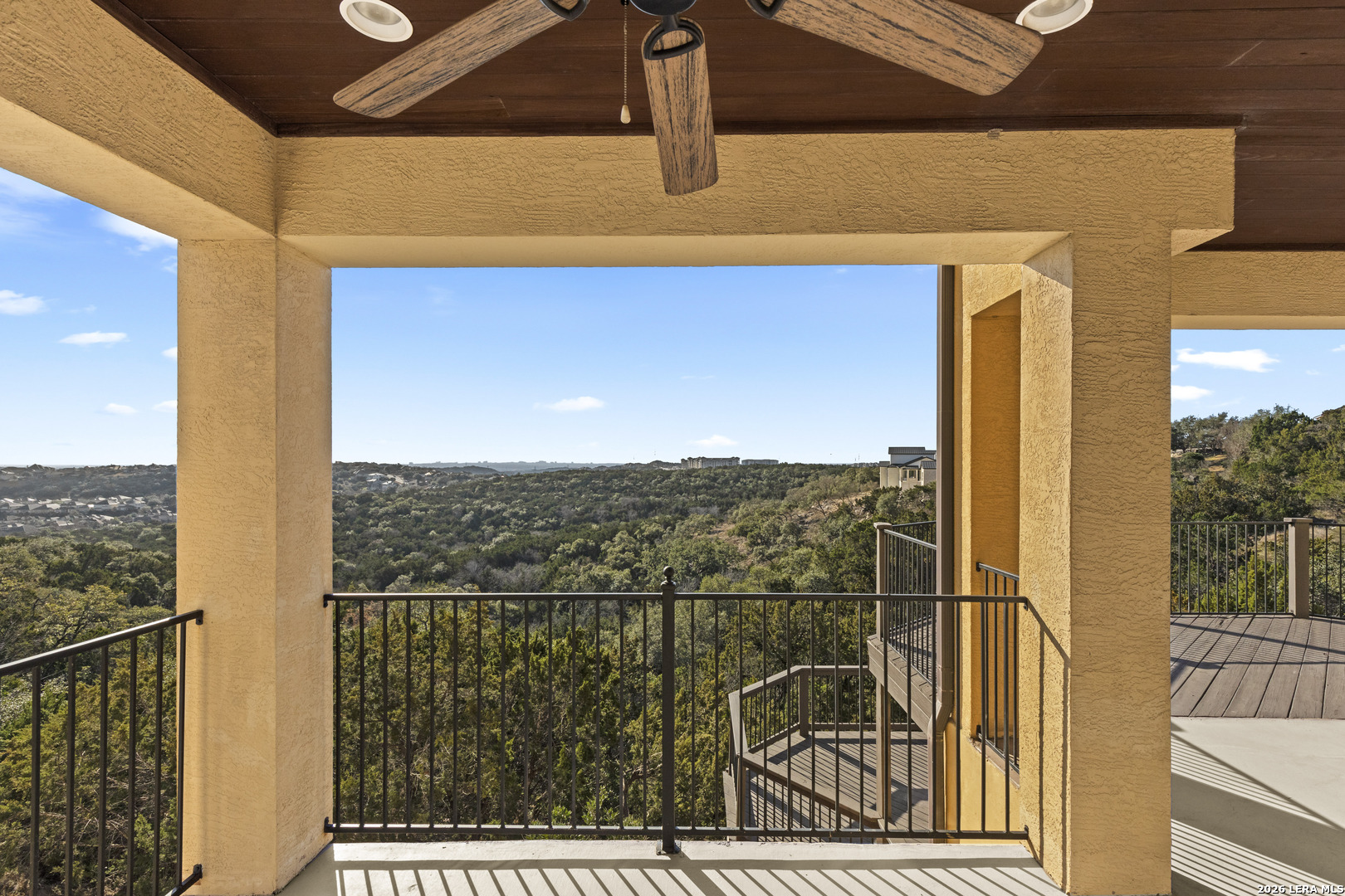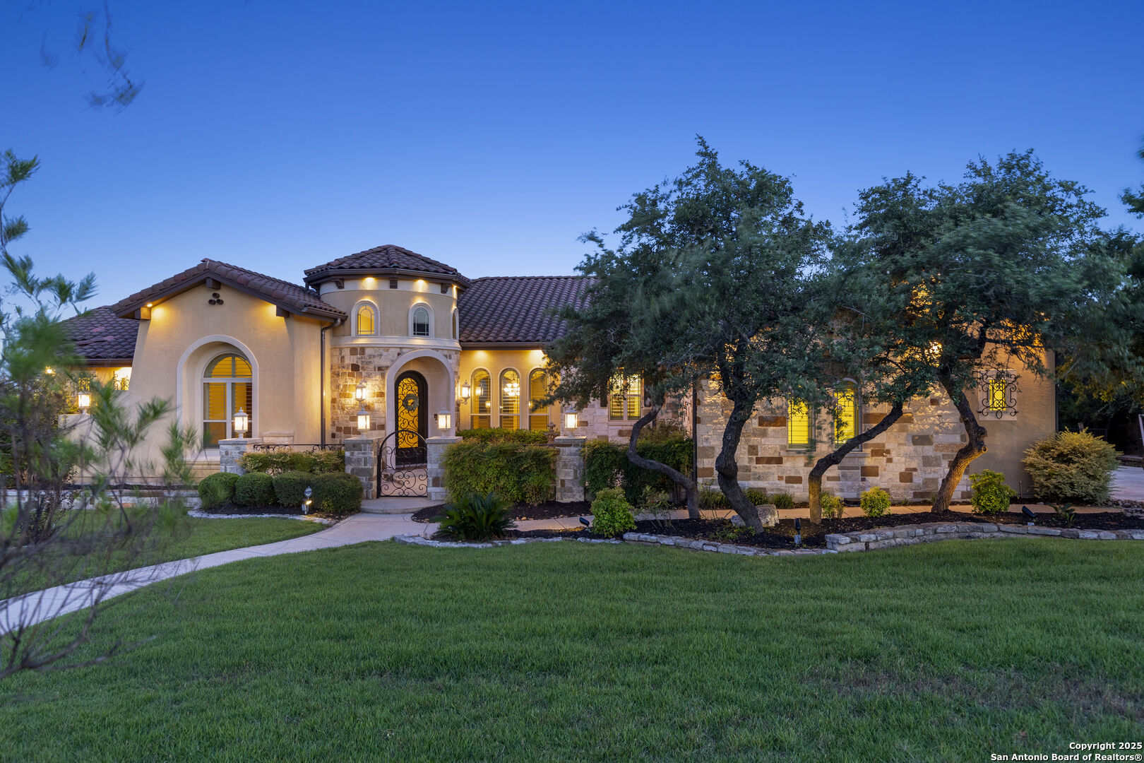 Unmatched Views. Thoughtful Design. Tucked inside the gated hilltop community of Terra Mont, this stunning custom-built Solace Creek home is the perfect blend of elegance, comfort, and quiet Hill Country living. Set on over 1.18 acres, this private south-facing lot backs to a scenic natural canyon co-owned by surrounding neighbors-perfect for peaceful morning sunrises and glorious evening sunsets. The first thing you'll notice about this home is the unmatched, unobstructed views! Oversized windows frame wide-open skies and city lights in the distance, giving every room a peaceful, elevated feel and a sense of serenity that's hard to match. Outdoor living is effortless with over 2,000 sq ft of decking, a built-in grill, mounted outdoor TV, and a covered patio. Whether you're enjoying coffee on the back deck, relaxing by the fireplace, or prepping a meal in the kitchen, there's a sense of awe and tranquility. Equally stunning are the custom design choices you'll find inside. The home features Venetian plaster accents, a rotunda entry, custom iron gates and light fixtures, Travertine and wood flooring, two gas fireplaces, and four spacious bedrooms-including two primary suites on the main level, offering flexibility for all stages of life. There are also three full baths, two half baths, and specialty rooms like a media room (with included projector), a private study (with a secret passage!), a home gym, and two large living areas. The heart of the home is a beautiful island kitchen with a 6-burner Wolf gas cooktop, griddle, warming drawer, paneled fridge and dishwasher, walk-in pantry, and hand-selected granite countertops. The adjoining breakfast room showcases a stunning custom dome ceiling, while the formal dining room easily hosts large gatherings. Retreat to the luxurious primary suite with a separate sitting area and patio access, dual tailored-height vanities with custom hammered copper sinks, dual walk-in closets, and an incredibly spacious primary bath featuring a whirlpool tub, walk-around shower with bench, his-and-hers toilet rooms (!), and direct access to the gym. The second primary suite includes a large bedroom, en-suite bathroom, spacious closet, and even a kitchenette (!)-designed with privacy in mind-all on the main level of the home. Additional features include a whole-house intercom system, dimmable uplighting and downlighting throughout, a whole-house generator, solar panels, and a water softener. This home was made to be lived in, loved, and enjoyed-where privacy, craftsmanship, and unforgettable views come together. Come see for yourself!