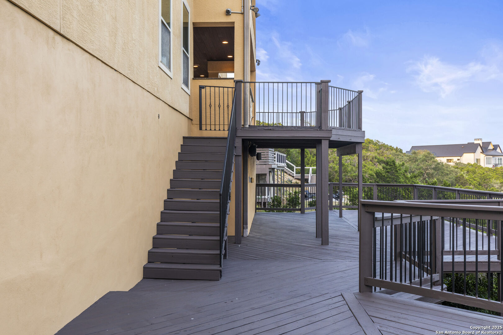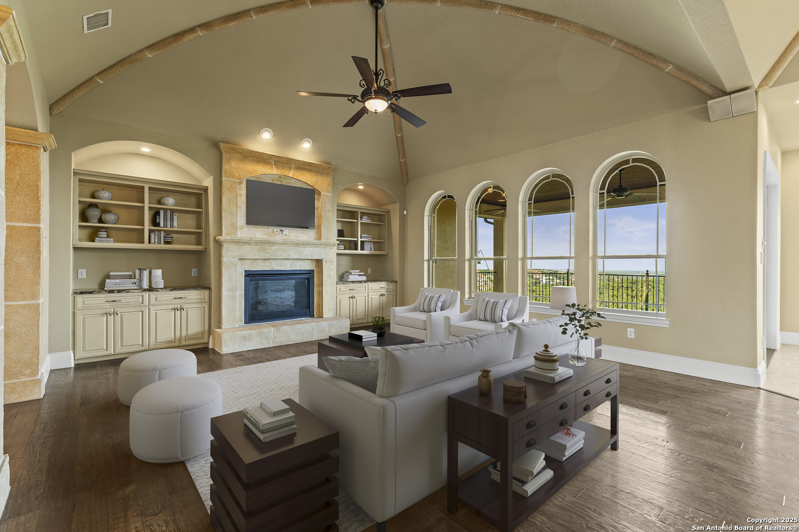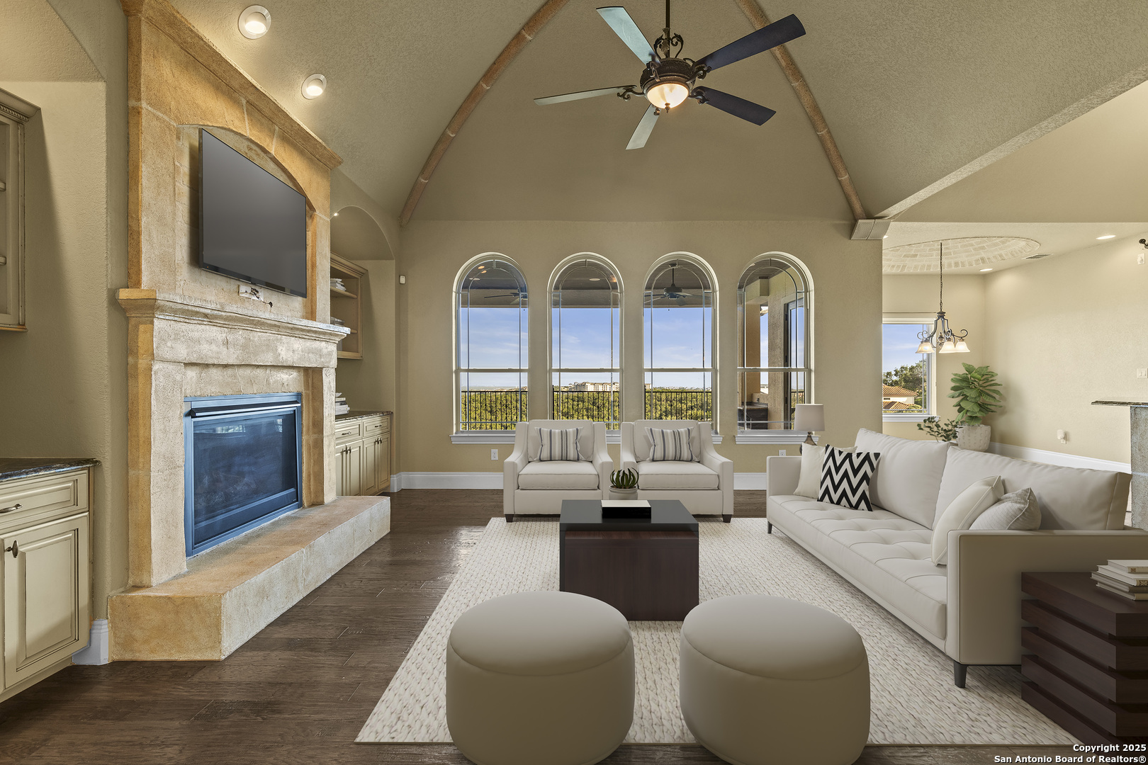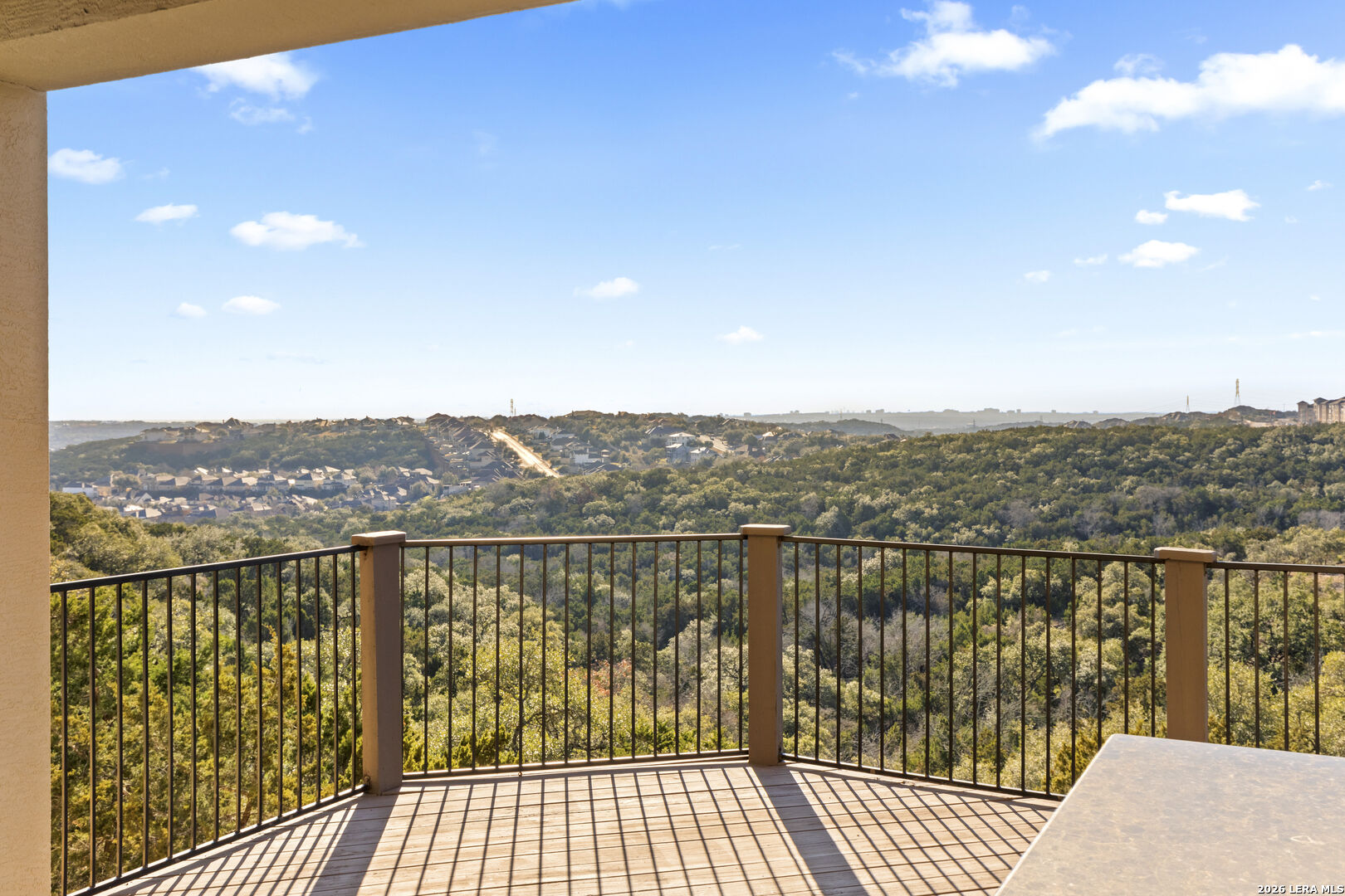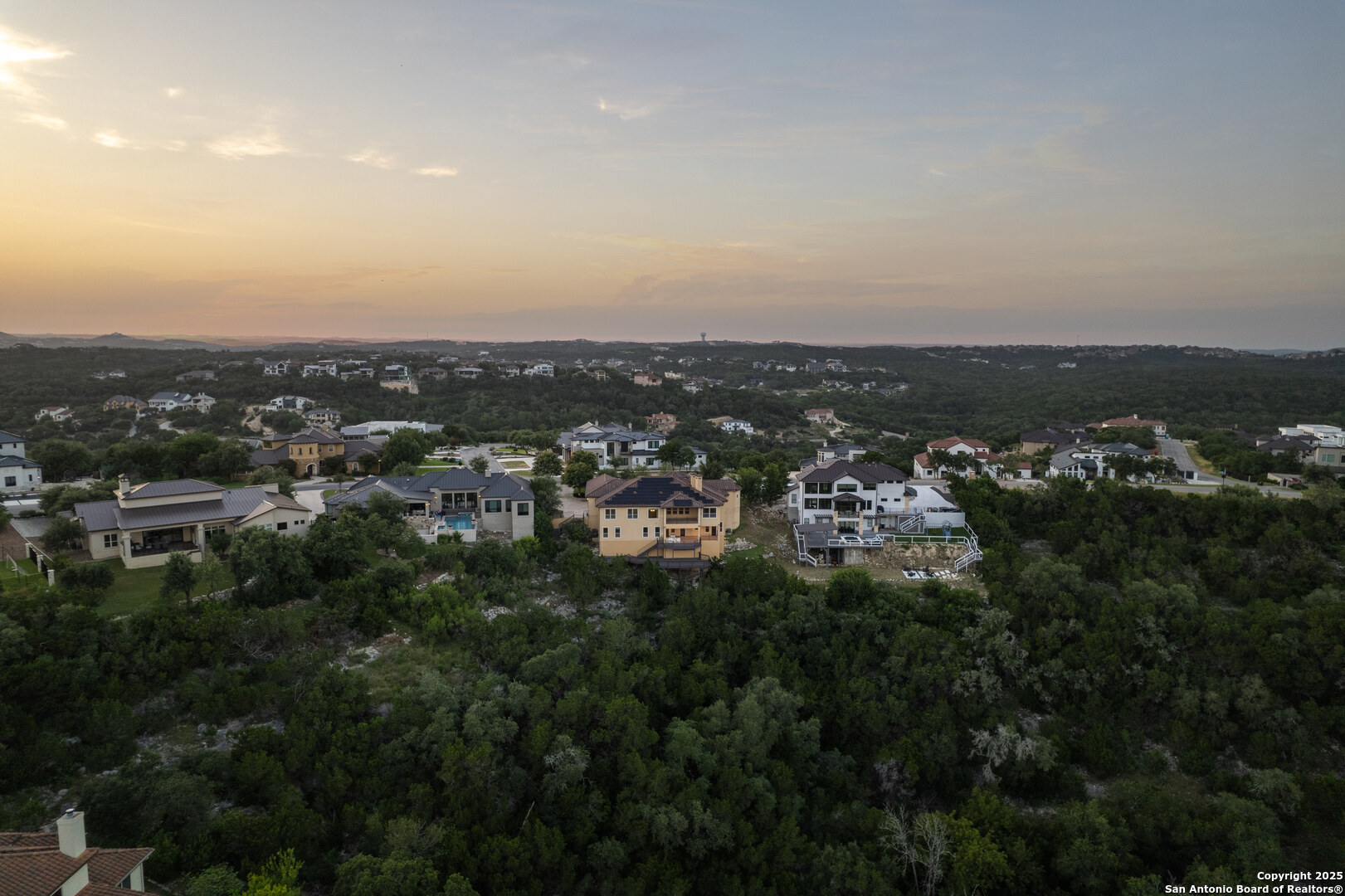 Unmatched Views. Thoughtful Design. Tucked inside the gated hilltop community of Terra Mont, this stunning custom-built Solace Creek home is the perfect blend of elegance, comfort, and quiet Hill Country living. Set on over 1.18 acres, this private south-facing lot backs to a scenic natural canyon co-owned by surrounding neighbors-perfect for peaceful morning sunrises and glorious evening sunsets. The first thing you'll notice about this home is the unmatched, unobstructed views! Oversized windows frame wide-open skies and city lights in the distance, giving every room a peaceful, elevated feel and a sense of serenity that's hard to match. Outdoor living is effortless with over 2,000 sq ft of decking, a built-in grill, mounted outdoor TV, and a covered patio. Whether you're enjoying coffee on the back deck, relaxing by the fireplace, or prepping a meal in the kitchen, there's a sense of awe and tranquility. Equally stunning are the custom design choices you'll find inside. The home features Venetian plaster accents, a rotunda entry, custom iron gates and light fixtures, Travertine and wood flooring, two gas fireplaces, and four spacious bedrooms-including two primary suites on the main level, offering flexibility for all stages of life. There are also three full baths, two half baths, and specialty rooms like a media room (with included projector), a private study (with a secret passage!), a home gym, and two large living areas. The heart of the home is a beautiful island kitchen with a 6-burner Wolf gas cooktop, griddle, warming drawer, paneled fridge and dishwasher, walk-in pantry, and hand-selected granite countertops. The adjoining breakfast room showcases a stunning custom dome ceiling, while the formal dining room easily hosts large gatherings. Retreat to the luxurious primary suite with a separate sitting area and patio access, dual tailored-height vanities with custom hammered copper sinks, dual walk-in closets, and an incredibly spacious primary bath featuring a whirlpool tub, walk-around shower with bench, his-and-hers toilet rooms (!), and direct access to the gym. The second primary suite includes a large bedroom, en-suite bathroom, spacious closet, and even a kitchenette (!)-designed with privacy in mind-all on the main level of the home. Additional features include a whole-house intercom system, dimmable uplighting and downlighting throughout, a whole-house generator, solar panels, and a water softener. This home was made to be lived in, loved, and enjoyed-where privacy, craftsmanship, and unforgettable views come together. Come see for yourself!