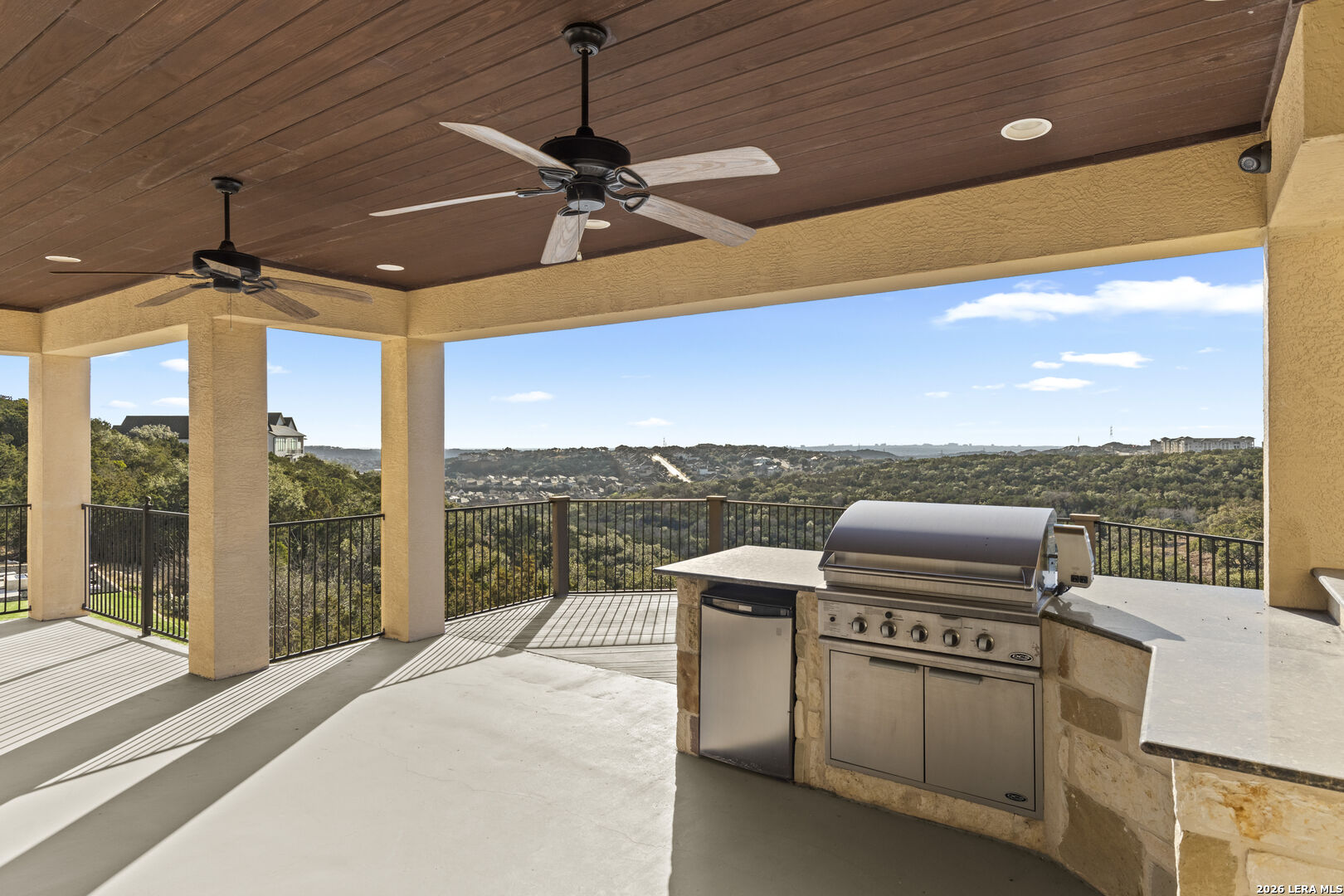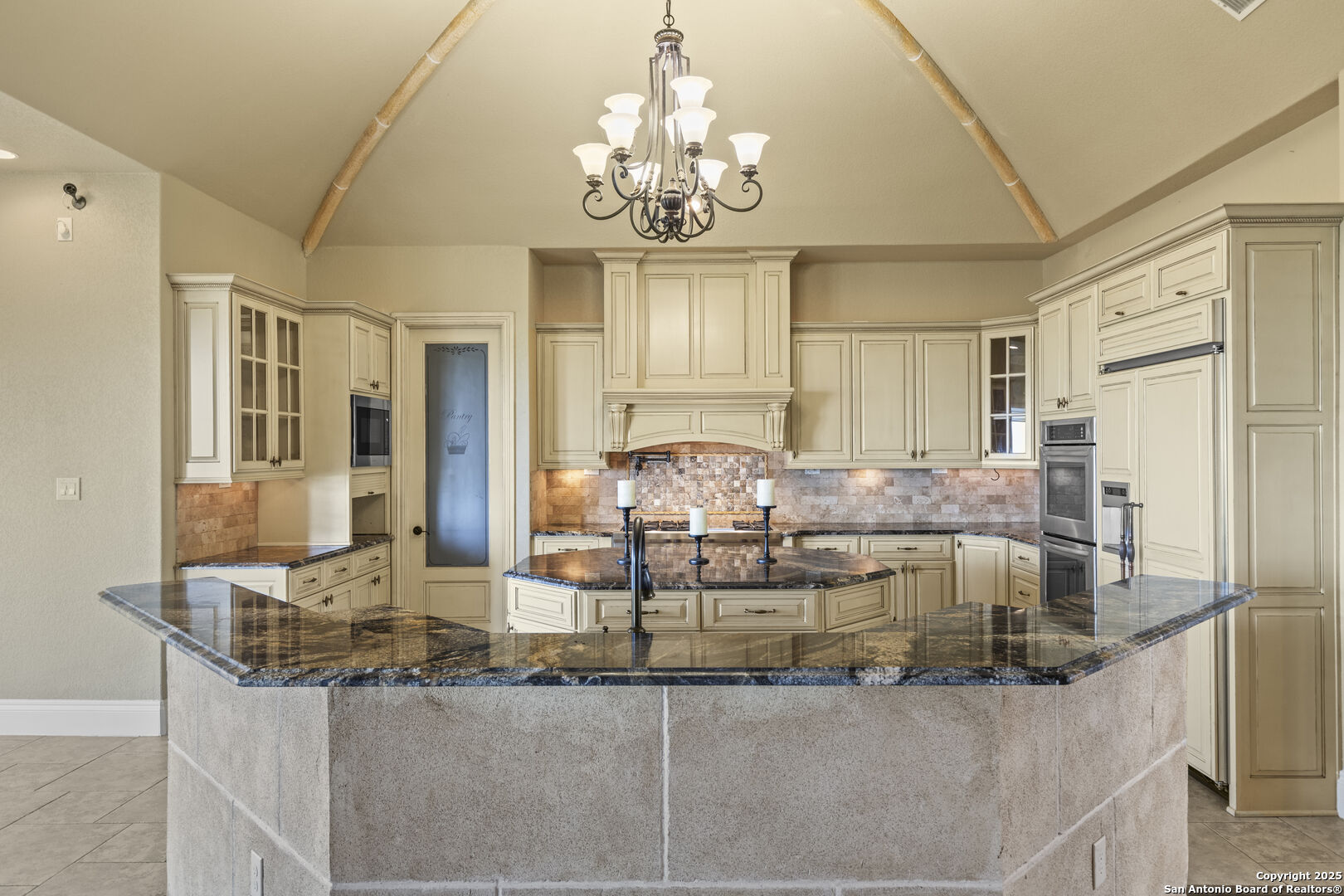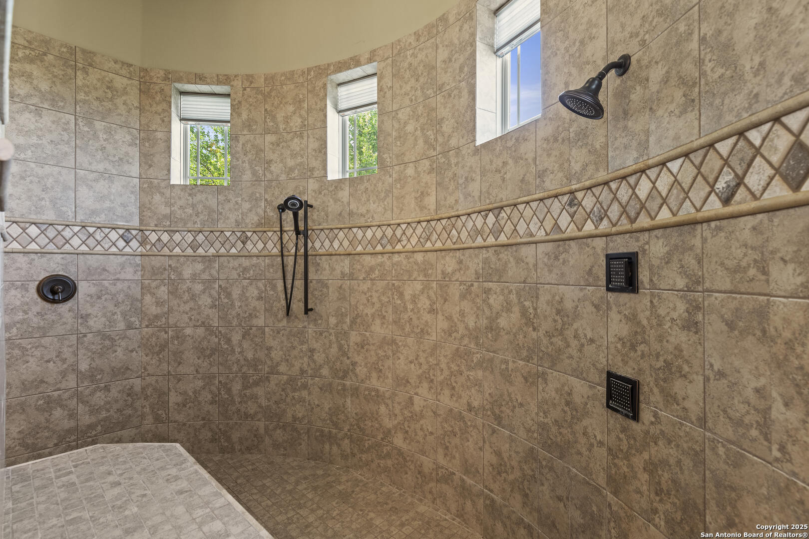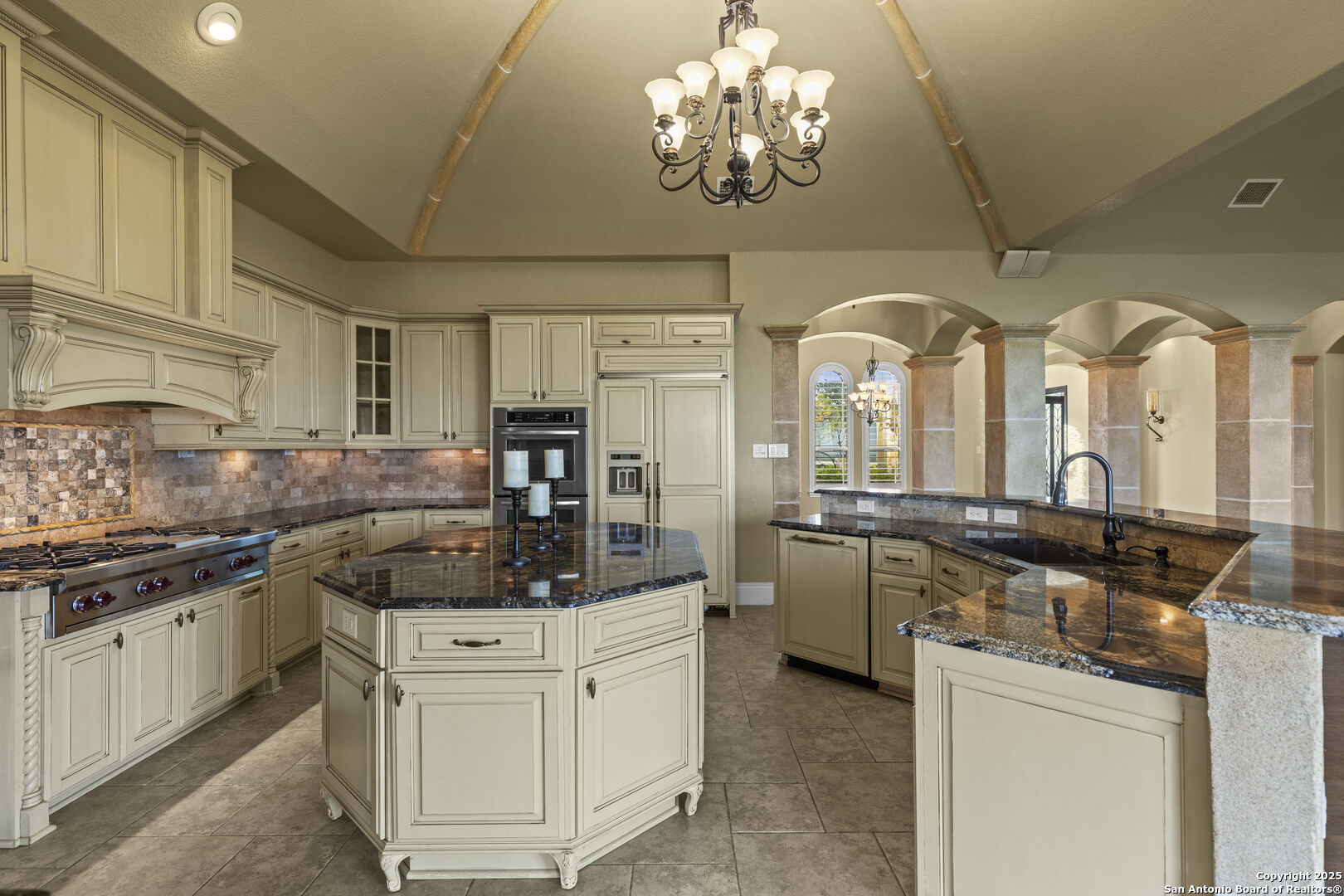 Unmatched Views. Thoughtful Design. Tucked inside the gated hilltop community of Terra Mont, this stunning custom-built Solace Creek home is the perfect blend of elegance, comfort, and quiet Hill Country living. Set on over 1.18 acres, this private south-facing lot backs to a scenic natural canyon co-owned by surrounding neighbors-perfect for peaceful morning sunrises and glorious evening sunsets. The first thing you'll notice about this home is the unmatched, unobstructed views! Oversized windows frame wide-open skies and city lights in the distance, giving every room a peaceful, elevated feel and a sense of serenity that's hard to match. Outdoor living is effortless with over 2,000 sq ft of decking, a built-in grill, mounted outdoor TV, and a covered patio. Whether you're enjoying coffee on the back deck, relaxing by the fireplace, or prepping a meal in the kitchen, there's a sense of awe and tranquility. Equally stunning are the custom design choices you'll find inside. The home features Venetian plaster accents, a rotunda entry, custom iron gates and light fixtures, Travertine and wood flooring, two gas fireplaces, and four spacious bedrooms-including two primary suites on the main level, offering flexibility for all stages of life. There are also three full baths, two half baths, and specialty rooms like a media room (with included projector), a private study (with a secret passage!), a home gym, and two large living areas. The heart of the home is a beautiful island kitchen with a 6-burner Wolf gas cooktop, griddle, warming drawer, paneled fridge and dishwasher, walk-in pantry, and hand-selected granite countertops. The adjoining breakfast room showcases a stunning custom dome ceiling, while the formal dining room easily hosts large gatherings. Retreat to the luxurious primary suite with a separate sitting area and patio access, dual tailored-height vanities with custom hammered copper sinks, dual walk-in closets, and an incredibly spacious primary bath featuring a whirlpool tub, walk-around shower with bench, his-and-hers toilet rooms (!), and direct access to the gym. The second primary suite includes a large bedroom, en-suite bathroom, spacious closet, and even a kitchenette (!)-designed with privacy in mind-all on the main level of the home. Additional features include a whole-house intercom system, dimmable uplighting and downlighting throughout, a whole-house generator, solar panels, and a water softener. This home was made to be lived in, loved, and enjoyed-where privacy, craftsmanship, and unforgettable views come together. Come see for yourself!