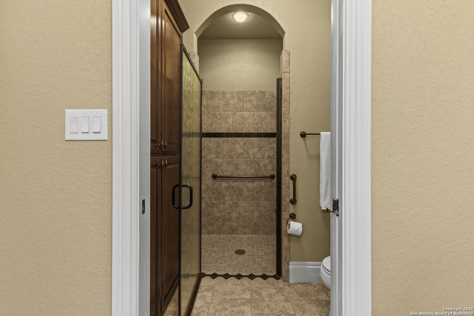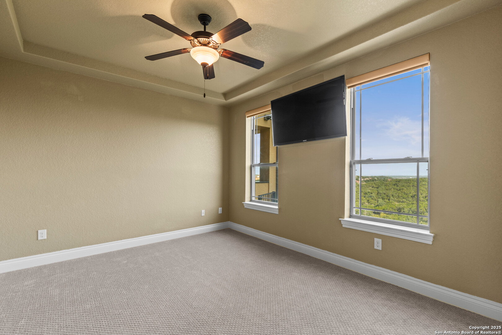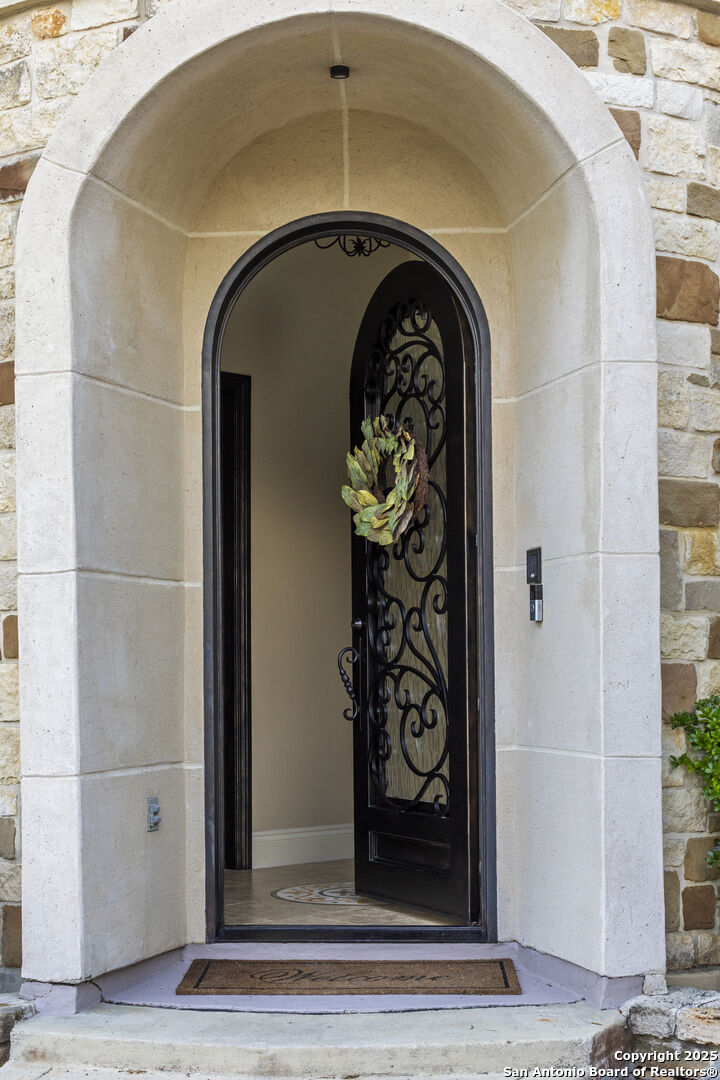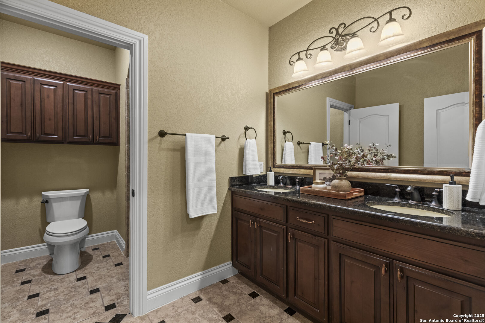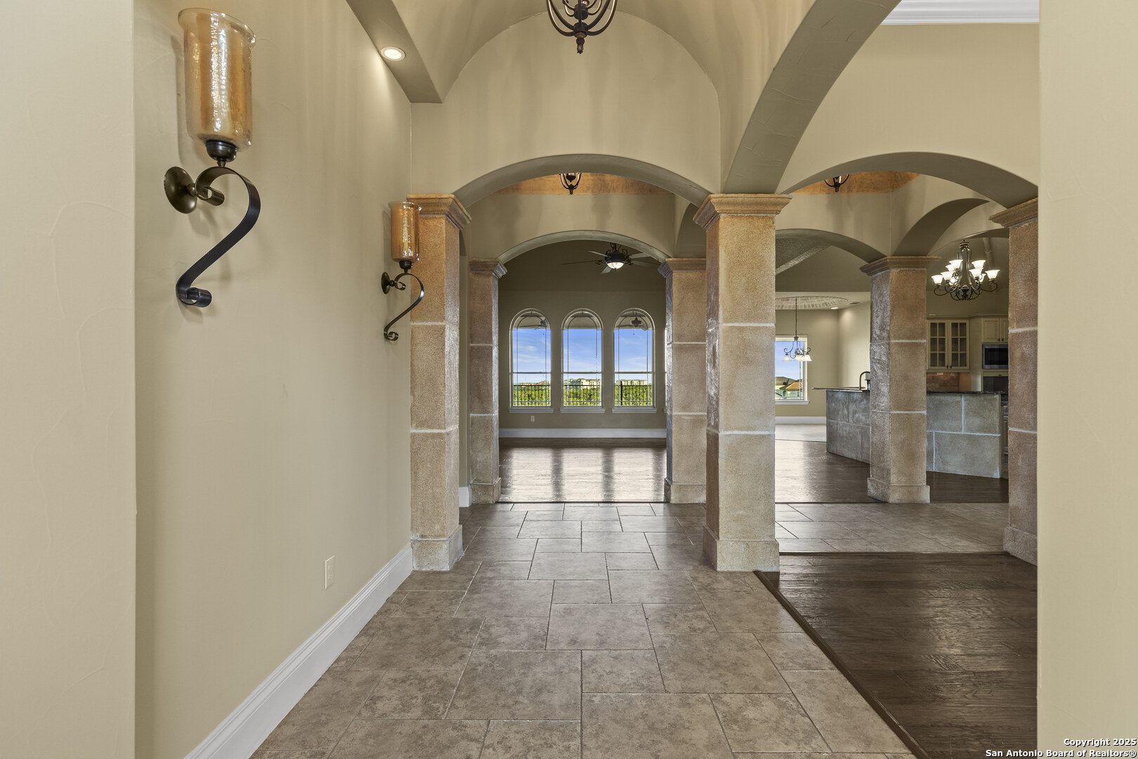 Unmatched Views. Thoughtful Design. Tucked inside the gated hilltop community of Terra Mont, this stunning custom-built Solace Creek home is the perfect blend of elegance, comfort, and quiet Hill Country living. Set on over 1.18 acres, this private south-facing lot backs to a scenic natural canyon co-owned by surrounding neighbors-perfect for peaceful morning sunrises and glorious evening sunsets. The first thing you'll notice about this home is the unmatched, unobstructed views! Oversized windows frame wide-open skies and city lights in the distance, giving every room a peaceful, elevated feel and a sense of serenity that's hard to match. Outdoor living is effortless with over 2,000 sq ft of decking, a built-in grill, mounted outdoor TV, and a covered patio. Whether you're enjoying coffee on the back deck, relaxing by the fireplace, or prepping a meal in the kitchen, there's a sense of awe and tranquility. Equally stunning are the custom design choices you'll find inside. The home features Venetian plaster accents, a rotunda entry, custom iron gates and light fixtures, Travertine and wood flooring, two gas fireplaces, and four spacious bedrooms-including two primary suites on the main level, offering flexibility for all stages of life. There are also three full baths, two half baths, and specialty rooms like a media room (with included projector), a private study (with a secret passage!), a home gym, and two large living areas. The heart of the home is a beautiful island kitchen with a 6-burner Wolf gas cooktop, griddle, warming drawer, paneled fridge and dishwasher, walk-in pantry, and hand-selected granite countertops. The adjoining breakfast room showcases a stunning custom dome ceiling, while the formal dining room easily hosts large gatherings. Retreat to the luxurious primary suite with a separate sitting area and patio access, dual tailored-height vanities with custom hammered copper sinks, dual walk-in closets, and an incredibly spacious primary bath featuring a whirlpool tub, walk-around shower with bench, his-and-hers toilet rooms (!), and direct access to the gym. The second primary suite includes a large bedroom, en-suite bathroom, spacious closet, and even a kitchenette (!)-designed with privacy in mind-all on the main level of the home. Additional features include a whole-house intercom system, dimmable uplighting and downlighting throughout, a whole-house generator, solar panels, and a water softener. This home was made to be lived in, loved, and enjoyed-where privacy, craftsmanship, and unforgettable views come together. Come see for yourself!