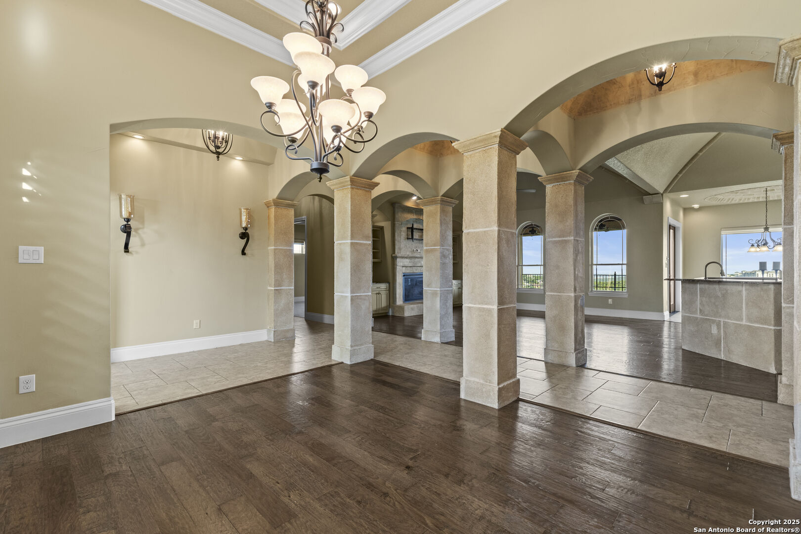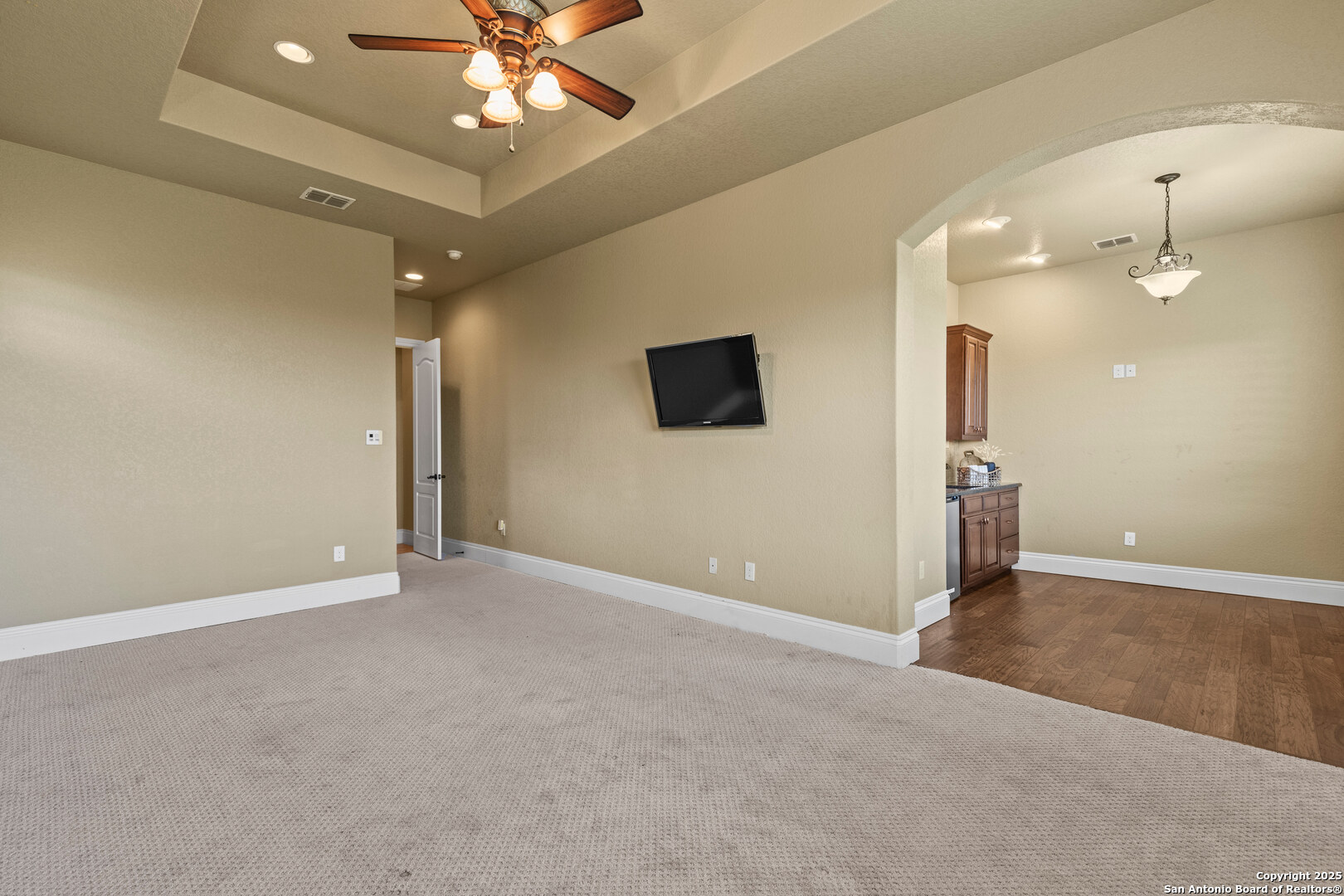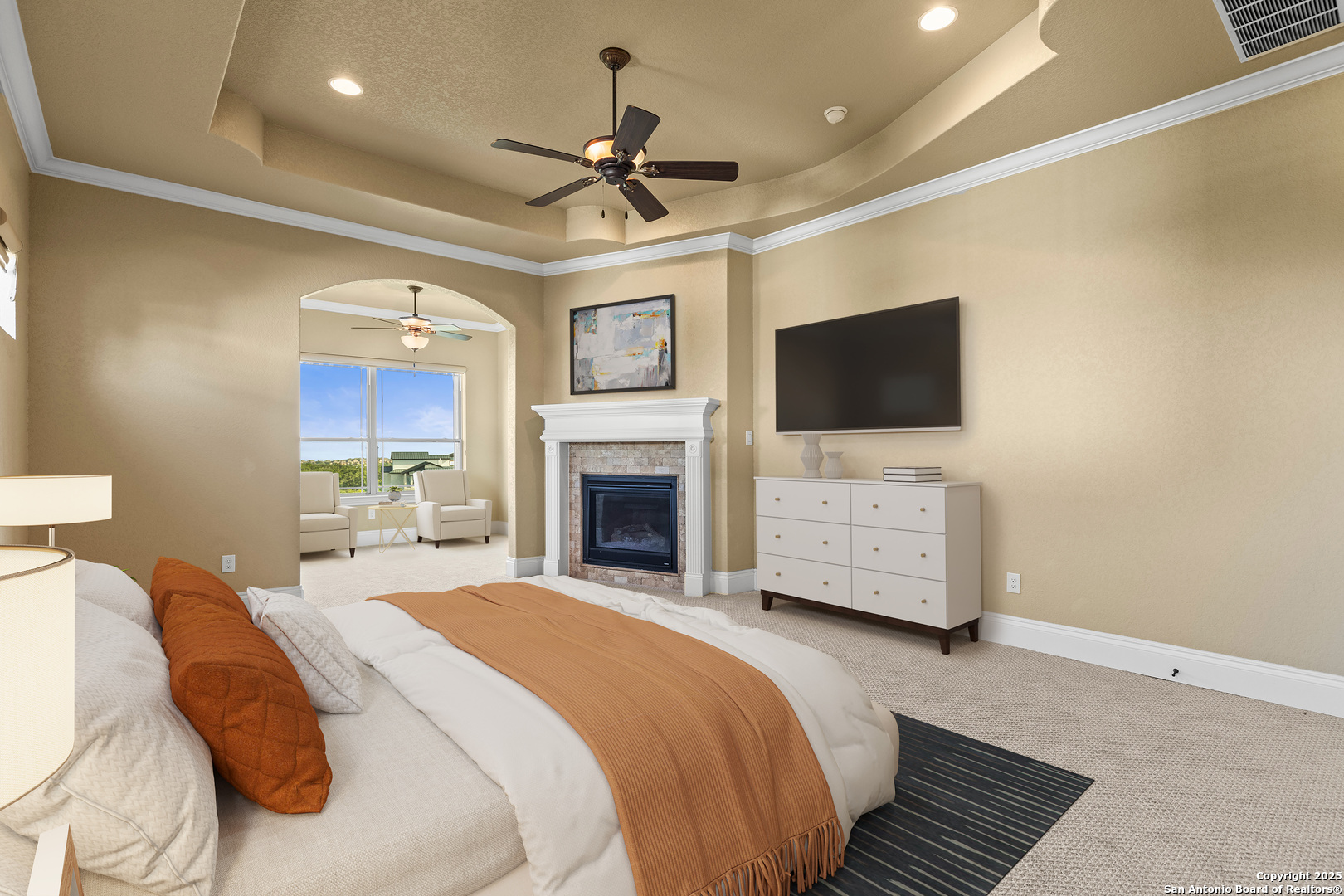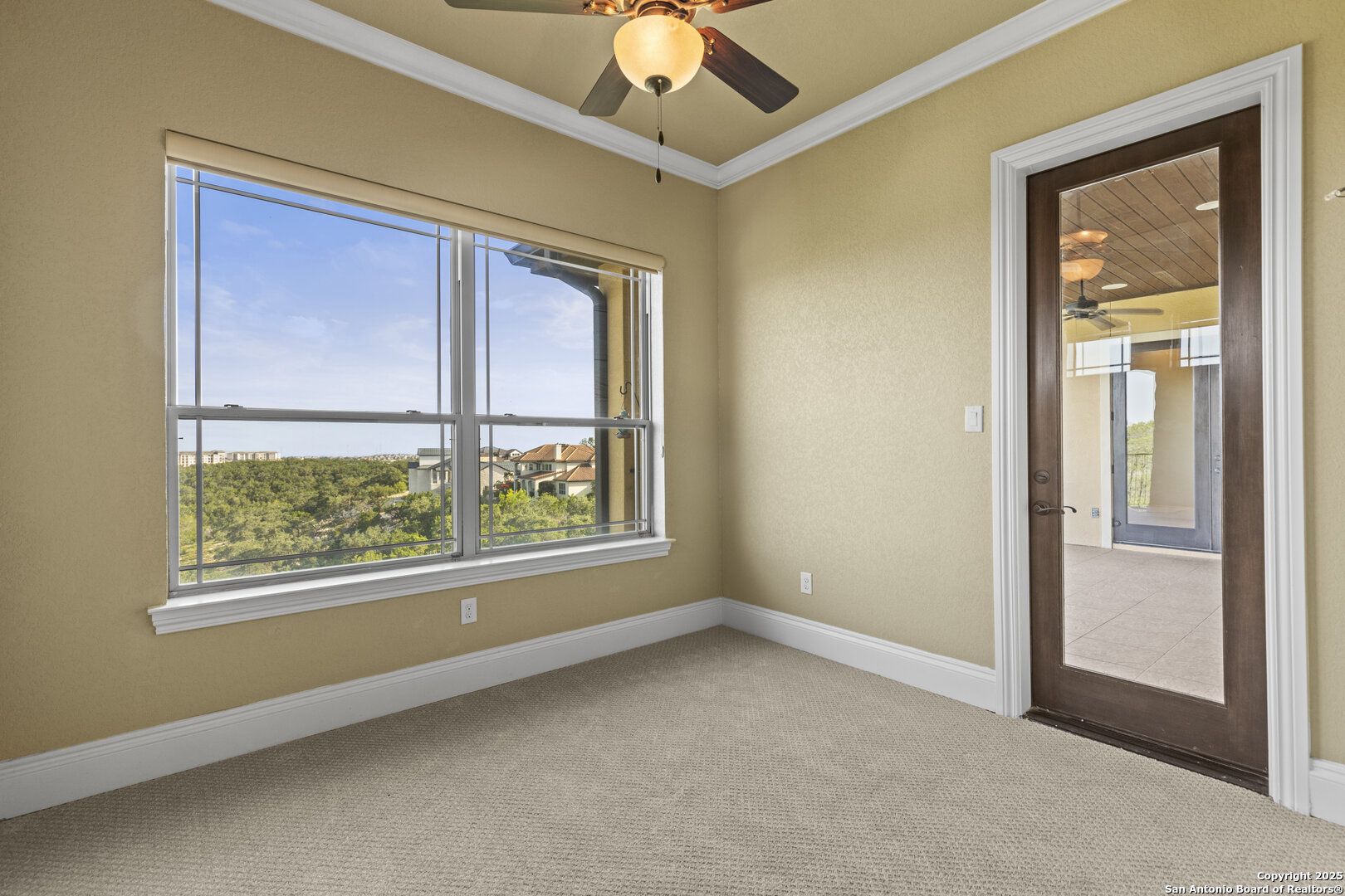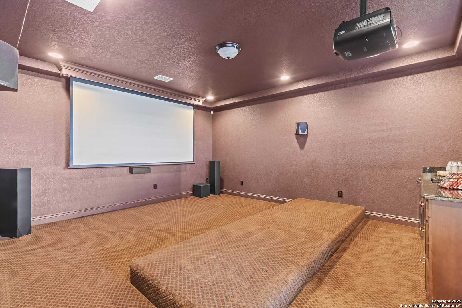 Unmatched Views. Thoughtful Design. Tucked inside the gated hilltop community of Terra Mont, this stunning custom-built Solace Creek home is the perfect blend of elegance, comfort, and quiet Hill Country living. Set on over 1.18 acres, this private south-facing lot backs to a scenic natural canyon co-owned by surrounding neighbors-perfect for peaceful morning sunrises and glorious evening sunsets. The first thing you'll notice about this home is the unmatched, unobstructed views! Oversized windows frame wide-open skies and city lights in the distance, giving every room a peaceful, elevated feel and a sense of serenity that's hard to match. Outdoor living is effortless with over 2,000 sq ft of decking, a built-in grill, mounted outdoor TV, and a covered patio. Whether you're enjoying coffee on the back deck, relaxing by the fireplace, or prepping a meal in the kitchen, there's a sense of awe and tranquility. Equally stunning are the custom design choices you'll find inside. The home features Venetian plaster accents, a rotunda entry, custom iron gates and light fixtures, Travertine and wood flooring, two gas fireplaces, and four spacious bedrooms-including two primary suites on the main level, offering flexibility for all stages of life. There are also three full baths, two half baths, and specialty rooms like a media room (with included projector), a private study (with a secret passage!), a home gym, and two large living areas. The heart of the home is a beautiful island kitchen with a 6-burner Wolf gas cooktop, griddle, warming drawer, paneled fridge and dishwasher, walk-in pantry, and hand-selected granite countertops. The adjoining breakfast room showcases a stunning custom dome ceiling, while the formal dining room easily hosts large gatherings. Retreat to the luxurious primary suite with a separate sitting area and patio access, dual tailored-height vanities with custom hammered copper sinks, dual walk-in closets, and an incredibly spacious primary bath featuring a whirlpool tub, walk-around shower with bench, his-and-hers toilet rooms (!), and direct access to the gym. The second primary suite includes a large bedroom, en-suite bathroom, spacious closet, and even a kitchenette (!)-designed with privacy in mind-all on the main level of the home. Additional features include a whole-house intercom system, dimmable uplighting and downlighting throughout, a whole-house generator, solar panels, and a water softener. This home was made to be lived in, loved, and enjoyed-where privacy, craftsmanship, and unforgettable views come together. Come see for yourself!