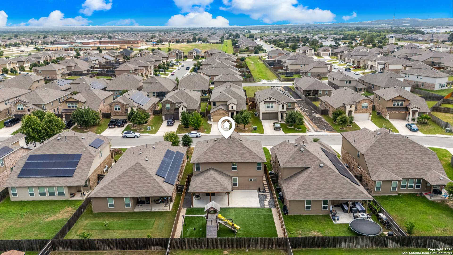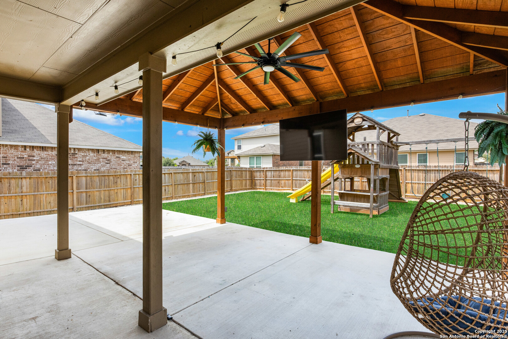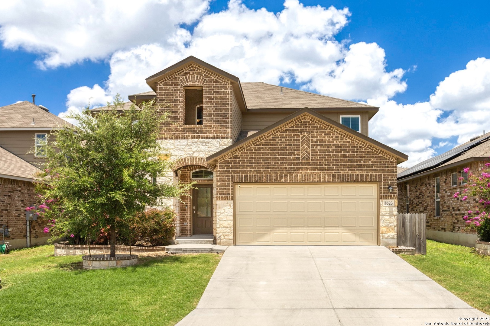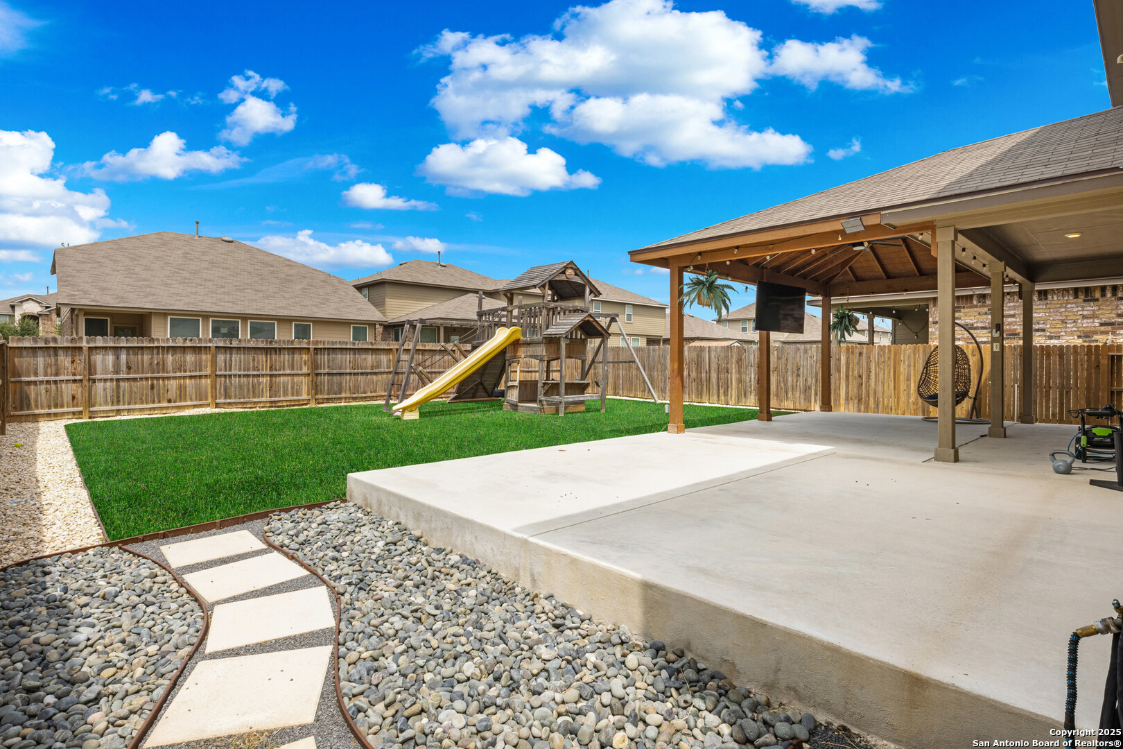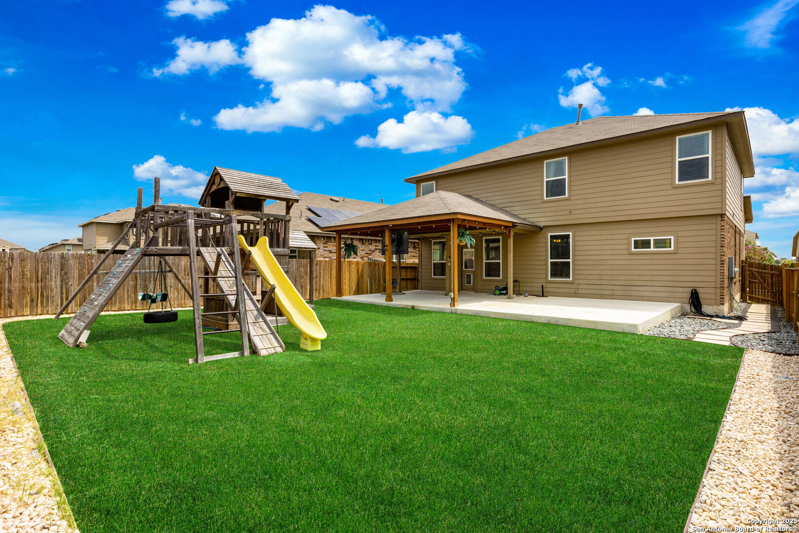This spacious 5-bedroom, 3.5-bath home offers the perfect balance of comfort and functionality with its open floor plan designed for entertaining and everyday living. The chef's kitchen features granite countertops, ample cabinetry, and flows seamlessly into the living and dining spaces. Upstairs and downstairs living areas provide flexibility for family gatherings, work, or play. The private owner's suite boasts a generous layout with a spa-like bathroom.Step outside to your low-maintenance turf backyard, complete with an outdoor play set, perfect for family fun year-round. Washer, dryer, and refrigerator are included, making this home move-in ready! Located in the highly sought-after master-planned Valley Ranch community, you'll enjoy resort-style amenities including pools, clubhouse, gym, and walking trails. Don't miss this opportunity to own in one of San Antonio's most desirable neighborhoods!