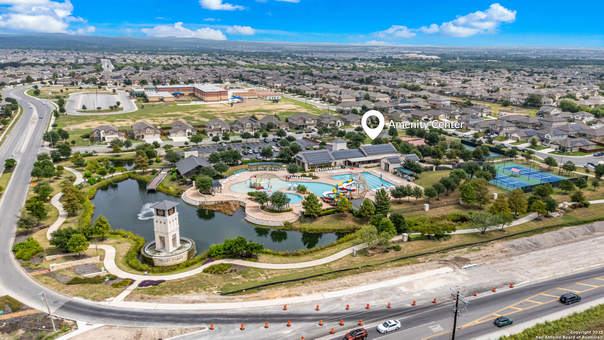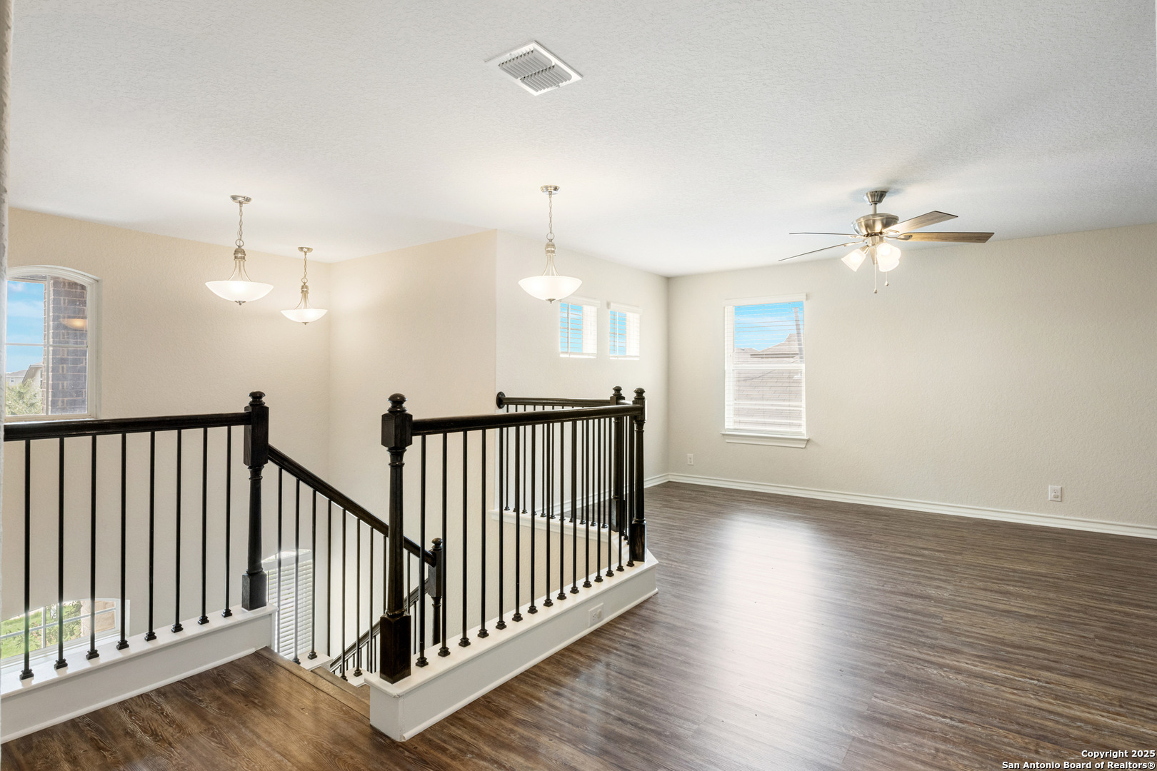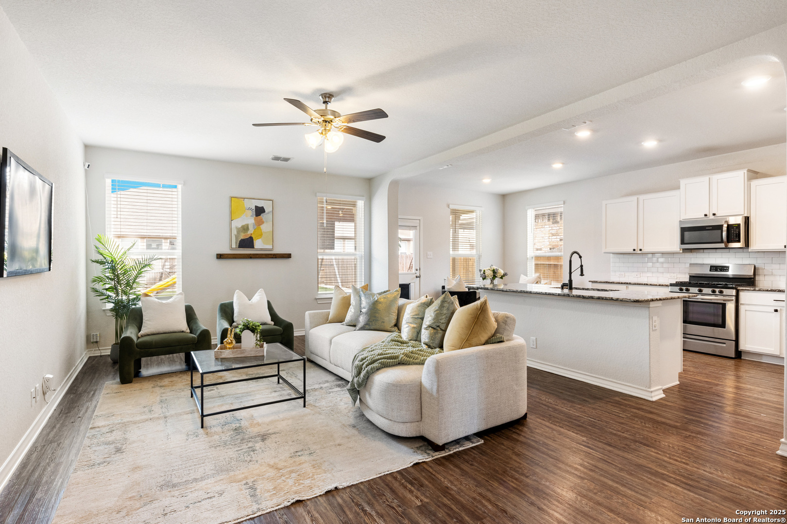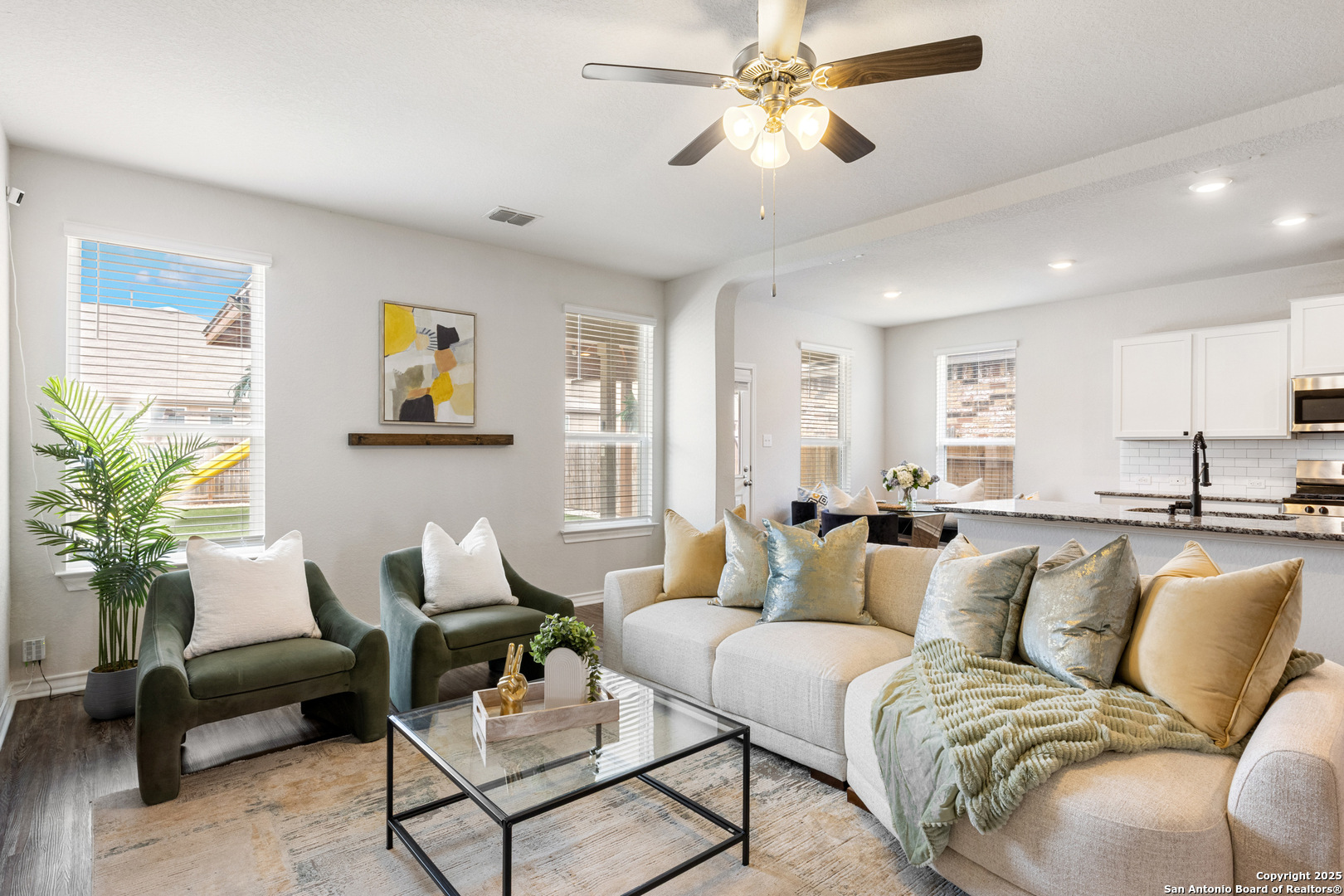 This spacious 5-bedroom, 3.5-bath home offers the perfect balance of comfort and functionality with its open floor plan designed for entertaining and everyday living. The chef's kitchen features granite countertops, ample cabinetry, and flows seamlessly into the living and dining spaces. Upstairs and downstairs living areas provide flexibility for family gatherings, work, or play. The private owner's suite boasts a generous layout with a spa-like bathroom.Step outside to your low-maintenance turf backyard, complete with an outdoor play set, perfect for family fun year-round. Washer, dryer, and refrigerator are included, making this home move-in ready! Located in the highly sought-after master-planned Valley Ranch community, you'll enjoy resort-style amenities including pools, clubhouse, gym, and walking trails. Don't miss this opportunity to own in one of San Antonio's most desirable neighborhoods!