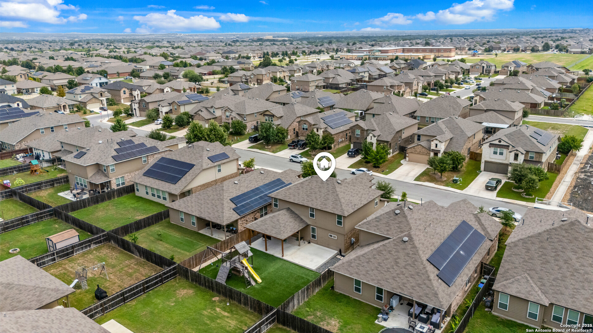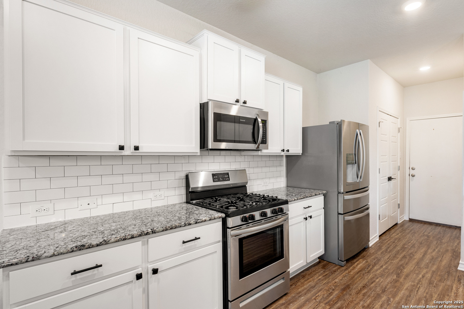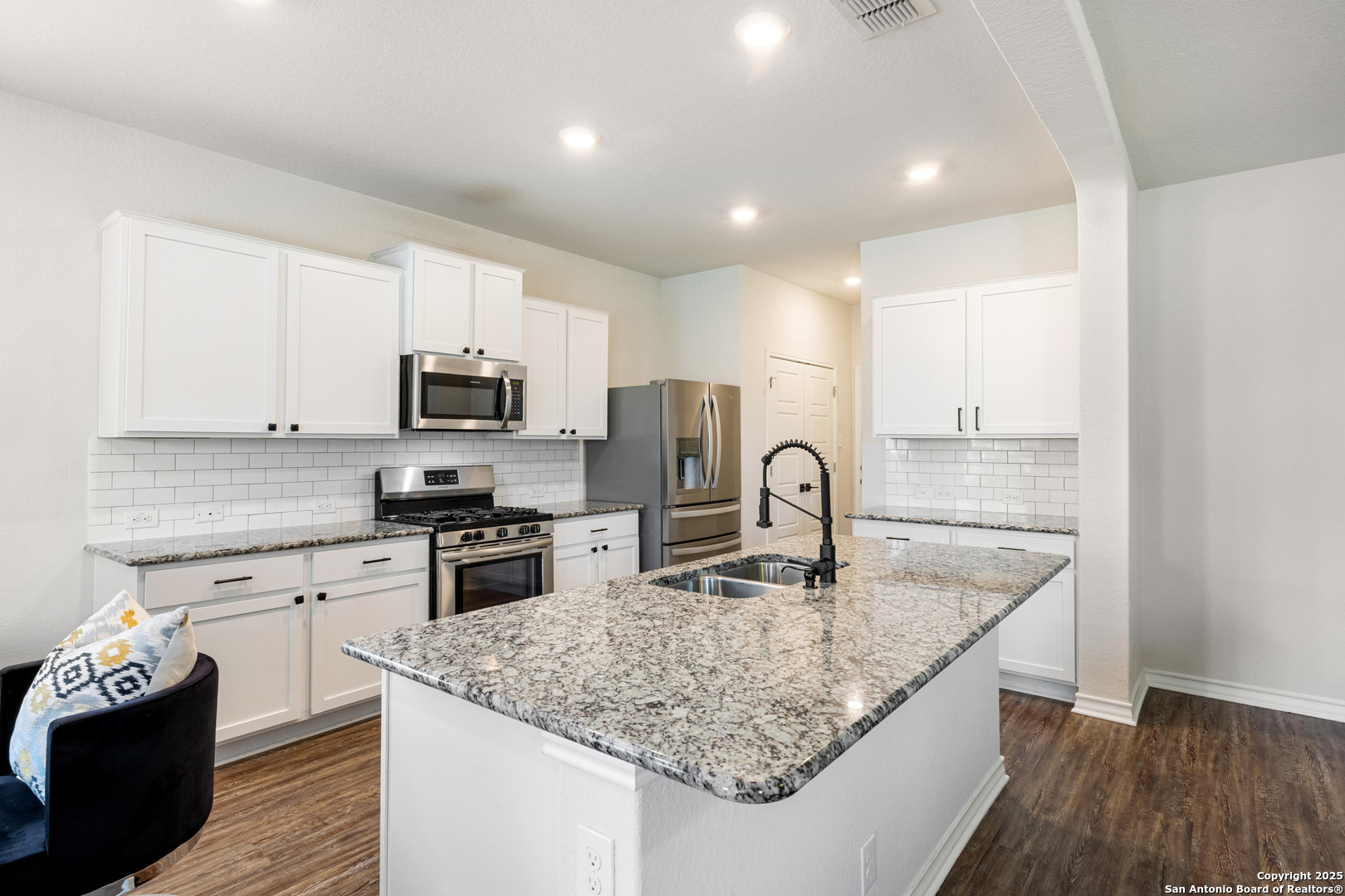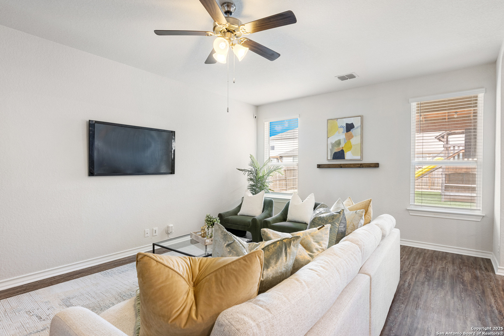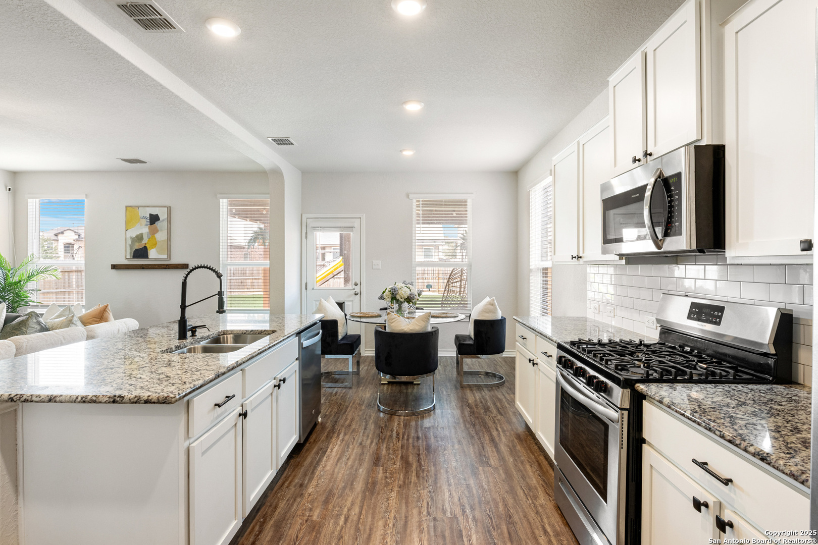 This spacious 5-bedroom, 3.5-bath home offers the perfect balance of comfort and functionality with its open floor plan designed for entertaining and everyday living. The chef's kitchen features granite countertops, ample cabinetry, and flows seamlessly into the living and dining spaces. Upstairs and downstairs living areas provide flexibility for family gatherings, work, or play. The private owner's suite boasts a generous layout with a spa-like bathroom.Step outside to your low-maintenance turf backyard, complete with an outdoor play set, perfect for family fun year-round. Washer, dryer, and refrigerator are included, making this home move-in ready! Located in the highly sought-after master-planned Valley Ranch community, you'll enjoy resort-style amenities including pools, clubhouse, gym, and walking trails. Don't miss this opportunity to own in one of San Antonio's most desirable neighborhoods!