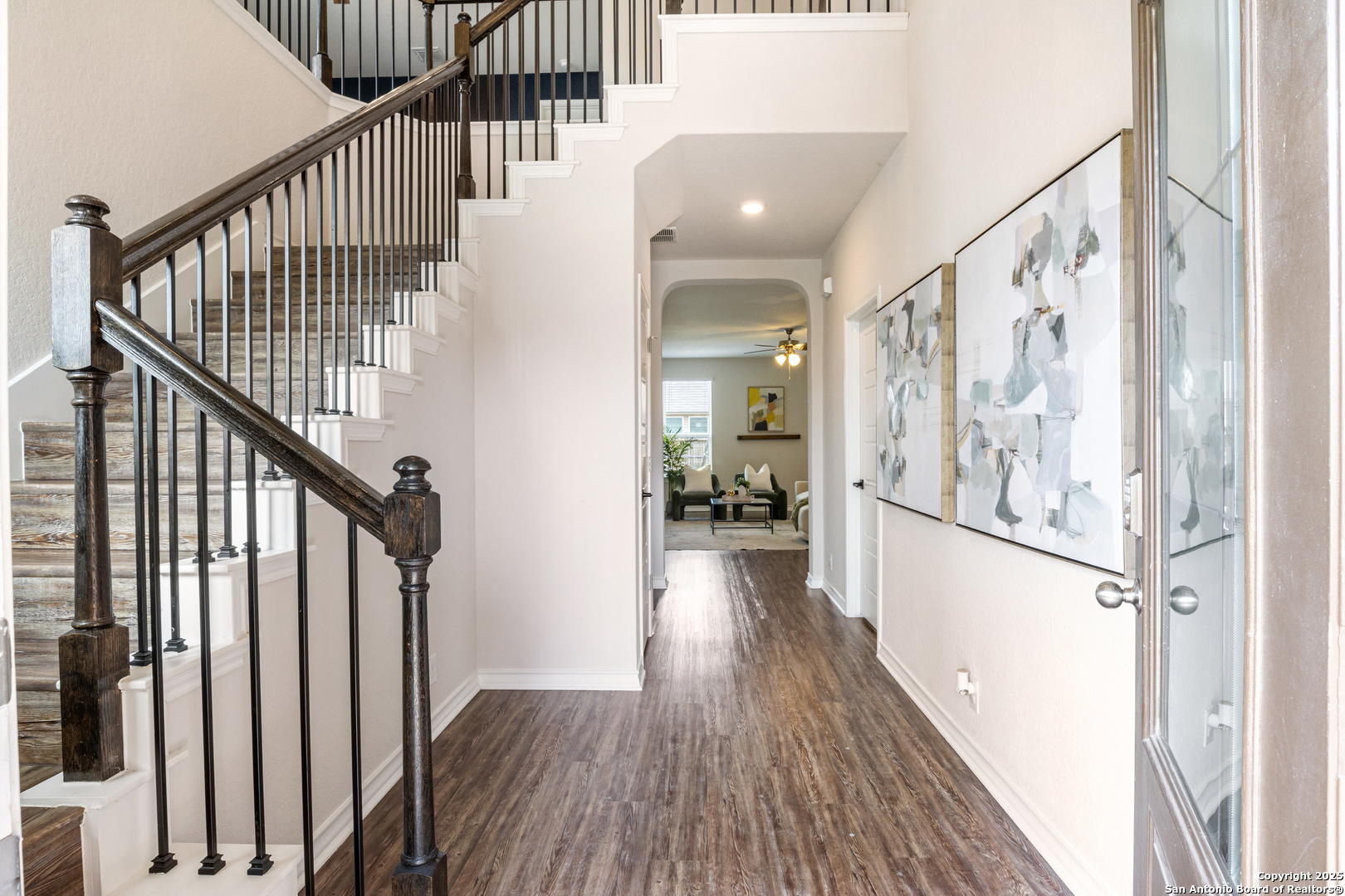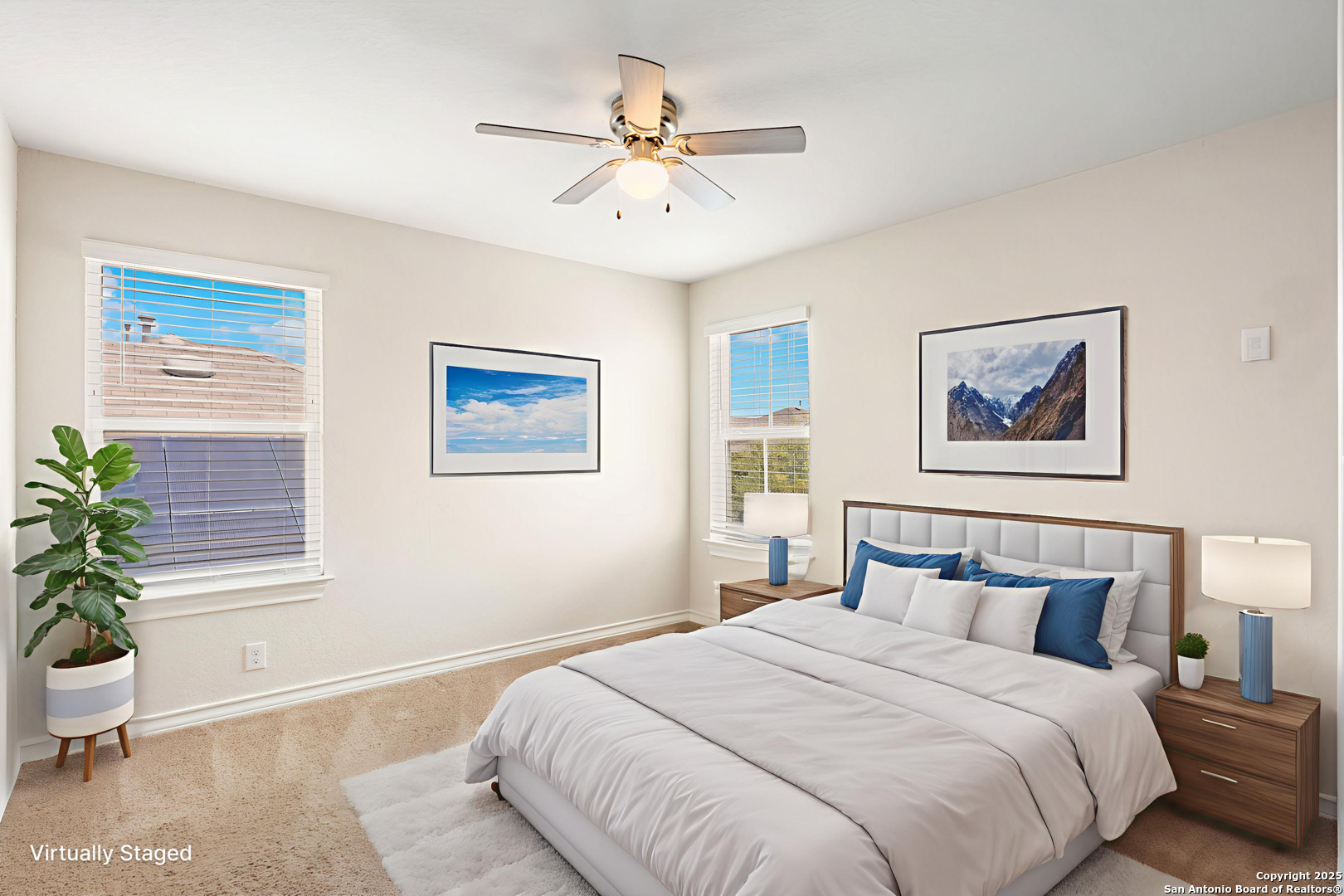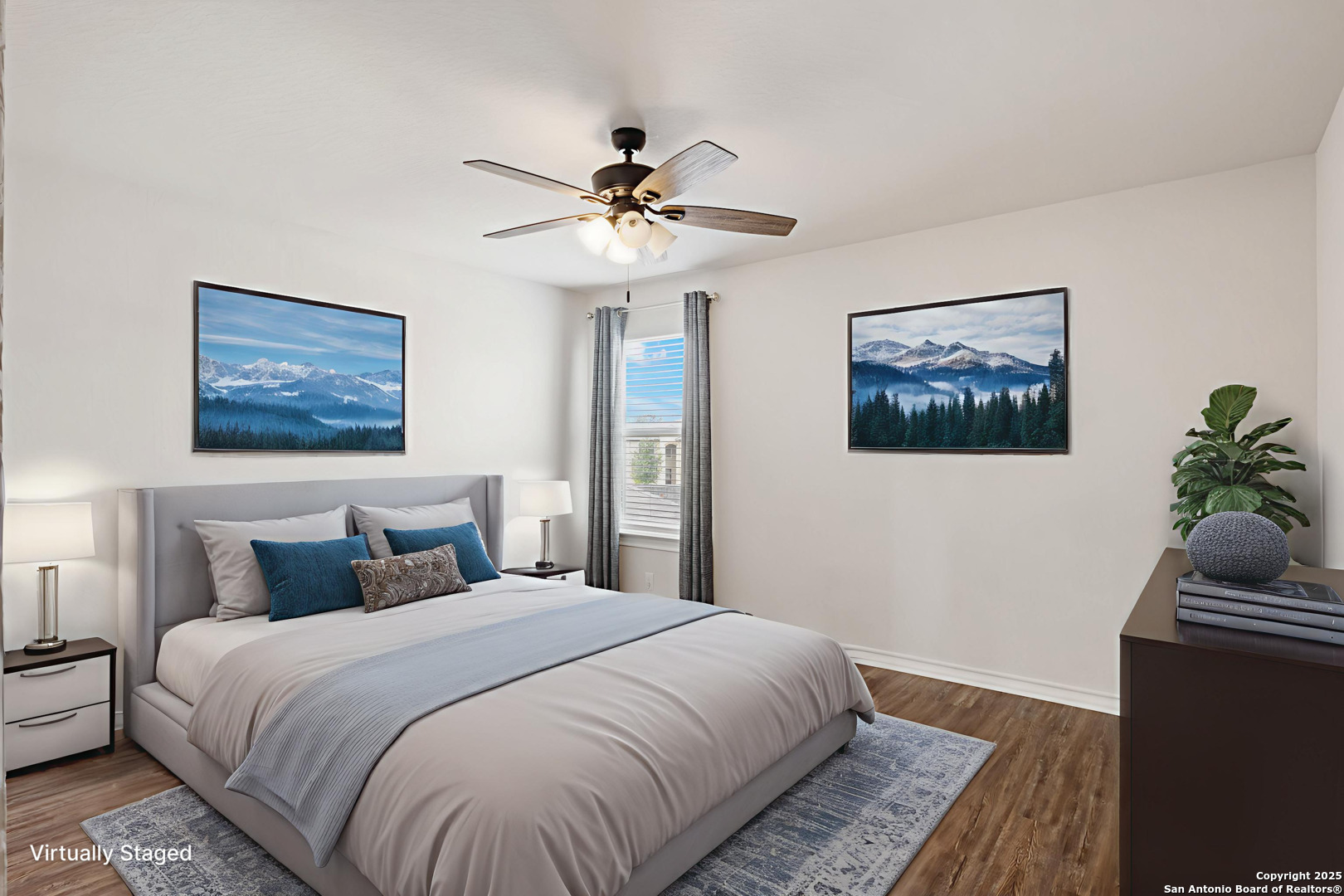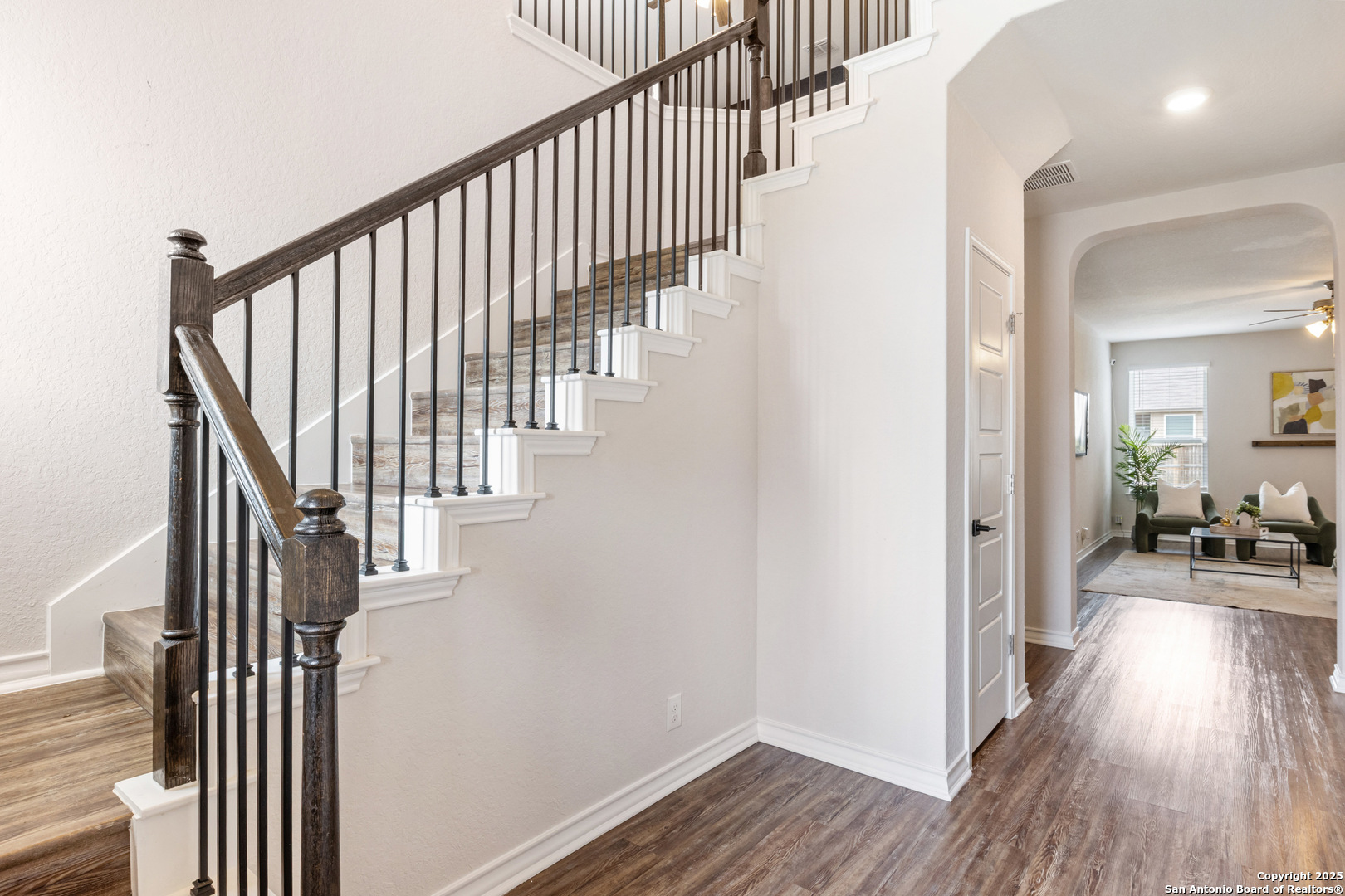 This spacious 5-bedroom, 3.5-bath home offers the perfect balance of comfort and functionality with its open floor plan designed for entertaining and everyday living. The chef's kitchen features granite countertops, ample cabinetry, and flows seamlessly into the living and dining spaces. Upstairs and downstairs living areas provide flexibility for family gatherings, work, or play. The private owner's suite boasts a generous layout with a spa-like bathroom.Step outside to your low-maintenance turf backyard, complete with an outdoor play set, perfect for family fun year-round. Washer, dryer, and refrigerator are included, making this home move-in ready! Located in the highly sought-after master-planned Valley Ranch community, you'll enjoy resort-style amenities including pools, clubhouse, gym, and walking trails. Don't miss this opportunity to own in one of San Antonio's most desirable neighborhoods!