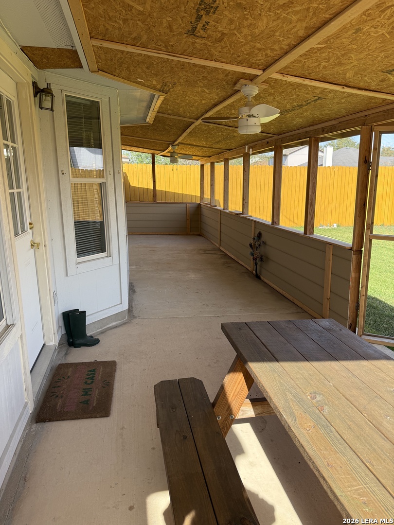 Welcome home to this charming, single-story property in the established Escondido Creek neighborhood of Converse. With approximately 1,668 square feet, 3 bedrooms + flex room, and 2 baths, the layout feels bright and open thanks to high ceilings in the main living area. One standout feature is the primary suite's adjoining flex room (with a closet)-perfect for a nursery, home office, sewing/craft room, workout room, or quiet retreat. Two additional bedrooms and full bath sit in their own hallway, offering privacy for family and guests. The home has been well cared for with recent improvements that matter: new backyard fence, Leaf Filter gutters on the front eaves and entryway, new garage door and attic access ladder, professionally cleaned ductwork, new ceiling fans in the primary bedroom and flex space, a dining chandelier, and new Kohler lavatories. Out back, you'll love the screened-in porch with two ceiling fans--ready for morning coffee or evening get-togethers. The porch structure is already in place, giving the next owner a great opportunity to finish out the interior wood framing to their preference. Easy access to major highways, shopping, dining, and Randolph Air Force Base makes this a smart blend of comfort, versatility, and location.