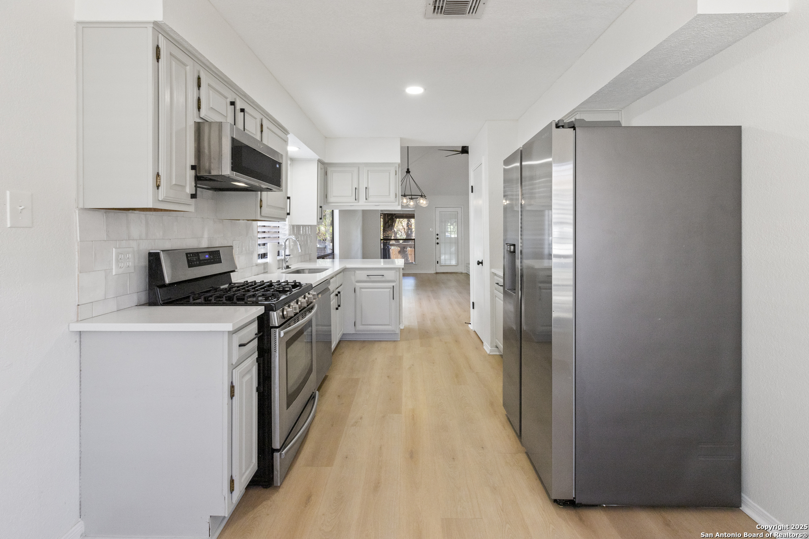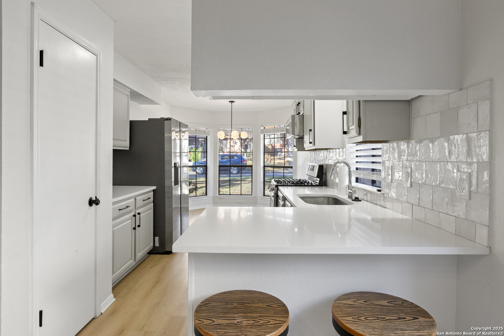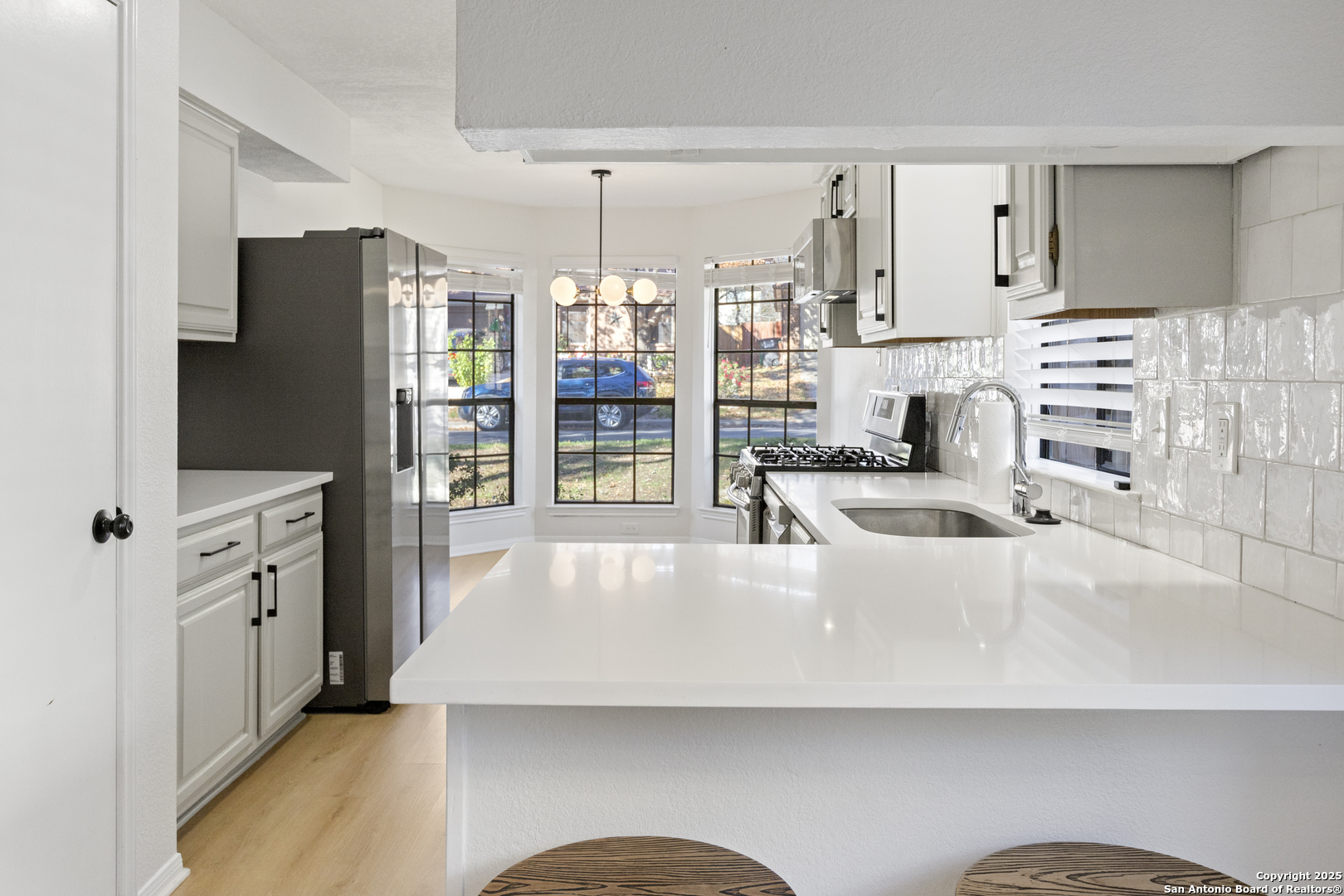 Welcome to this charming and recently updated 3-bedroom, 2-bathroom home nestled among mature trees in the highly sought-after Great Northwest Community. The spacious living area features a stunning brick fireplace, soaring high ceilings, and abundant natural light that fills the home. The primary suite offers a generously sized bedroom, double vanities, a large en-suite bathroom, and two spacious walk-in closets for ample storage. The updated kitchen is a true highlight, equipped with gas cooking, gorgeous Quartz countertops, and a stylish tile backsplash. The adjoining breakfast area provides a serene view of the beautifully landscaped front yard. Outside, the comfortable backyard is perfect for family gatherings or simply relaxing. Conveniently located near major shopping centers, and the amenities of this well-established neighborhood, this home offers both modern upgrades and an unbeatable location. Don't miss this incredible opportunity.
