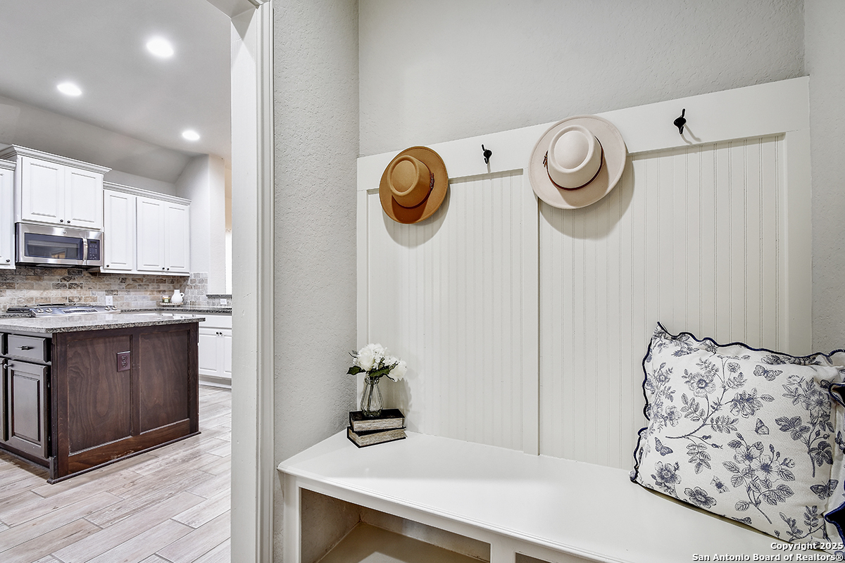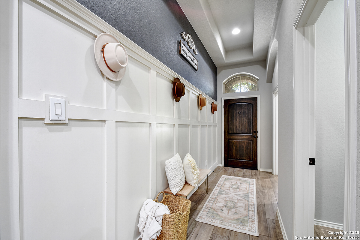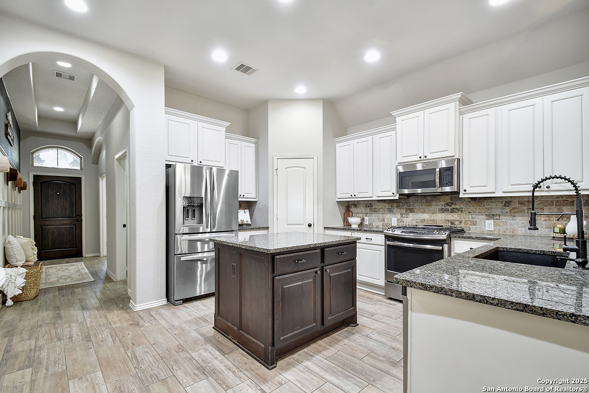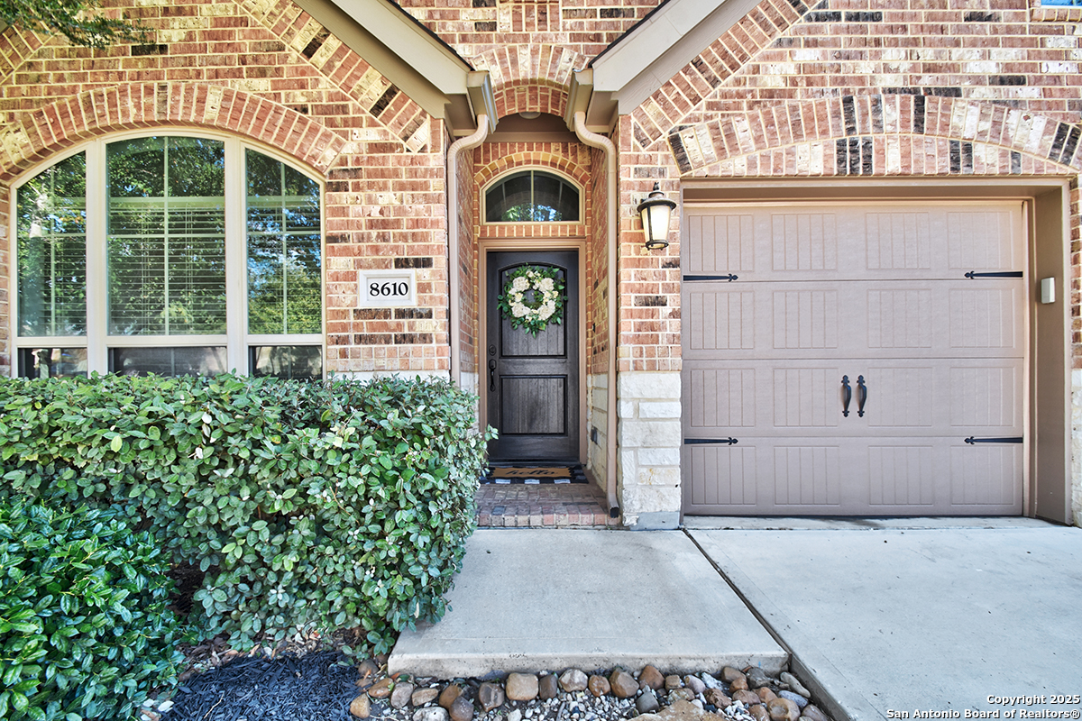 8610 Lajitas is a beautifully updated 3 bedroom, 2 bath single-story in the highly sought-after Stillwater Ranch community, offering instant curb appeal with its brick and stone exterior, mature trees, and thoughtfully selected finishes inside and out. Inside, pride of ownership shines. The entry sets the tone with an inset ceiling and a custom drop zone featuring molding, hooks, and storage - the perfect place to land coats, bags, and daily essentials. Just off the foyer, a dedicated front office filled with natural light overlooks the front yard, ideal for working from home, but easily flexes as a playroom, workout room, or hobby space. Near the garage entry, a second mudroom-style drop zone with wainscoting, hooks, and a bench with built-in storage keeps backpacks, work boots, and purses neatly tucked away. Wood-look tile flows through the main living areas, leading you into the heart of the home. The spacious kitchen features granite countertops, white cabinetry with under-cabinet lighting, a contrasting oversized island in a warm wood tone, stainless steel appliances, decorative backsplash, breakfast bar seating, and a corner pantry. The dining area seamlessly connects the kitchen to the large living room, where decorative wall shelving and a wall of windows create a bright, inviting space that's perfect for everyday living and entertaining. The private primary suite offers high ceilings, another expansive wall of windows, and stylish decorative wall molding. The ensuite bath includes a soaking tub, separate walk-in shower, dual-sink vanity, and a generous walk-in closet with shelving. Two well-sized secondary bedrooms share a full bath with a tiled tub/shower surround. A water softener and reverse osmosis system add everyday comfort and convenience, and the sellers have also thoughtfully updated ceiling fans throughout the home. Step outside to unwind in the backyard, complete with a covered patio, mature trees, a storage shed, and a cozy corner fire pit area. Even better-the fire pit and chairs convey, creating an instant outdoor retreat. The washer and dryer also convey, and the epoxy-coated garage floor adds a polished, low-maintenance finish to the two-car garage with its own separate bay. All of this in amenity-rich Stillwater Ranch, where you'll enjoy two pools, a full fitness center, basketball court, and walking trails, plus a convenient location close to major employers, dining, and shopping.