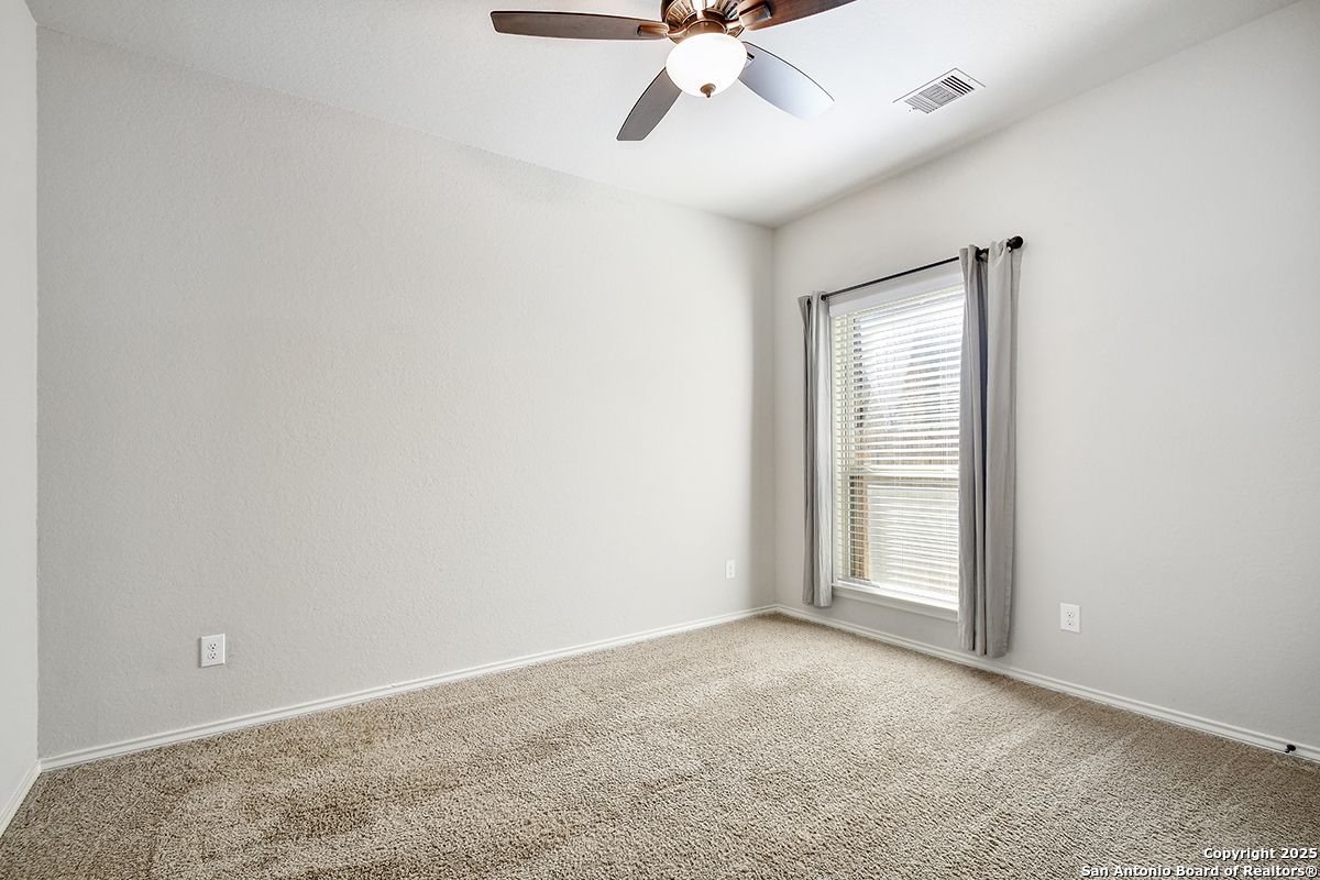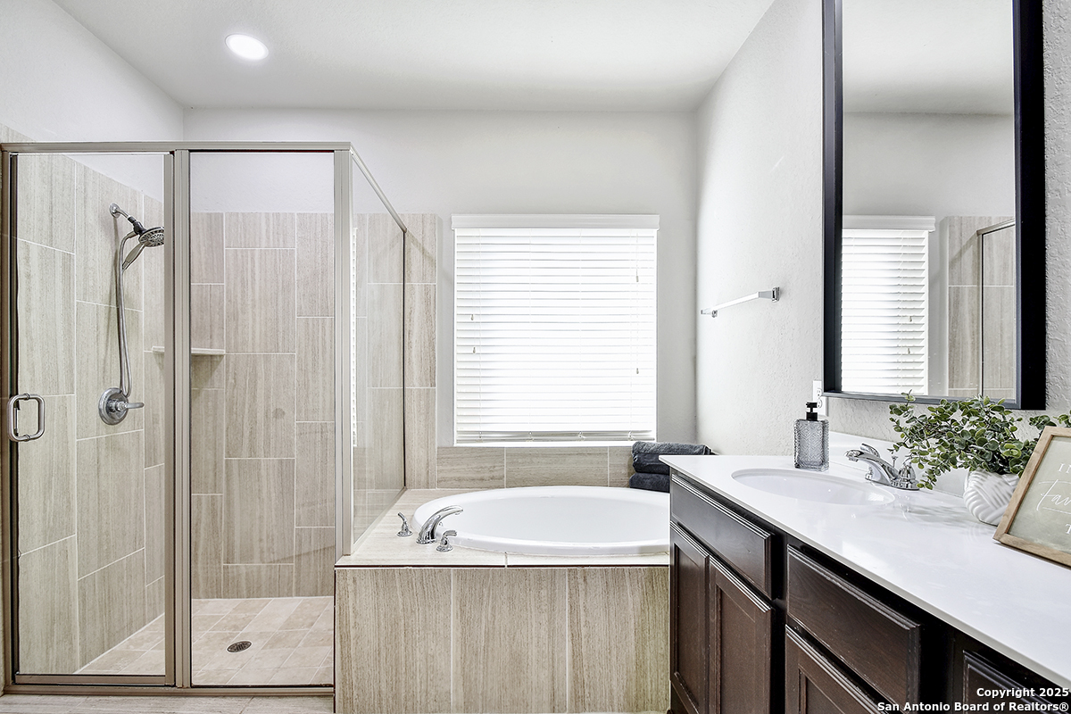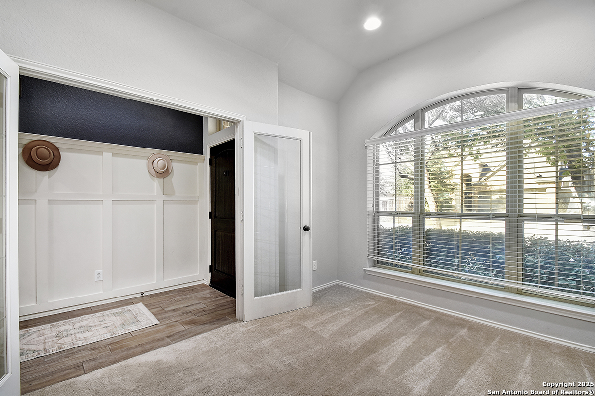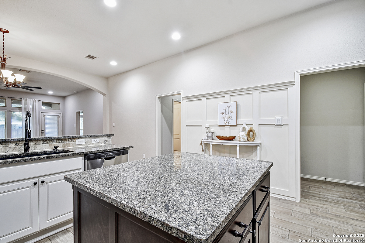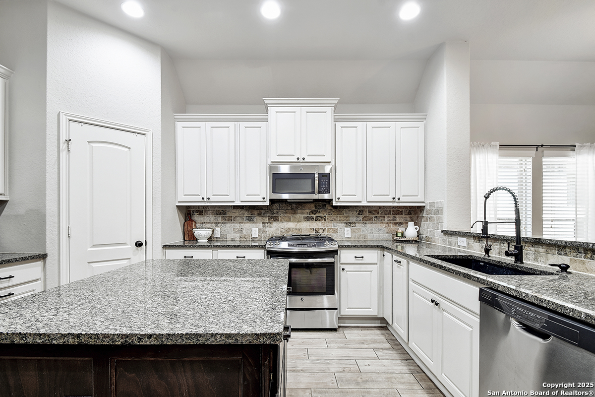 8610 Lajitas is a beautifully updated 3 bedroom, 2 bath single-story in the highly sought-after Stillwater Ranch community, offering instant curb appeal with its brick and stone exterior, mature trees, and thoughtfully selected finishes inside and out. Inside, pride of ownership shines. The entry sets the tone with an inset ceiling and a custom drop zone featuring molding, hooks, and storage - the perfect place to land coats, bags, and daily essentials. Just off the foyer, a dedicated front office filled with natural light overlooks the front yard, ideal for working from home, but easily flexes as a playroom, workout room, or hobby space. Near the garage entry, a second mudroom-style drop zone with wainscoting, hooks, and a bench with built-in storage keeps backpacks, work boots, and purses neatly tucked away. Wood-look tile flows through the main living areas, leading you into the heart of the home. The spacious kitchen features granite countertops, white cabinetry with under-cabinet lighting, a contrasting oversized island in a warm wood tone, stainless steel appliances, decorative backsplash, breakfast bar seating, and a corner pantry. The dining area seamlessly connects the kitchen to the large living room, where decorative wall shelving and a wall of windows create a bright, inviting space that's perfect for everyday living and entertaining. The private primary suite offers high ceilings, another expansive wall of windows, and stylish decorative wall molding. The ensuite bath includes a soaking tub, separate walk-in shower, dual-sink vanity, and a generous walk-in closet with shelving. Two well-sized secondary bedrooms share a full bath with a tiled tub/shower surround. A water softener and reverse osmosis system add everyday comfort and convenience, and the sellers have also thoughtfully updated ceiling fans throughout the home. Step outside to unwind in the backyard, complete with a covered patio, mature trees, a storage shed, and a cozy corner fire pit area. Even better-the fire pit and chairs convey, creating an instant outdoor retreat. The washer and dryer also convey, and the epoxy-coated garage floor adds a polished, low-maintenance finish to the two-car garage with its own separate bay. All of this in amenity-rich Stillwater Ranch, where you'll enjoy two pools, a full fitness center, basketball court, and walking trails, plus a convenient location close to major employers, dining, and shopping.