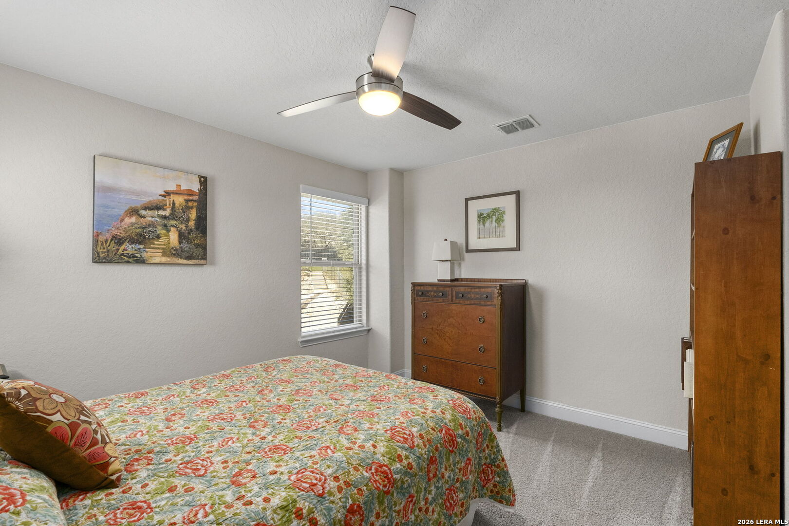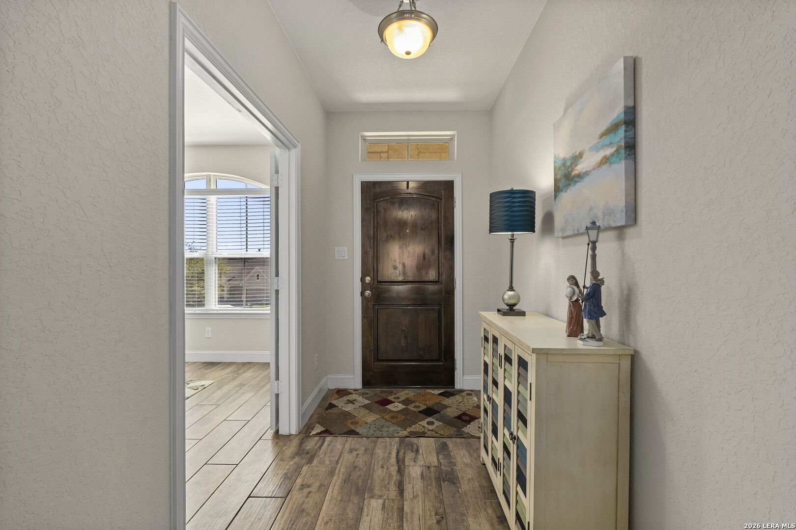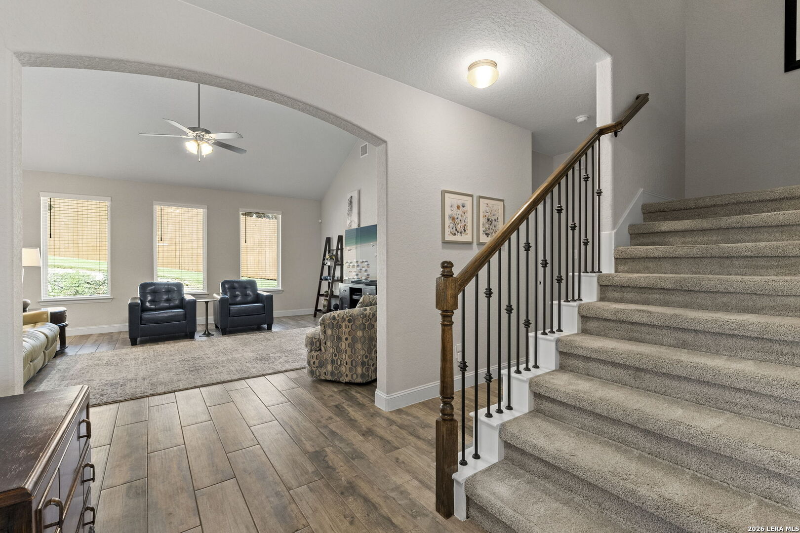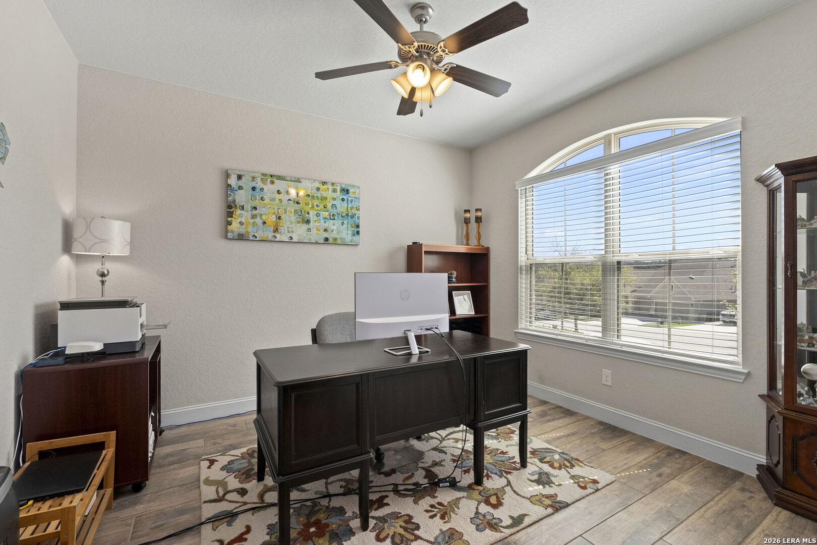 Hidden in the back of a quiet cul-de-sac with easy access to I-10, this sparkling two-story home offers the layout people are looking for with a distinctive Hill Country-style back yard setting. The location is a short drive to Boerne or San Antonio and near two HEBs, dining, and everyday conveniences. The home opens with a welcoming foyer providing access to a private office, then flows into the open concept living, dining and kitchen areas. The kitchen features an eat-in island with generous counter space connecting to the main living areas for socializing or relaxing. The main floor primary bedroom offers a spacious layout with an oversized dual-sided walk-in closet. The primary bathroom includes a long vanity with dual sinks plus plenty of drawer and cabinet space. Upstairs, a second living area offers flexible space for a media room, playroom or privacy to escape. The four bedrooms and two bathrooms upstairs are perfect for a family or visiting guests. Outdoor living is easy with a covered patio overlooking a distinctive large backyard landscape, featuring a natural ridge creating a true Hill Country feel. Move-in ready and meticulously maintained by the current owners, this home offers both comfort and convenience in a picturesque location.