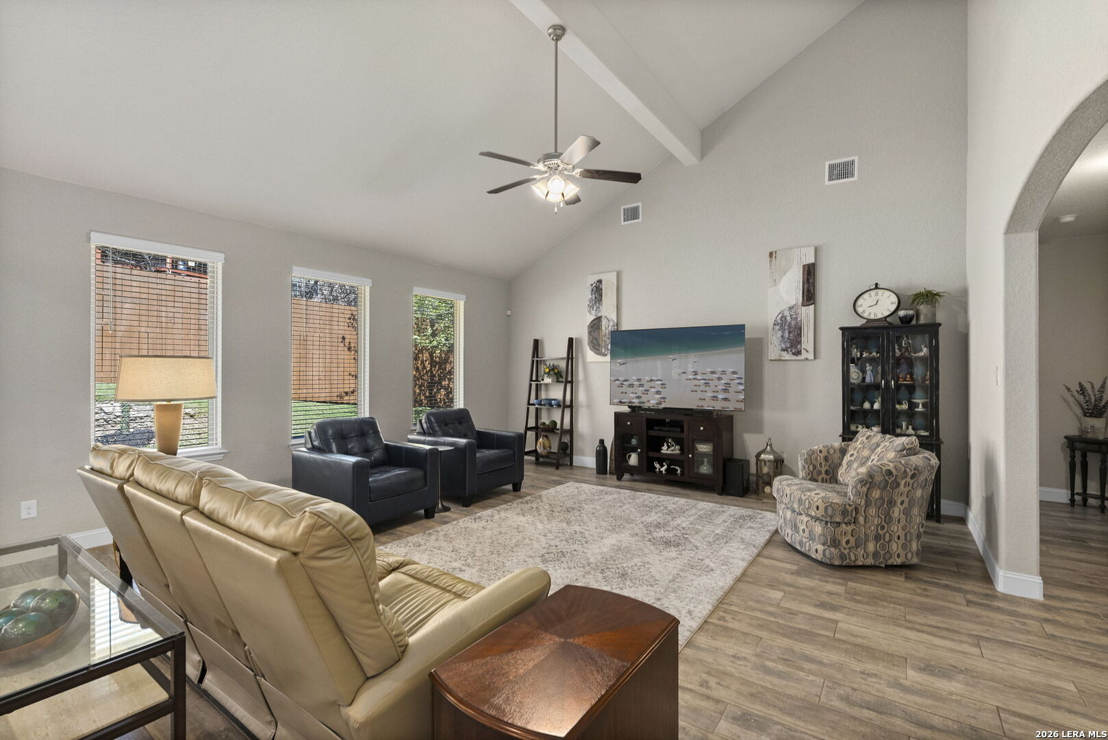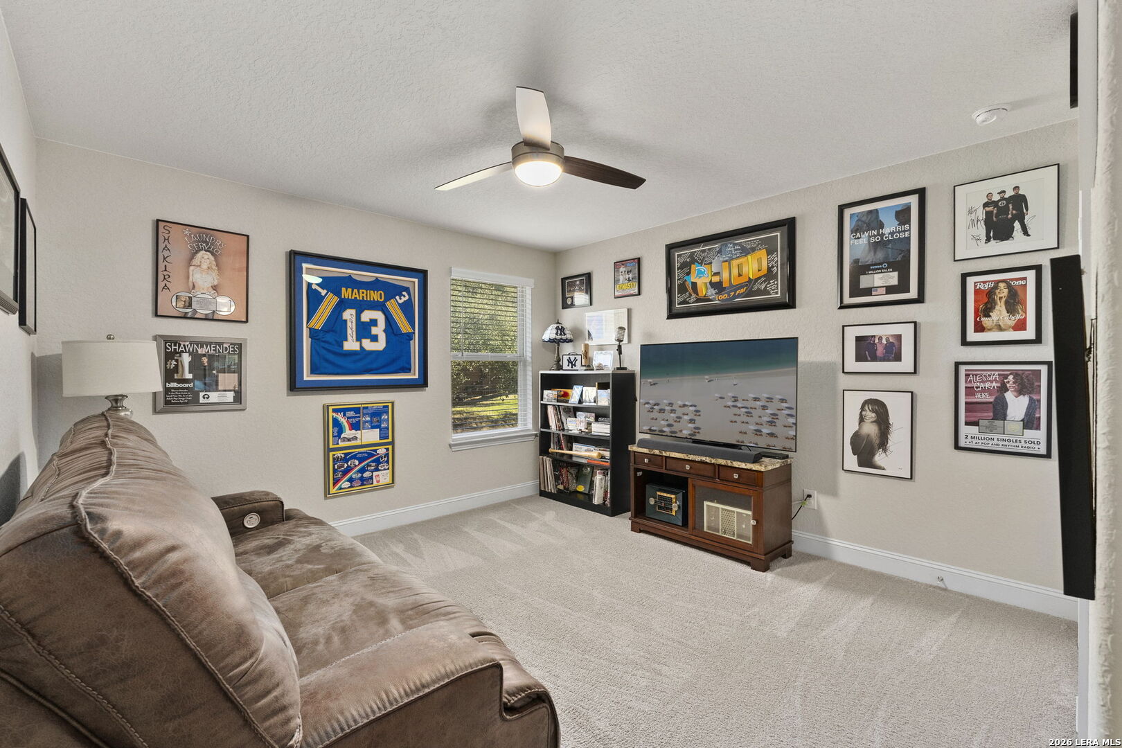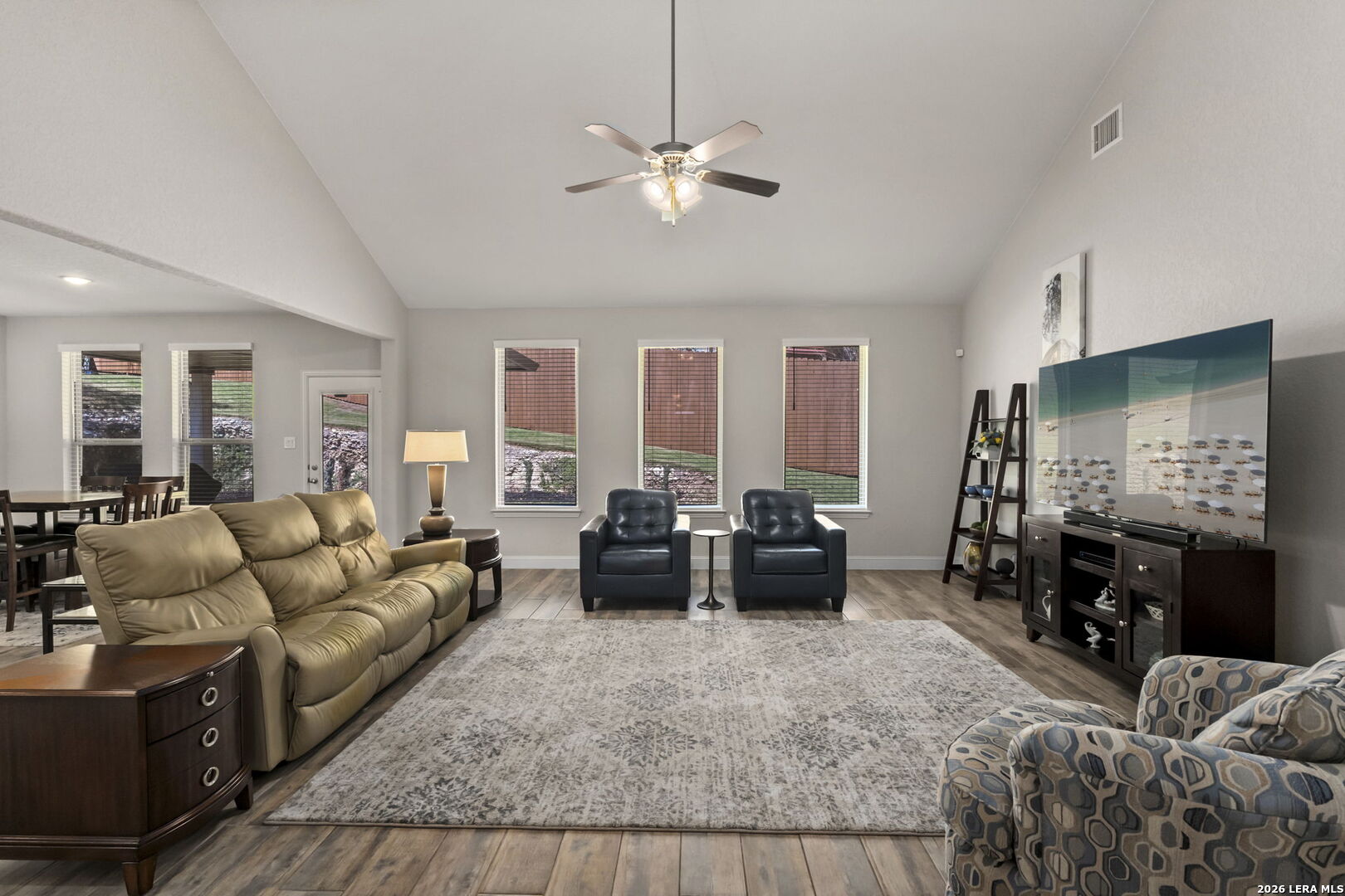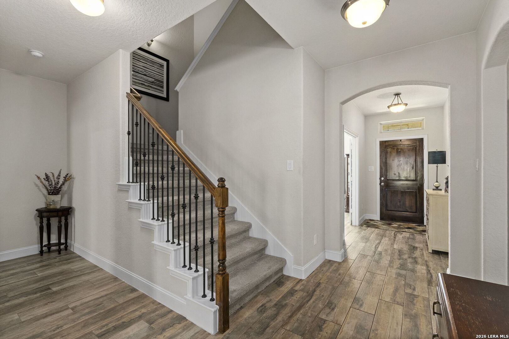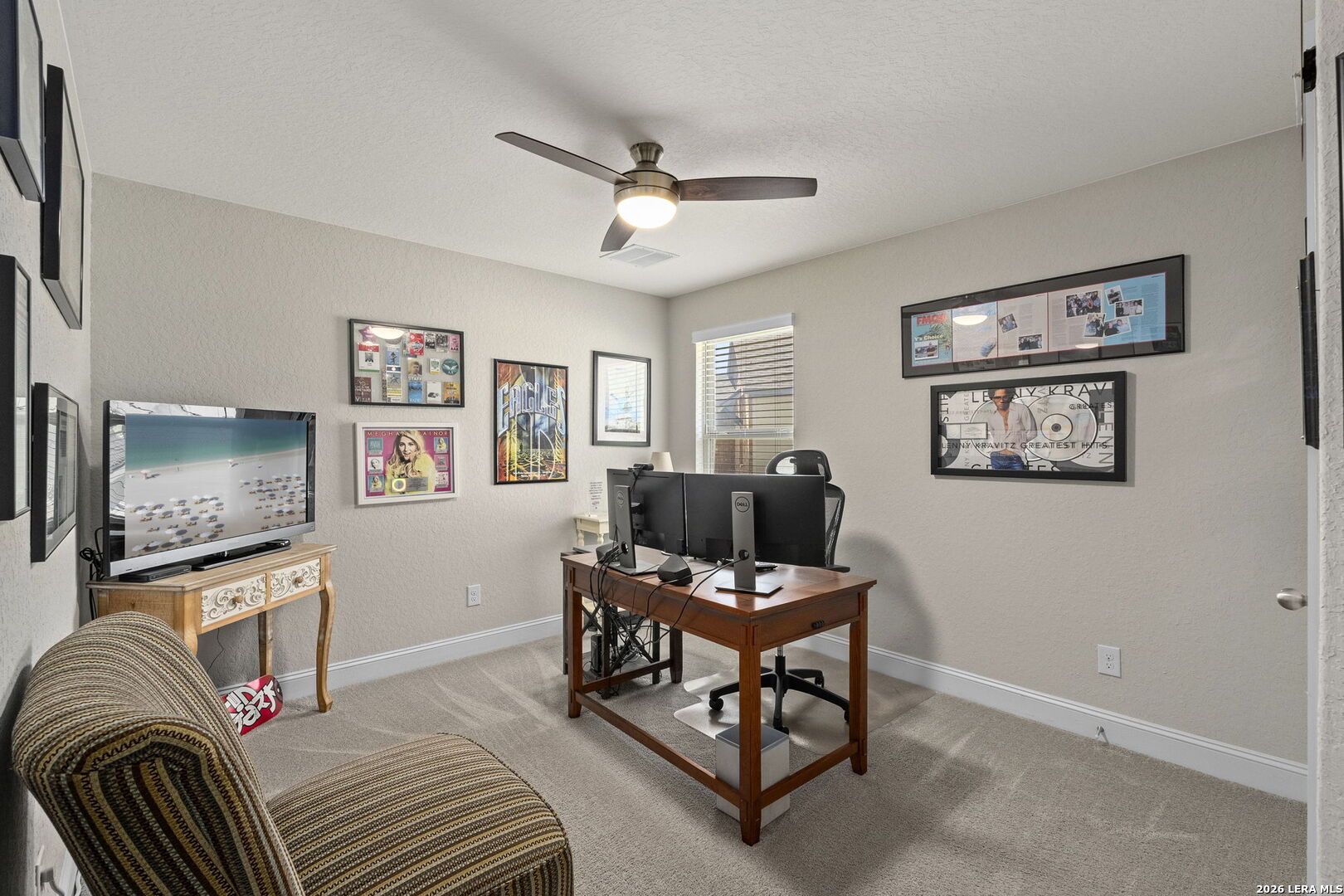 Hidden in the back of a quiet cul-de-sac with easy access to I-10, this sparkling two-story home offers the layout people are looking for with a distinctive Hill Country-style back yard setting. The location is a short drive to Boerne or San Antonio and near two HEBs, dining, and everyday conveniences. The home opens with a welcoming foyer providing access to a private office, then flows into the open concept living, dining and kitchen areas. The kitchen features an eat-in island with generous counter space connecting to the main living areas for socializing or relaxing. The main floor primary bedroom offers a spacious layout with an oversized dual-sided walk-in closet. The primary bathroom includes a long vanity with dual sinks plus plenty of drawer and cabinet space. Upstairs, a second living area offers flexible space for a media room, playroom or privacy to escape. The four bedrooms and two bathrooms upstairs are perfect for a family or visiting guests. Outdoor living is easy with a covered patio overlooking a distinctive large backyard landscape, featuring a natural ridge creating a true Hill Country feel. Move-in ready and meticulously maintained by the current owners, this home offers both comfort and convenience in a picturesque location.