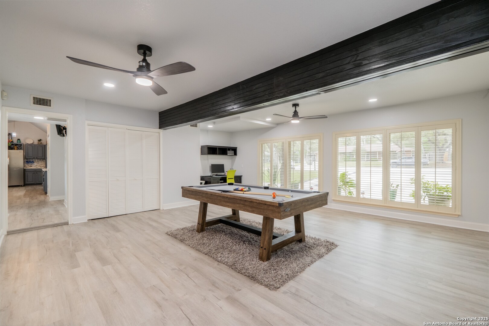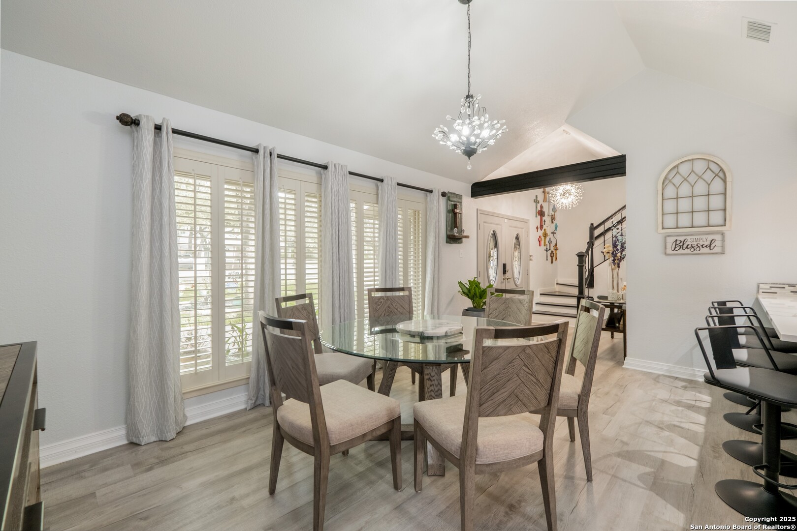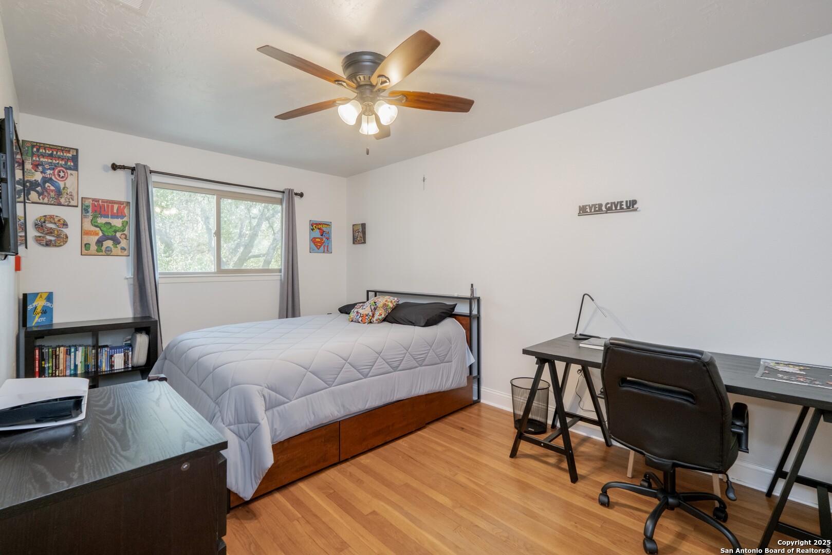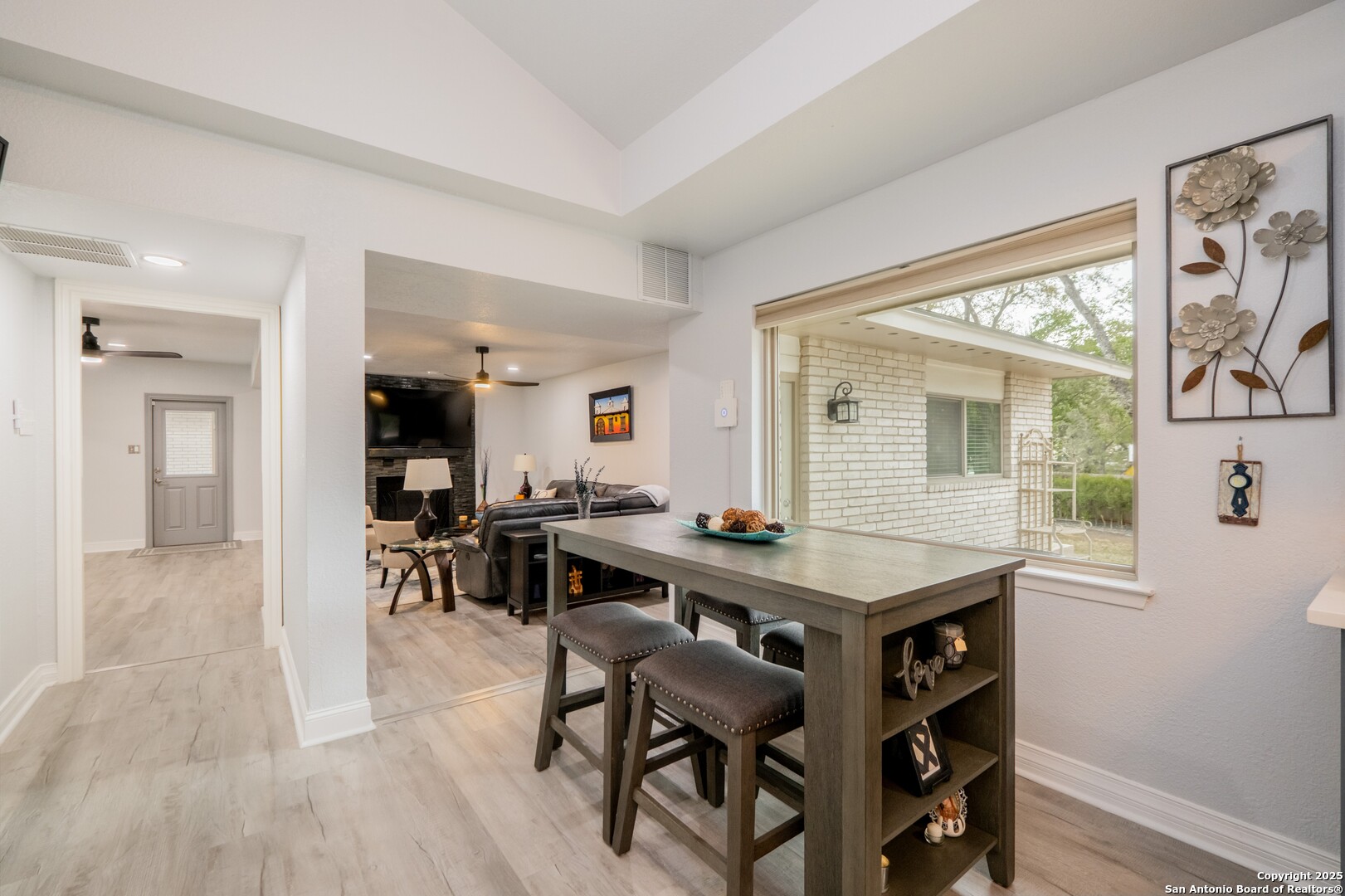 This beautifully updated two-story home is set on a generous 0.31-acre lot in the highly sought-after Castle Hills community. Offering 4 bedrooms and 2.5 baths, this residence blends classic character with thoughtful modern updates throughout. The kitchen has been refreshed with newly painted cabinets and hardware, a new quartz countertop, new sink, stylish backsplash, and an upscale 6-burner gas stove. Walls were opened to create a more open-concept flow between the kitchen and living spaces, perfect for everyday living and entertaining. The main level features luxury vinyl plank flooring, fresh interior paint, updated lighting throughout, and plantation shutters that add timeless charm. The spacious living area centers around an updated fireplace, while the converted garage now serves as a versatile game room or secondary living area. Both the dining room and game room feature beautiful beamed ceilings that enhance the home's warmth and character. The primary bedroom is conveniently located on the first floor, offering privacy and comfort. Upstairs retains its original wood flooring, maintaining a touch of the home's traditional appeal. Outside, the property showcases a beautiful and spacious backyard surrounded by a wooden fence, featuring mature trees, a flagstone patio for entertaining, and multiple seating areas for relaxation. A 10x10 plastic storage shed adds practicality, while the fence was recently replaced approximately 3 years ago. Additional highlights include a new HVAC system installed 6 months ago, plumbing for a water softener, and a 3-year-old roof. Nestled in one of San Antonio's most established neighborhoods, this home combines a prime location, spacious lot, and a wealth of recent upgrades.