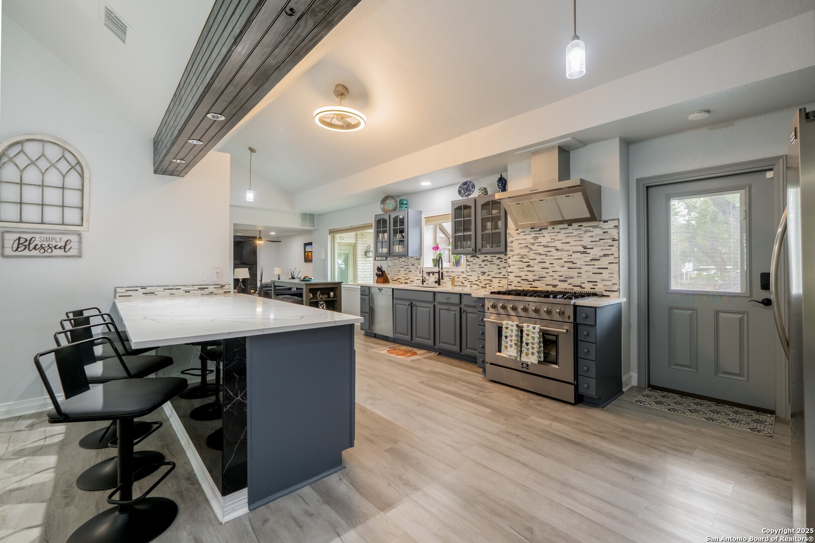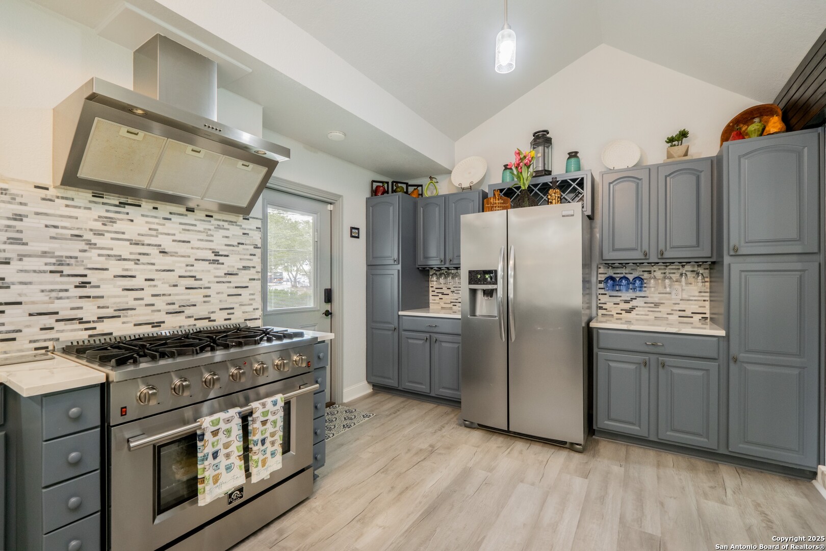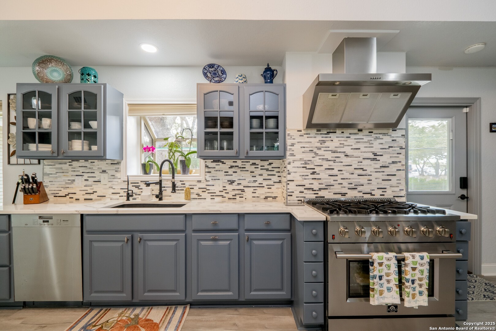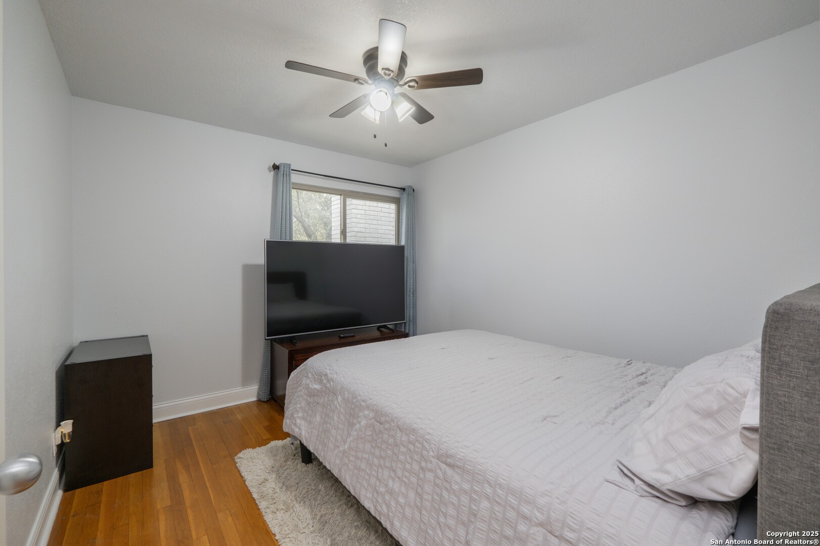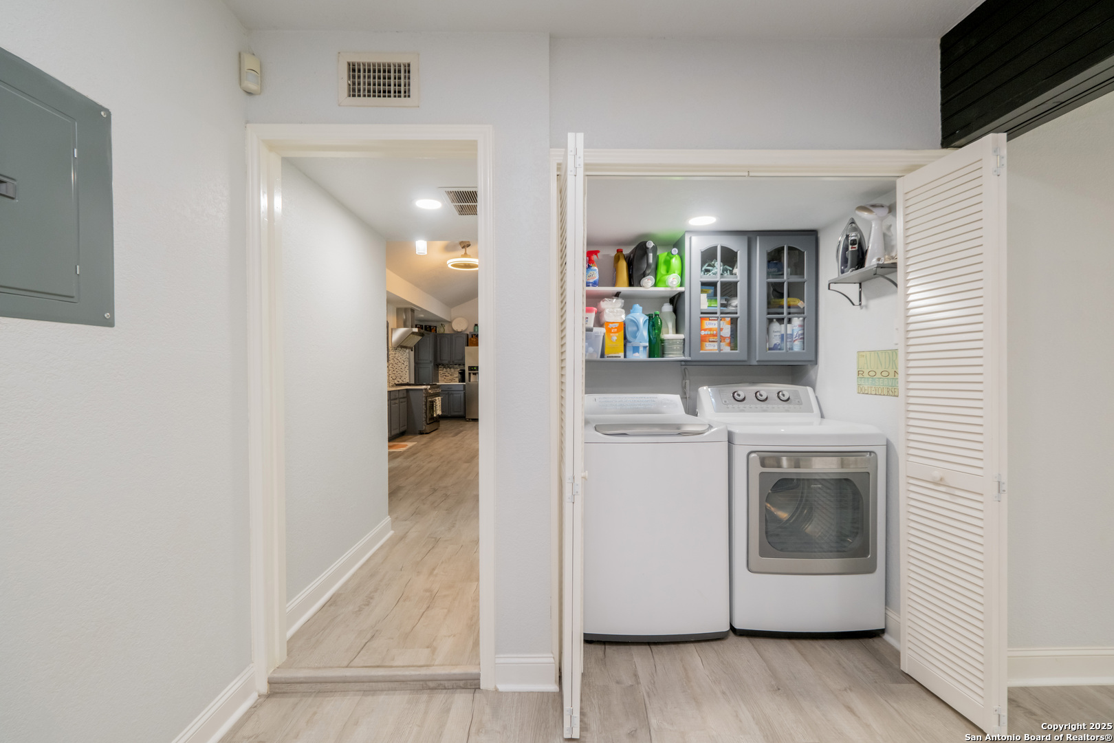 This beautifully updated two-story home is set on a generous 0.31-acre lot in the highly sought-after Castle Hills community. Offering 4 bedrooms and 2.5 baths, this residence blends classic character with thoughtful modern updates throughout. The kitchen has been refreshed with newly painted cabinets and hardware, a new quartz countertop, new sink, stylish backsplash, and an upscale 6-burner gas stove. Walls were opened to create a more open-concept flow between the kitchen and living spaces, perfect for everyday living and entertaining. The main level features luxury vinyl plank flooring, fresh interior paint, updated lighting throughout, and plantation shutters that add timeless charm. The spacious living area centers around an updated fireplace, while the converted garage now serves as a versatile game room or secondary living area. Both the dining room and game room feature beautiful beamed ceilings that enhance the home's warmth and character. The primary bedroom is conveniently located on the first floor, offering privacy and comfort. Upstairs retains its original wood flooring, maintaining a touch of the home's traditional appeal. Outside, the property showcases a beautiful and spacious backyard surrounded by a wooden fence, featuring mature trees, a flagstone patio for entertaining, and multiple seating areas for relaxation. A 10x10 plastic storage shed adds practicality, while the fence was recently replaced approximately 3 years ago. Additional highlights include a new HVAC system installed 6 months ago, plumbing for a water softener, and a 3-year-old roof. Nestled in one of San Antonio's most established neighborhoods, this home combines a prime location, spacious lot, and a wealth of recent upgrades.
