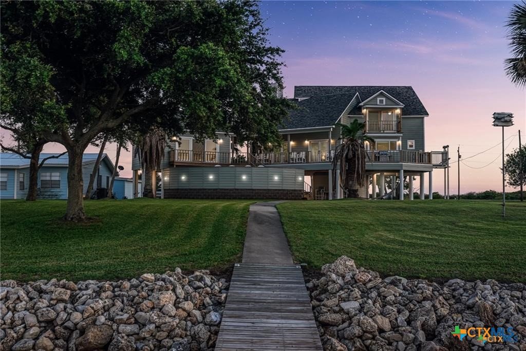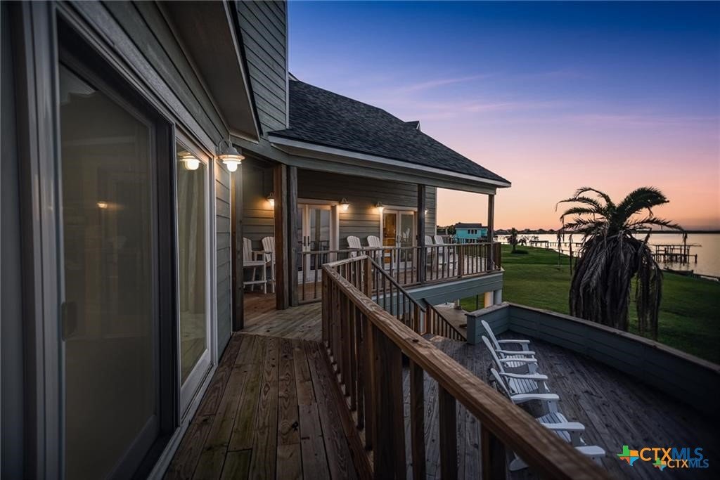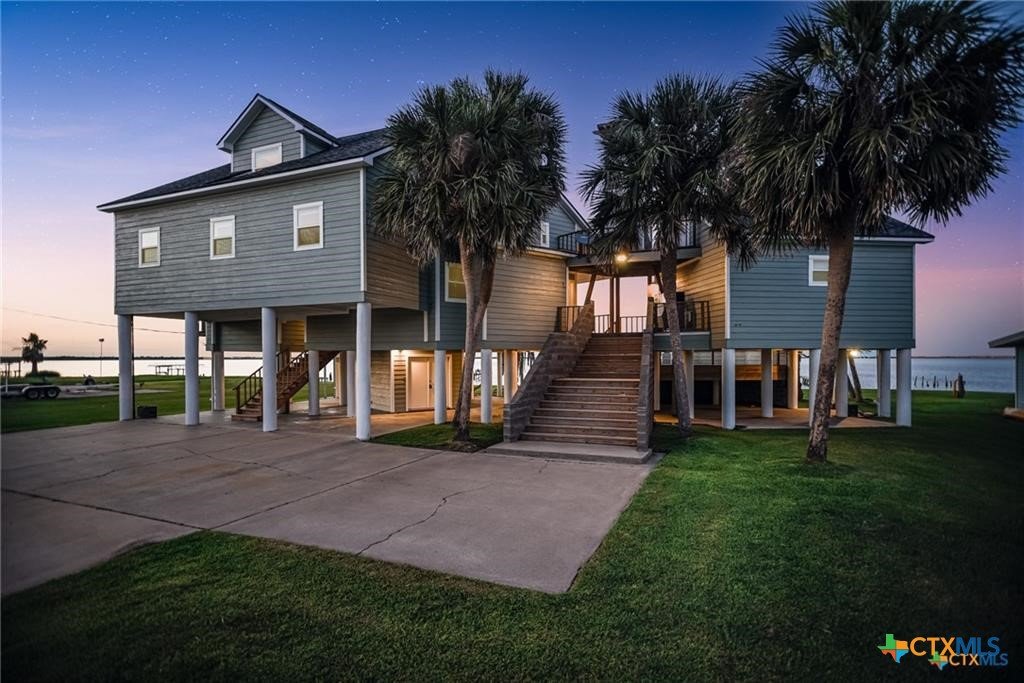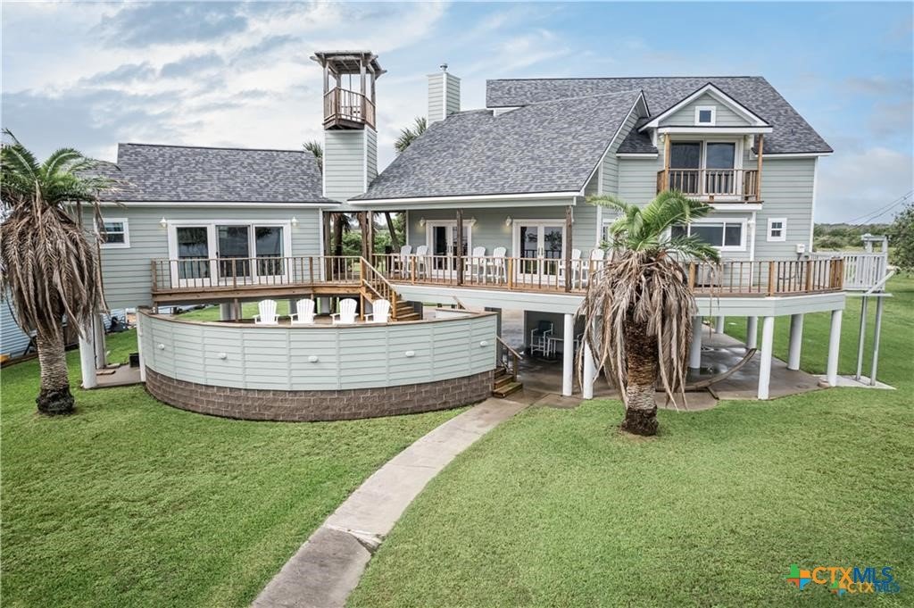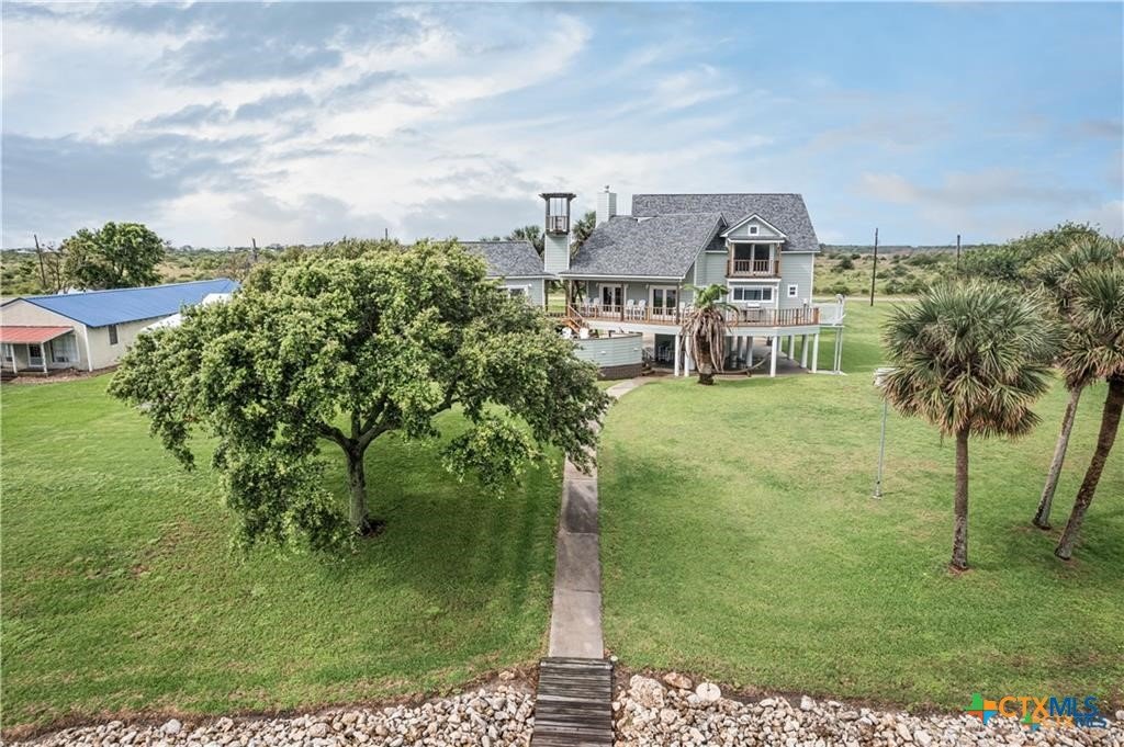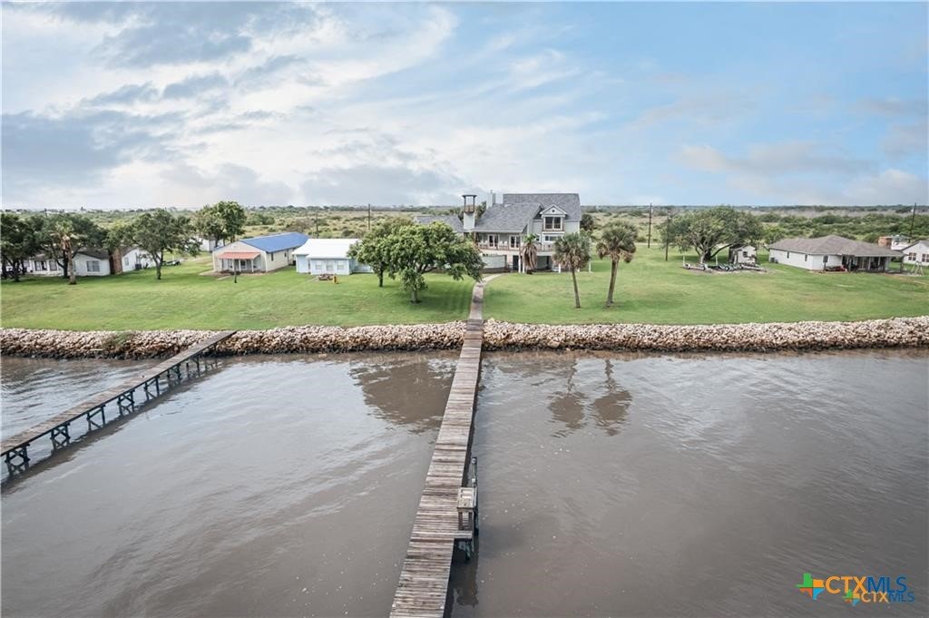 Waterfront luxury awaits in this exceptional bayfront retreat offering breathtaking panoramic sunrise and sunset views. If fishing and entertainment is your vibe, this property is your vessel. This spacious home features 4 bedrooms, 4 bathrooms, and 2 loft/flex spaces, thoughtfully designed for comfort, entertaining, and coastal living. The open-concept main level is filled with natural light and showcases stunning water views from the living, dining, and kitchen areas. A wood-burning tiled fireplace with rustic mantle creates a warm gathering space, while the kitchen offers abundant cabinetry and generous counterspace. Enjoy elevated views from the captain’s nook, where dolphins are frequently spotted. Upstairs, the home provides multiple private suites, including a primary retreat with double vanity, walk-in shower, spacious closet, and covered balcony overlooking the bay. A separate guest suite across the covered deck offers a king bed, sitting area, and private bath—ideal for visitors or rental flexibility. Additional bunk accommodations allow the home to comfortably sleep up to 16. Below the home is ample covered parking and storage, plus an additional shed and mature trees on a level lot. Located on a quiet dead-end road with neighboring ranch land across the street, this property offers a peaceful and secluded escape. Recent updates include fishing pier, roof, siding, and hurricane-rated doors and windows. Additional boat house with 4 slips can be included at the nearby marina for an additional cost of $25k per slip. An excellent personal getaway and strong income-producing opportunity. schedule your private tour today.