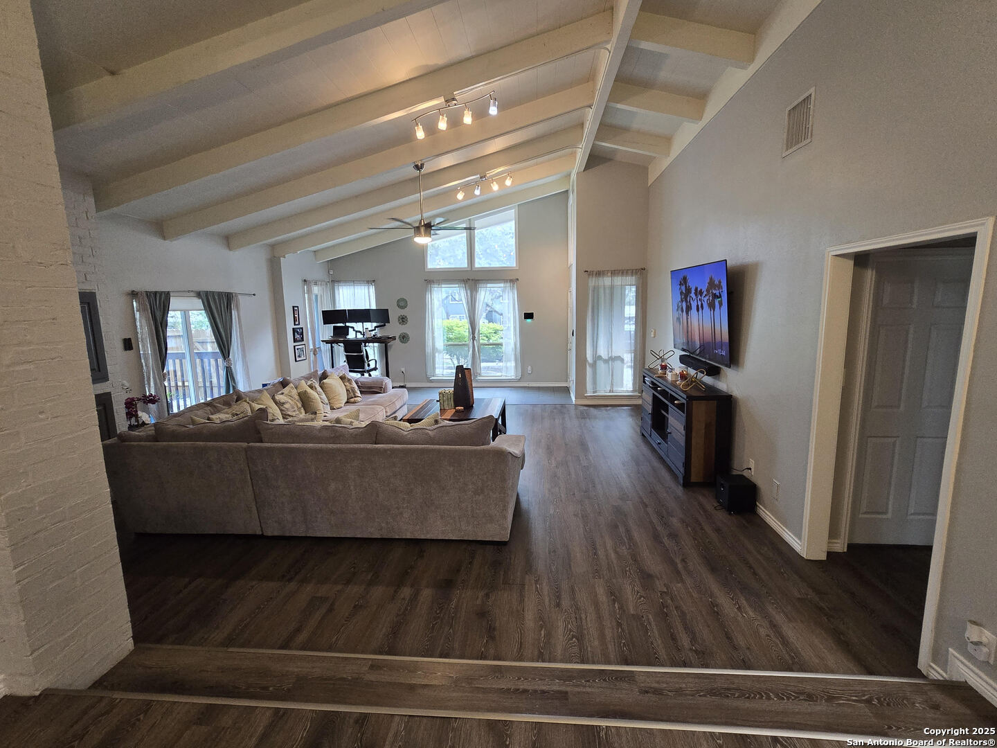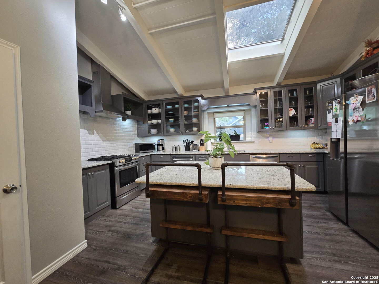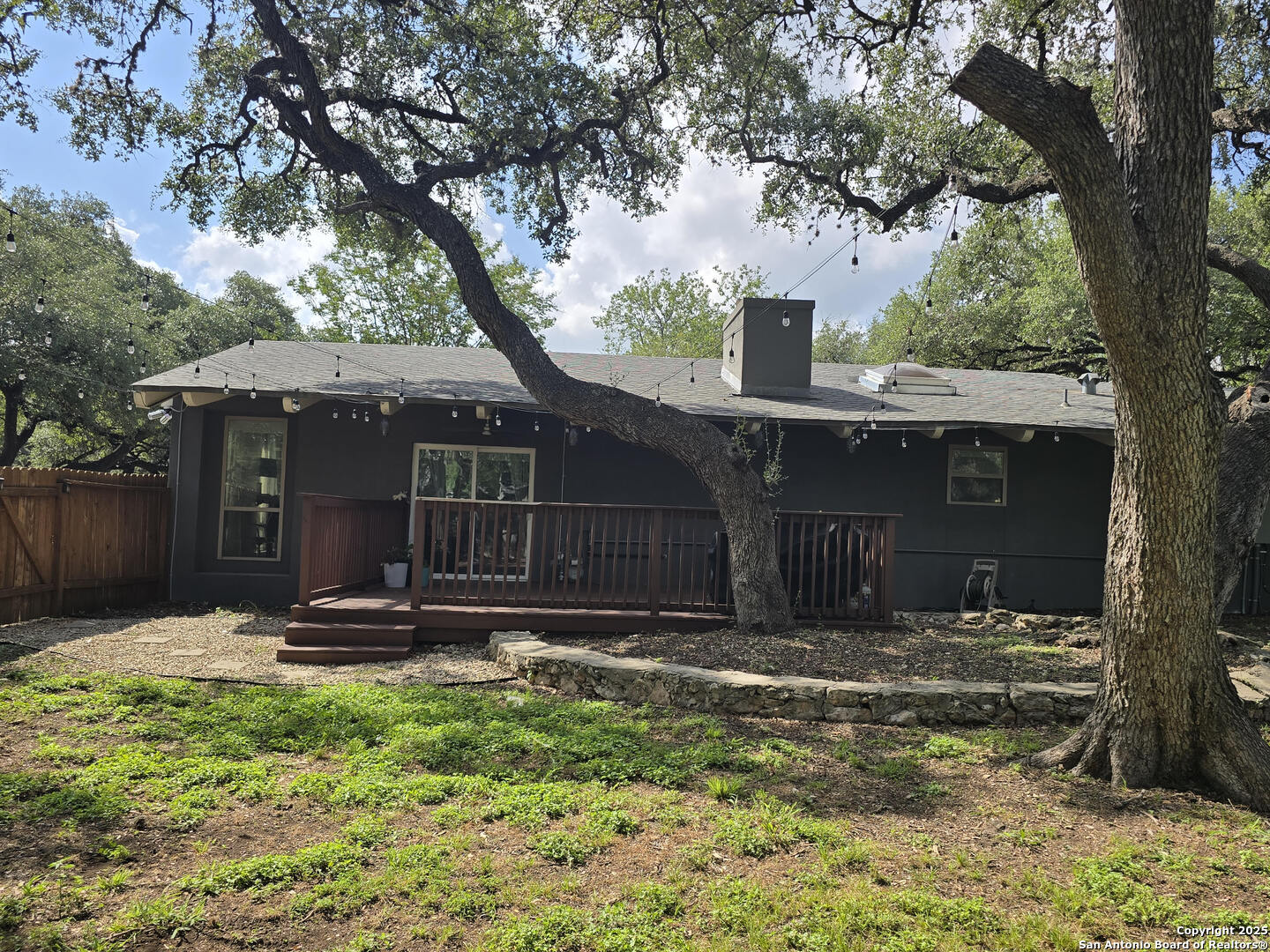 MID-CENTURY MODERN MASTERPIECE ON NEARLY AN ACRE JUST STEPS FROM ALAMO HEIGHTS, 410, DOWNTOWN! ASSUME A 2.25 pct VA NOTE!!! Open floor plan with soaring vaulted 13-foot ceilings -- a space flooded with natural light! This is a kitchen to relish whether cooking or hanging out -- with gas cooktop/oven, loads of granite counter and cabinet space, glass front cabinets, a skylight above the island and window over the sink, overlooking the backyard with its canopy of mature oaks! Split level style gives this home a ton of character. Coffee/wine bar off the dining area; Two bedrooms with en suite baths, the split master suite with resort style bathroom and unsurpassed shower space as well as soaker tub fit for the movies. Almost an acre to roam with a detach garage and storage space. The private yard with deck shaded by charming, mature trimmed oaks; minutes from Fort Sam, SAMMC, downtown and most of the conveniences of central San Antonio.