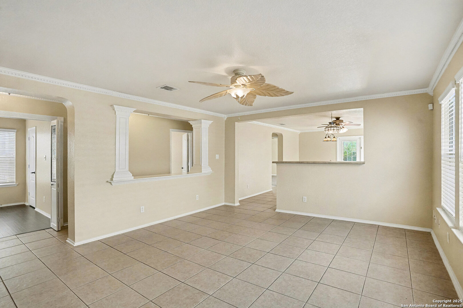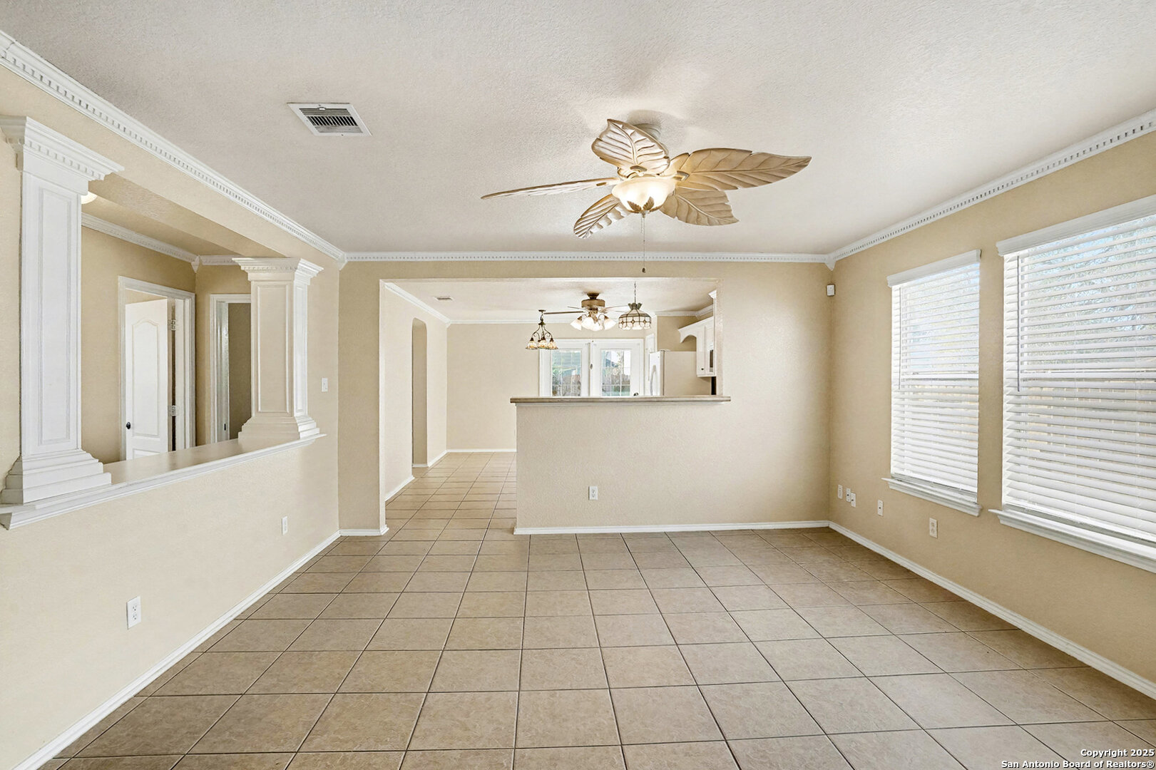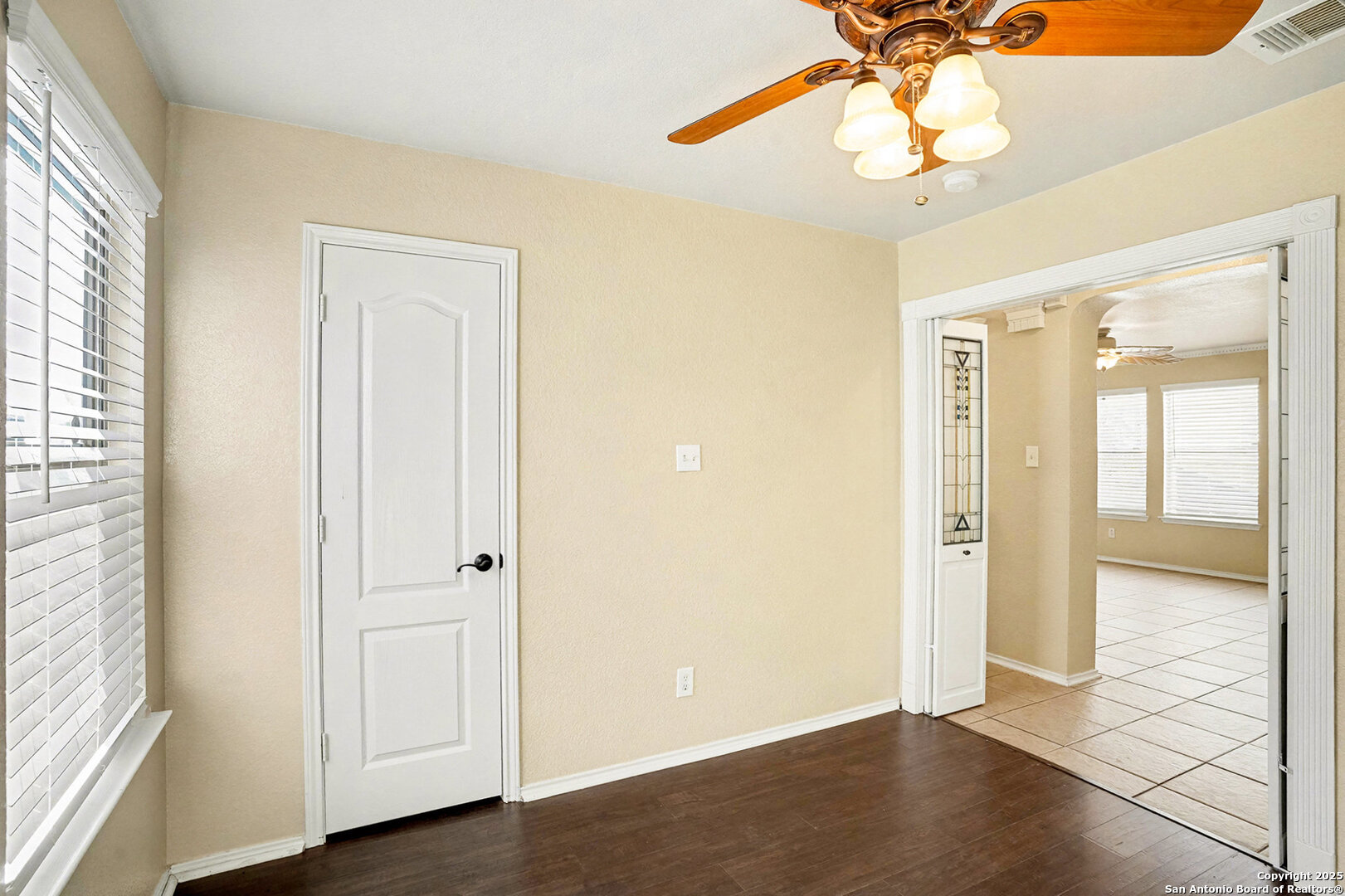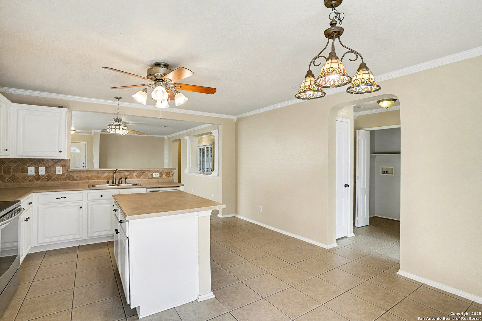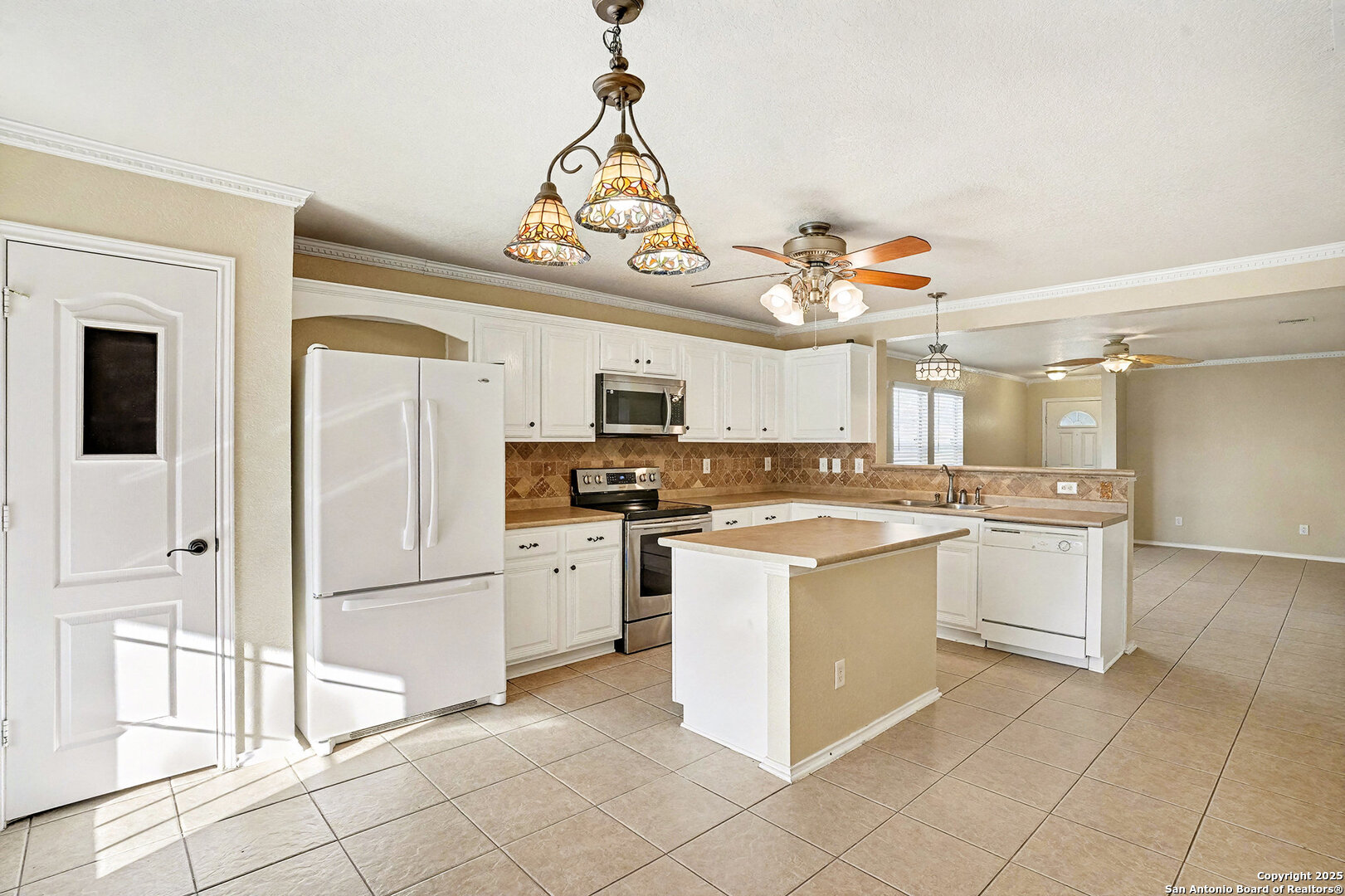 Discover this inviting one-story home in the Fields of Dover subdivision, offering a comfortable blend of modern features and thoughtful design. With four generous bedrooms and two well-appointed bathrooms, the layout provides both flexibility and ease, making it an excellent choice for those seeking convenience in a peaceful setting. The open floor plan allows natural light to flow throughout the main living areas, enhancing the sense of warmth and connection from room to room. The new luxury vinyl plank flooring provides a streamlined feel throughout. The heart of the home sits a beautifully designed gourmet kitchen, complete with striking 42-inch cabinets, an attractive tile backsplash, and all essential appliances already in place. A water softener adds extra comfort to daily living, while the kitchen's layout makes both everyday meals and special gatherings effortless. The primary suite offers a private retreat, featuring a walk-in shower, an extended countertop with plenty of space for all of your essentials, and generous storage to keep them organized. Each secondary bedroom is well sized, providing versatility for guests, office space, or hobbies. Outside, the low-maintenance zero-scape front yard ensures curb appeal without the upkeep, and an additional storage shed offers extra room for tools, equipment, or outdoor projects. Nestled within the Fields of Dover community, this home is ideally located near major highways, convenient to NISD schools, close to shopping and entertainment, and just ten minutes from Randolph AFB. This rare find combines comfort, style, and exceptional accessibility in one appealing package.
