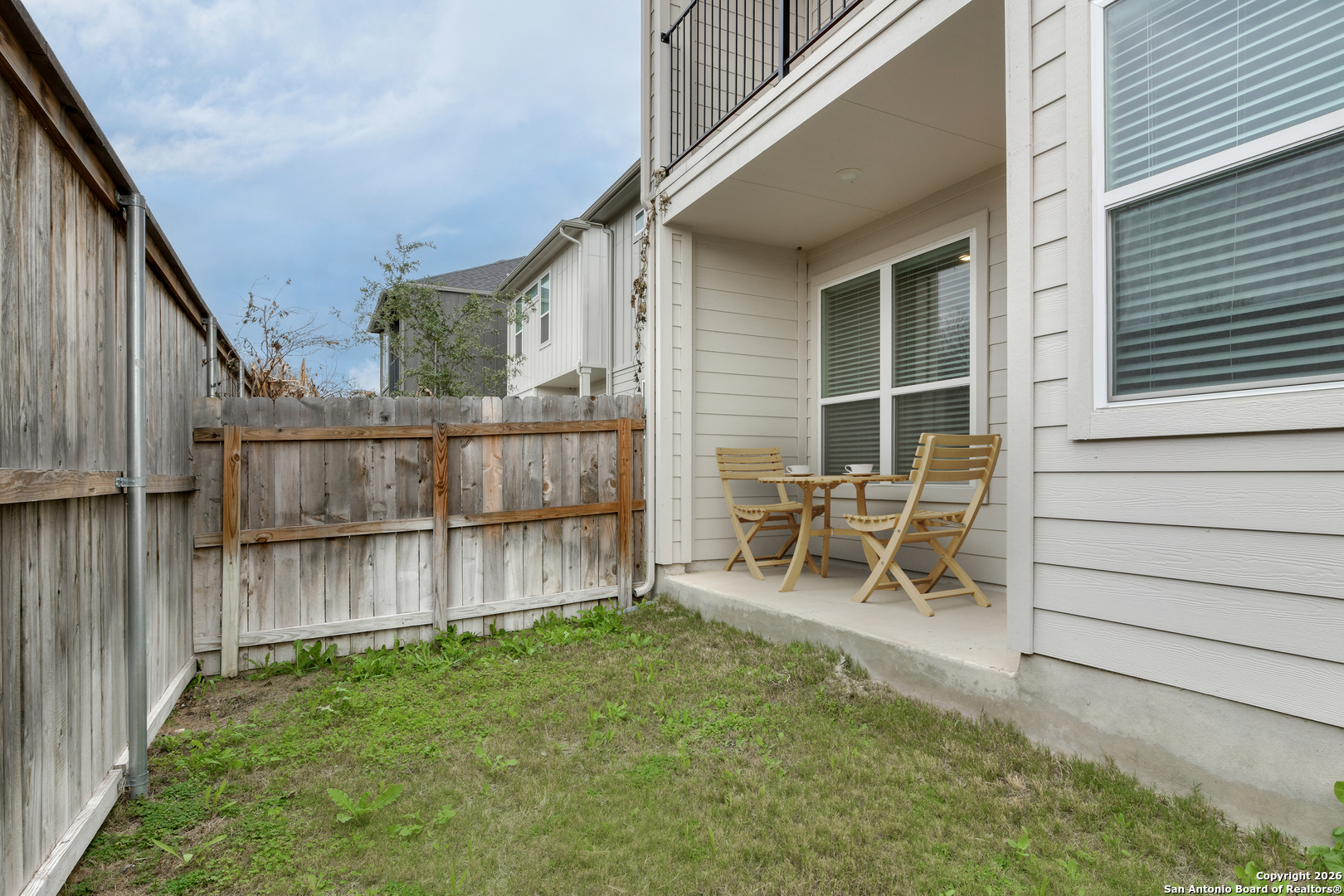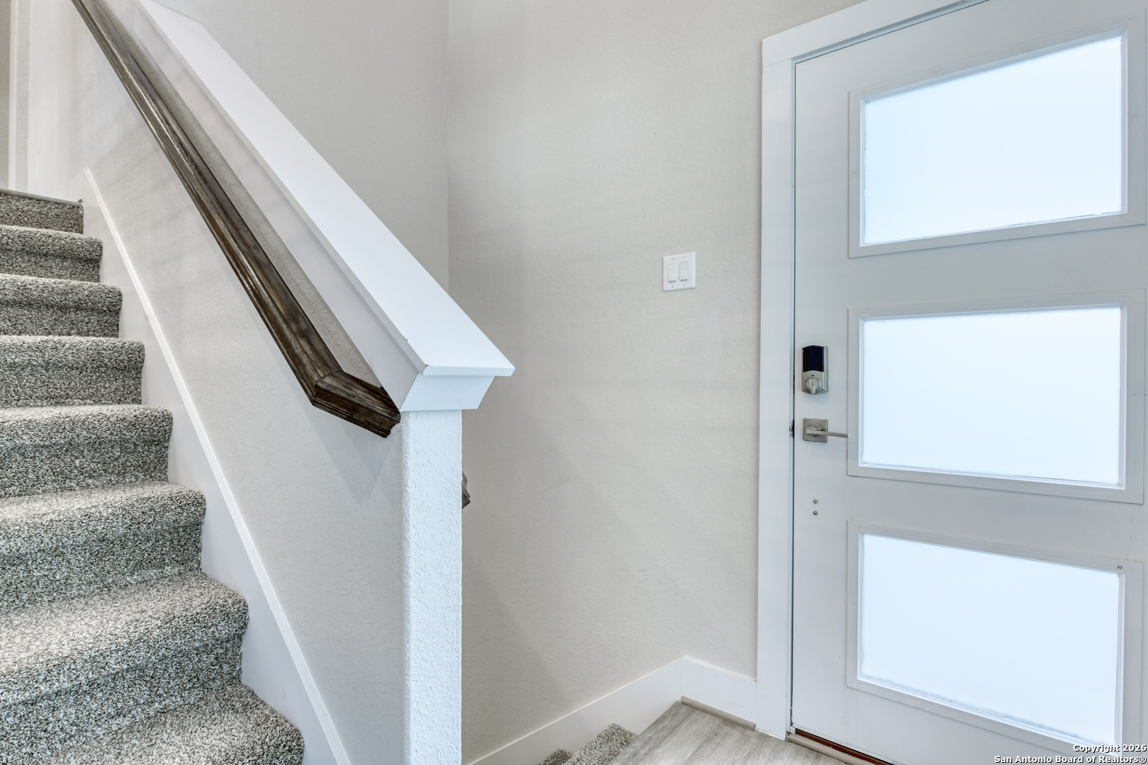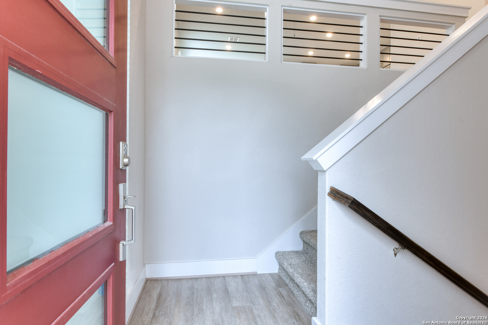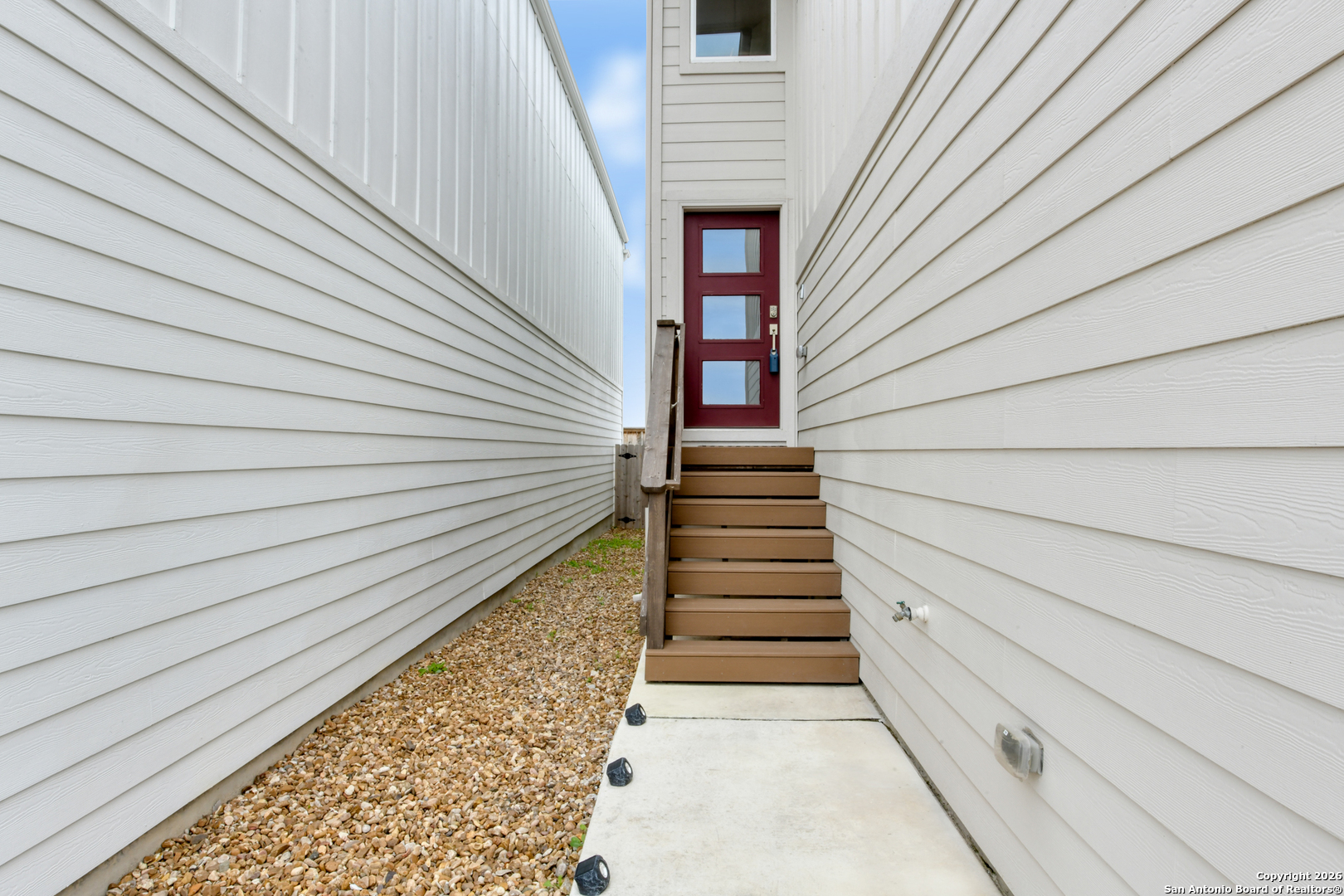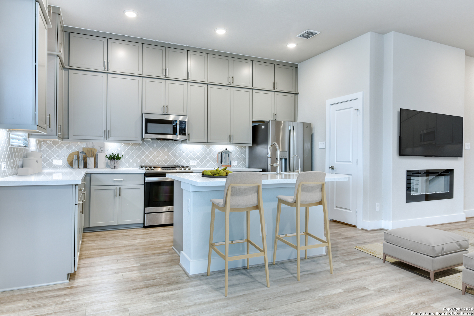 Experience effortless living in this stunning split-level home, perfectly situated on a zero-lot line in a gated community backing to a serene greenbelt. New Park/greenway going in as well next to neighborhood. Tucked away at the back of the neighborhood for added privacy and minimal traffic, this modern home features clean architectural lines, an open floor plan, and an abundance of natural light from transom windows and recessed lighting throughout the main living areas. The spacious island kitchen is a chef's dream, offering floor-to-ceiling cabinetry, stainless steel appliances-including a built-in microwave and gas range-and ample prep space. The inviting living room, complete with a sleek built-in electric fireplace and ceiling fan, flows seamlessly into the dining area, making it perfect for entertaining. This design offers an abundance of storage and vinyl wood plank flooring in the living areas of main floor. The main-level primary suite is a peaceful retreat, featuring a wall of windows, a ceiling fan, and a luxurious ensuite bath with a dual vanity, step-in shower, and a generous walk-in closet. A conveniently located laundry room and half bath add to the home's thoughtful design. Downstairs, a second living area provides outdoor access, along with two secondary bedrooms and a full bathroom. Located just minutes from the Medical Center and IH-10, this home offers the perfect blend of style, comfort, and convenience in a low-maintenance setting. Don't miss the opportunity to make it yours! Please be aware some photos have been virtually staged.