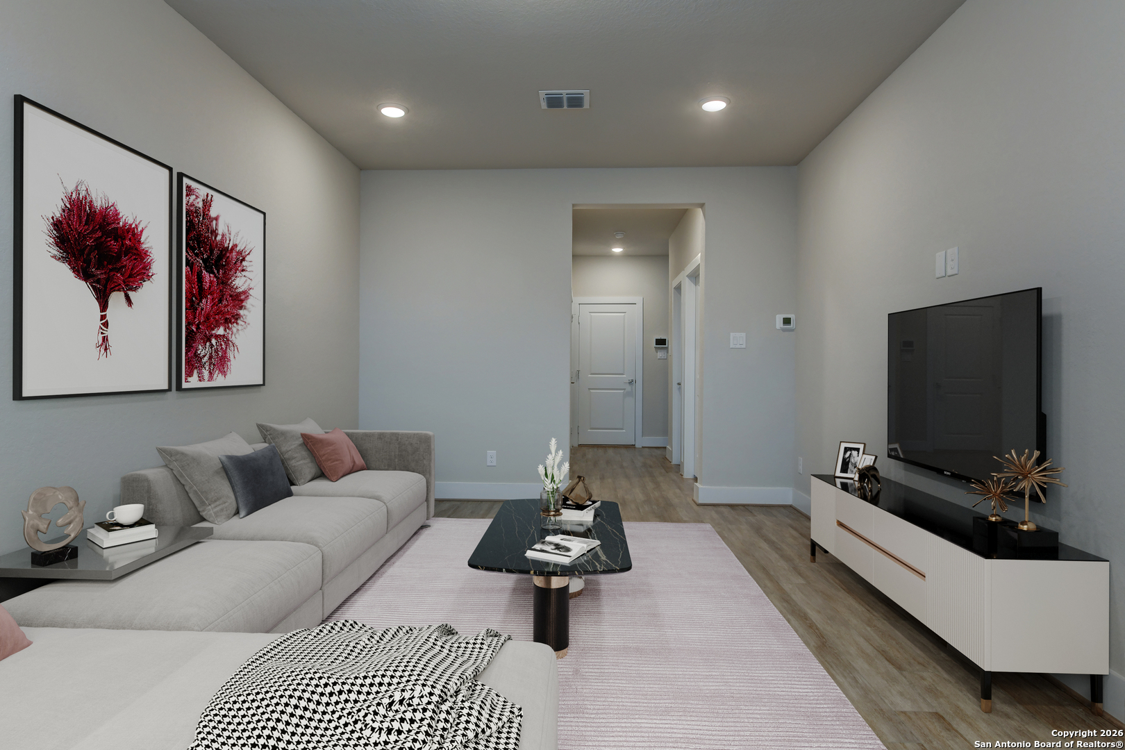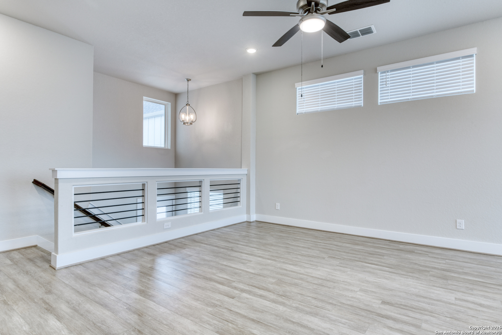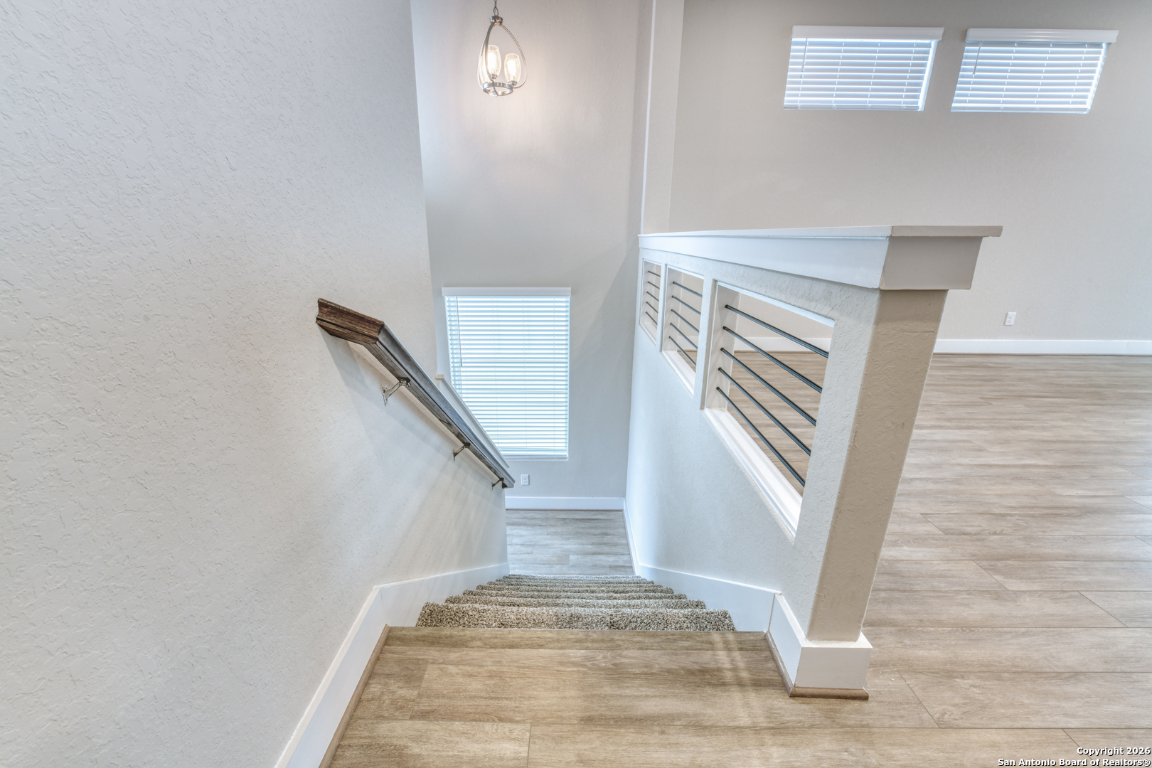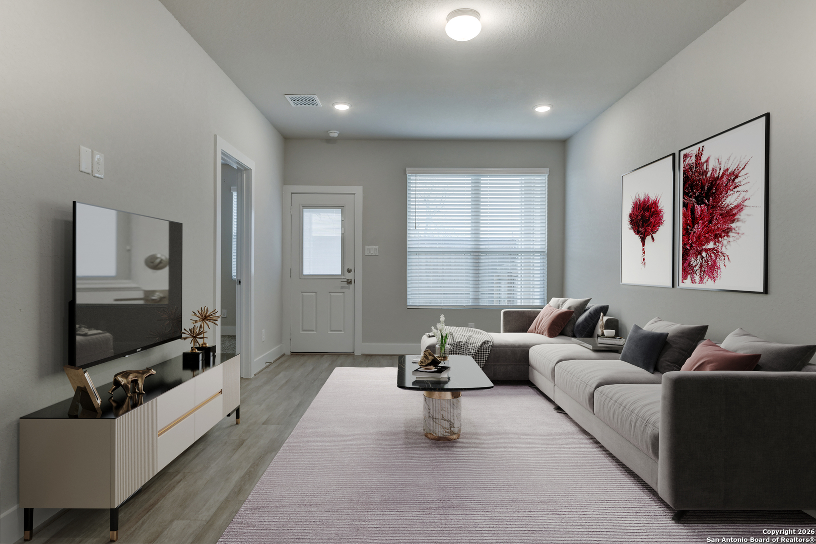 Experience effortless living in this stunning split-level home, perfectly situated on a zero-lot line in a gated community backing to a serene greenbelt. New Park/greenway going in as well next to neighborhood. Tucked away at the back of the neighborhood for added privacy and minimal traffic, this modern home features clean architectural lines, an open floor plan, and an abundance of natural light from transom windows and recessed lighting throughout the main living areas. The spacious island kitchen is a chef's dream, offering floor-to-ceiling cabinetry, stainless steel appliances-including a built-in microwave and gas range-and ample prep space. The inviting living room, complete with a sleek built-in electric fireplace and ceiling fan, flows seamlessly into the dining area, making it perfect for entertaining. This design offers an abundance of storage and vinyl wood plank flooring in the living areas of main floor. The main-level primary suite is a peaceful retreat, featuring a wall of windows, a ceiling fan, and a luxurious ensuite bath with a dual vanity, step-in shower, and a generous walk-in closet. A conveniently located laundry room and half bath add to the home's thoughtful design. Downstairs, a second living area provides outdoor access, along with two secondary bedrooms and a full bathroom. Located just minutes from the Medical Center and IH-10, this home offers the perfect blend of style, comfort, and convenience in a low-maintenance setting. Don't miss the opportunity to make it yours! Please be aware some photos have been virtually staged.