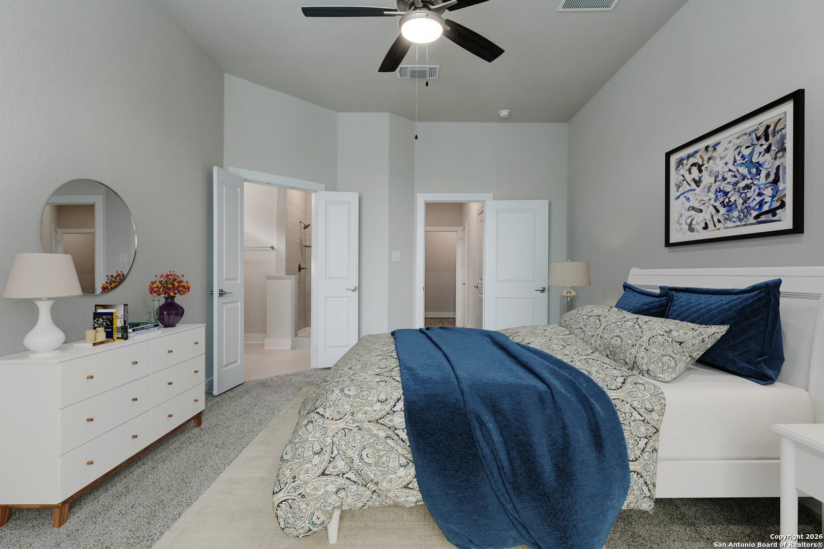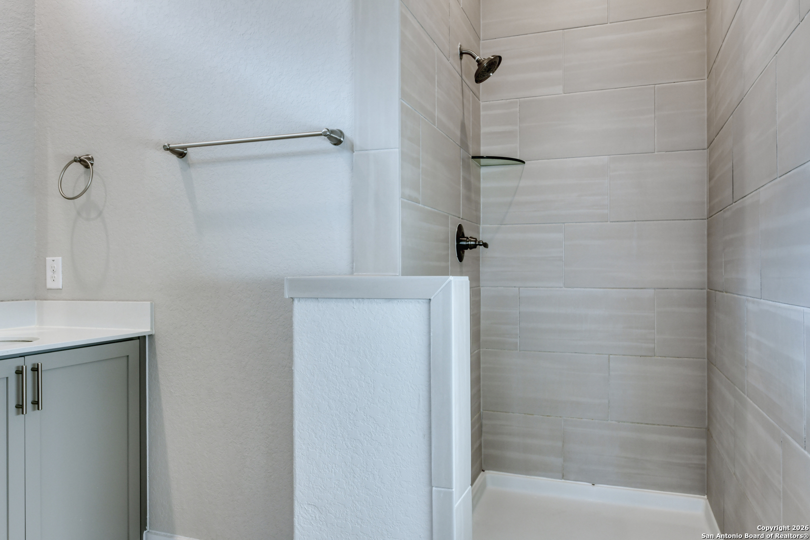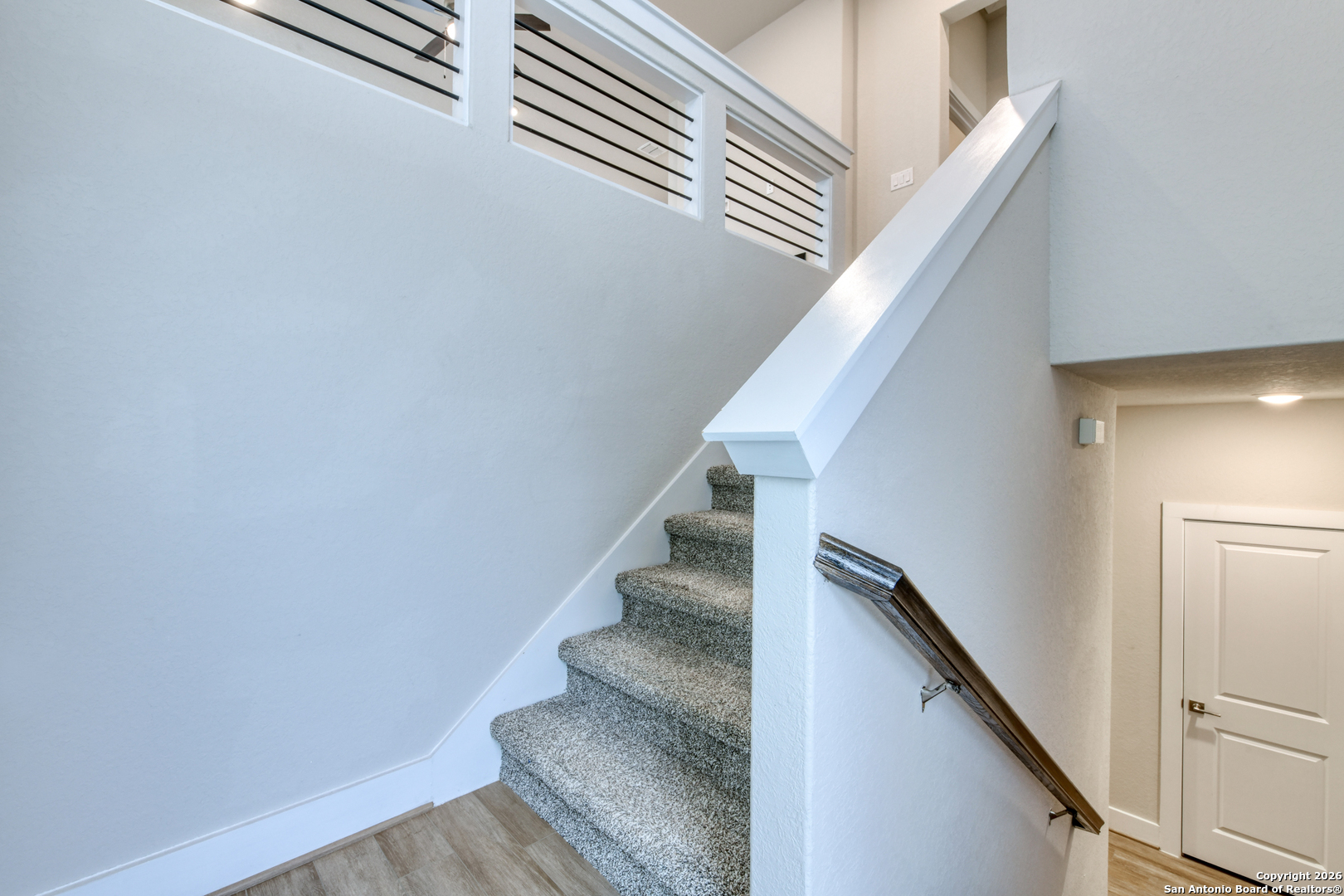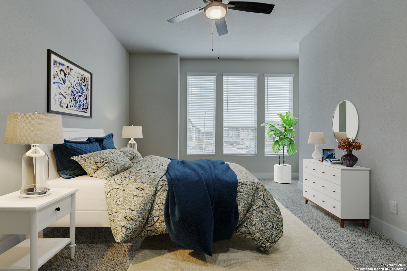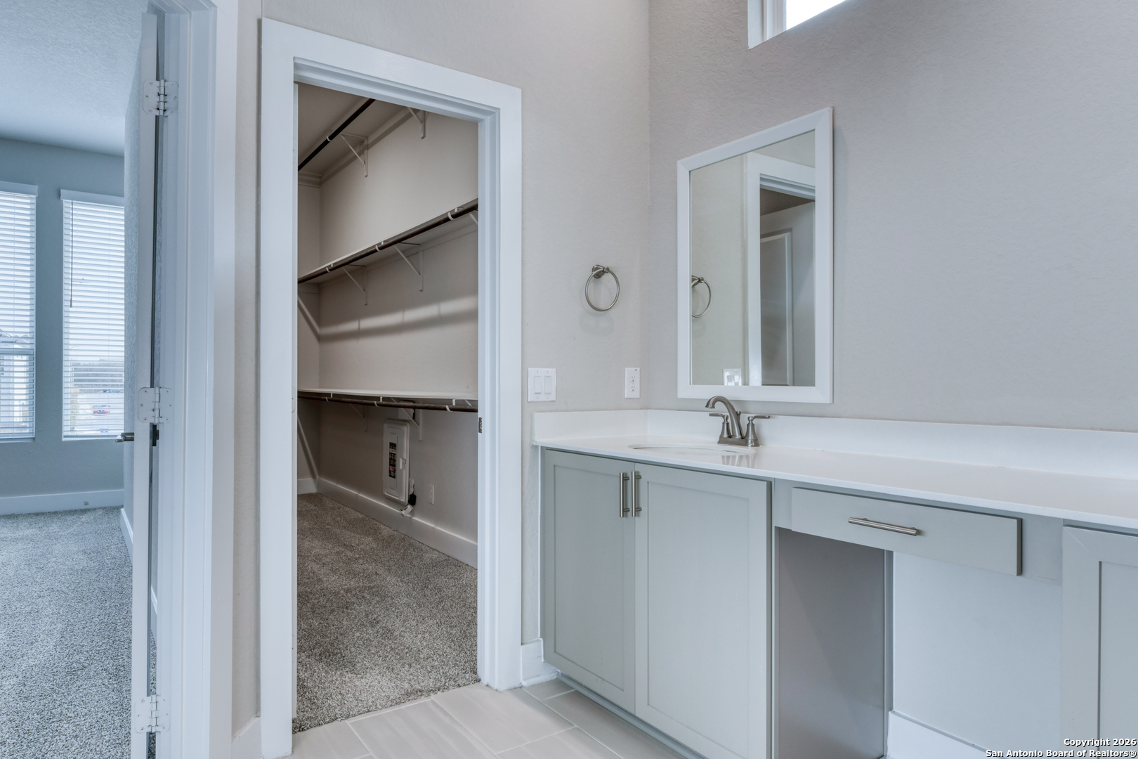 Experience effortless living in this stunning split-level home, perfectly situated on a zero-lot line in a gated community backing to a serene greenbelt. New Park/greenway going in as well next to neighborhood. Tucked away at the back of the neighborhood for added privacy and minimal traffic, this modern home features clean architectural lines, an open floor plan, and an abundance of natural light from transom windows and recessed lighting throughout the main living areas. The spacious island kitchen is a chef's dream, offering floor-to-ceiling cabinetry, stainless steel appliances-including a built-in microwave and gas range-and ample prep space. The inviting living room, complete with a sleek built-in electric fireplace and ceiling fan, flows seamlessly into the dining area, making it perfect for entertaining. This design offers an abundance of storage and vinyl wood plank flooring in the living areas of main floor. The main-level primary suite is a peaceful retreat, featuring a wall of windows, a ceiling fan, and a luxurious ensuite bath with a dual vanity, step-in shower, and a generous walk-in closet. A conveniently located laundry room and half bath add to the home's thoughtful design. Downstairs, a second living area provides outdoor access, along with two secondary bedrooms and a full bathroom. Located just minutes from the Medical Center and IH-10, this home offers the perfect blend of style, comfort, and convenience in a low-maintenance setting. Don't miss the opportunity to make it yours! Please be aware some photos have been virtually staged.
