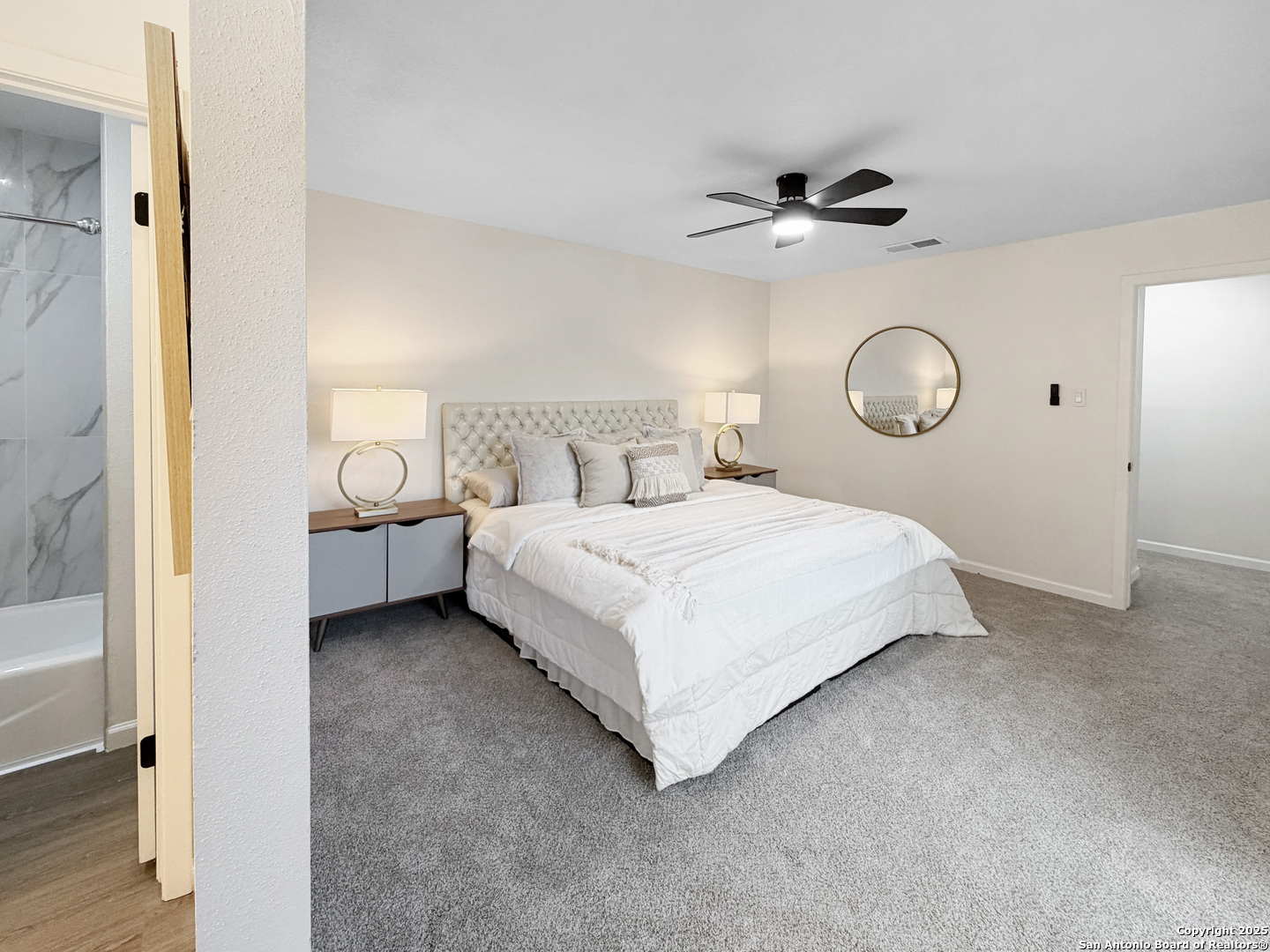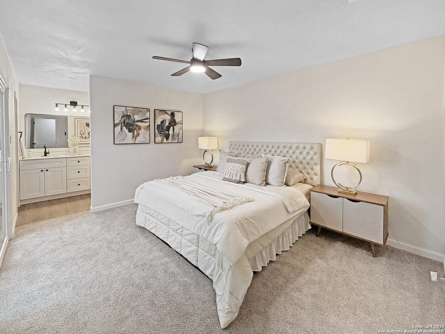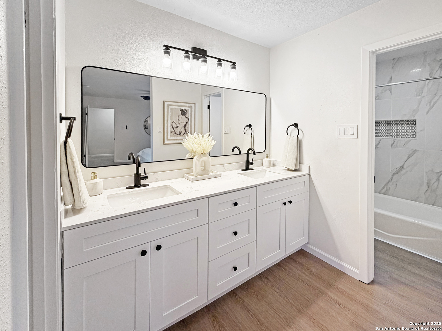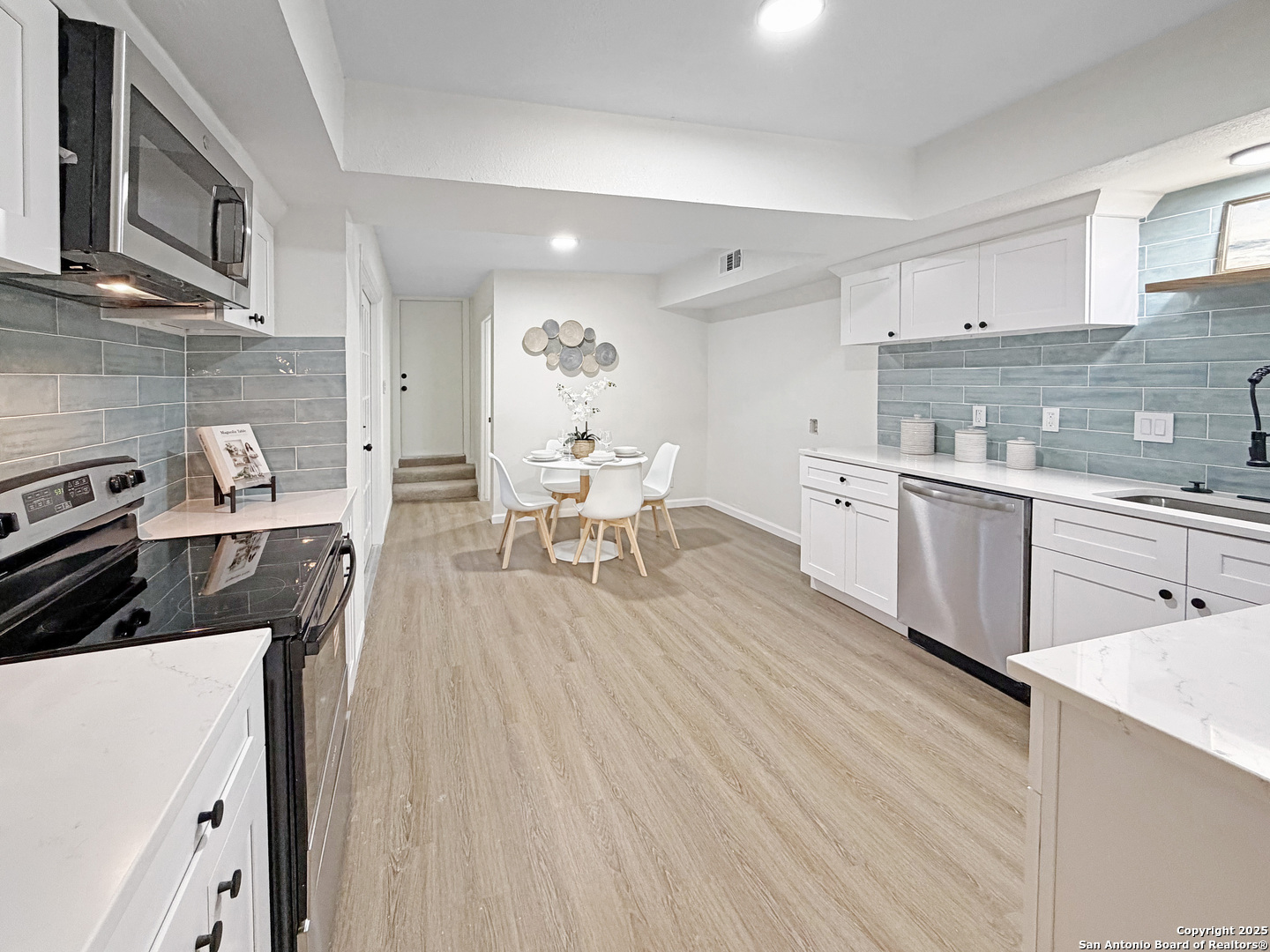 Capture the appeal of modern living in this beautifully renovated three bedroom two and a half bathroom home, a spacious 1883 square feet residence boasting immediate move-in readiness with a two car garage. This opportunity at 8938 Willmon Way provides premium features including all new luxury vinyl plank floors, sleek quartz countertops, and a full suite of new stainless steel appliances. Enjoy bright, airy rooms featuring large windows, a cozy living room fireplace, and ultimate relaxation with a second story patio area accessible from one of the home's two open porches. The primary bedroom and a secondary bedroom both feature elegant French doors, alongside new double sink vanities, tiled bathrooms to ceilings, and modern ceiling fans in every space, all maintained by central cooling and heating. This desirable Windcrest location provides exceptional convenience, minutes from Joint Base San Antonio Randolph and Fort Sam Houston, offering easy commuting via Interstate 35, Loop 410 and proximity to outdoor enjoyment at Morgan's Wonderland and Splashtown San Antonio, making it an irresistible choice for all buyers looking to live near every area amenity. Do not delay your chance to view this stunning property in person, schedule your private showing today.