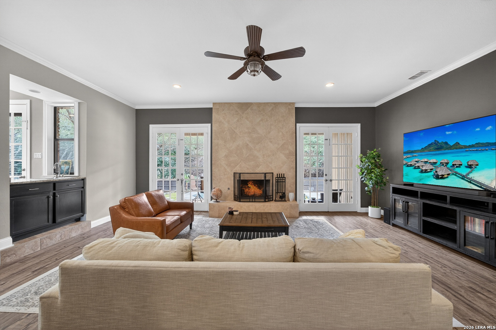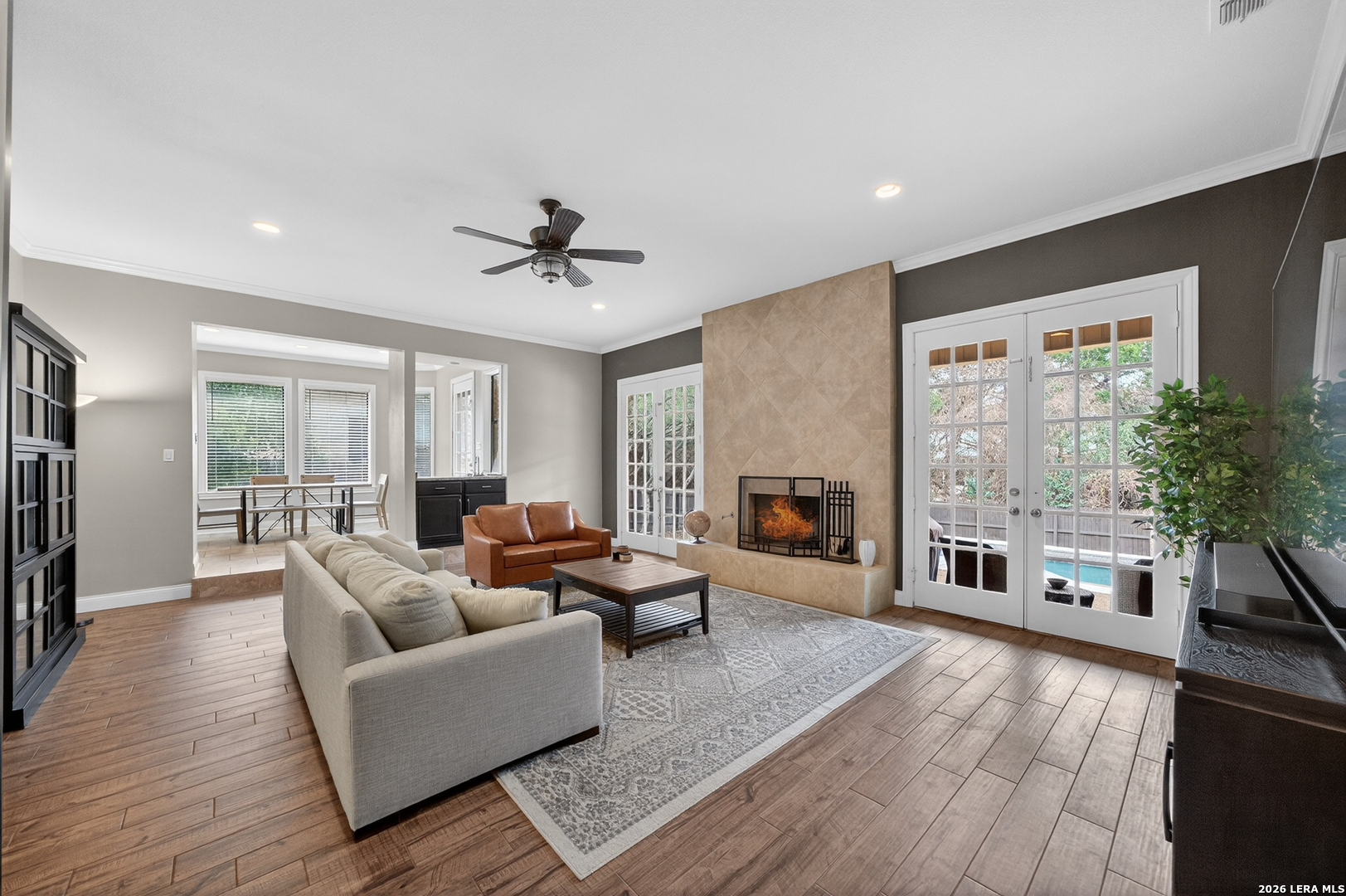 Stylish, updated home located in the guard-gated community of Inwood-offering timeless character and charm beyond the typical cookie-cutter design. Primary suite located on the main level and wood-look tile flooring throughout the downstairs. A cozy gas fireplace anchors the living room. French doors line the back of the home, seamlessly connecting the interior to a covered deck overlooking the pool-perfect for entertaining. The backyard offers plenty of yard space, complete with a full sprinkler system in both front and back. Additional highlights include a side-entry garage and all appliances conveying, including washer, dryer, and refrigerator. Upstairs, enjoy a spacious loft, four bedrooms and three full bathrooms. Residents of Inwood enjoy access to community amenities including tennis courts, pickleball courts, a swimming pool and access to the nearby Salado Creek Trail through a private neighborhood gate, allowing for easy walking or biking. Conveniently located near Bitters and Loop 1604, with easy access to shopping, dining, and highly regarded schools, this home truly checks all the boxes.