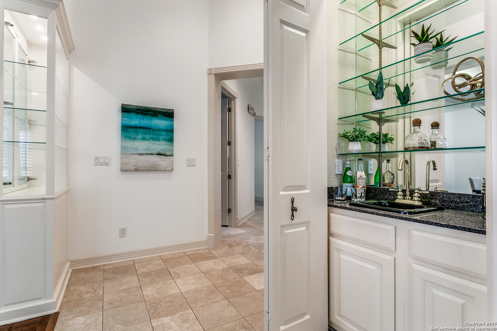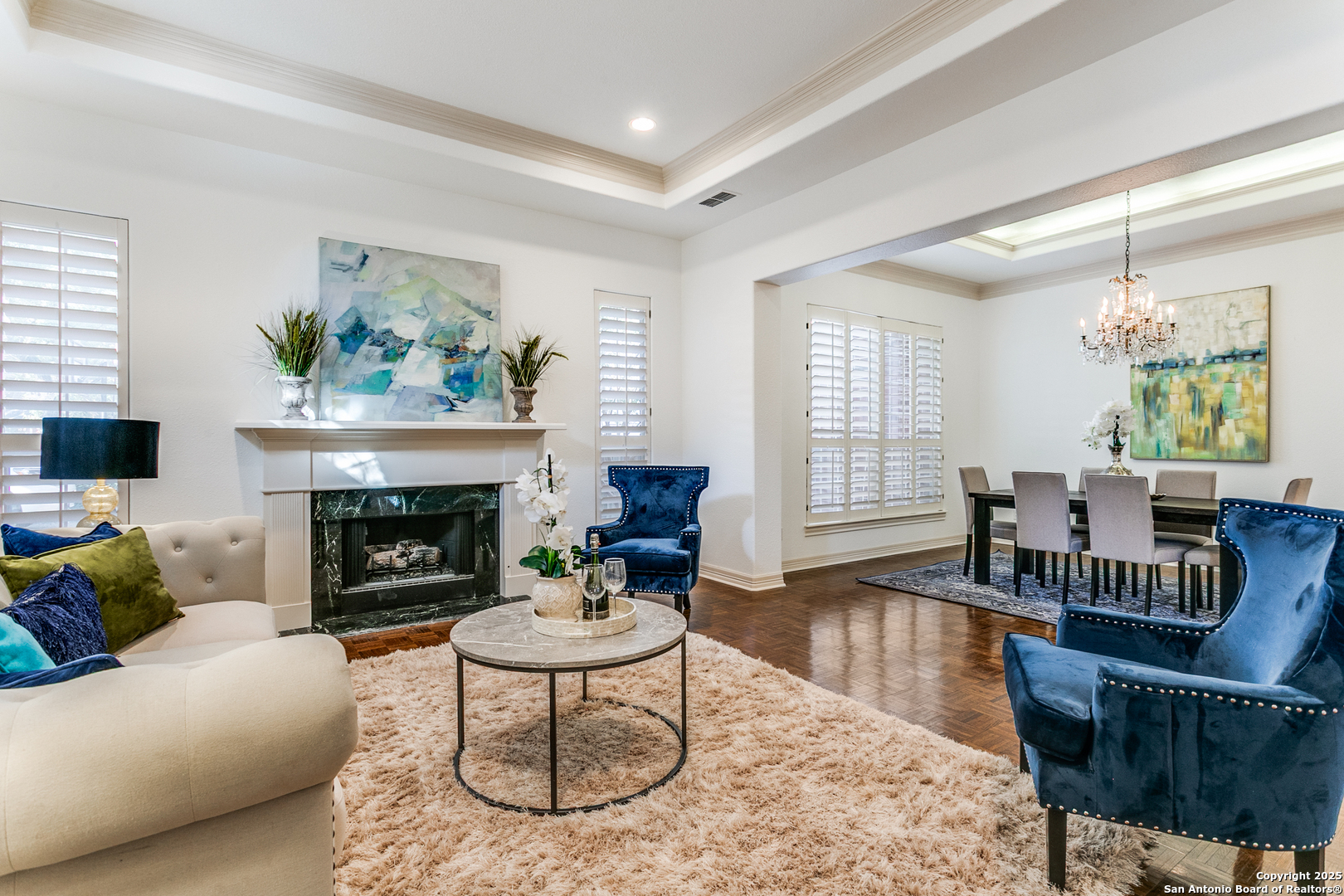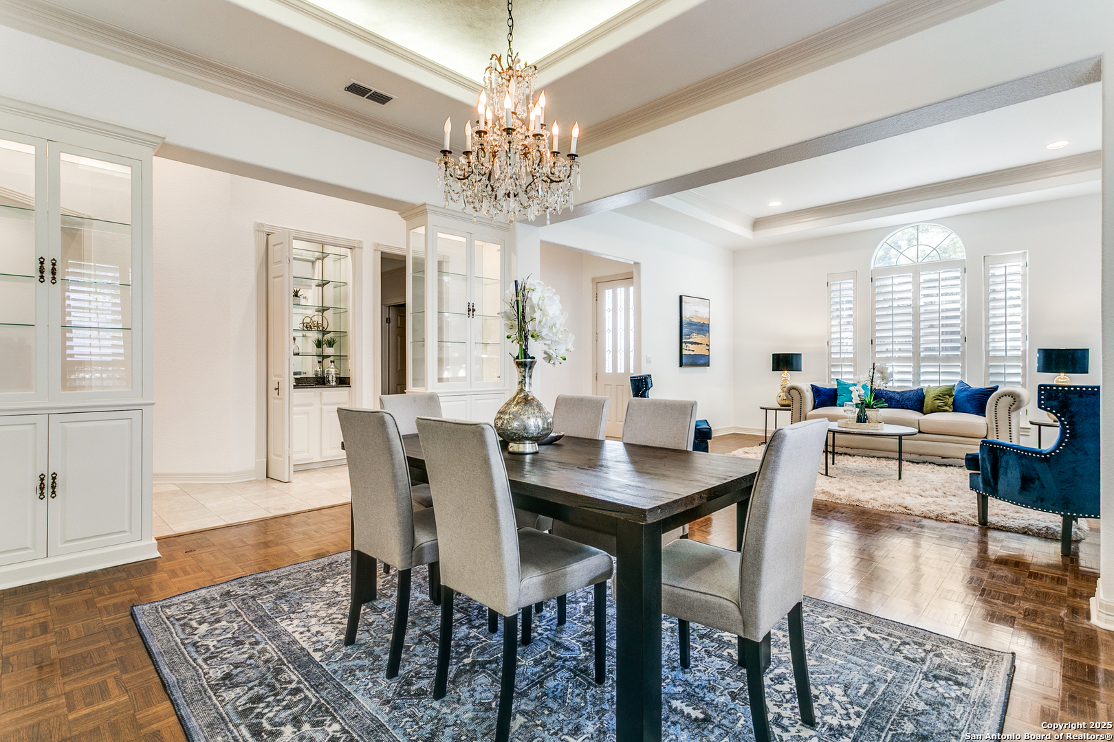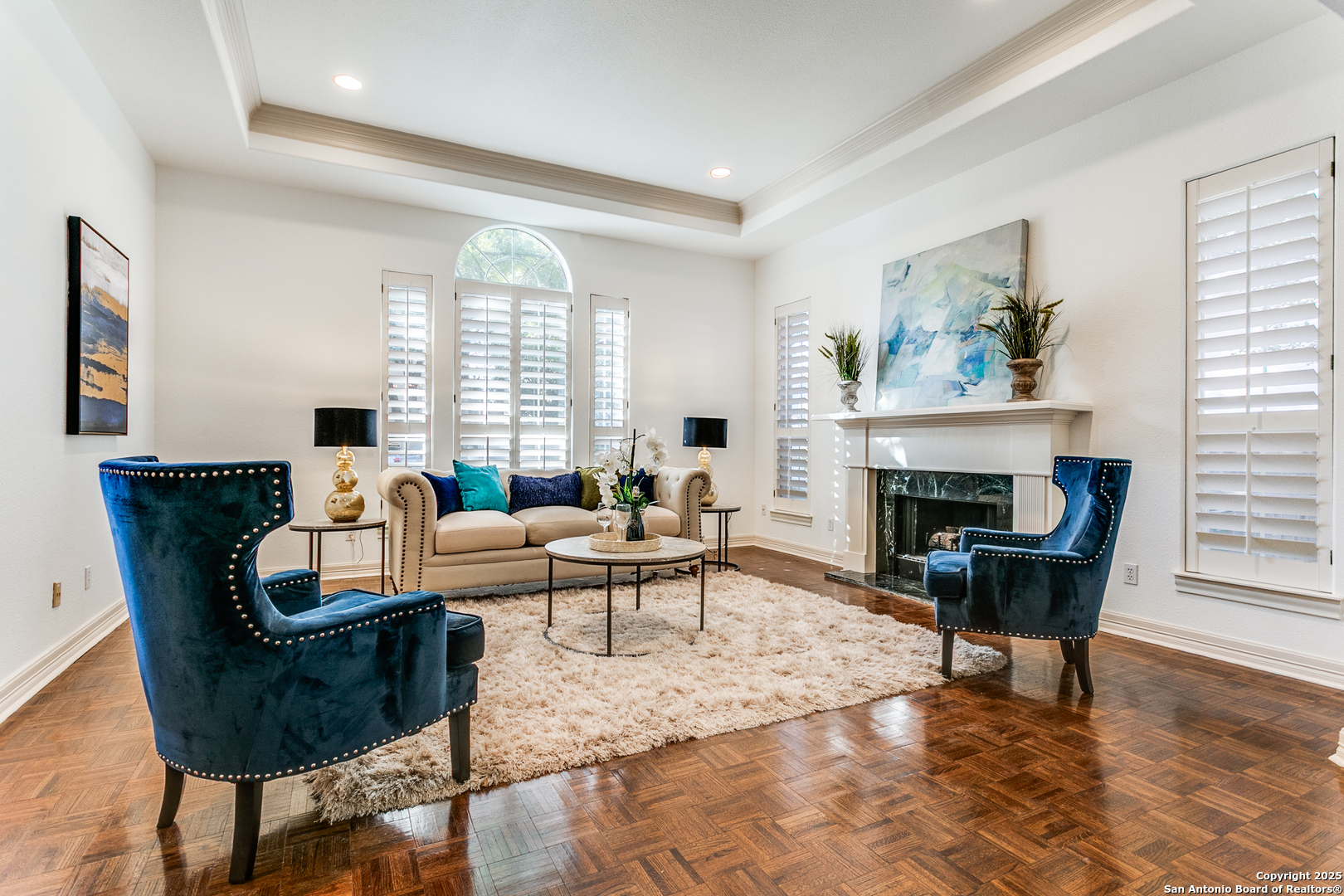 One story home in gated The Greens at Lincoln Heights in AHISD. Beautiful formal living room with parquet flooring, fireplace, two custom built in glass cabinets & wet bar. Separate dining room. Kitchen has great storage and pantry, opens to breakfast/family room. Family room has built-ins & fireplace. Enclosed patio looks out to nice size backyard. Two car attached garage with built-in storage with unique butterfly sliding doors. Plantation shutters and great storage throughout. New carpet in bedrooms. Third bedroom currently used as office has wood bookshelves.
