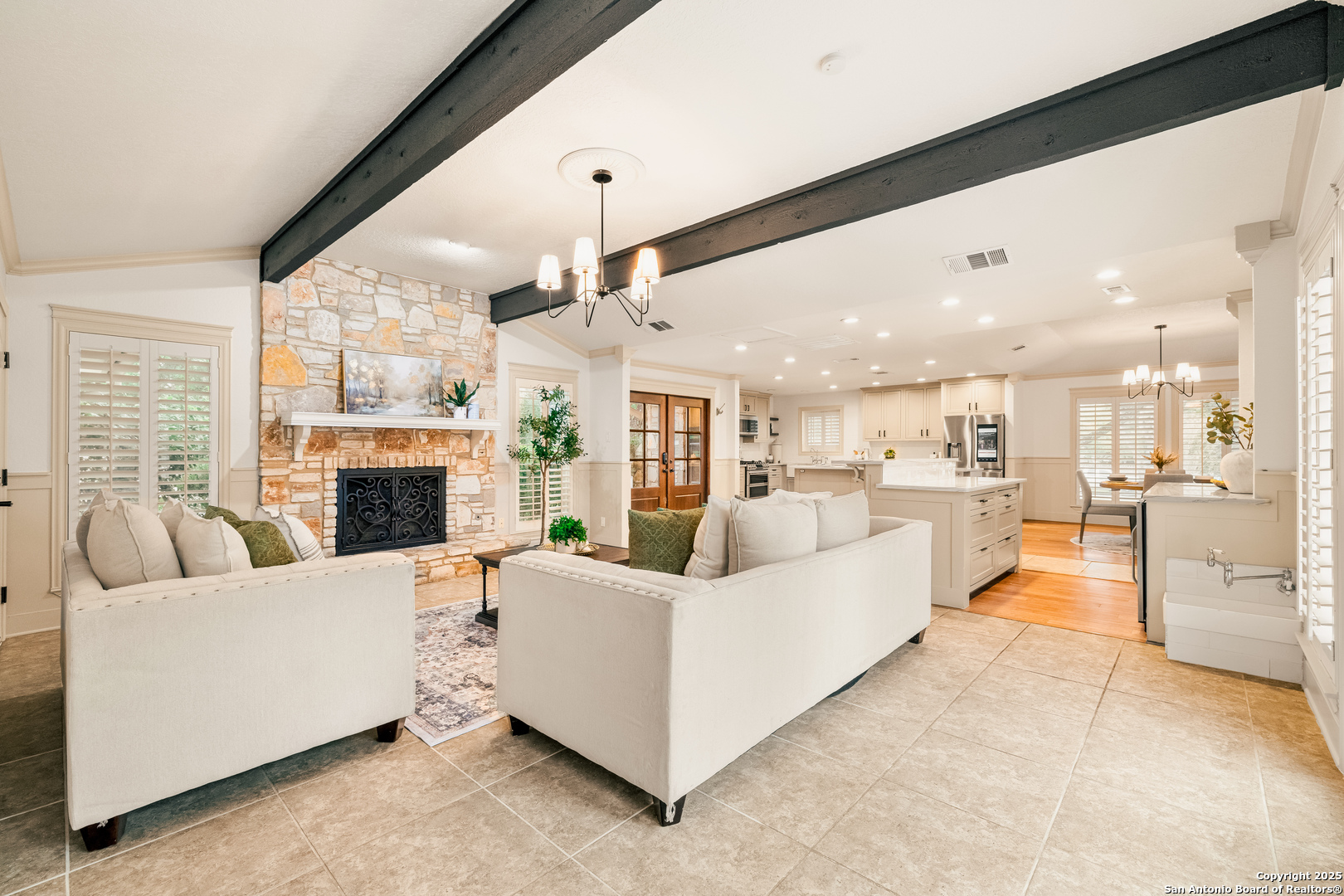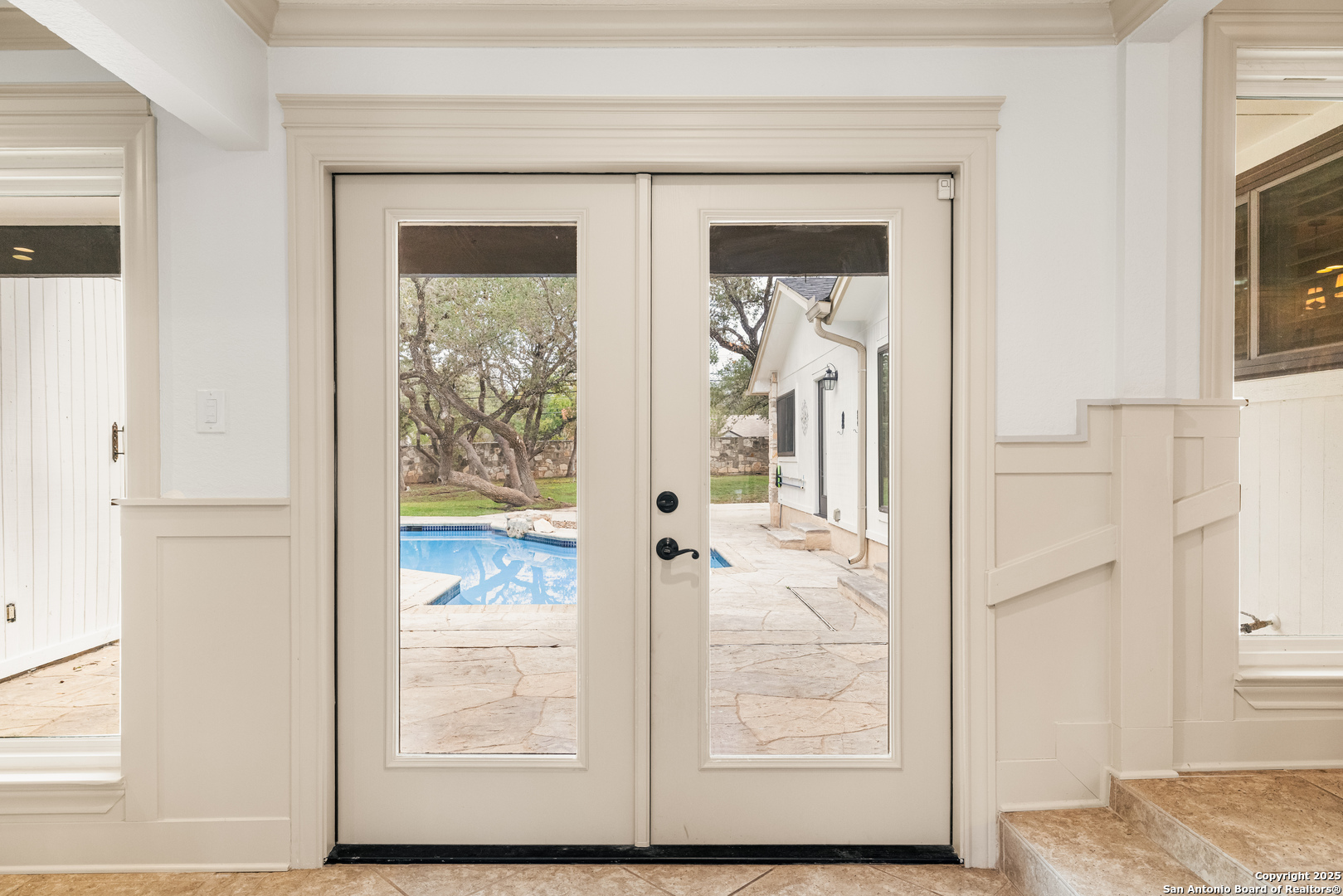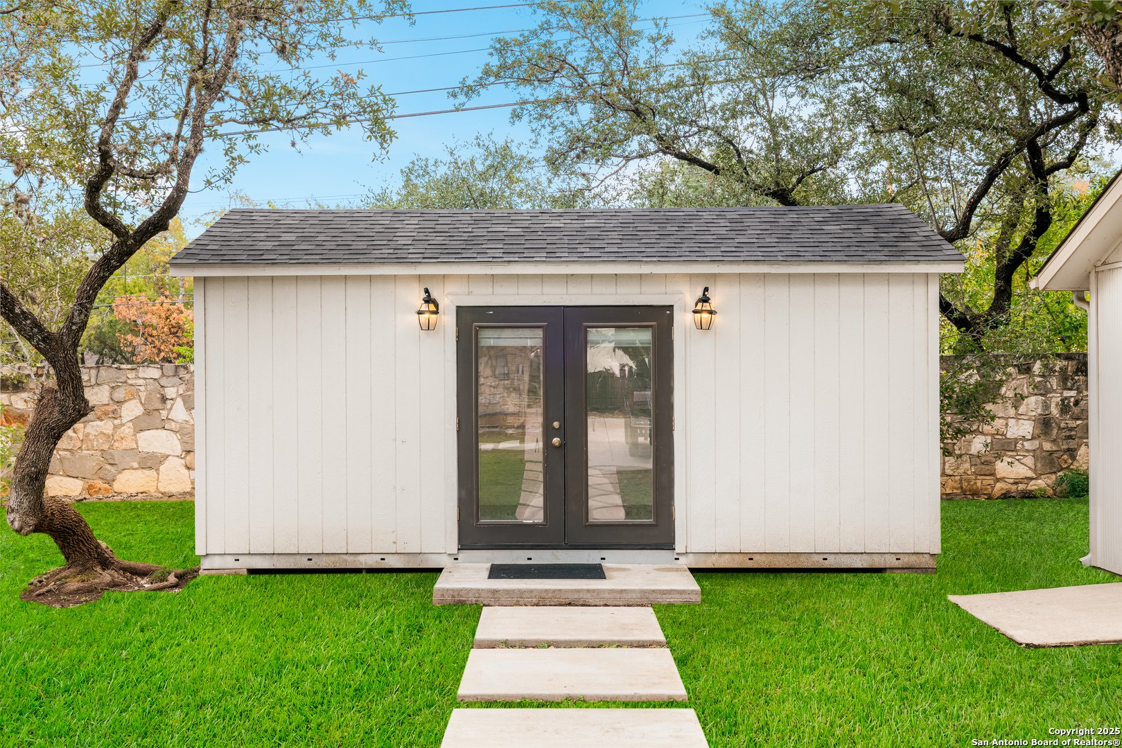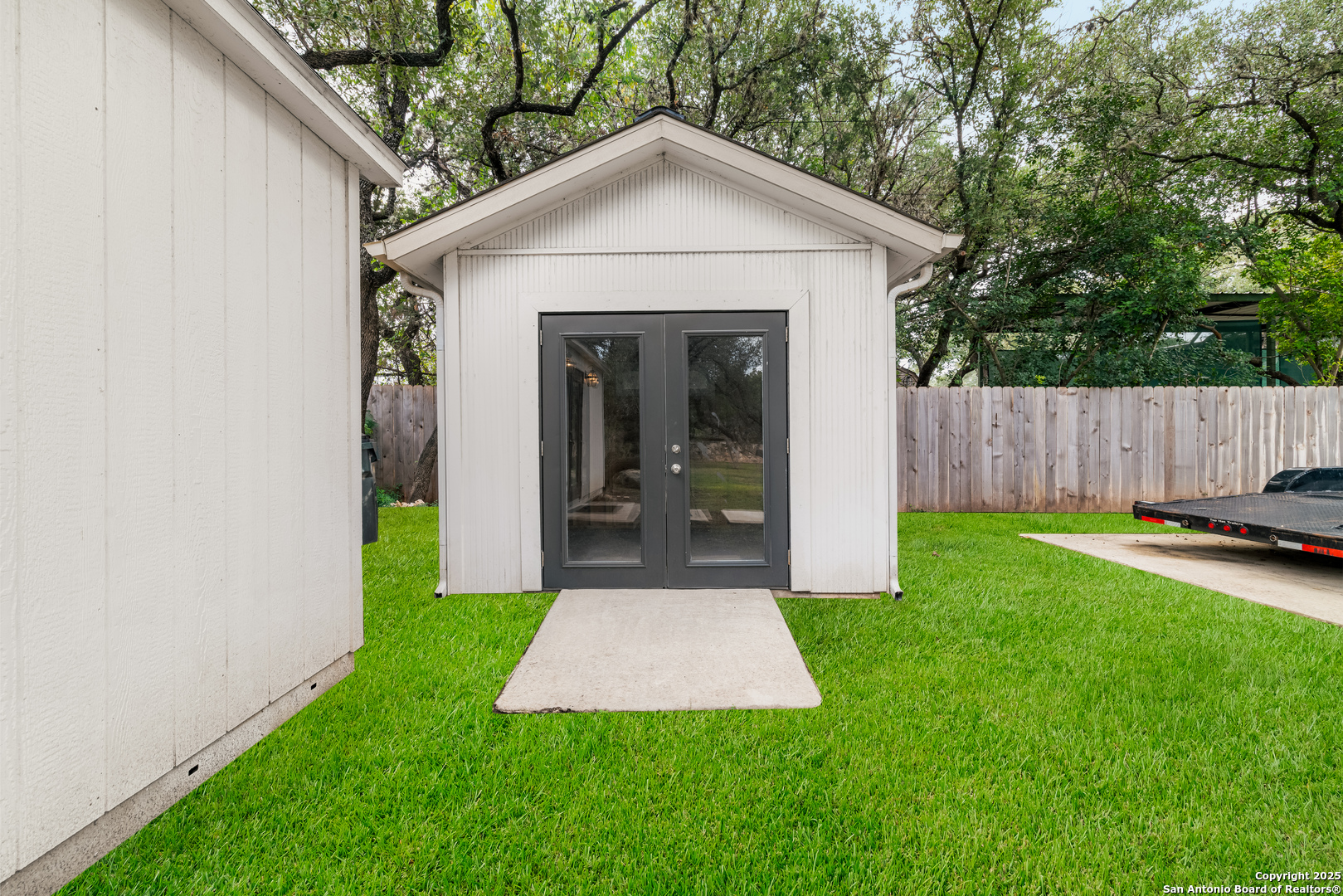 Discover a rare blend of luxury and seclusion in this beautifully appointed 4-bedroom, 3-bath residence offering 3,121 square feet of refined living space. Designed for both comfort and sophistication, the home features two elegant living areas, a dedicated study, and a custom bar that elevates everyday entertaining. The gourmet kitchen is a true showpiece with an oversized designer island, premium cabinetry, and top-tier appliances. The primary suite serves as a private sanctuary with its own fireplace and an intimate patio, perfect for quiet mornings or unwinding in the evening. A second and third fireplace in the main living areas also adds added warmth and architectural charm. Set on 0.75 acres, the property feels secluded while still being conveniently located within the city. The backyard offers a peaceful retreat with a uniquely contoured pool that is subtly reminiscent of the Texas outline, framed by mature trees that enhance privacy and ambiance. Two backyard structures add valuable flexibility, including one fully finished with mini-split HVAC, recessed lighting, and electricity, ideal for a personal studio, office, or high-end hobby space. A graceful U-shaped driveway provides elegant curb presence and easy guest parking, while a separate controlled-access gate allows for additional secure parking. An attached two-car garage and quiet cul-de-sac setting further elevate the sense of exclusivity and comfort this property provides.