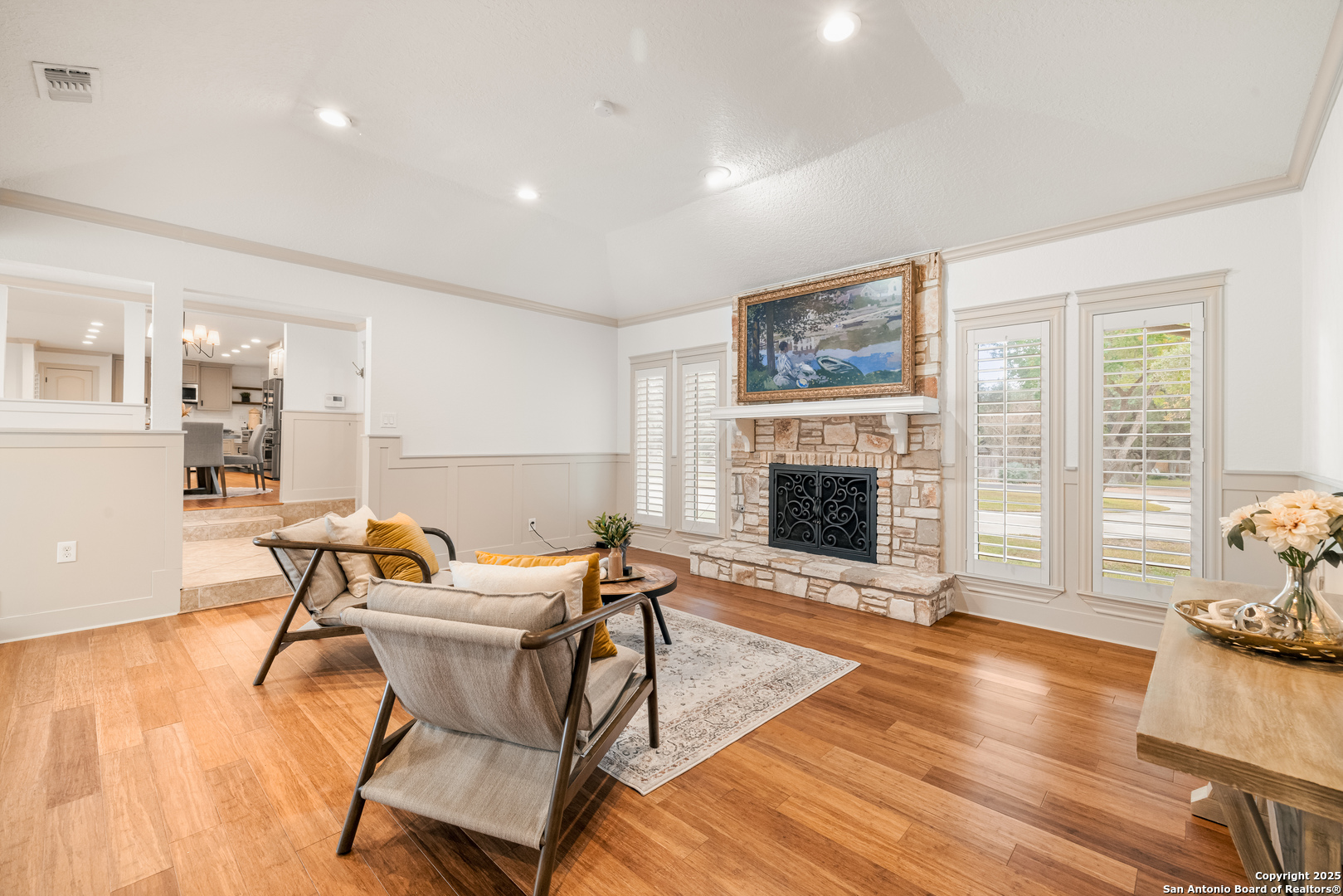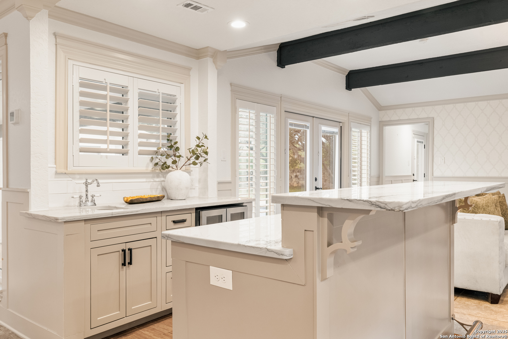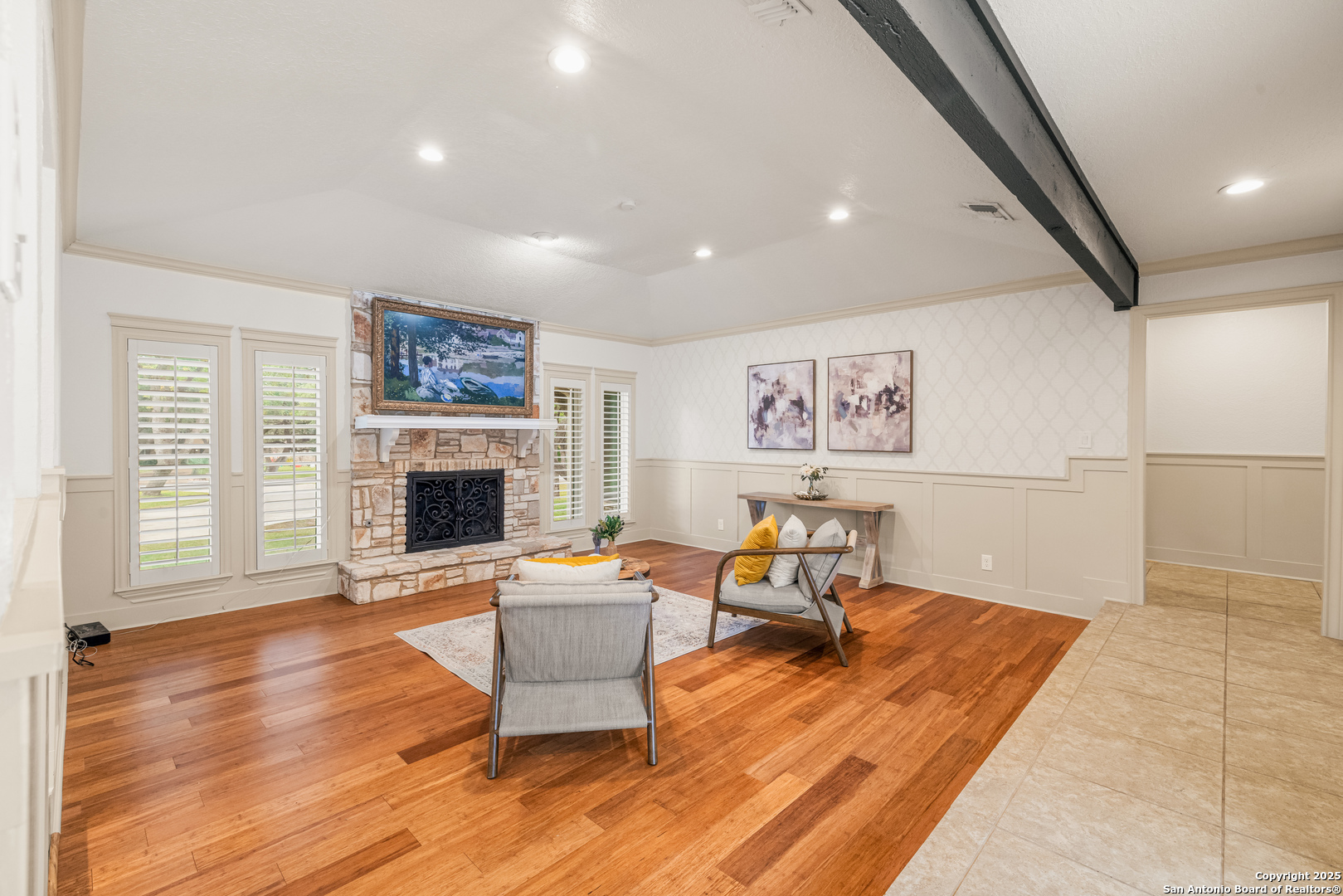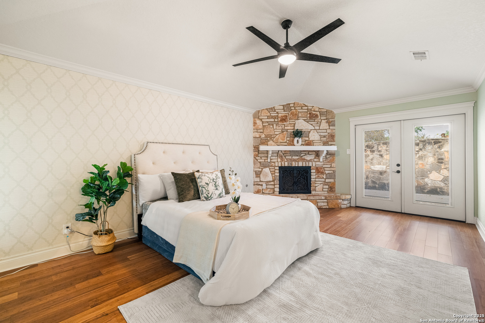 Discover a rare blend of luxury and seclusion in this beautifully appointed 4-bedroom, 3-bath residence offering 3,121 square feet of refined living space. Designed for both comfort and sophistication, the home features two elegant living areas, a dedicated study, and a custom bar that elevates everyday entertaining. The gourmet kitchen is a true showpiece with an oversized designer island, premium cabinetry, and top-tier appliances. The primary suite serves as a private sanctuary with its own fireplace and an intimate patio, perfect for quiet mornings or unwinding in the evening. A second and third fireplace in the main living areas also adds added warmth and architectural charm. Set on 0.75 acres, the property feels secluded while still being conveniently located within the city. The backyard offers a peaceful retreat with a uniquely contoured pool that is subtly reminiscent of the Texas outline, framed by mature trees that enhance privacy and ambiance. Two backyard structures add valuable flexibility, including one fully finished with mini-split HVAC, recessed lighting, and electricity, ideal for a personal studio, office, or high-end hobby space. A graceful U-shaped driveway provides elegant curb presence and easy guest parking, while a separate controlled-access gate allows for additional secure parking. An attached two-car garage and quiet cul-de-sac setting further elevate the sense of exclusivity and comfort this property provides.