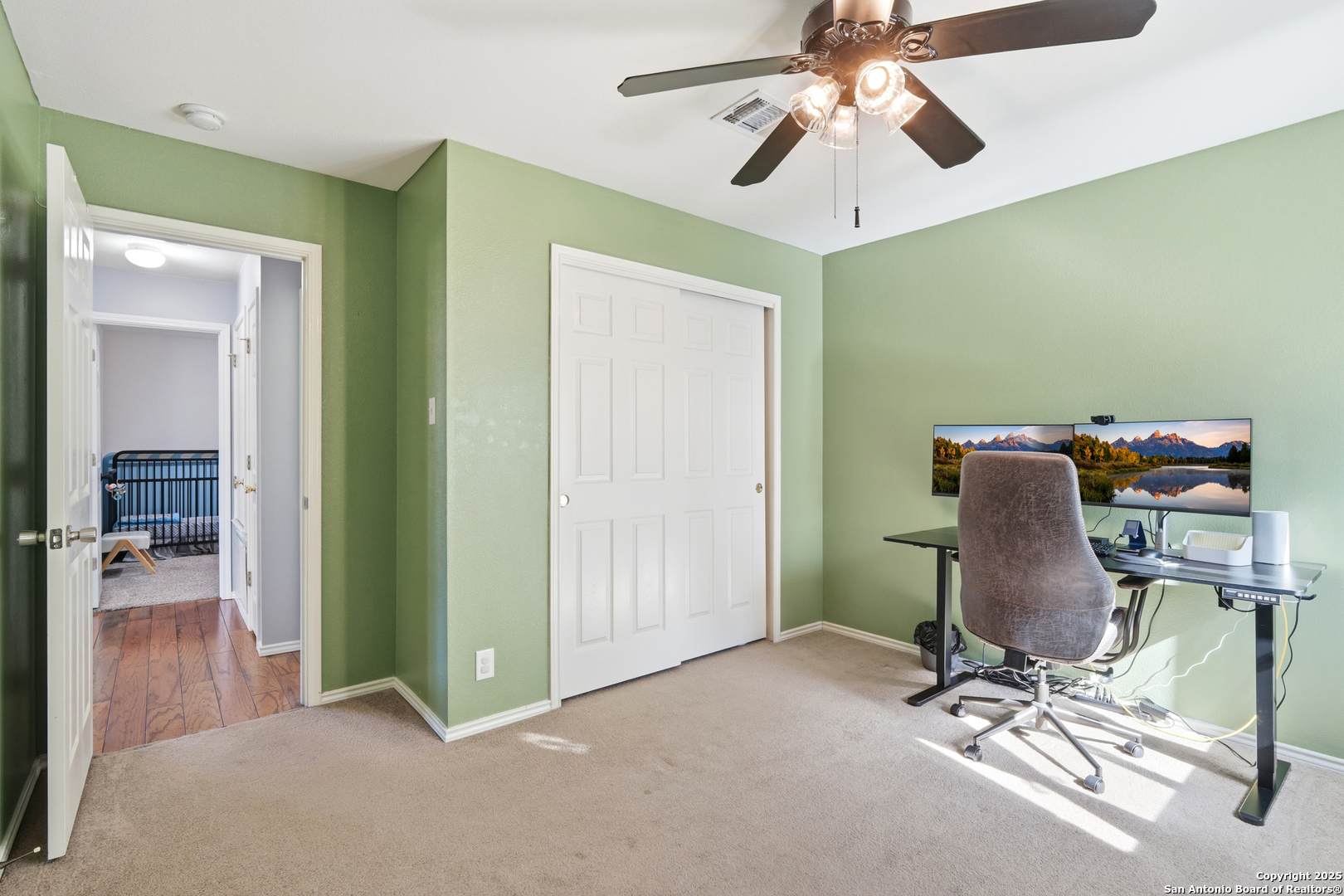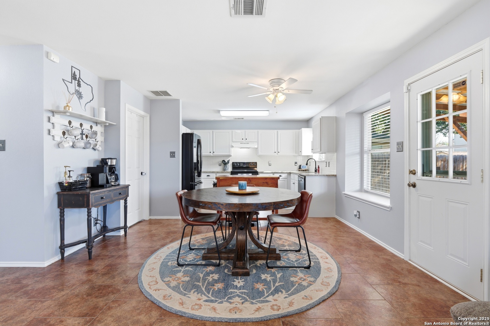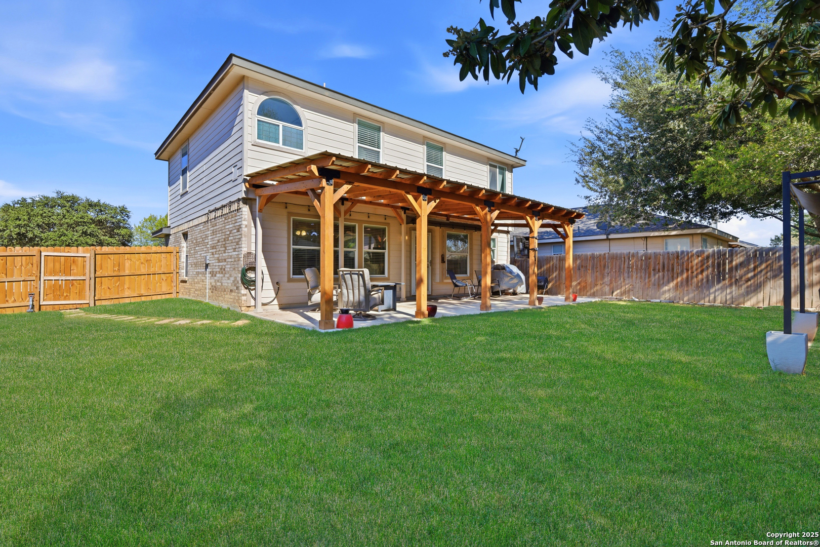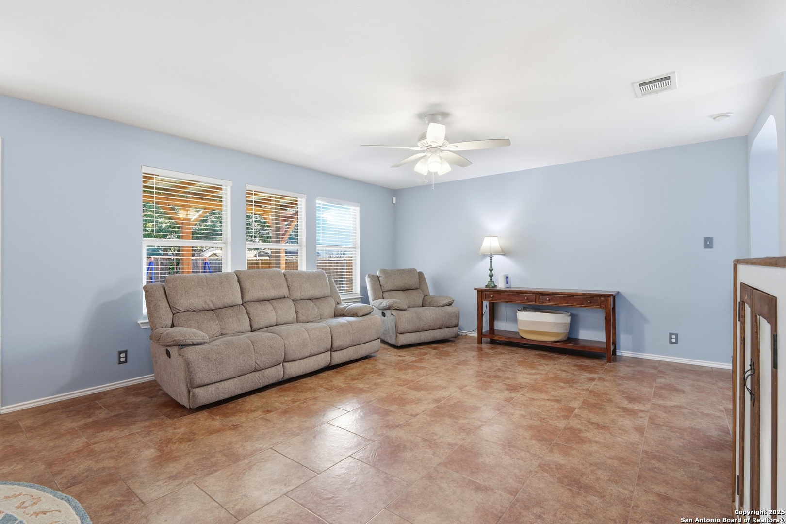 This charming two-story home in the Forest Creek neighborhood is situated on a desirable corner lot. It offers beautiful tile flooring throughout the first level. The open-concept layout connects the kitchen, dining, and living areas, creating the perfect space for gatherings. The kitchen includes solid-surface countertops, a crisp white tile backsplash, and custom cabinetry. A dedicated office and a convenient utility room are located downstairs. All bedrooms are upstairs, each equipped with ceiling fans and spacious closets. The primary suite includes a walk-in closet and an en-suite bath with a separate tub, shower, and single vanity. An upstairs gameroom provides additional living space. The private backyard features an oversized patio and full privacy fencing, ideal for entertaining. Conveniently located near Randolph AFB, SAMC, and I-35.