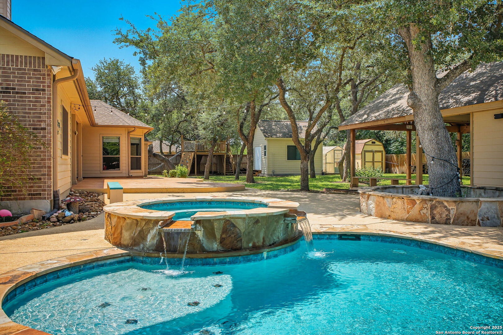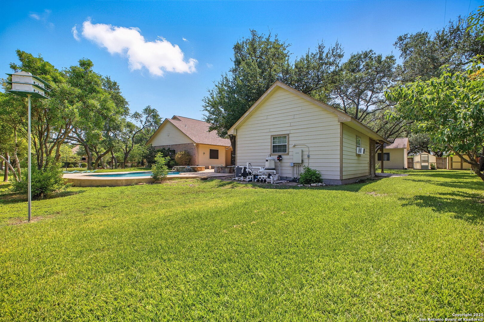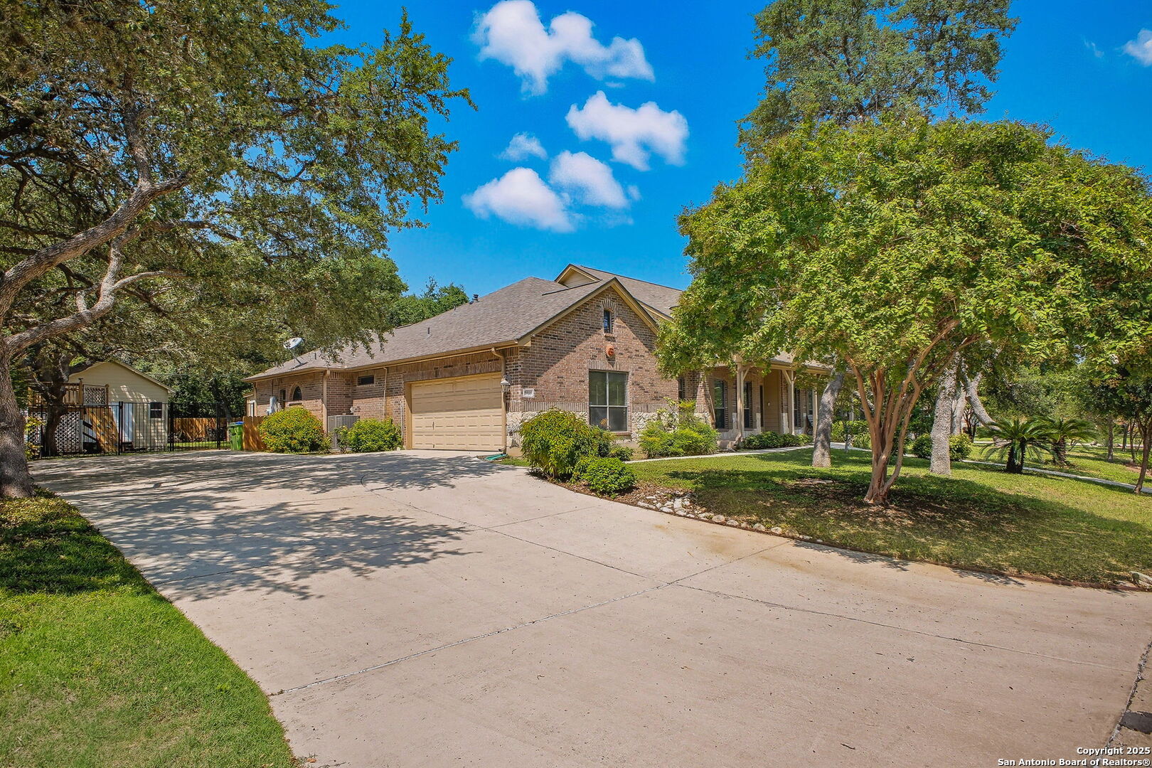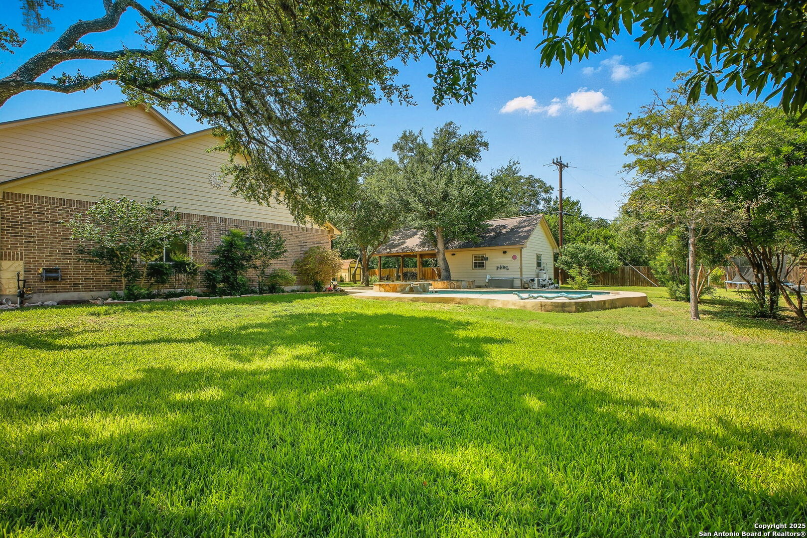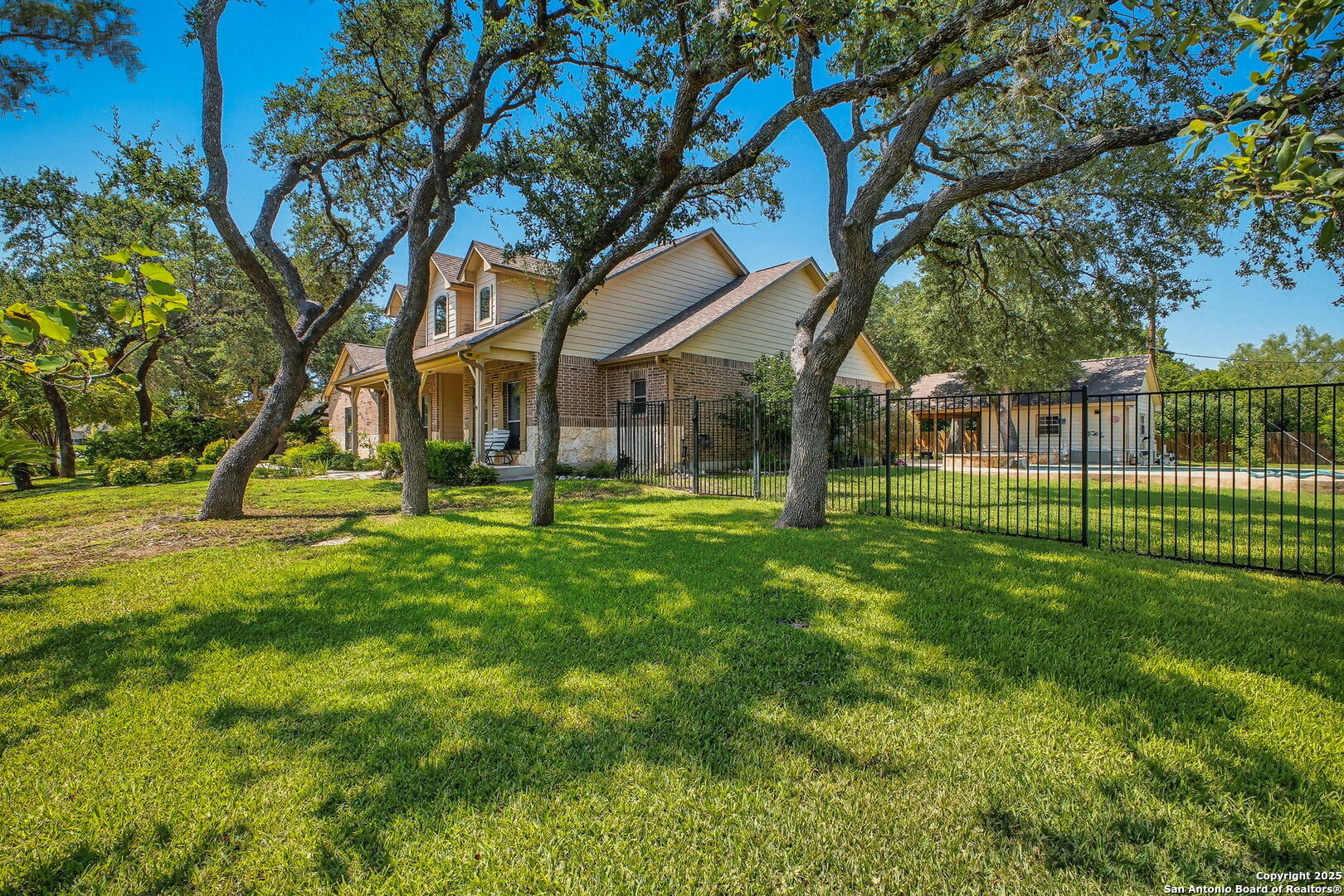 Welcome to your private oasis! Situated on a spacious 0.60-acre corner lot in a gated community, this beautifully upgraded home offers a serene lifestyle surrounded by lush greenery and mature plants including a peach and pomegranate trees. The extended long driveway provides up to 6 parking spots, while inside, the open floor plan shines with natural light, soaring high ceilings, vaulted touches in the main living and master suite, updated laminate flooring, tile, fireplace, soft-close kitchen cabinetry, a new flat stovetop that can be switched to gas and remodeled bathrooms featuring walk-in showers. The fourth bedroom with closet can be used as flex room/office! Comfort is enhanced with two smart thermostats-one controlling half of the home and the other managing the opposite side-along with a new HVAC system (2024), new water heater (2025), and recent roof updates (2020 main home, 2025 garage). Outdoors, you'll enjoy a custom-built pool, a newly added half bath dedicated to poolside use, a newly constructed air-conditioned studio perfect for work or fitness, and a detached back garage with water access that could easily be converted into a pool house. With Medina Lake just minutes away and schools nearby, this home blends modern upgrades with resort-style living-perfect for both relaxation and entertaining.