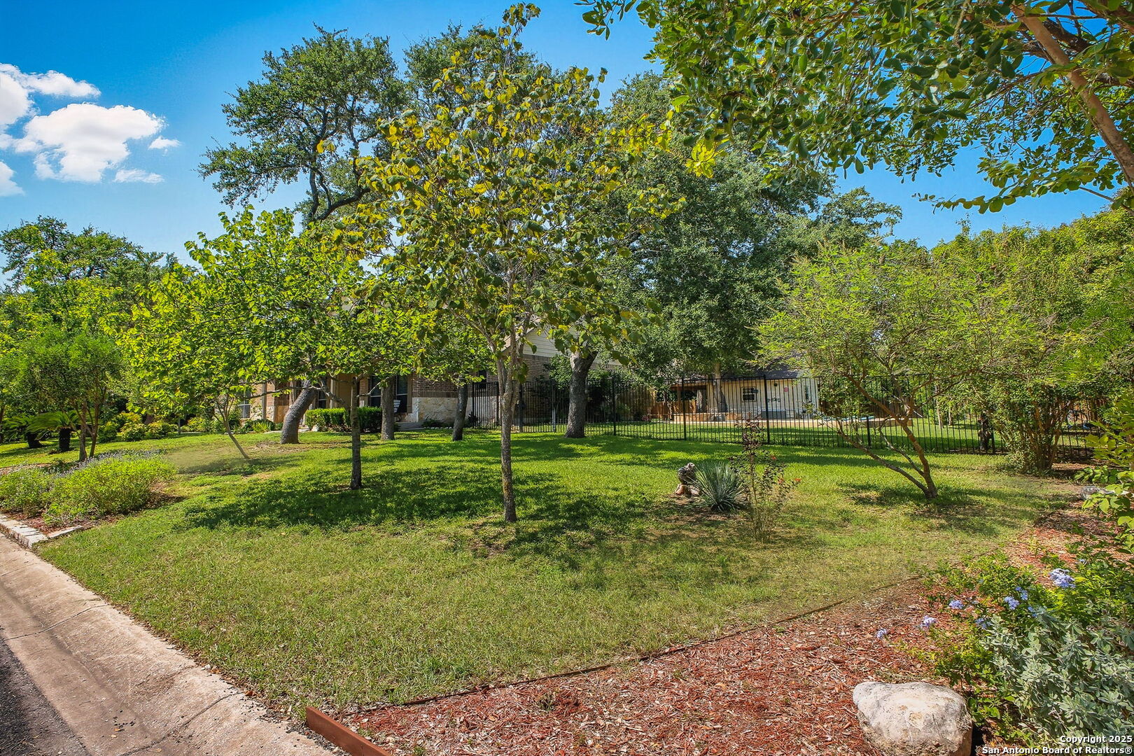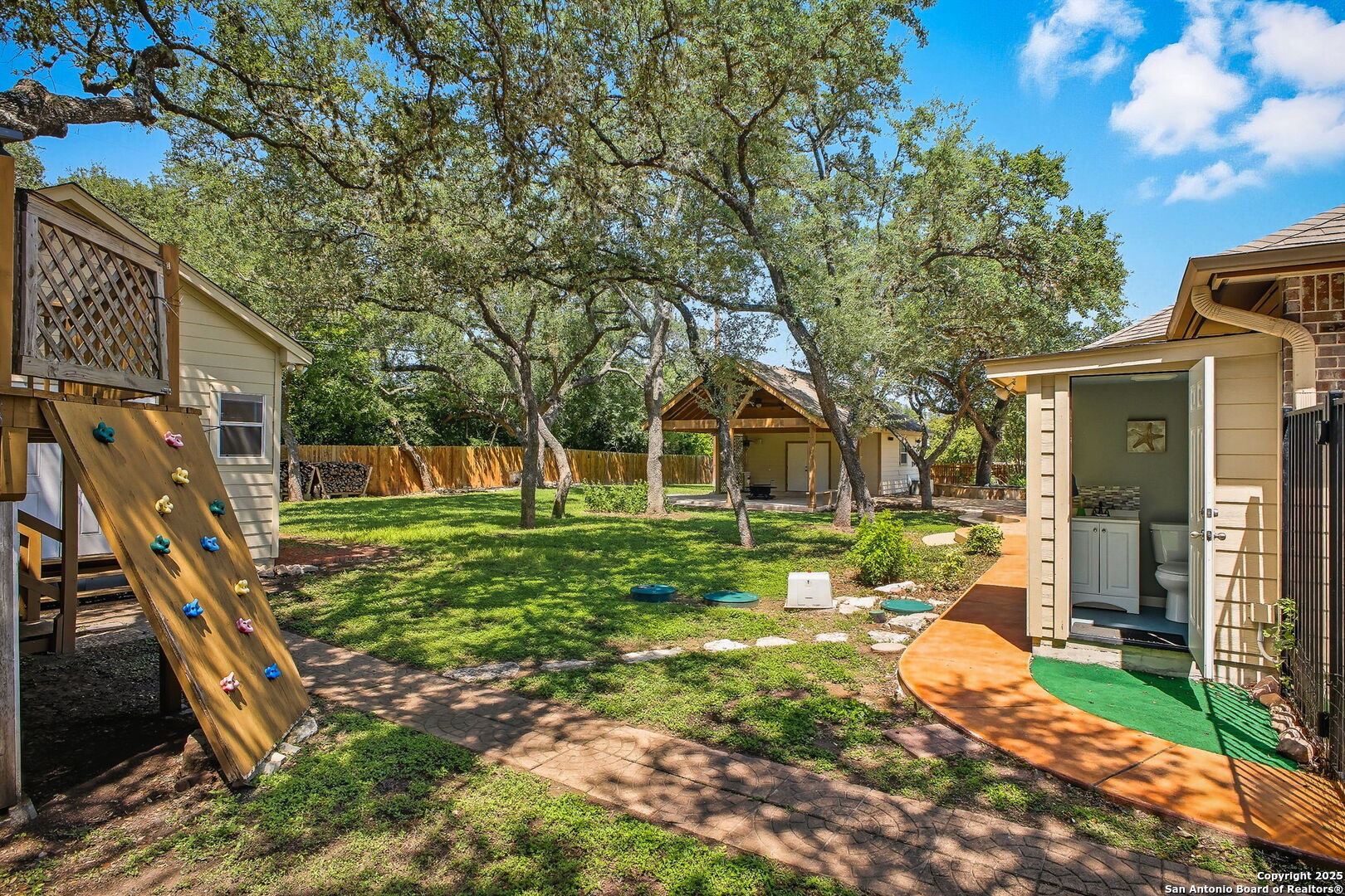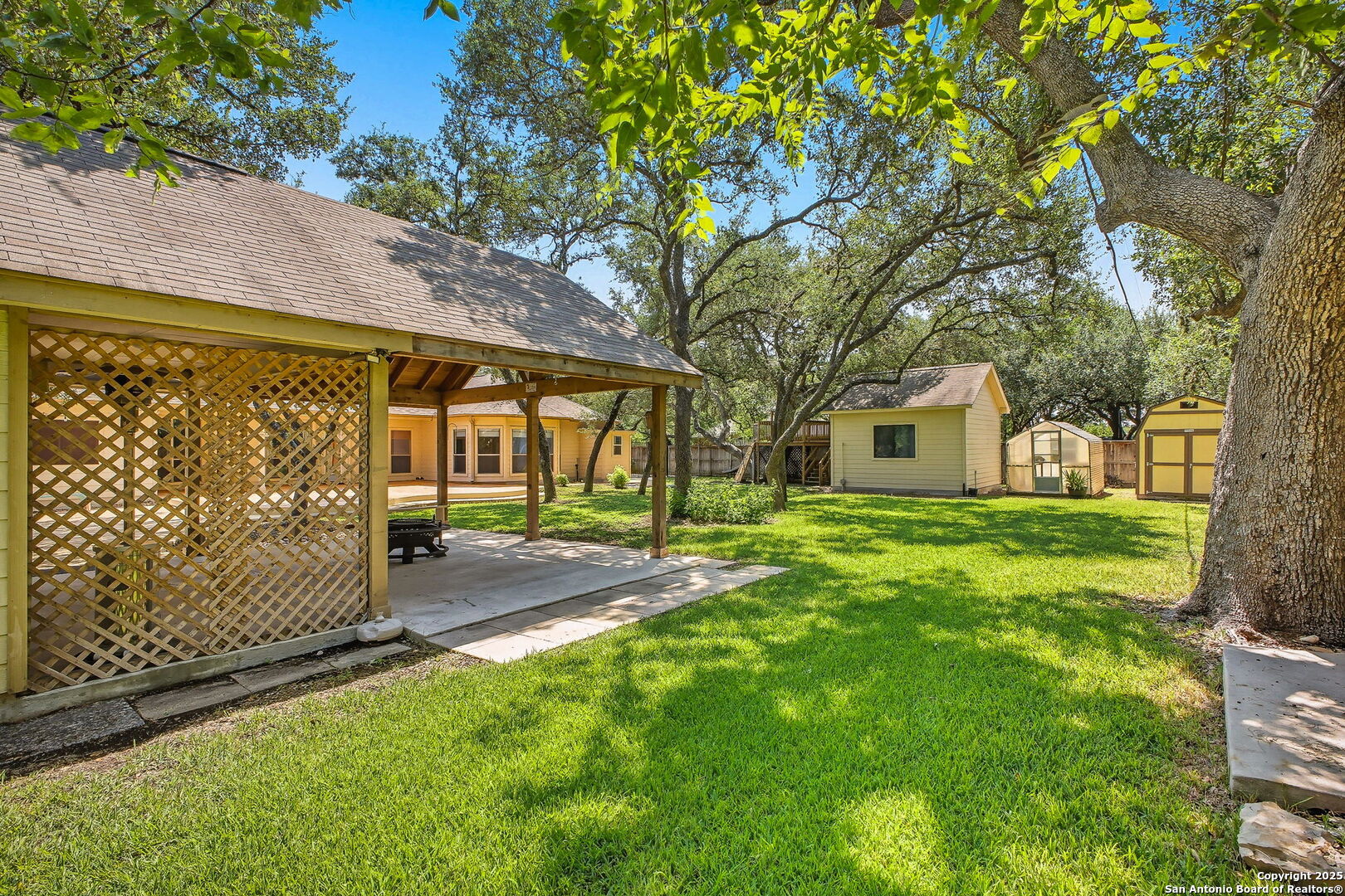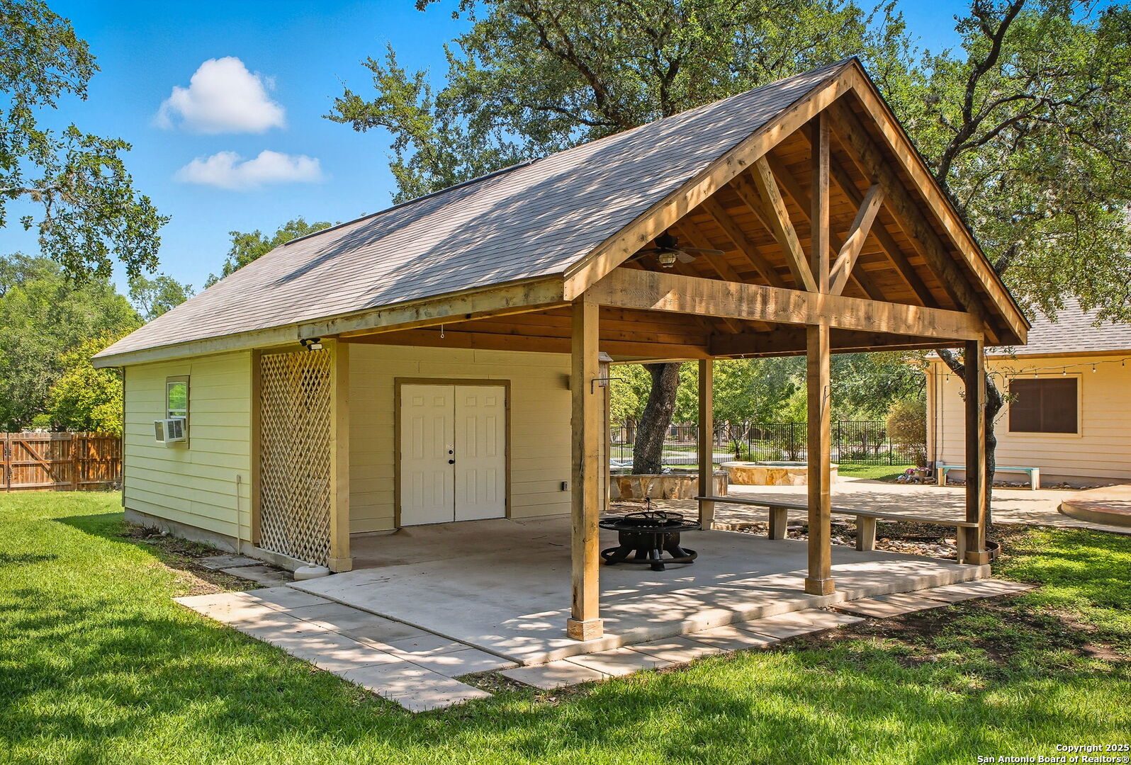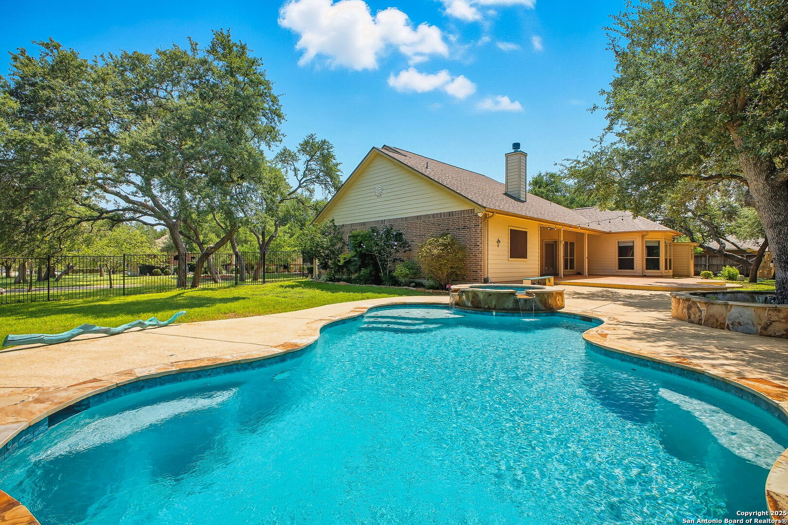 Welcome to your private oasis! Situated on a spacious 0.60-acre corner lot in a gated community, this beautifully upgraded home offers a serene lifestyle surrounded by lush greenery and mature plants including a peach and pomegranate trees. The extended long driveway provides up to 6 parking spots, while inside, the open floor plan shines with natural light, soaring high ceilings, vaulted touches in the main living and master suite, updated laminate flooring, tile, fireplace, soft-close kitchen cabinetry, a new flat stovetop that can be switched to gas and remodeled bathrooms featuring walk-in showers. The fourth bedroom with closet can be used as flex room/office! Comfort is enhanced with two smart thermostats-one controlling half of the home and the other managing the opposite side-along with a new HVAC system (2024), new water heater (2025), and recent roof updates (2020 main home, 2025 garage). Outdoors, you'll enjoy a custom-built pool, a newly added half bath dedicated to poolside use, a newly constructed air-conditioned studio perfect for work or fitness, and a detached back garage with water access that could easily be converted into a pool house. With Medina Lake just minutes away and schools nearby, this home blends modern upgrades with resort-style living-perfect for both relaxation and entertaining.