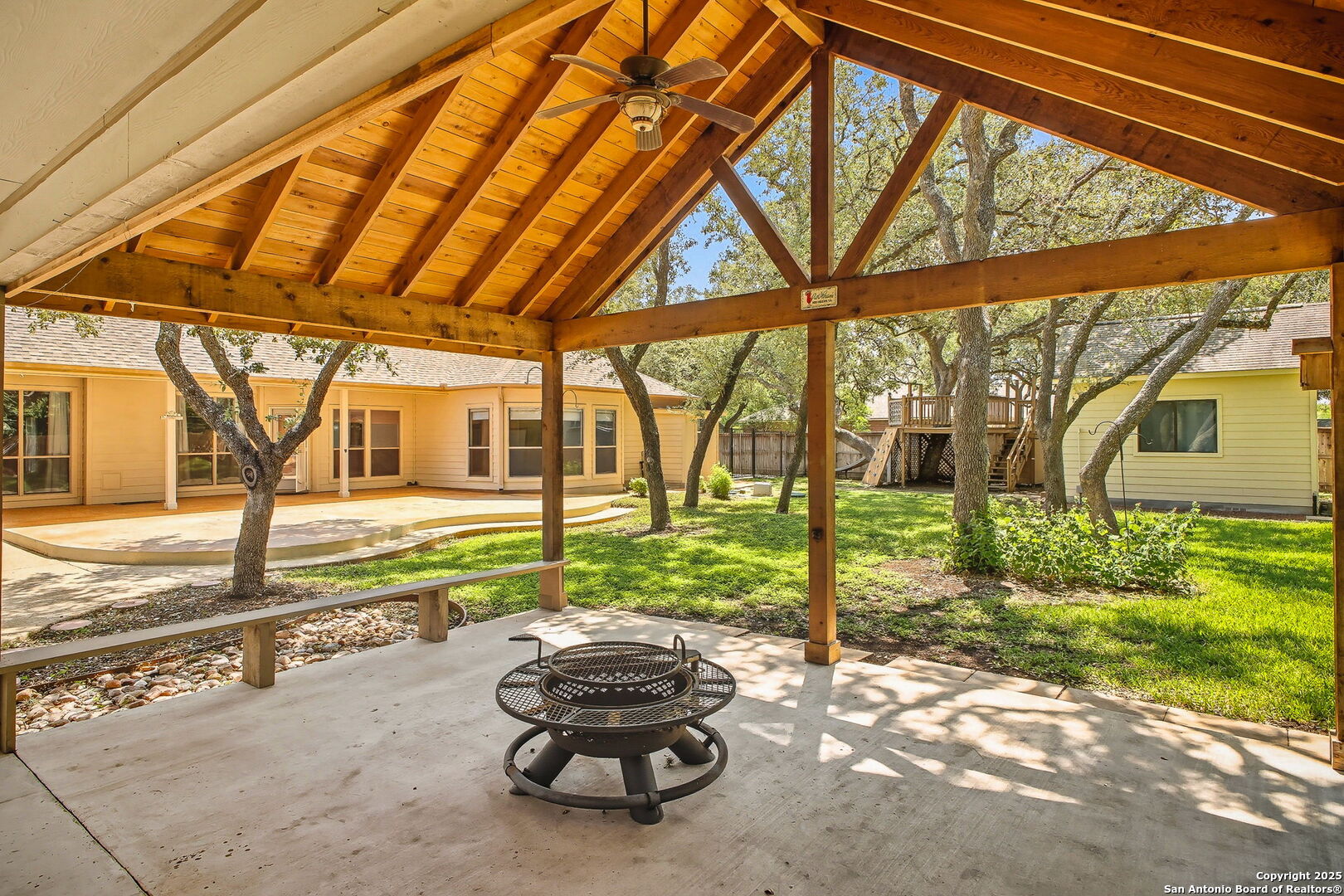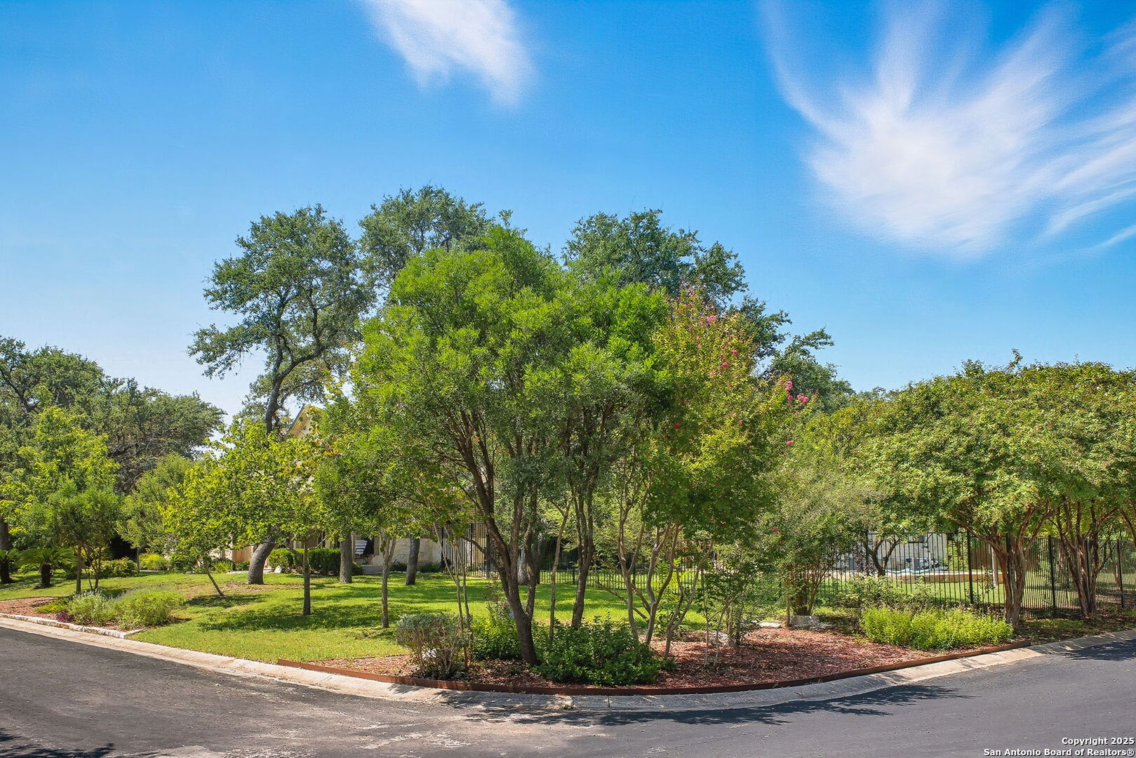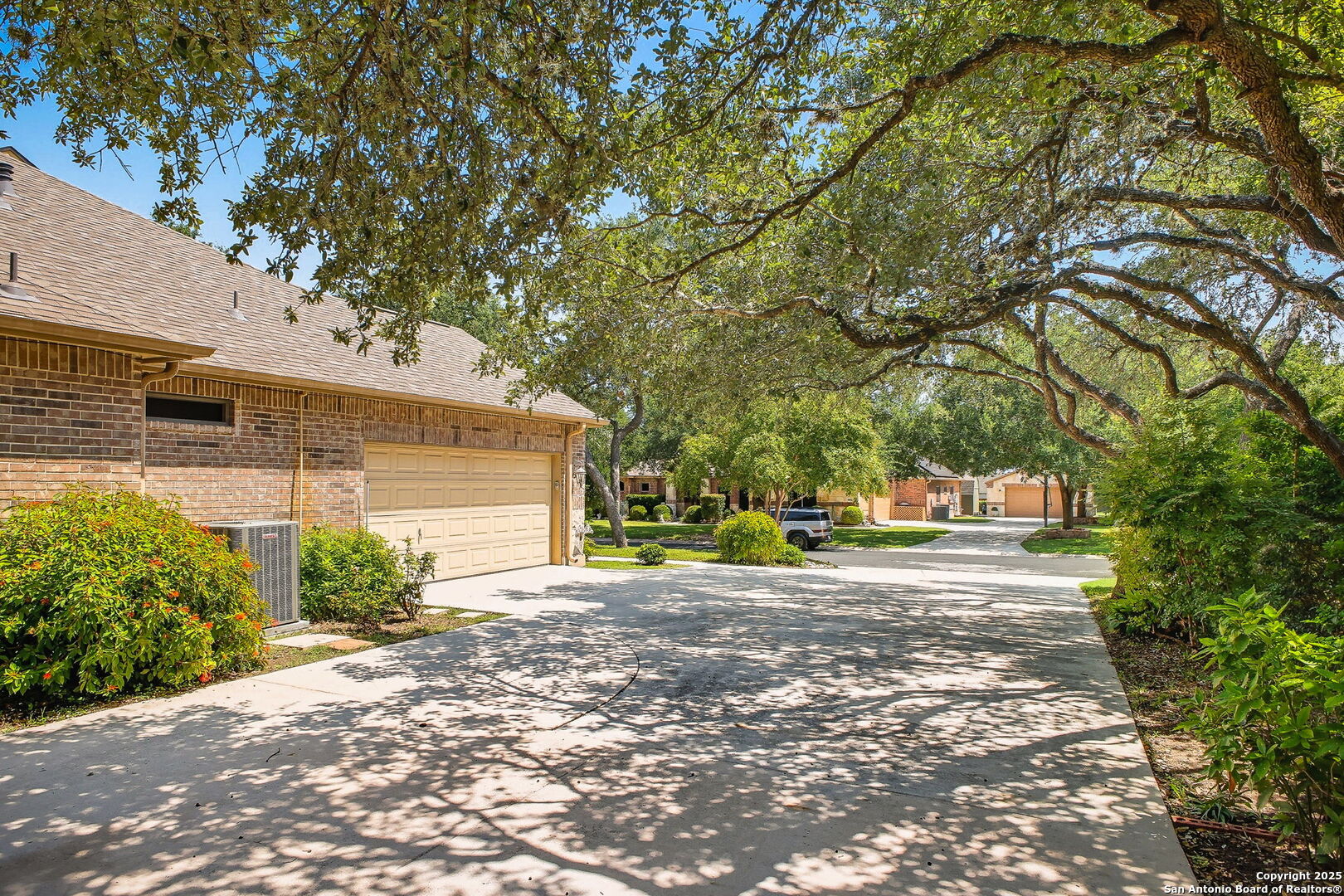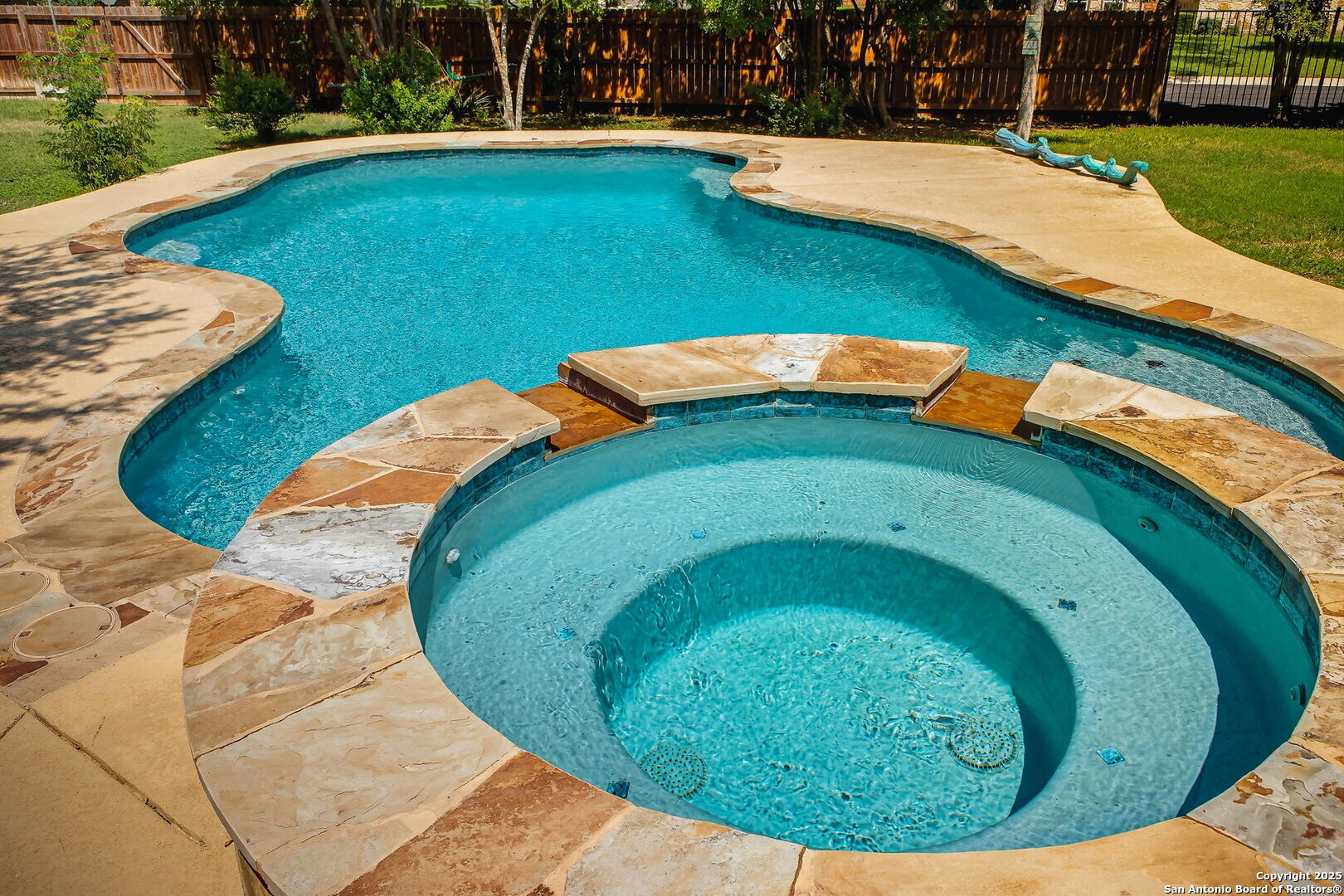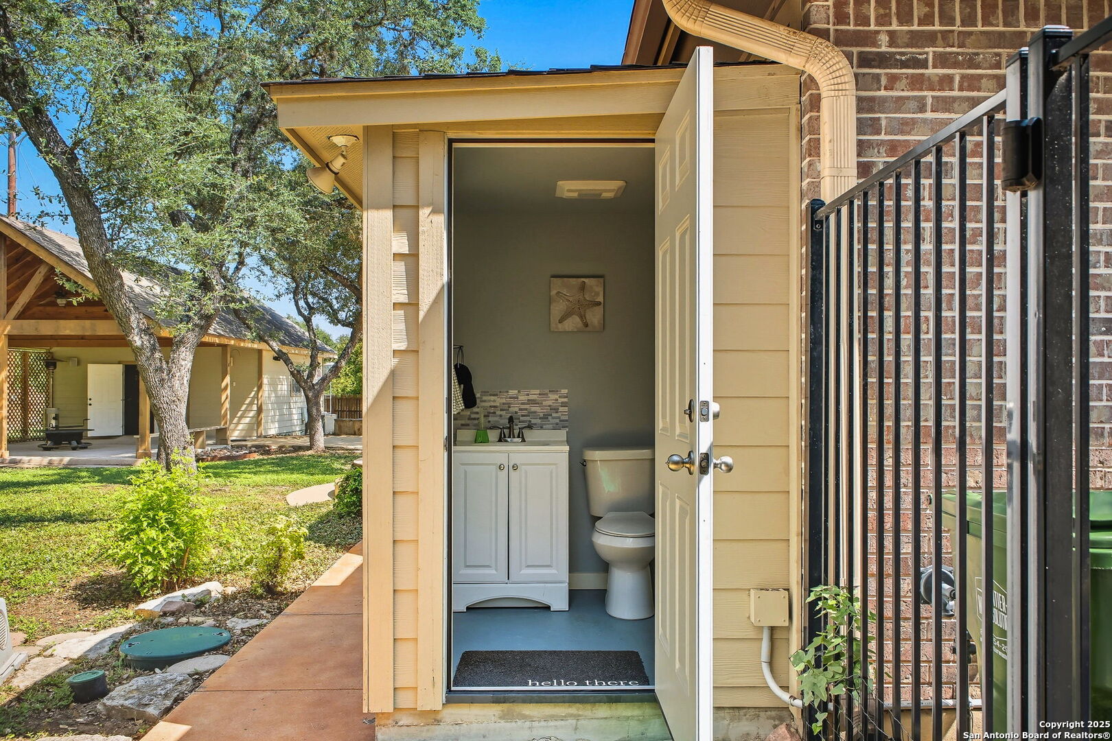 Welcome to your private oasis! Situated on a spacious 0.60-acre corner lot in a gated community, this beautifully upgraded home offers a serene lifestyle surrounded by lush greenery and mature plants including a peach and pomegranate trees. The extended long driveway provides up to 6 parking spots, while inside, the open floor plan shines with natural light, soaring high ceilings, vaulted touches in the main living and master suite, updated laminate flooring, tile, fireplace, soft-close kitchen cabinetry, a new flat stovetop that can be switched to gas and remodeled bathrooms featuring walk-in showers. The fourth bedroom with closet can be used as flex room/office! Comfort is enhanced with two smart thermostats-one controlling half of the home and the other managing the opposite side-along with a new HVAC system (2024), new water heater (2025), and recent roof updates (2020 main home, 2025 garage). Outdoors, you'll enjoy a custom-built pool, a newly added half bath dedicated to poolside use, a newly constructed air-conditioned studio perfect for work or fitness, and a detached back garage with water access that could easily be converted into a pool house. With Medina Lake just minutes away and schools nearby, this home blends modern upgrades with resort-style living-perfect for both relaxation and entertaining.
