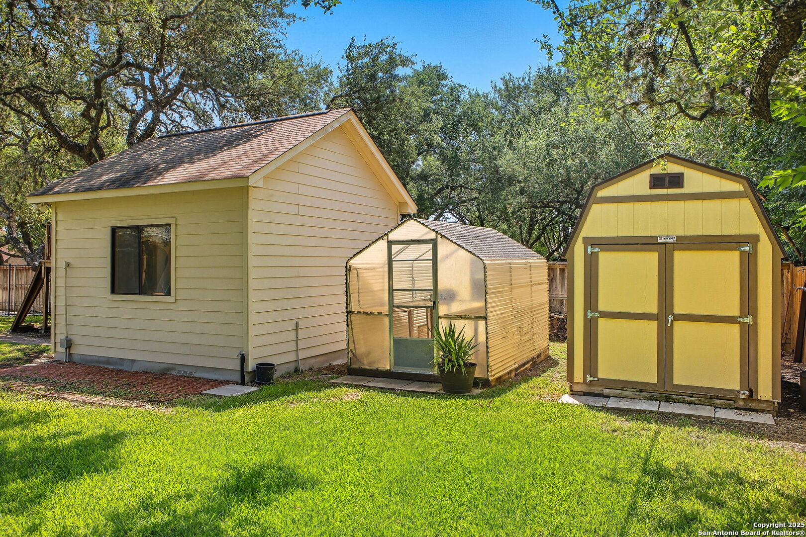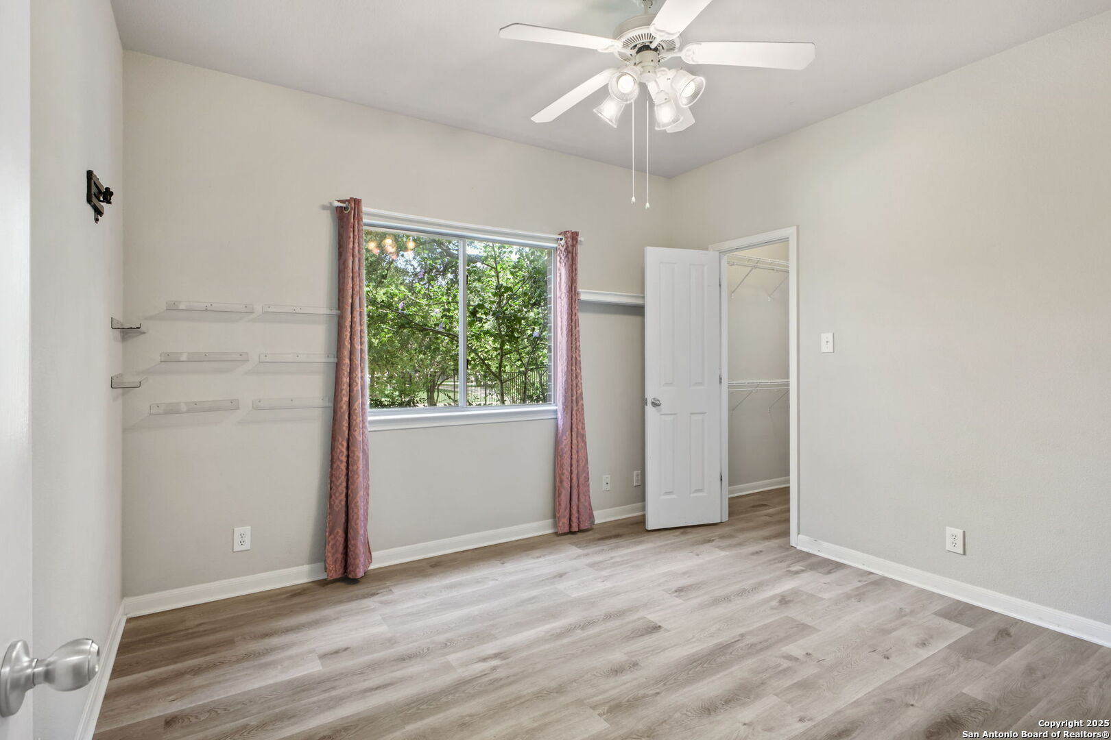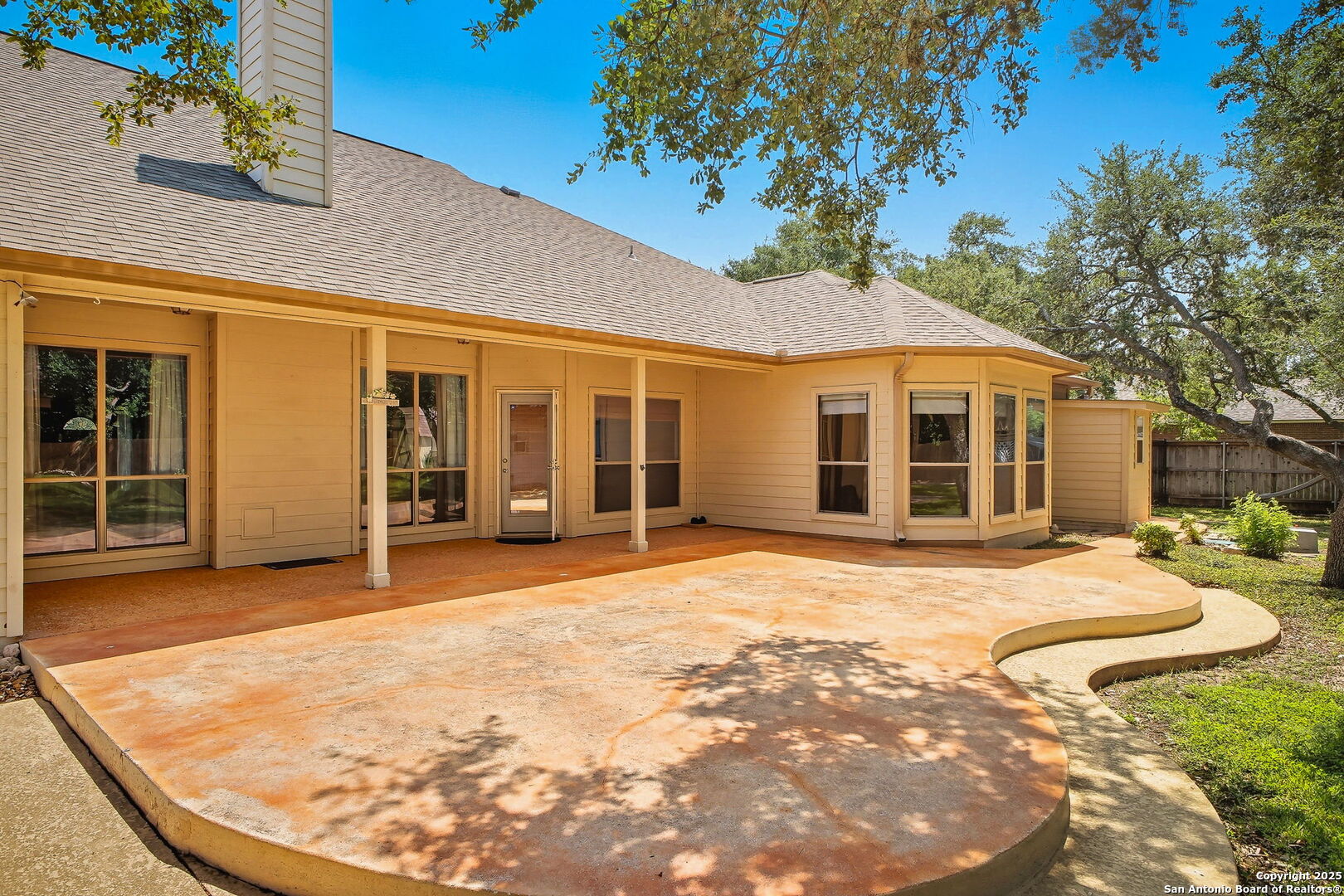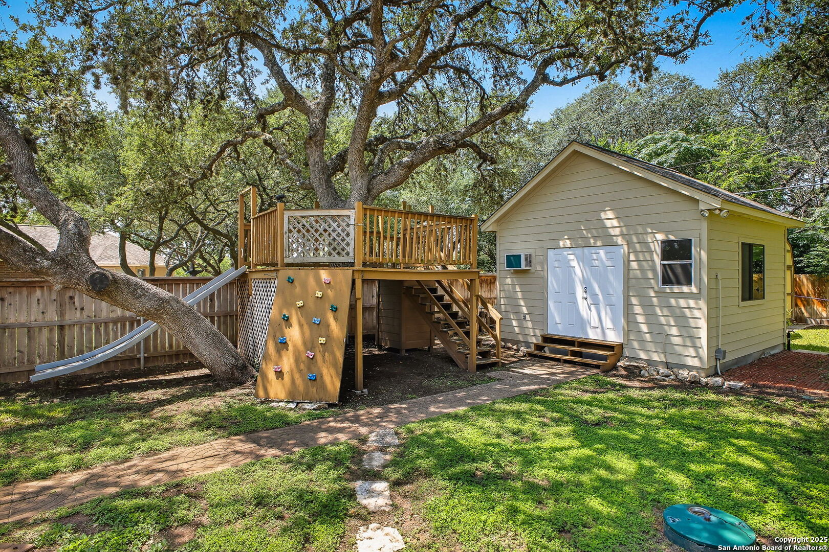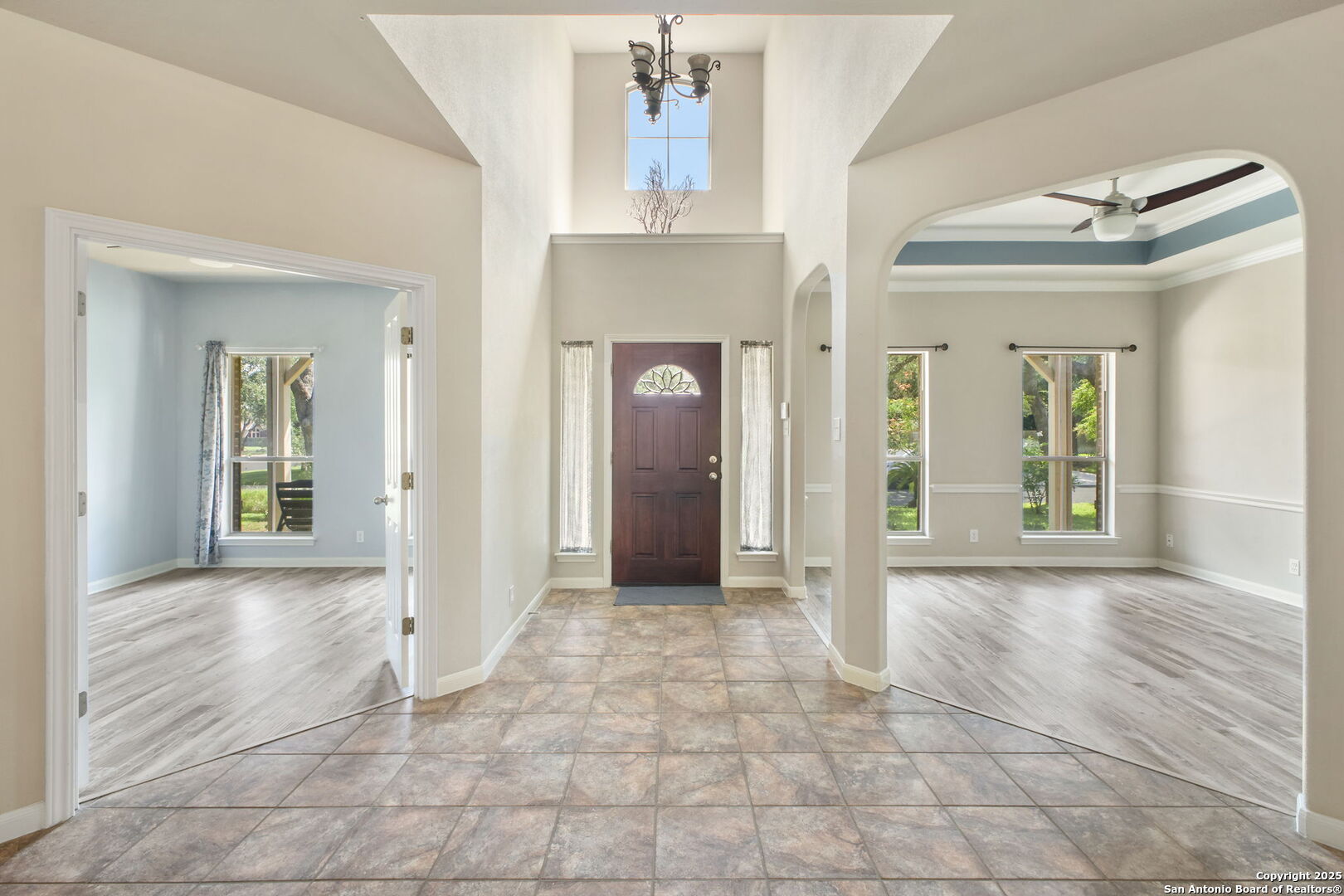 Welcome to your private oasis! Situated on a spacious 0.60-acre corner lot in a gated community, this beautifully upgraded home offers a serene lifestyle surrounded by lush greenery and mature plants including a peach and pomegranate trees. The extended long driveway provides up to 6 parking spots, while inside, the open floor plan shines with natural light, soaring high ceilings, vaulted touches in the main living and master suite, updated laminate flooring, tile, fireplace, soft-close kitchen cabinetry, a new flat stovetop that can be switched to gas and remodeled bathrooms featuring walk-in showers. The fourth bedroom with closet can be used as flex room/office! Comfort is enhanced with two smart thermostats-one controlling half of the home and the other managing the opposite side-along with a new HVAC system (2024), new water heater (2025), and recent roof updates (2020 main home, 2025 garage). Outdoors, you'll enjoy a custom-built pool, a newly added half bath dedicated to poolside use, a newly constructed air-conditioned studio perfect for work or fitness, and a detached back garage with water access that could easily be converted into a pool house. With Medina Lake just minutes away and schools nearby, this home blends modern upgrades with resort-style living-perfect for both relaxation and entertaining.